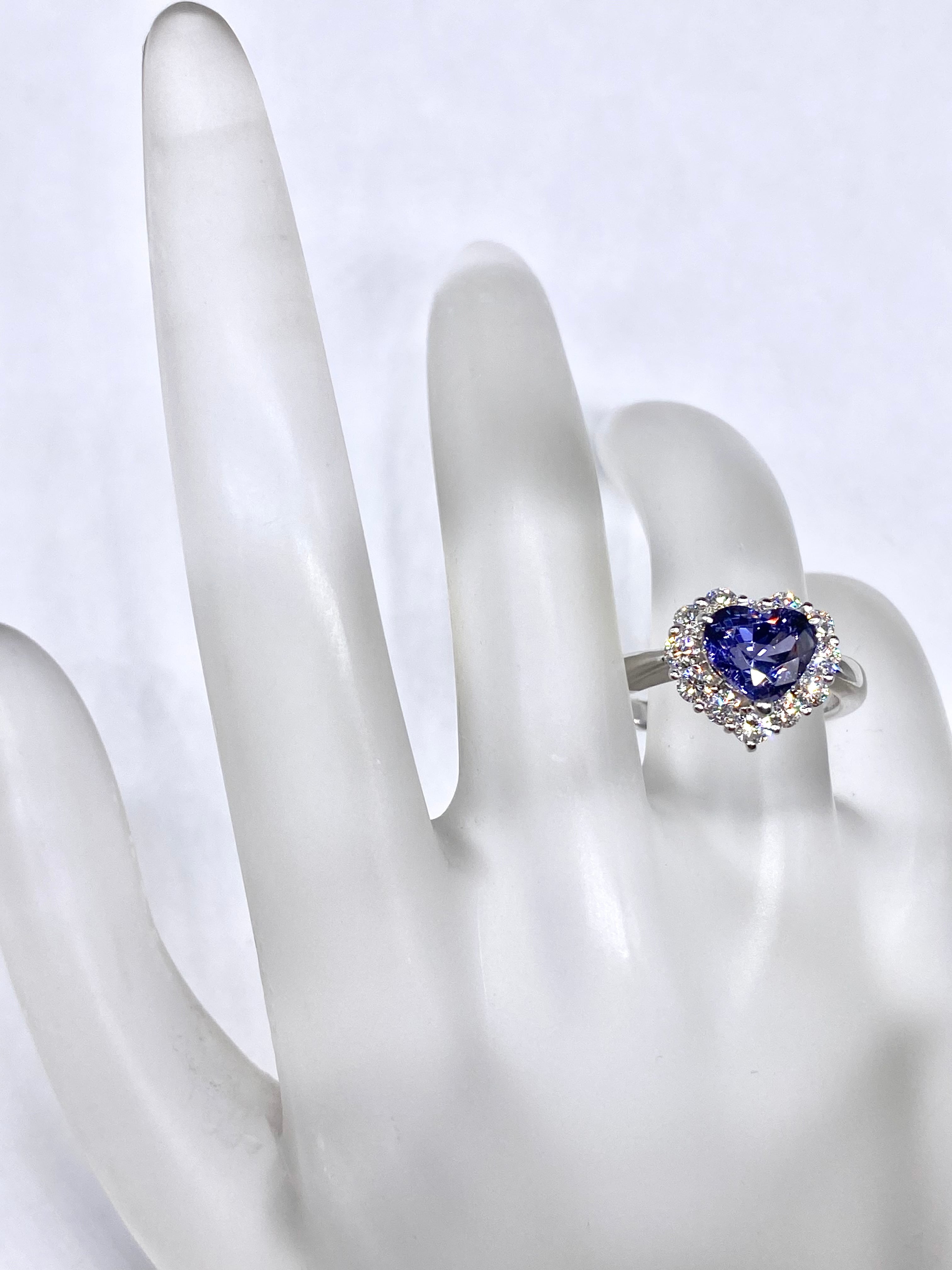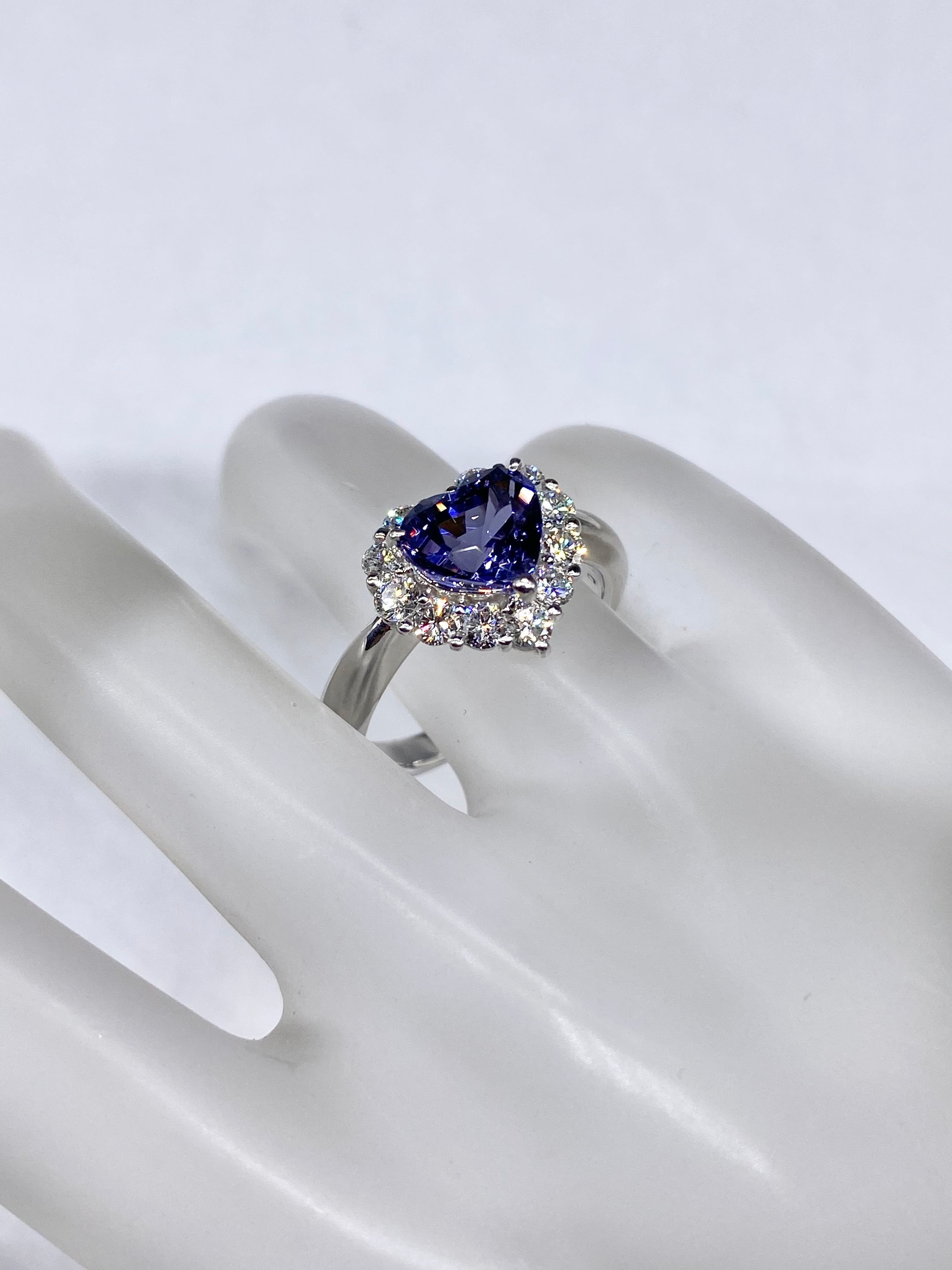 ハートシェイプのコバルトスピネルの周りを、脇石としては大きめのダイヤモンドが取り巻いているリングですね。リングのデザインそのものは比較的シンプルなのですが、存在感も個性もかなりのもの。