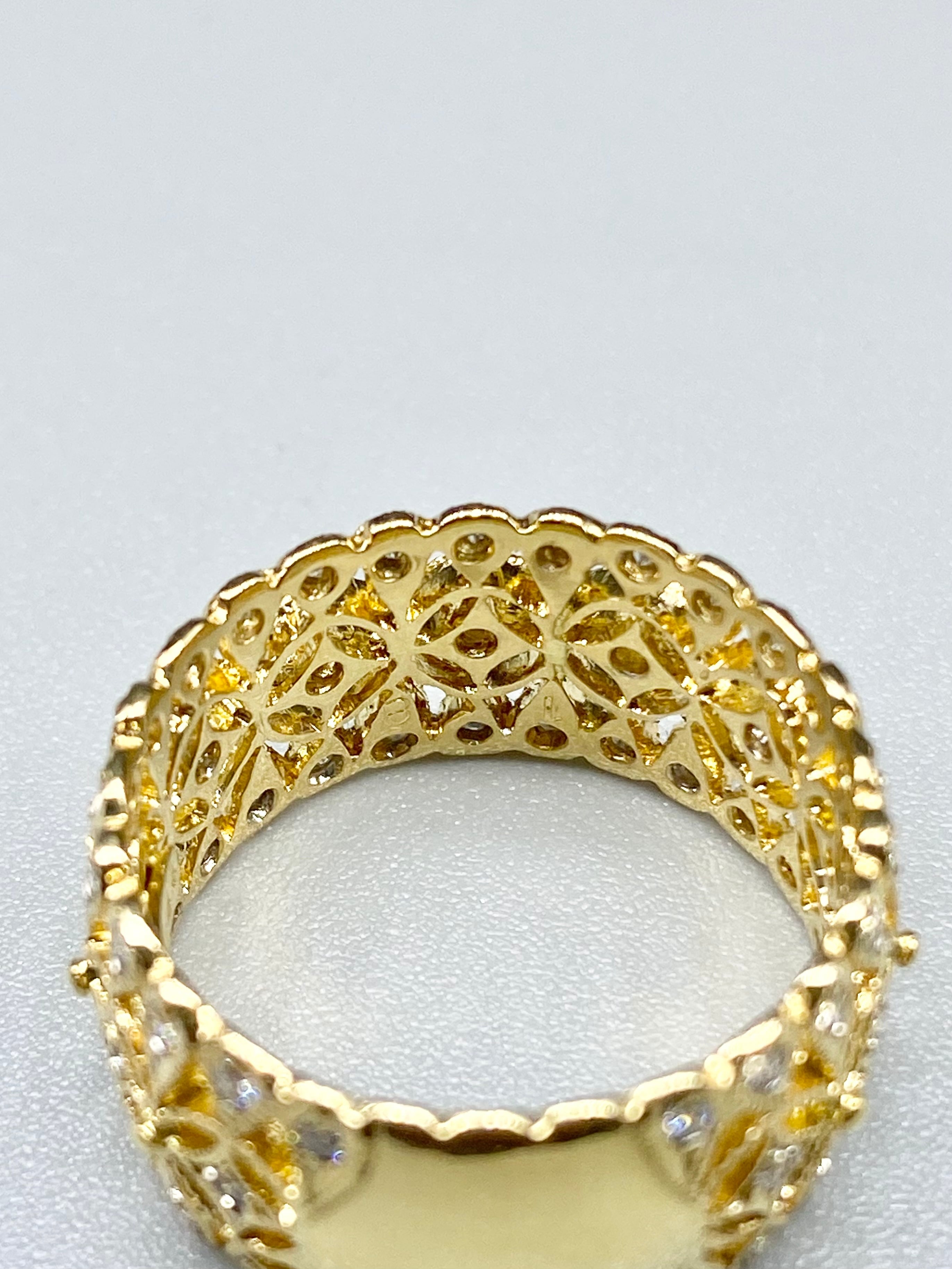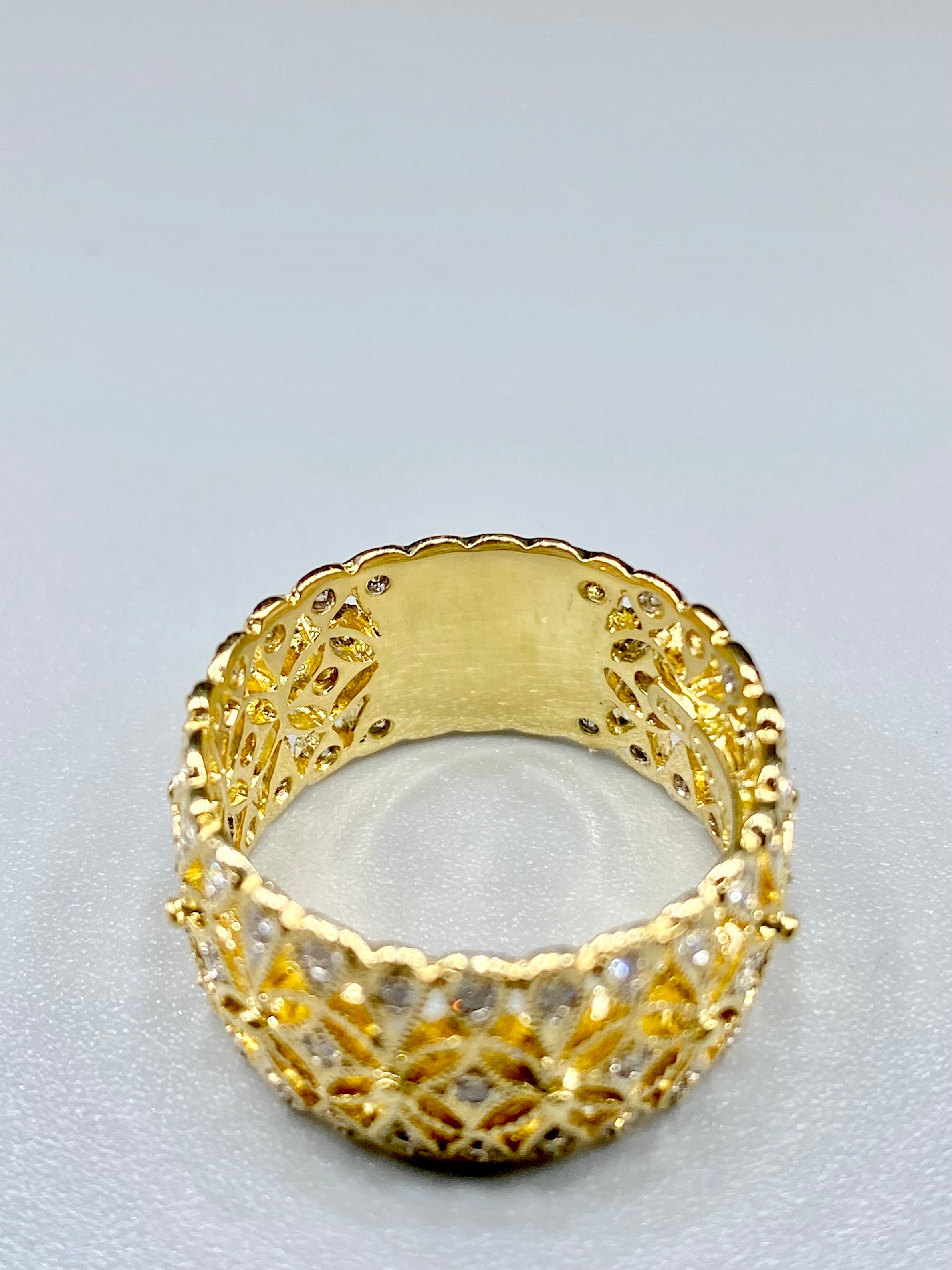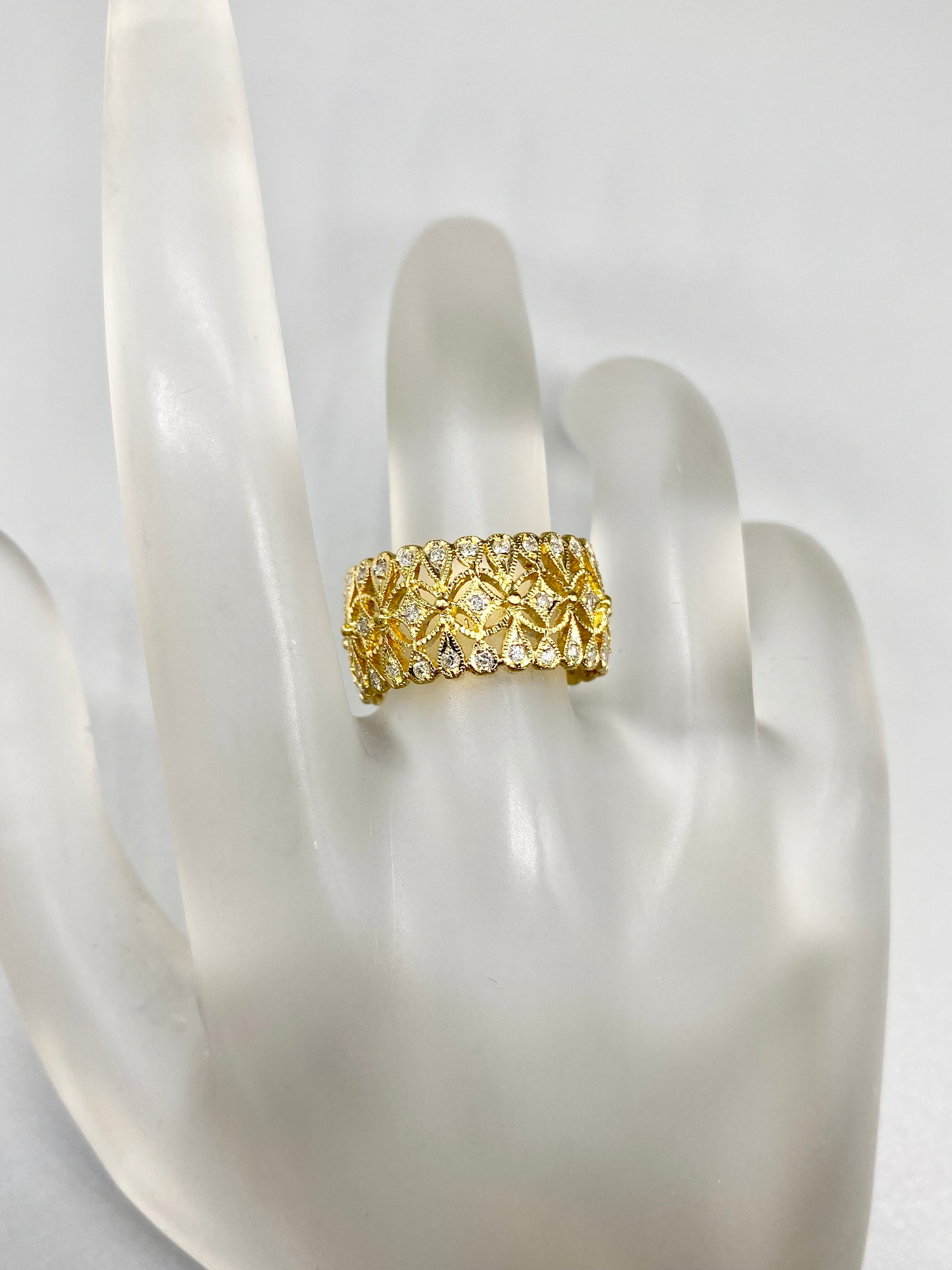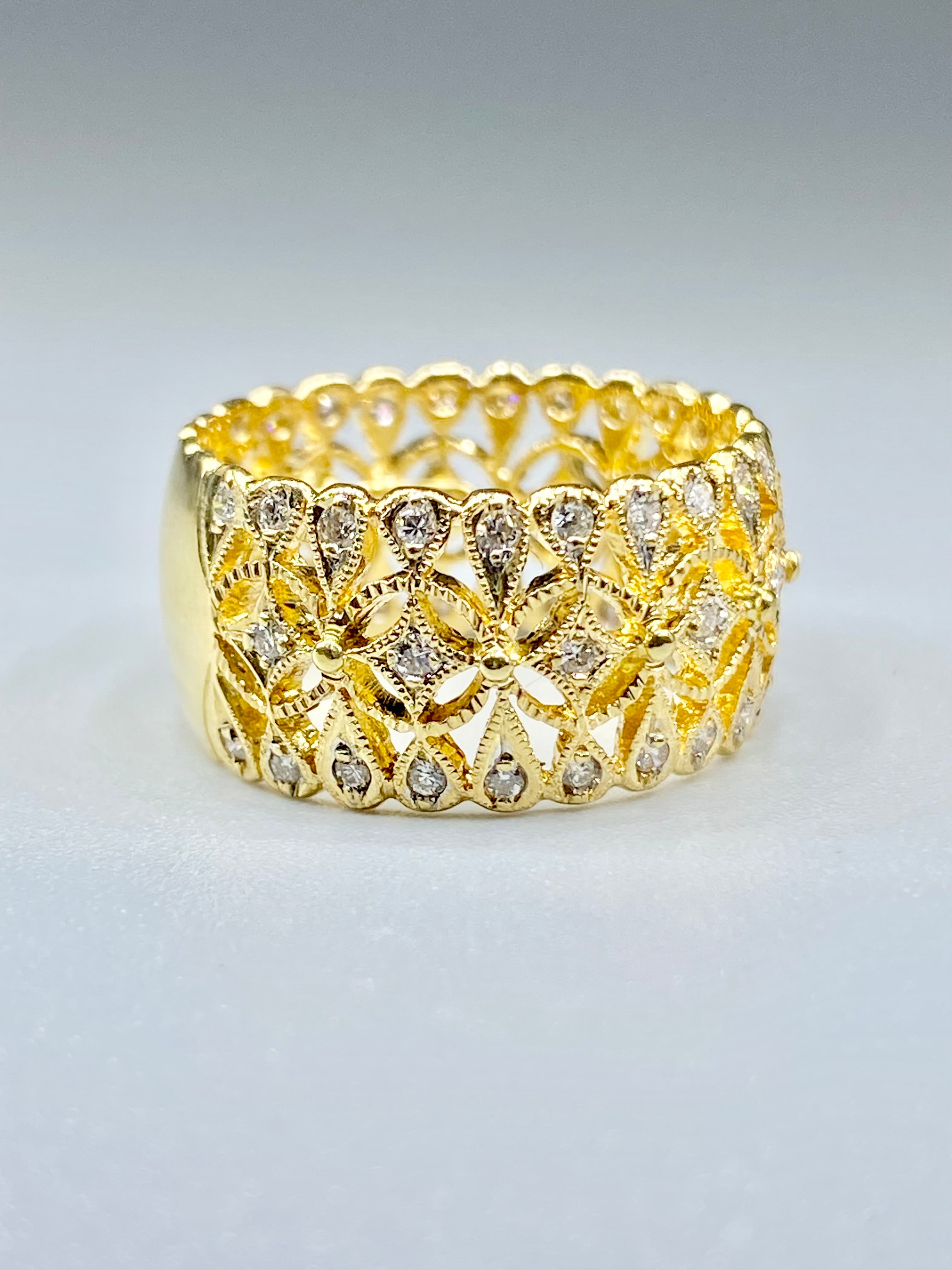 幅も広めですが透かしのおかげで重量感はありません。またぎらぎらとした光り方はしないため、装飾的でありながらも存在感が強すぎると感じることもないかと思います。