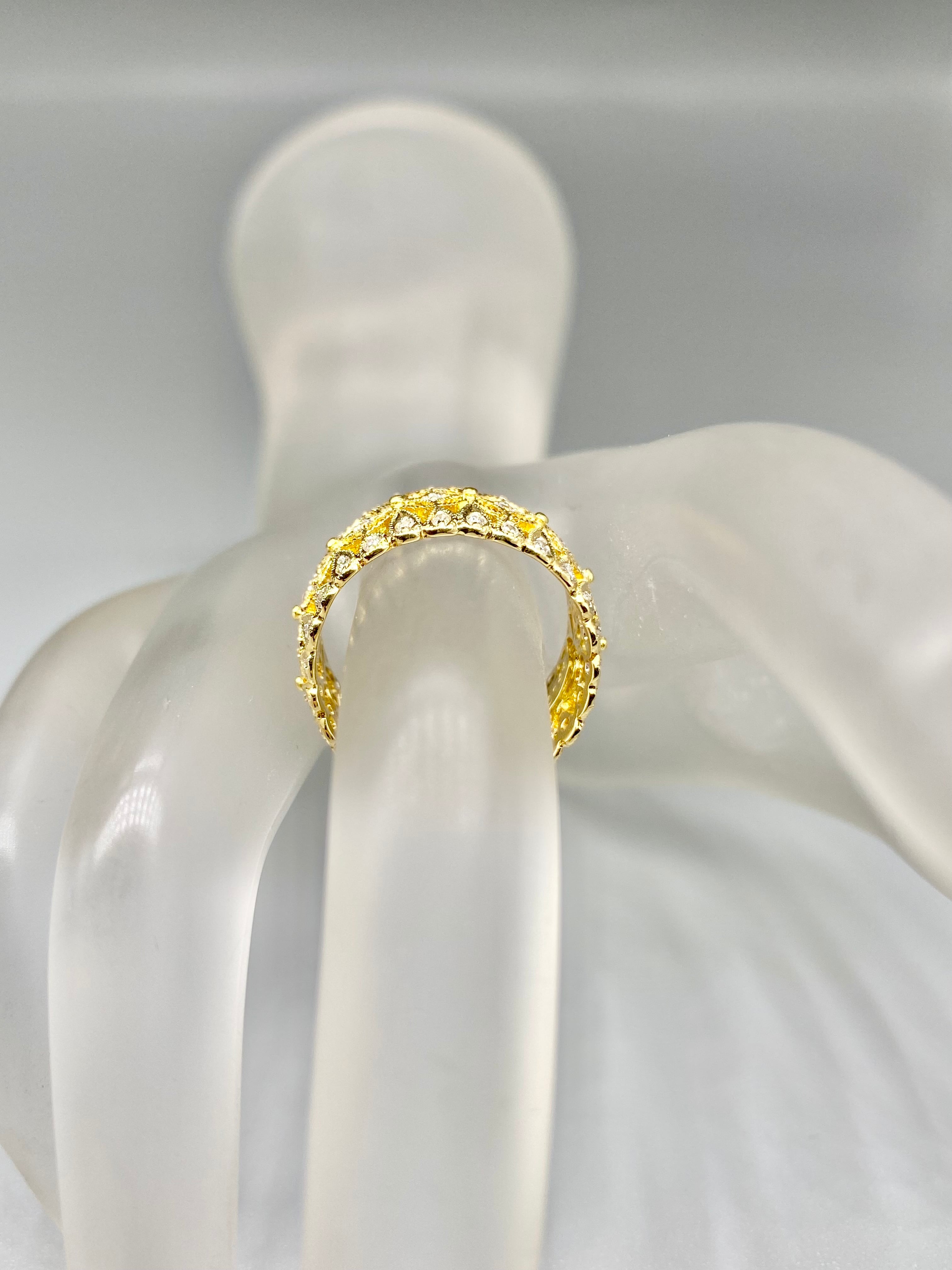 ほぼ全体が透かしとなっているリング。涙型と星のような形の石座が組み合わさり、縁には全体にミル打ちが施されているという繊細で凝った造りの一品。