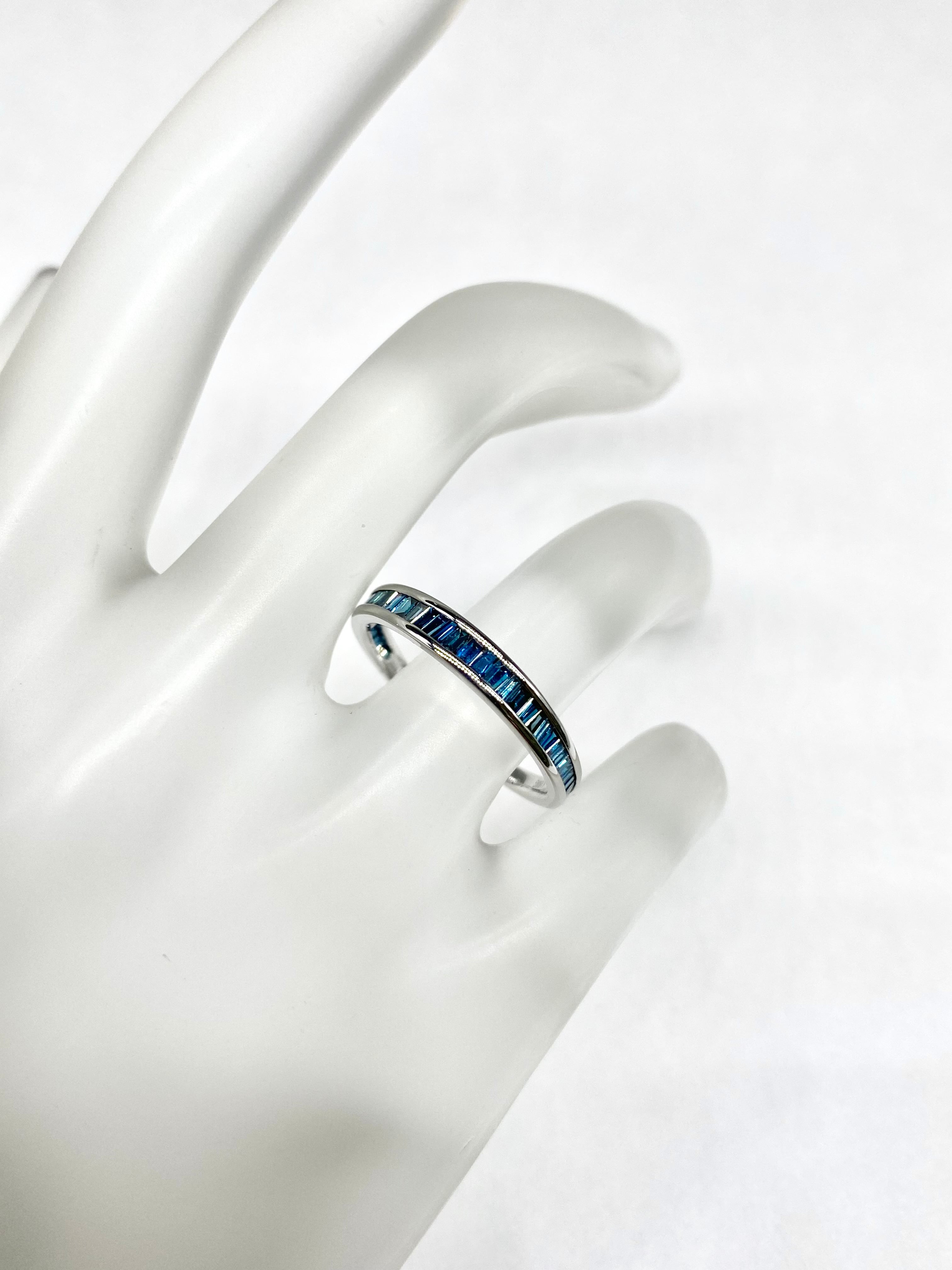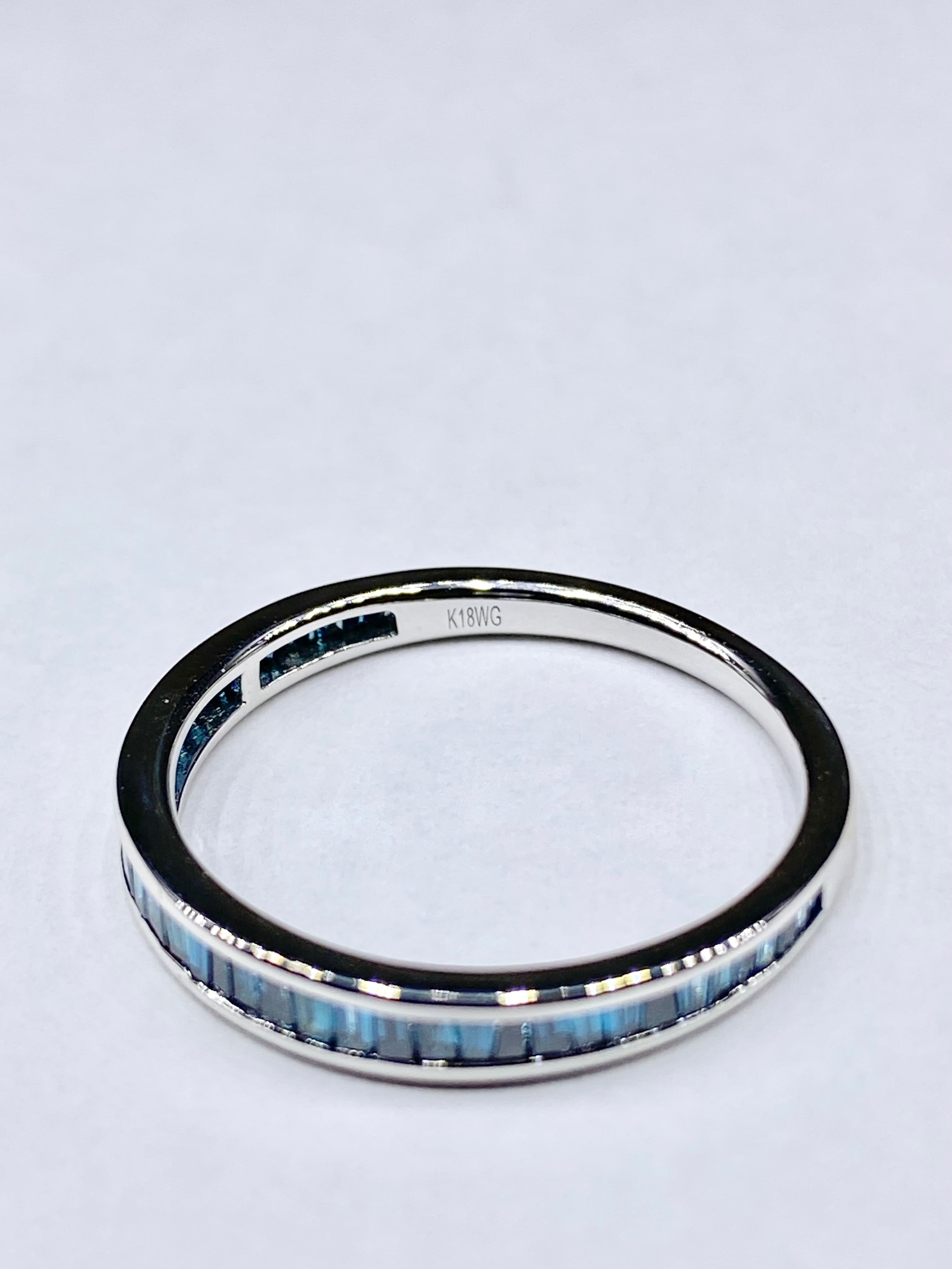 ブルーとグリーンのちょうど中間ほどの、濃い色を持つダイヤモンドが留められたハーフエタニティリング。ハーフと書きましたがリング全体の2/3ほどにダイヤモンドがレール留めされておりますので、身に着けた時にサイドからもダイヤがきちんと見えます。