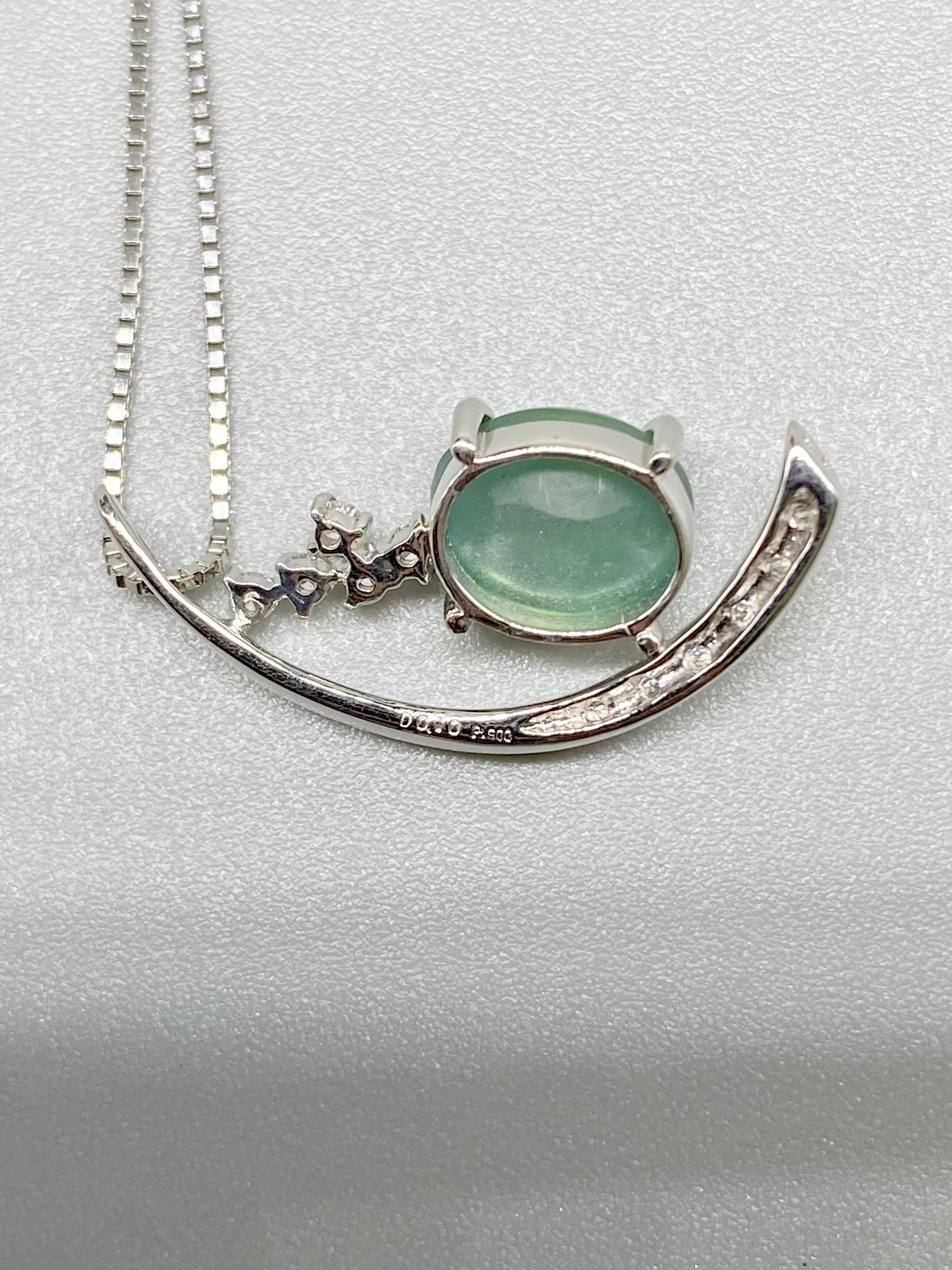 ダイヤモンドはそれぞれは小粒ながらも輝きが強く、アパタイトには無いきらめきで周囲を飾ってくれております。とはいえ全体の印象派いたって物静かで、まさに月のようです。落ち着きのある静謐なネックレスをお探し方や、キャッツアイストーンのジュエリーの中でもあまり見かけない、珍しいものをお探しの方に特にお勧めしたい一品です。