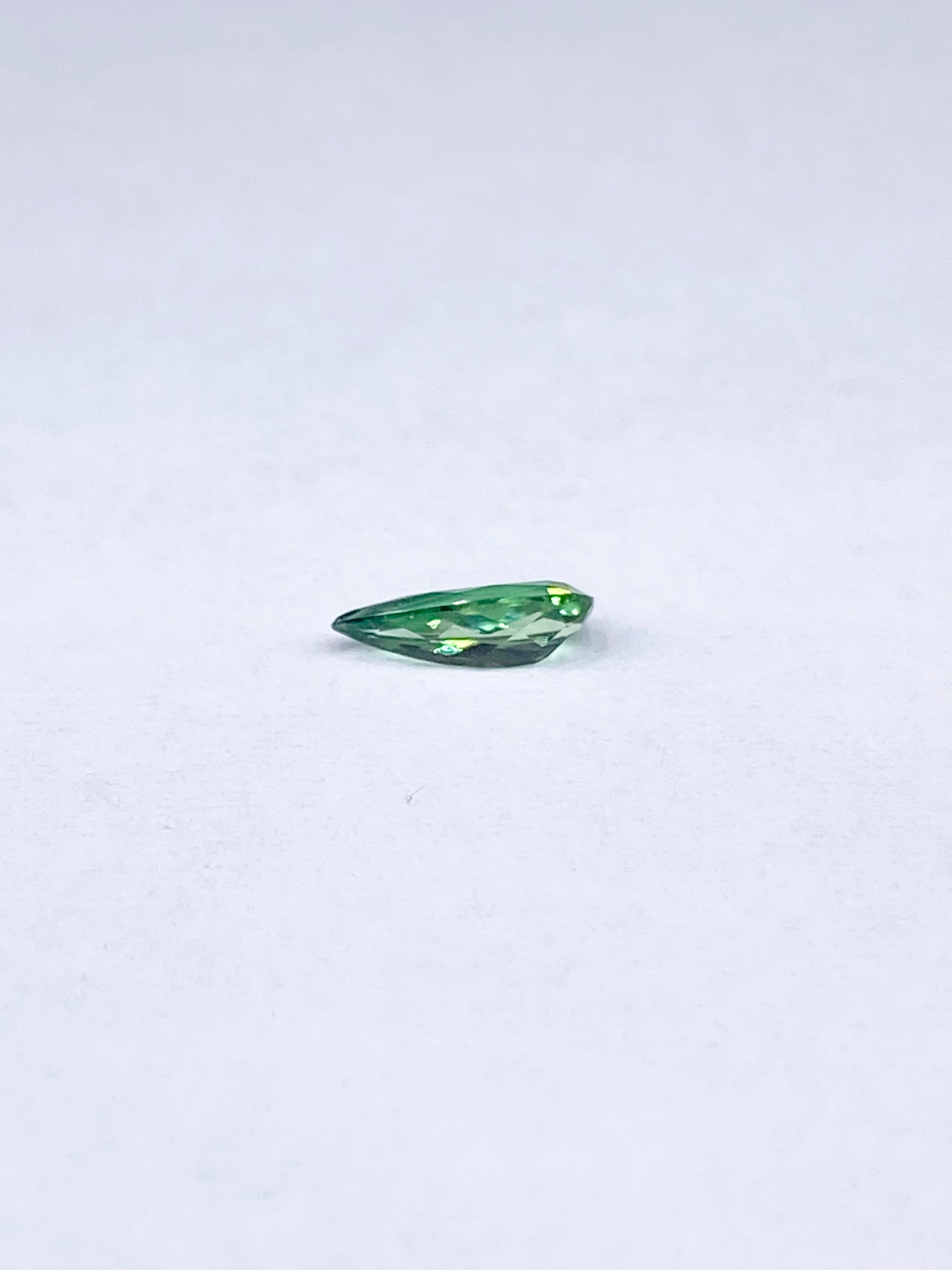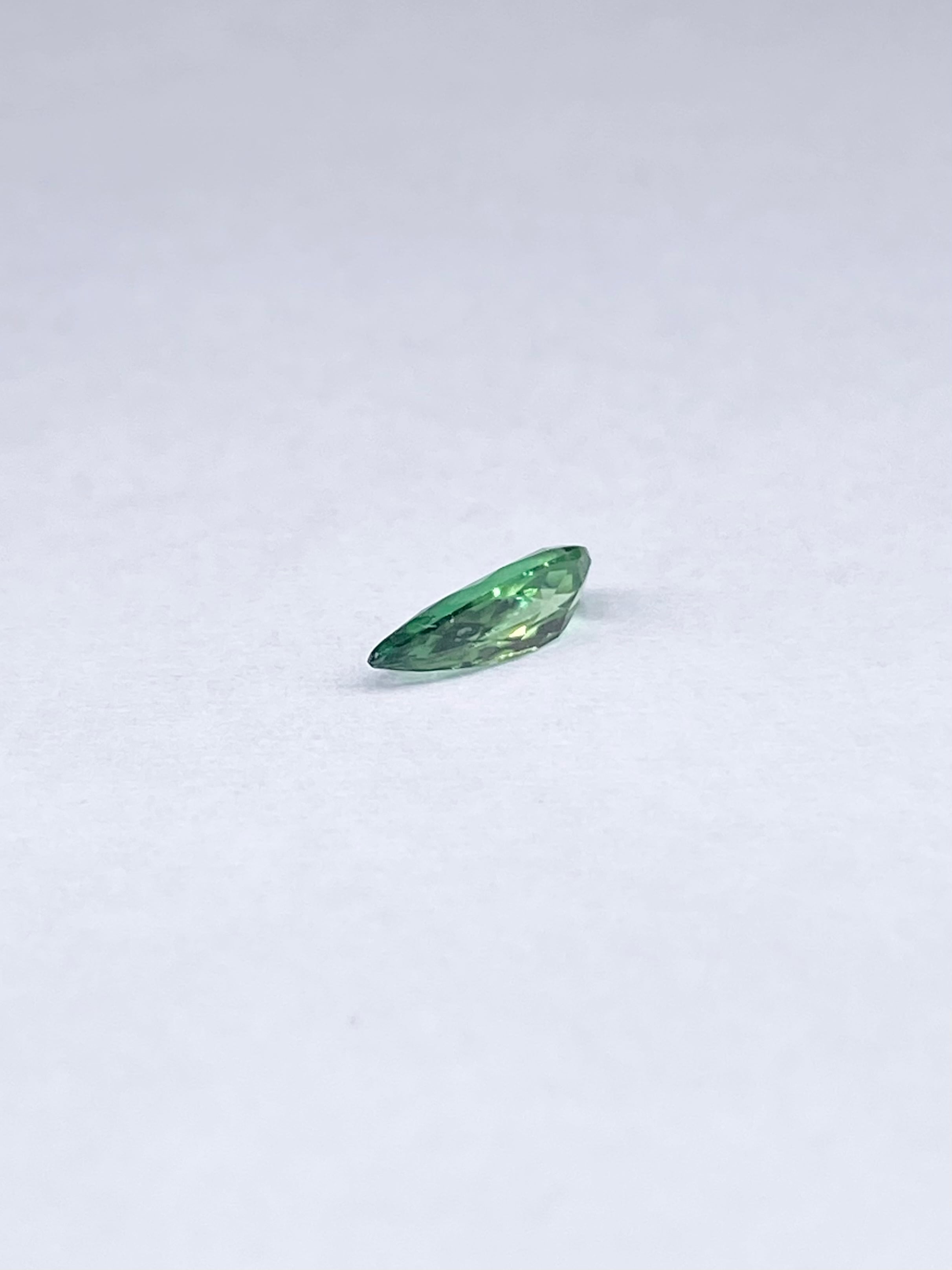 ラズ―ライトのイメージとは異なる、ほぼグリーンのピース。前述のとおりグリーン系のトルマリンに似ています。ファセットの照り返しも強く、小ぶりながらも目を引く一石ですね。