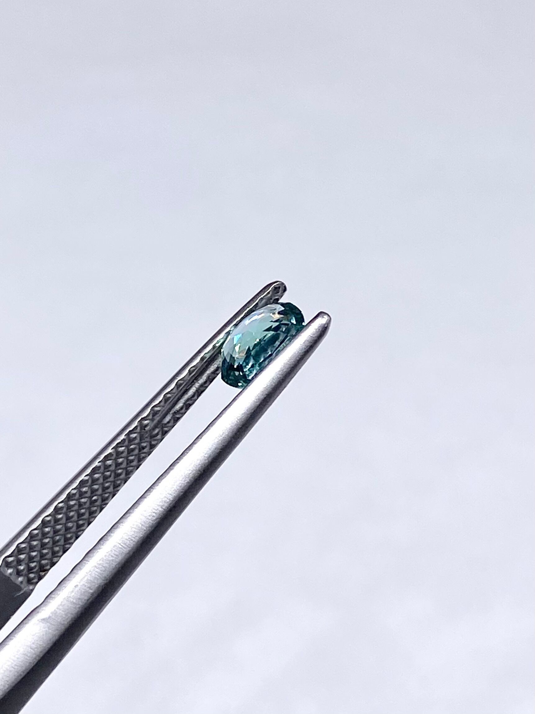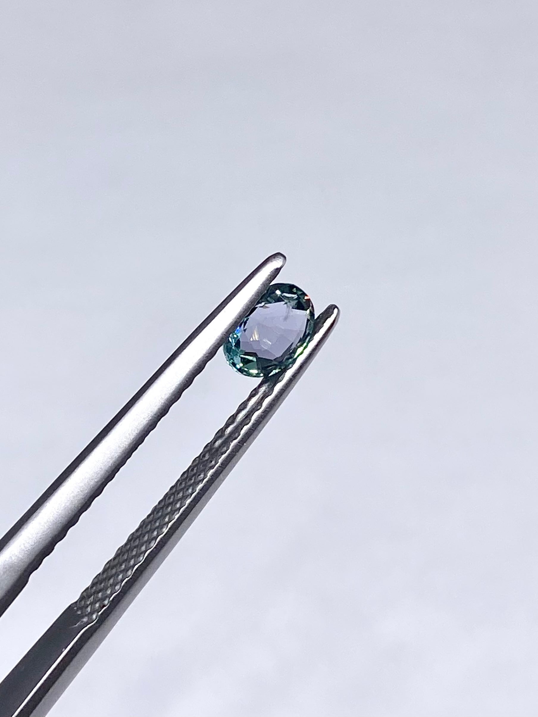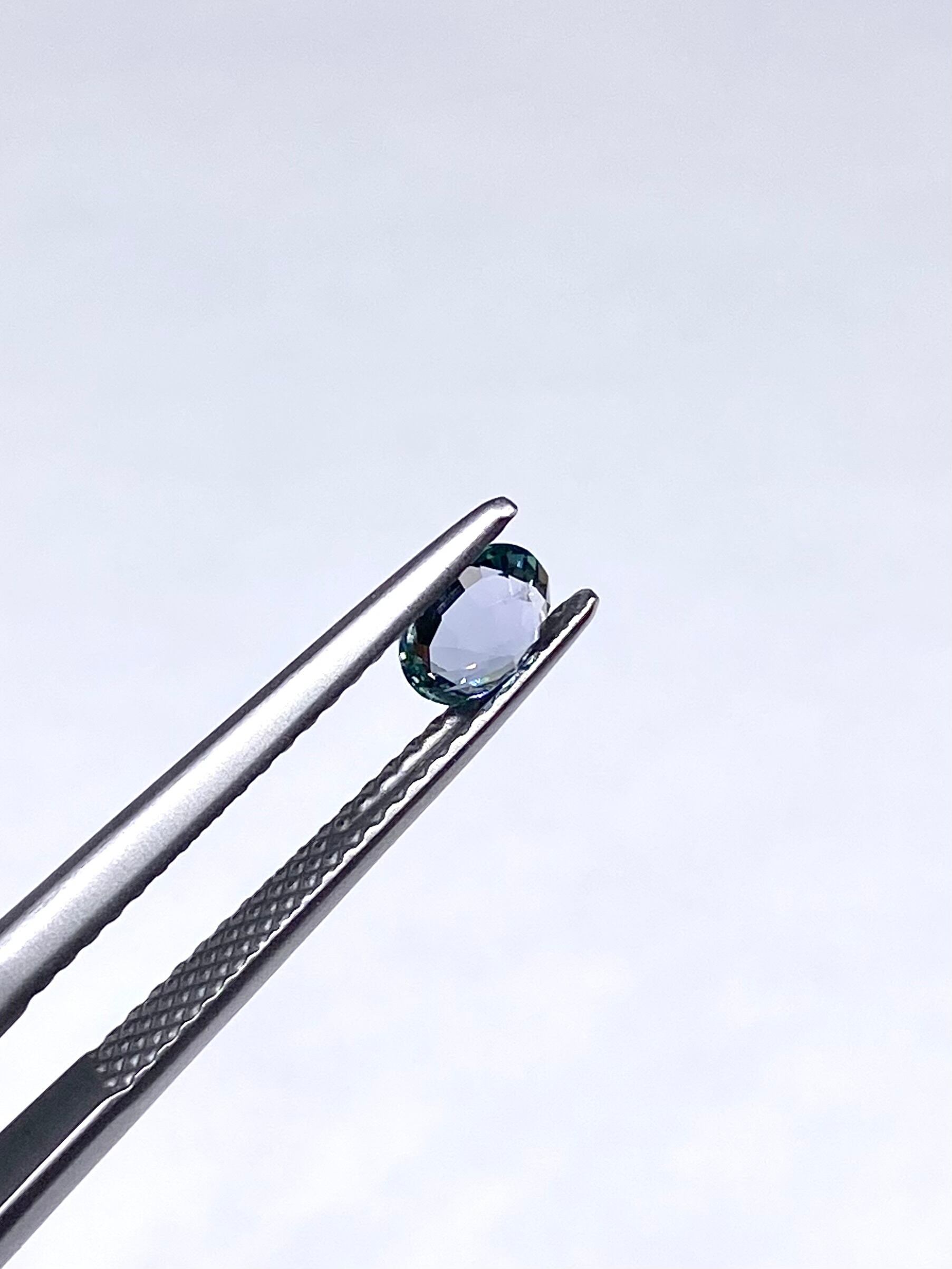中央部の抜けは目立ちますが、同時に外縁部の輝きもかなり目立ちます。背面に目立つキズはありますが、全体としてはキラキラとして美しい一石です。また、どことなくアレキサンドライトを思わせるような外観かと思いますね。