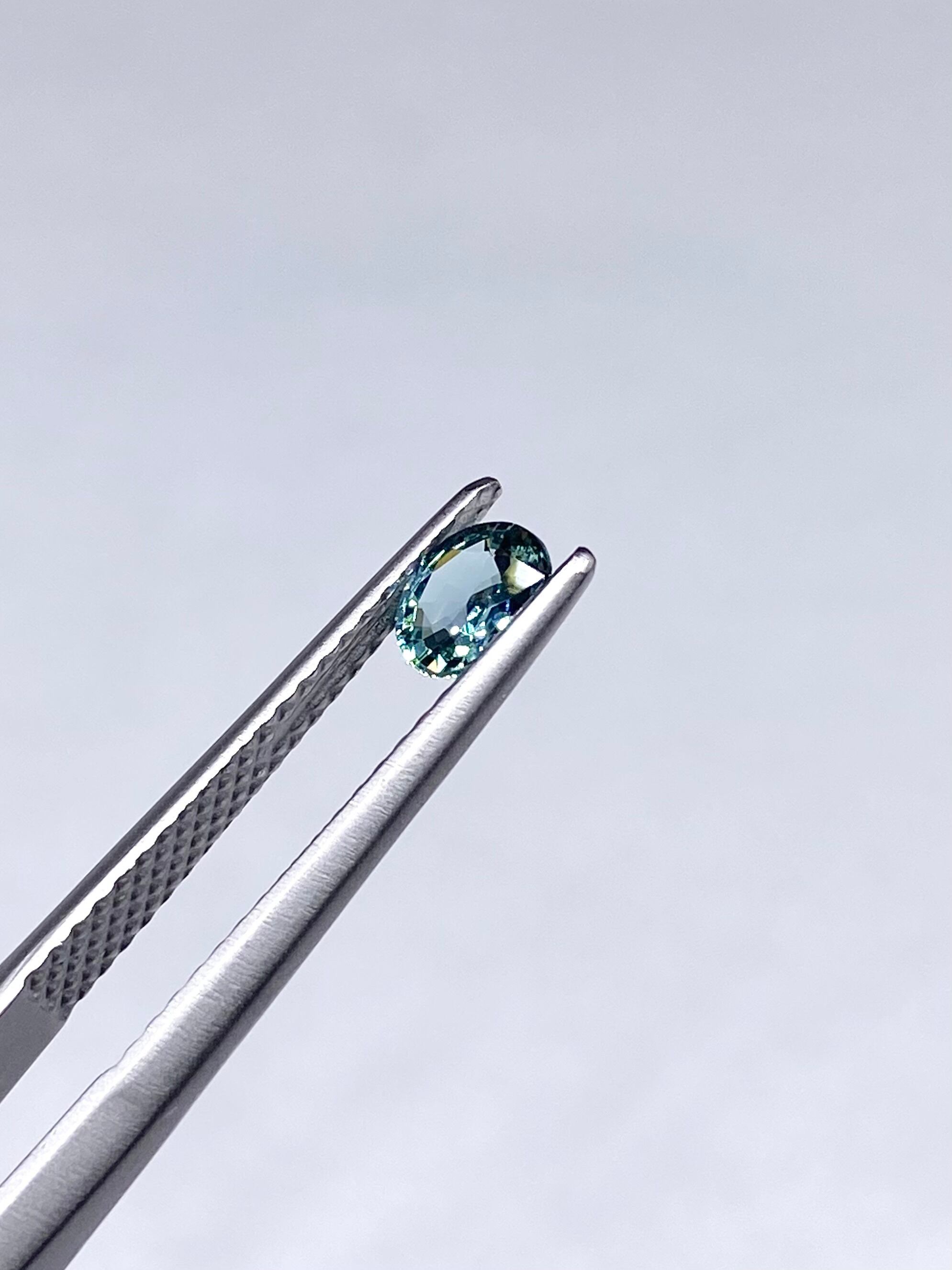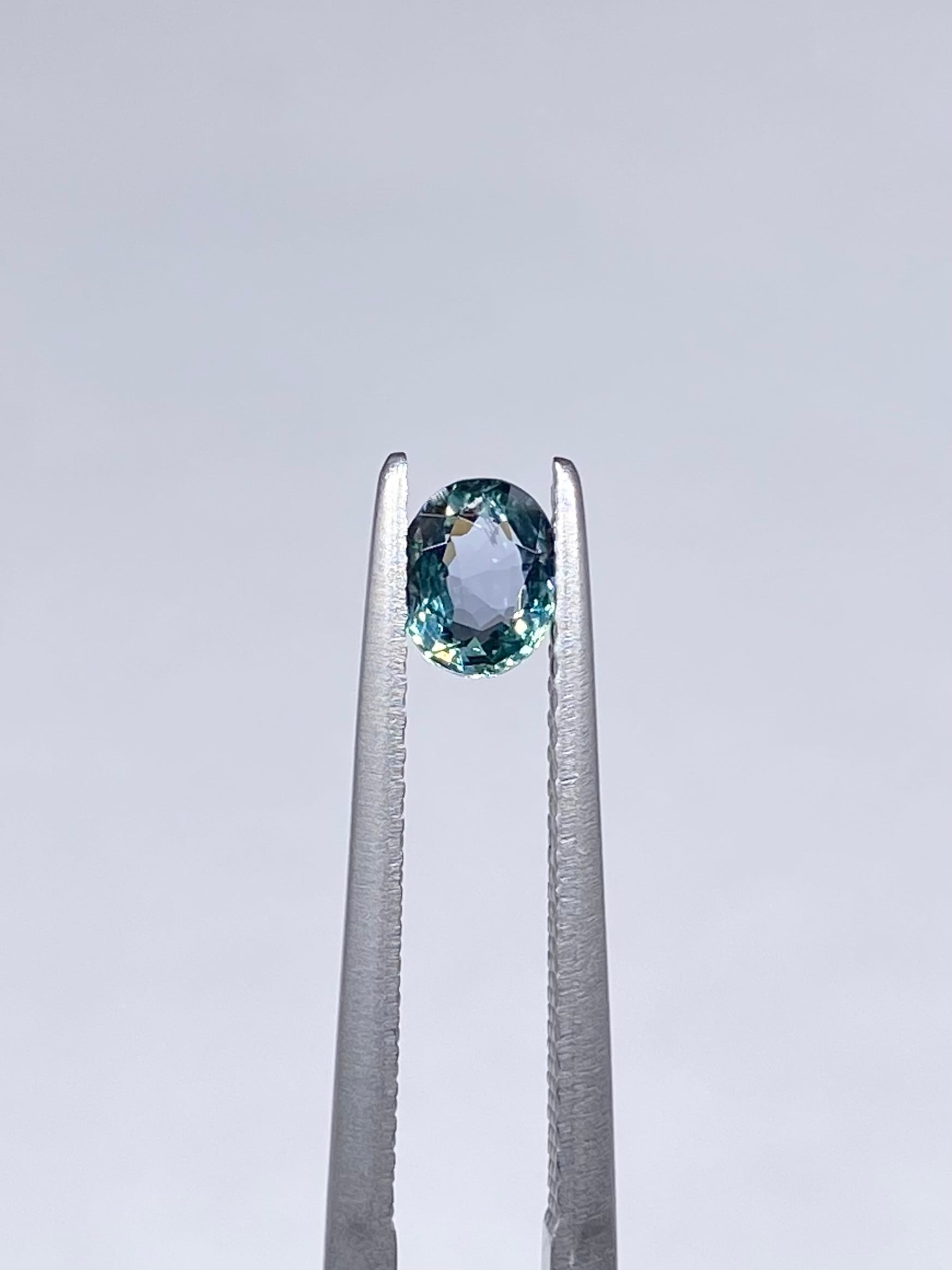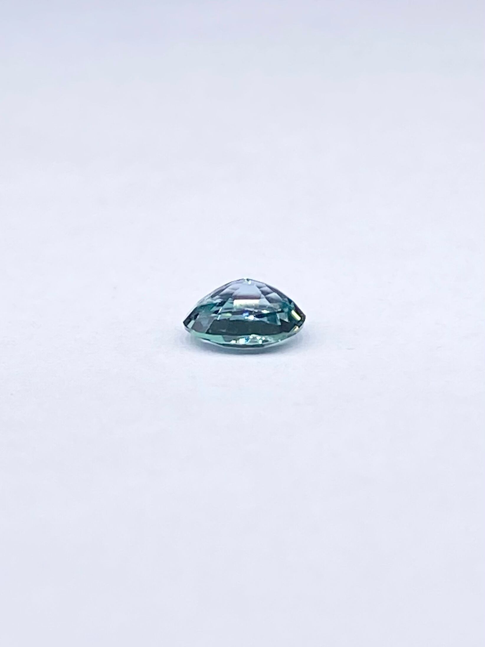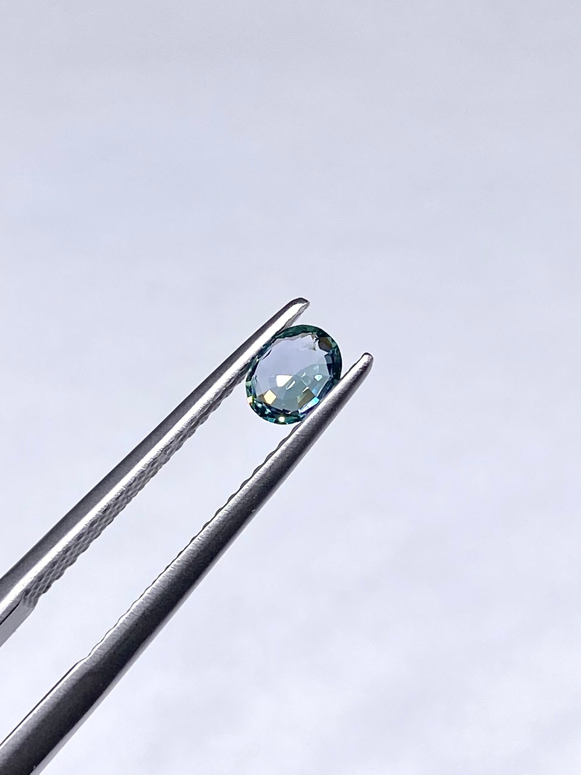 中央部の抜けは目立ちますが、同時に外縁部の輝きもかなり目立ちます。背面に目立つキズはありますが、全体としてはキラキラとして美しい一石です。また、どことなくアレキサンドライトを思わせるような外観かと思いますね。