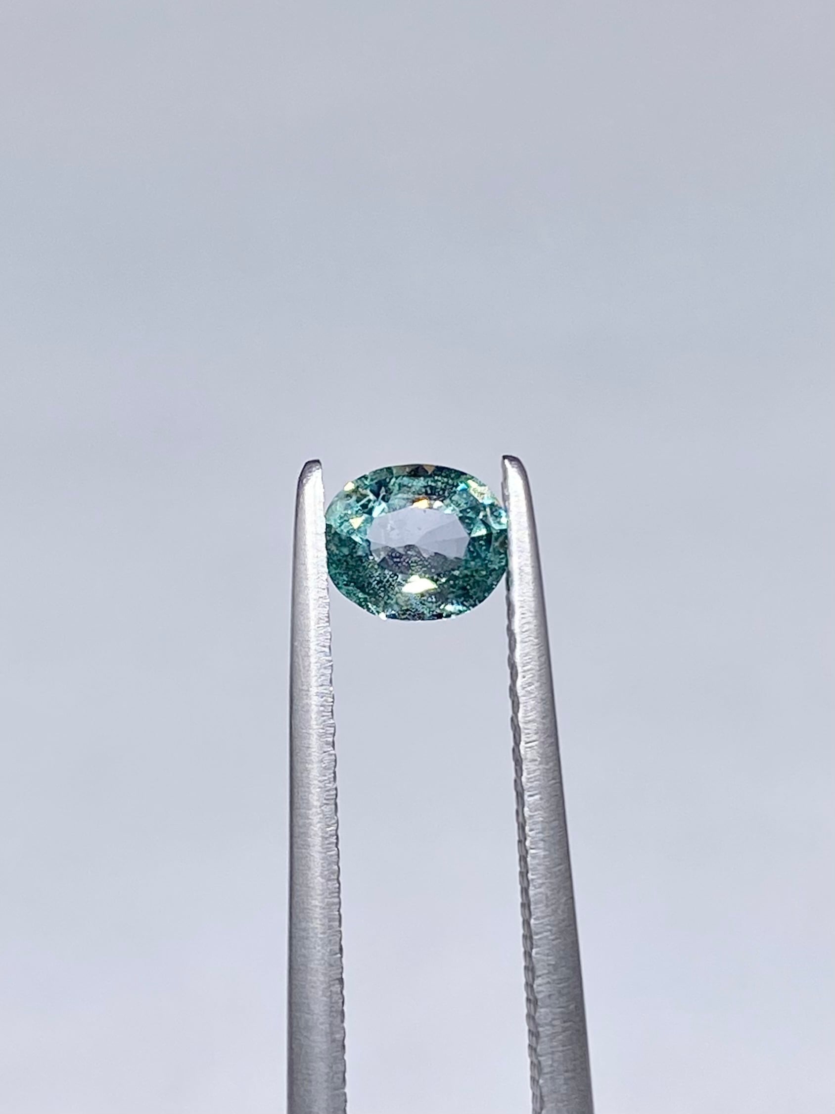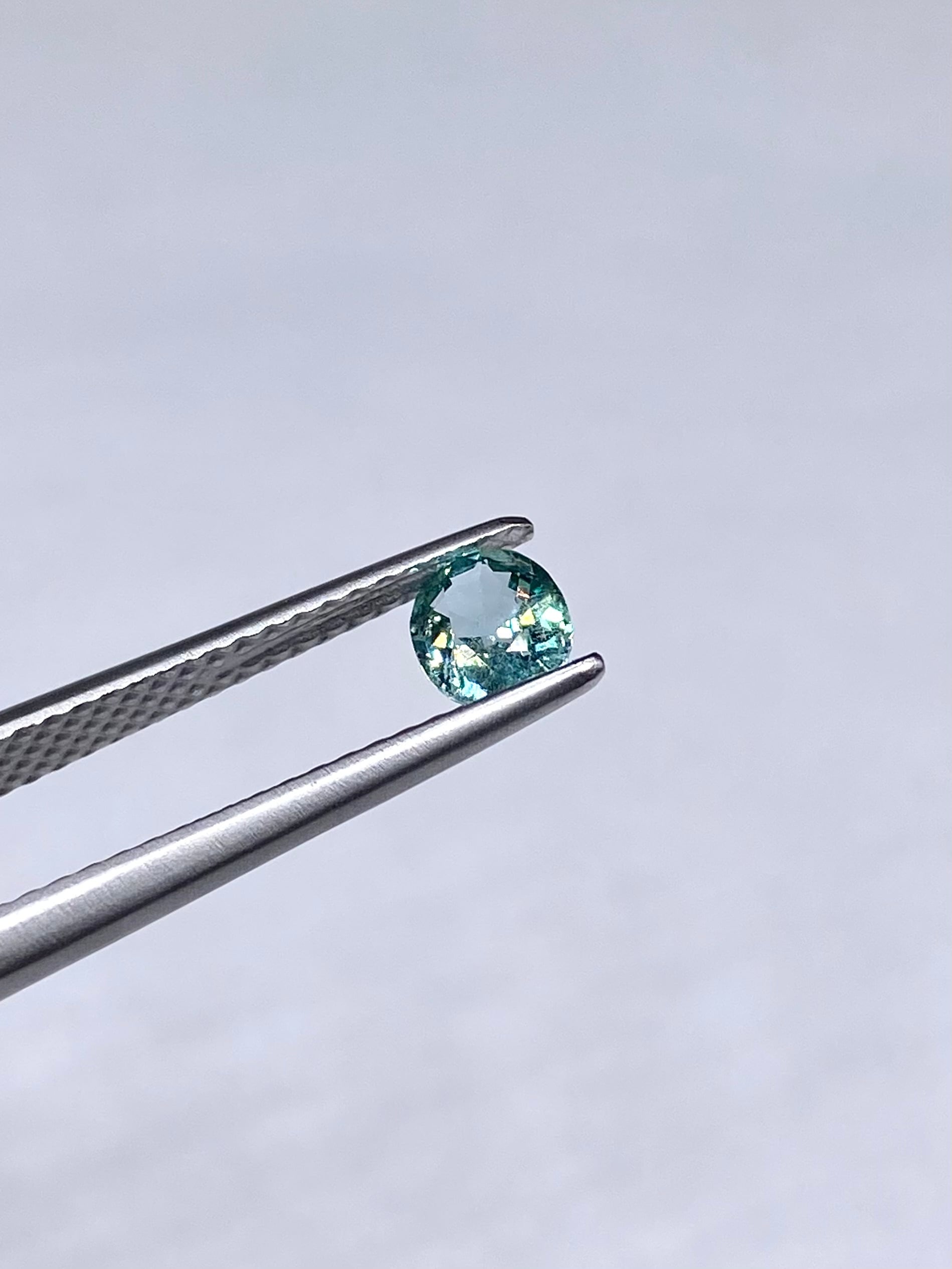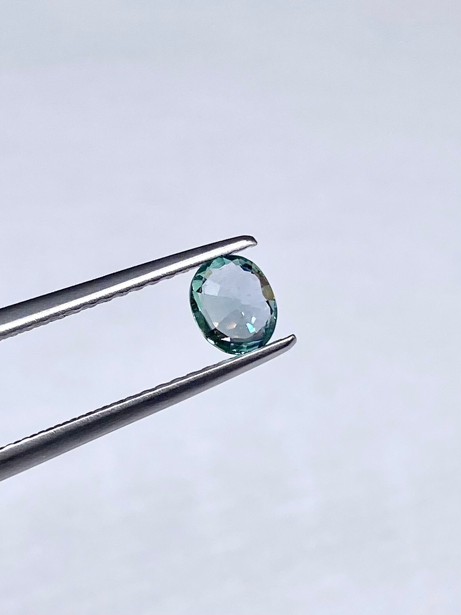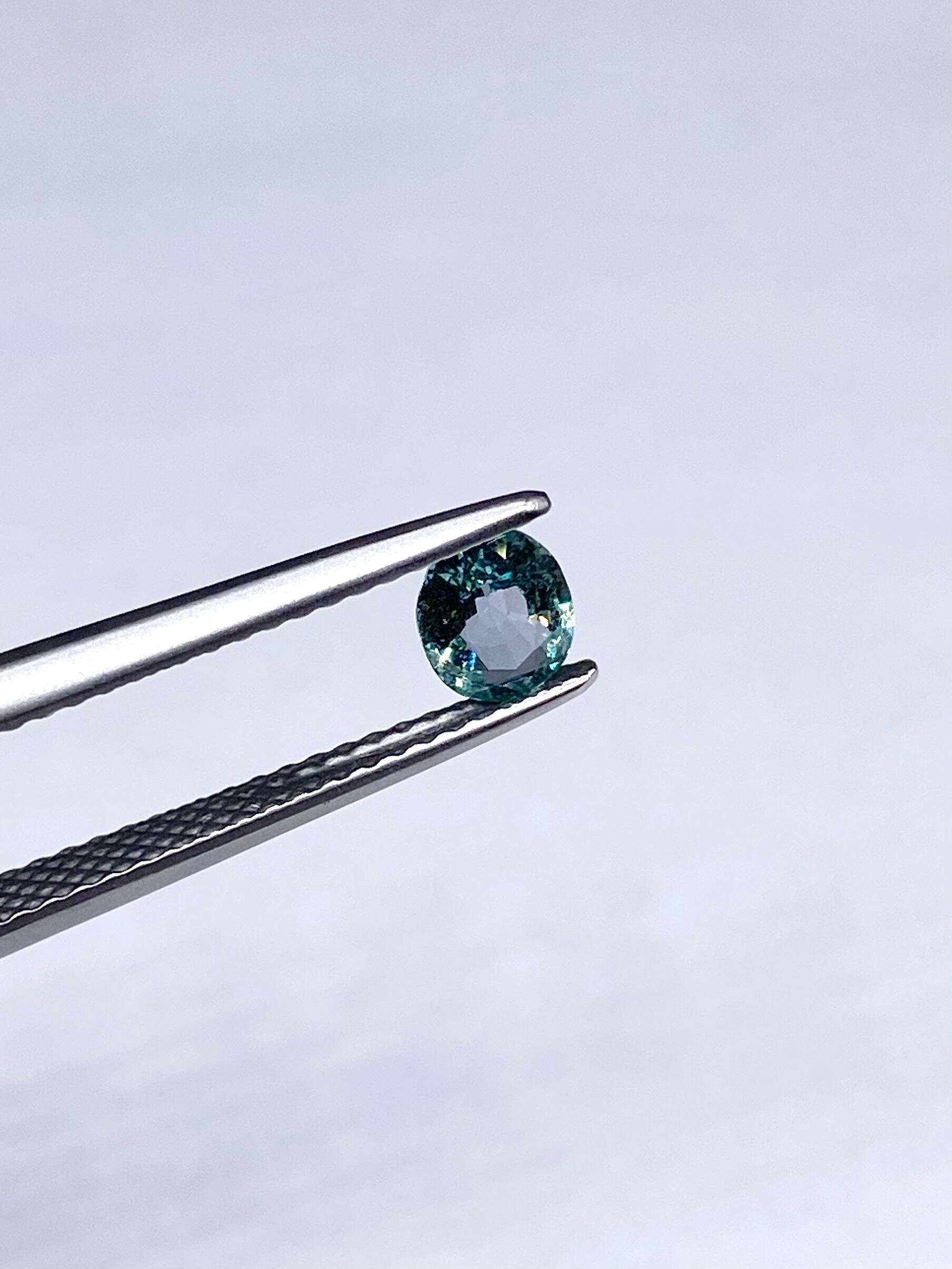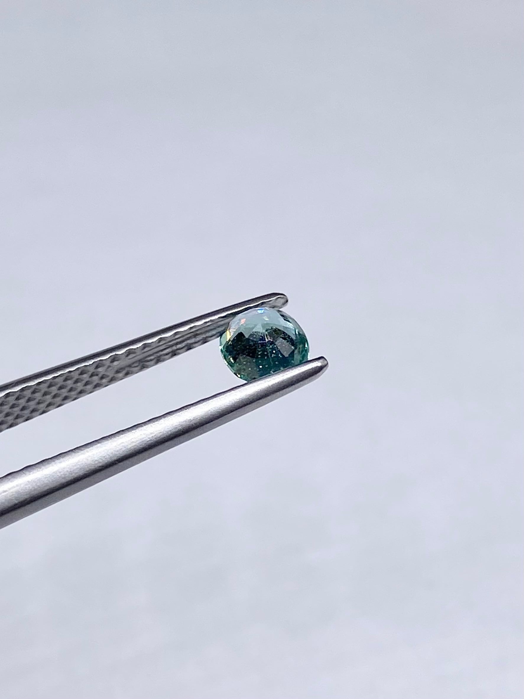 ブルーとグリーンの中間的な色合いで、明るめ。中央部の色は淡く抜け気味ですが、その周囲の輝きは明るく、キラキラと眩しく光ります。