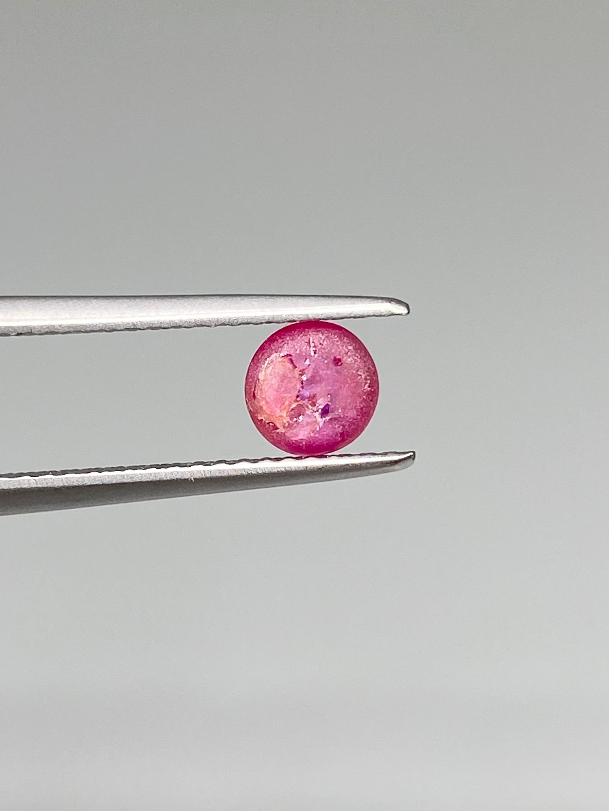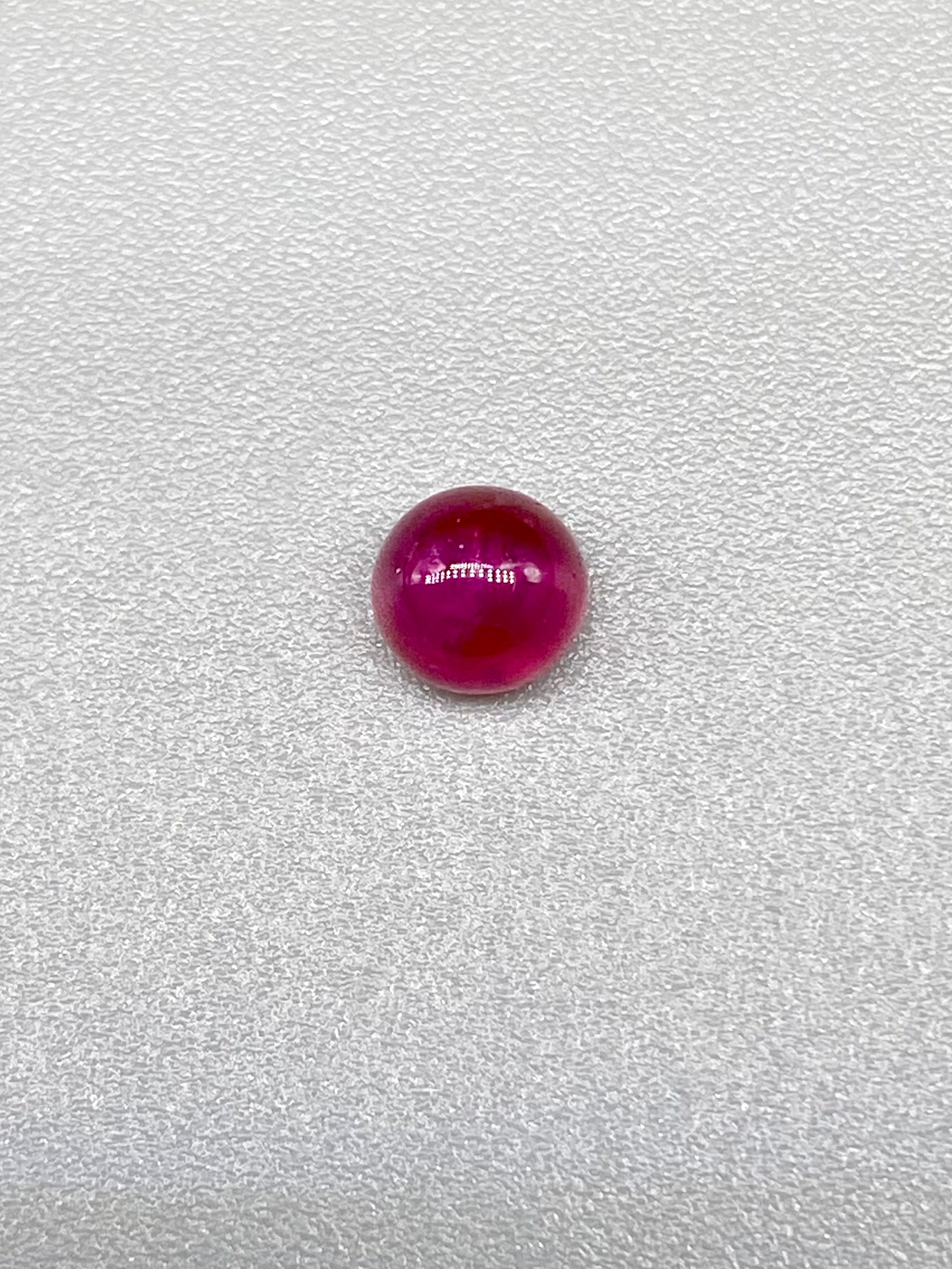 色が淡くなりがちな(スタールビーなどを含む)カボションストーンでありながらも赤みが比較的強め。山高の形状もあってか特に中央部は色が深く、少し黒みも感じます。