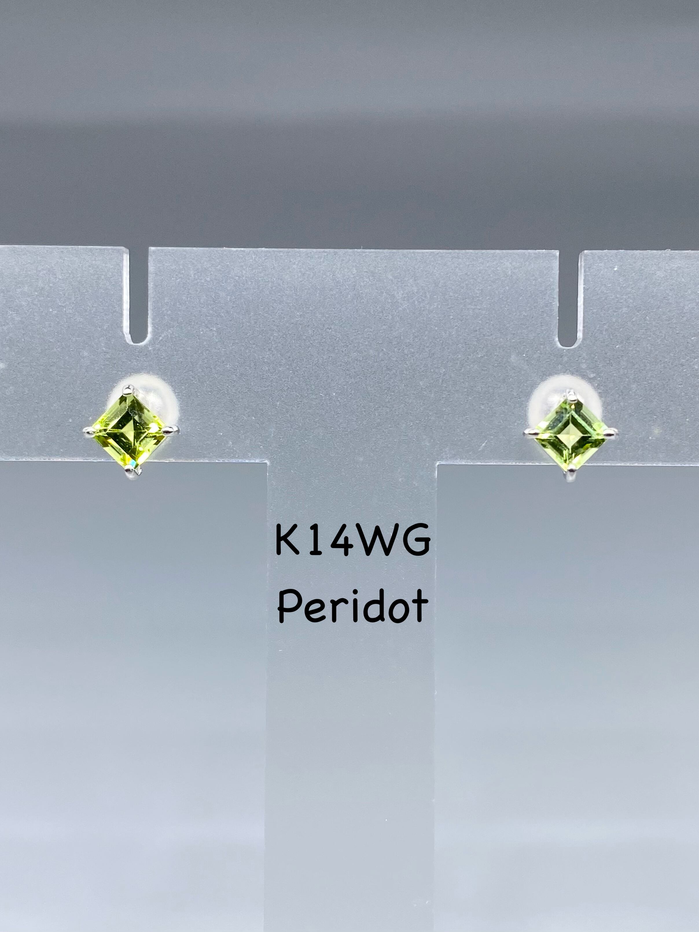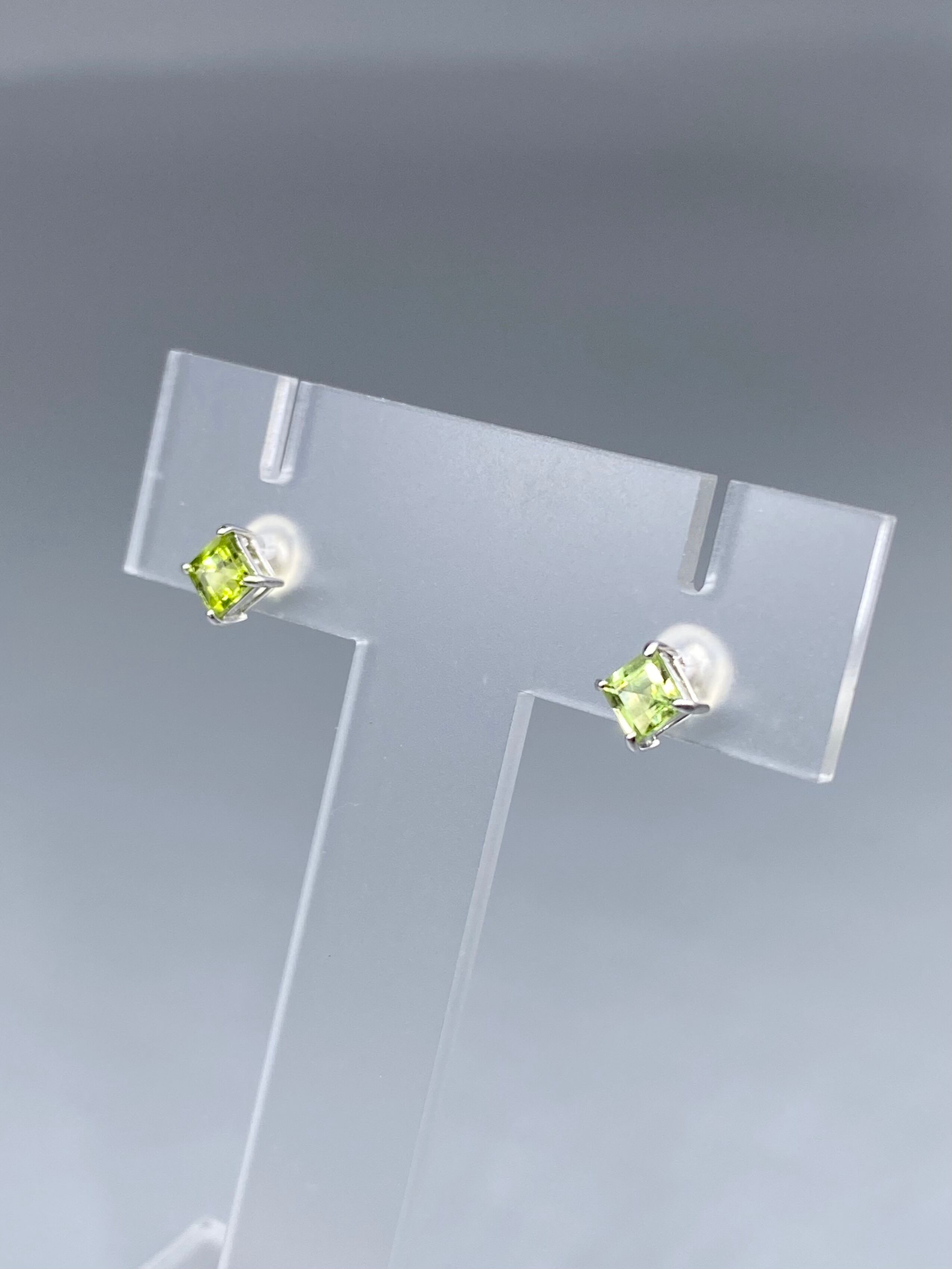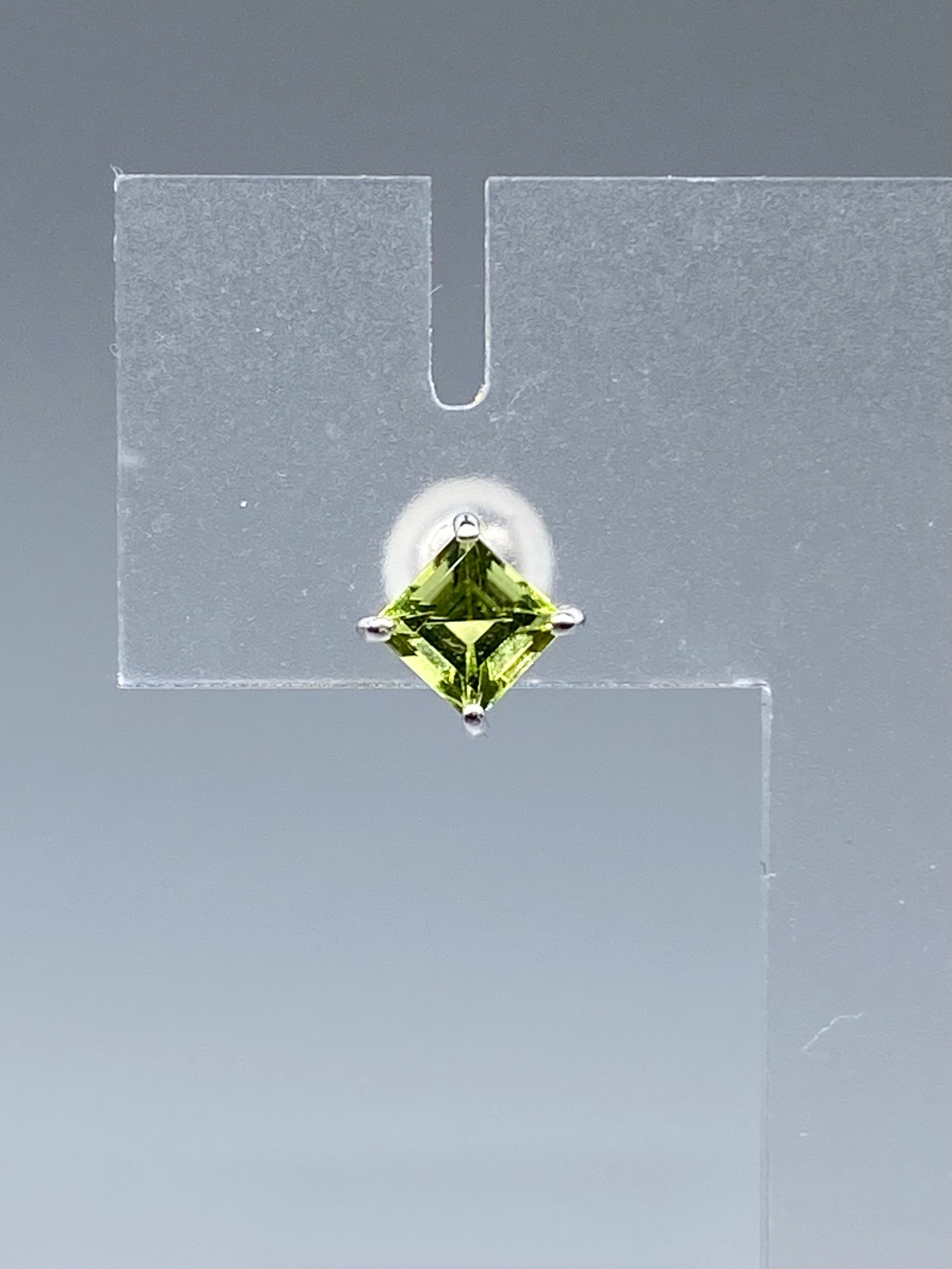スクエアにカットされたペリドットをシンプルに四本の爪で留めたスタッドタイプのピアス。