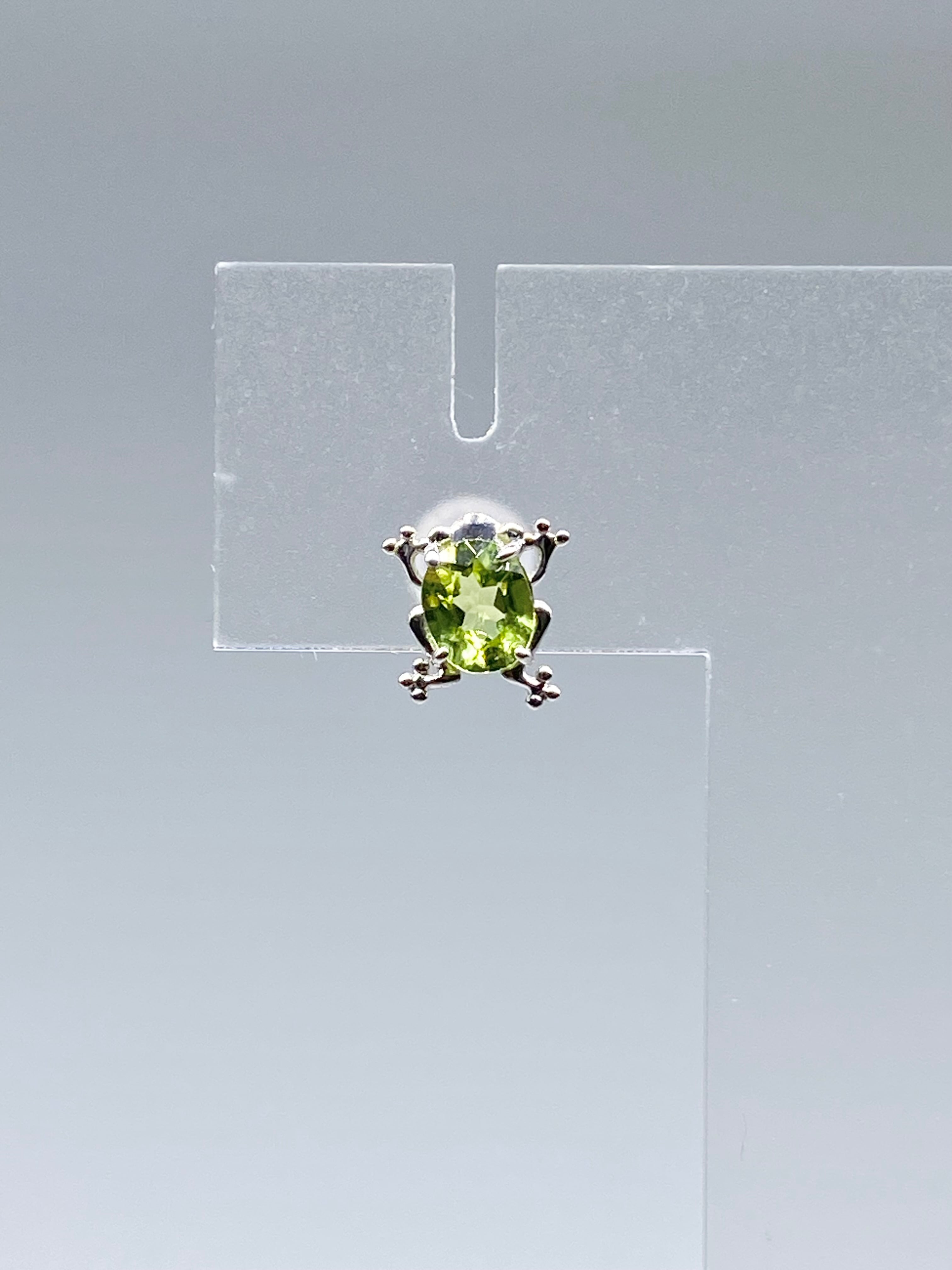 蛙の形のピアス枠に、若草色のペリドットが留められている一品。色合いからすると雨蛙が意識されたのでしょうか。宝石が留められたもので、かつプラチナ地金の蛙モチーフピアスは、ありそうで意外と見かけないですね。