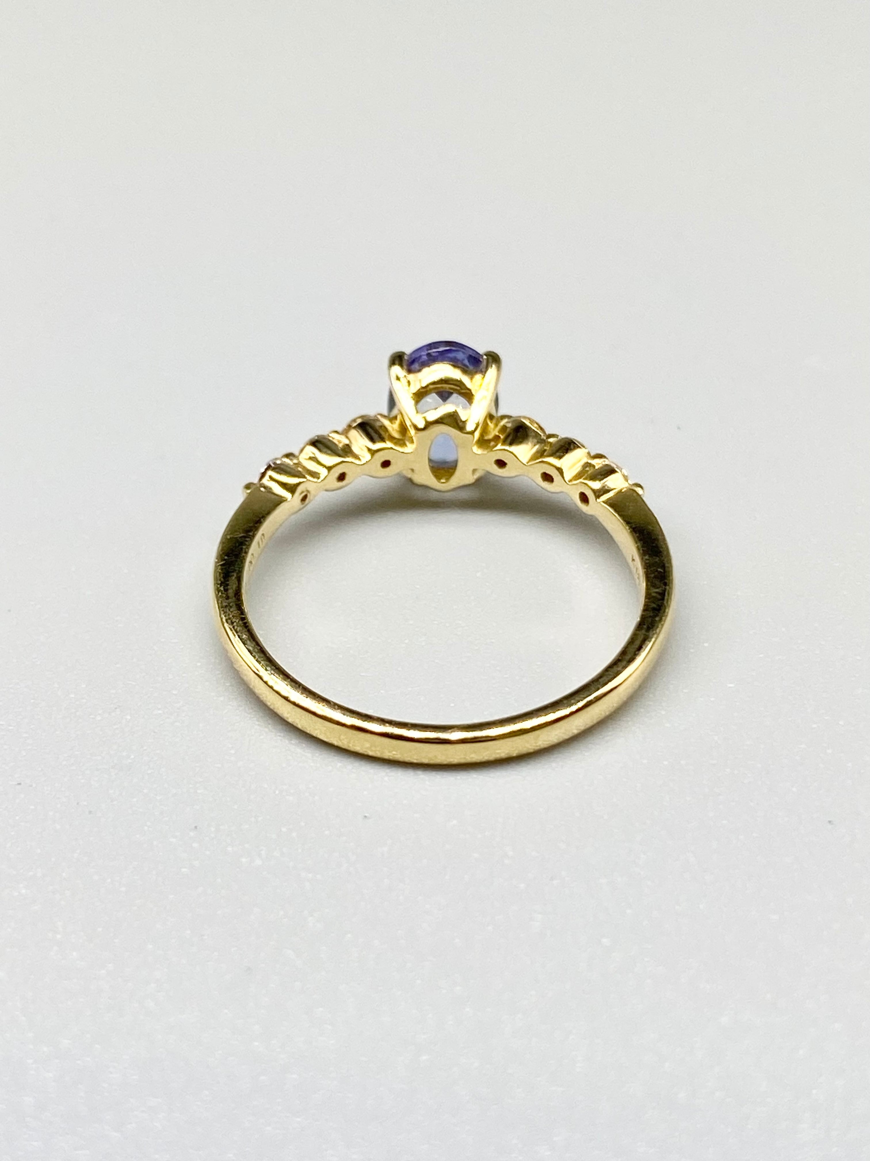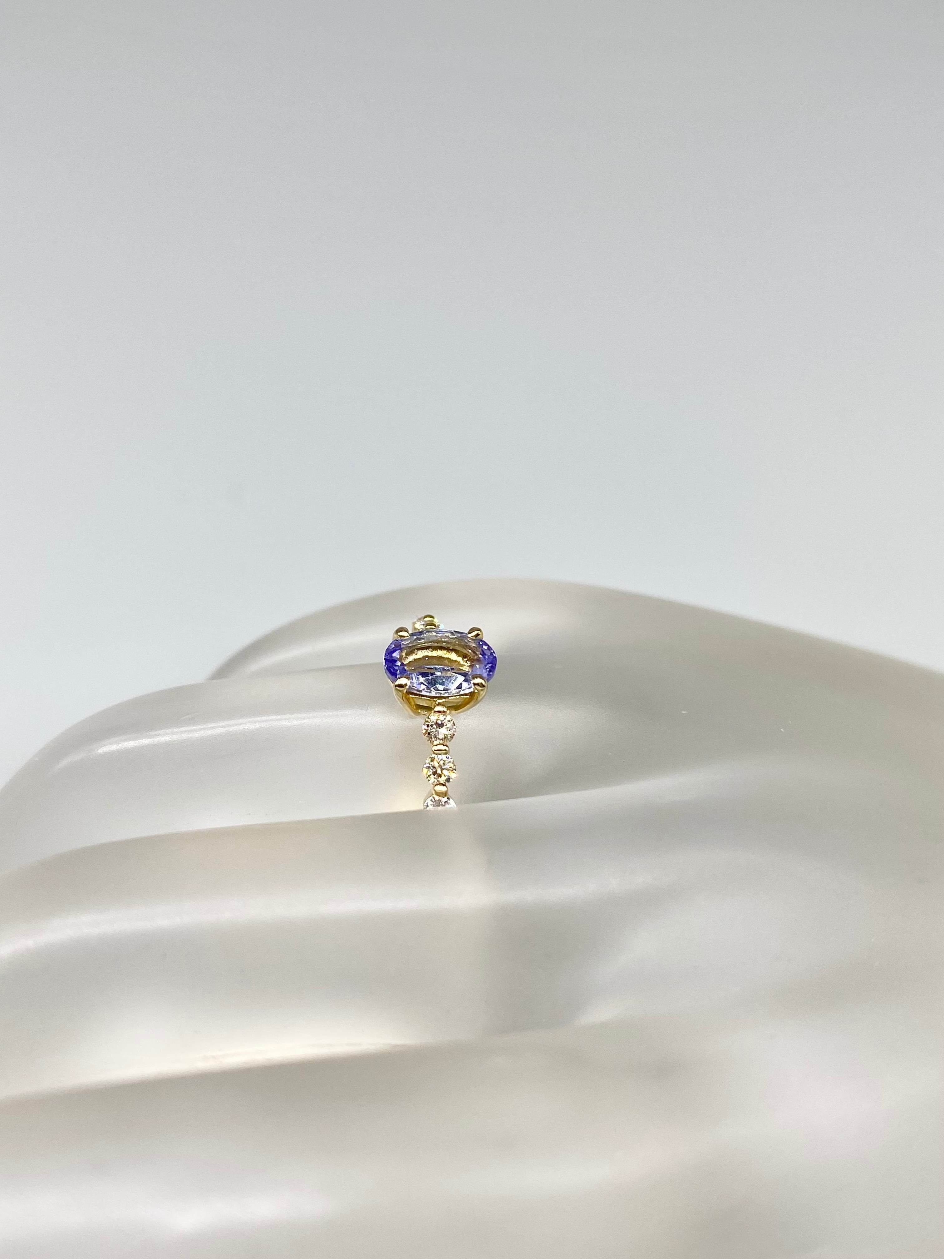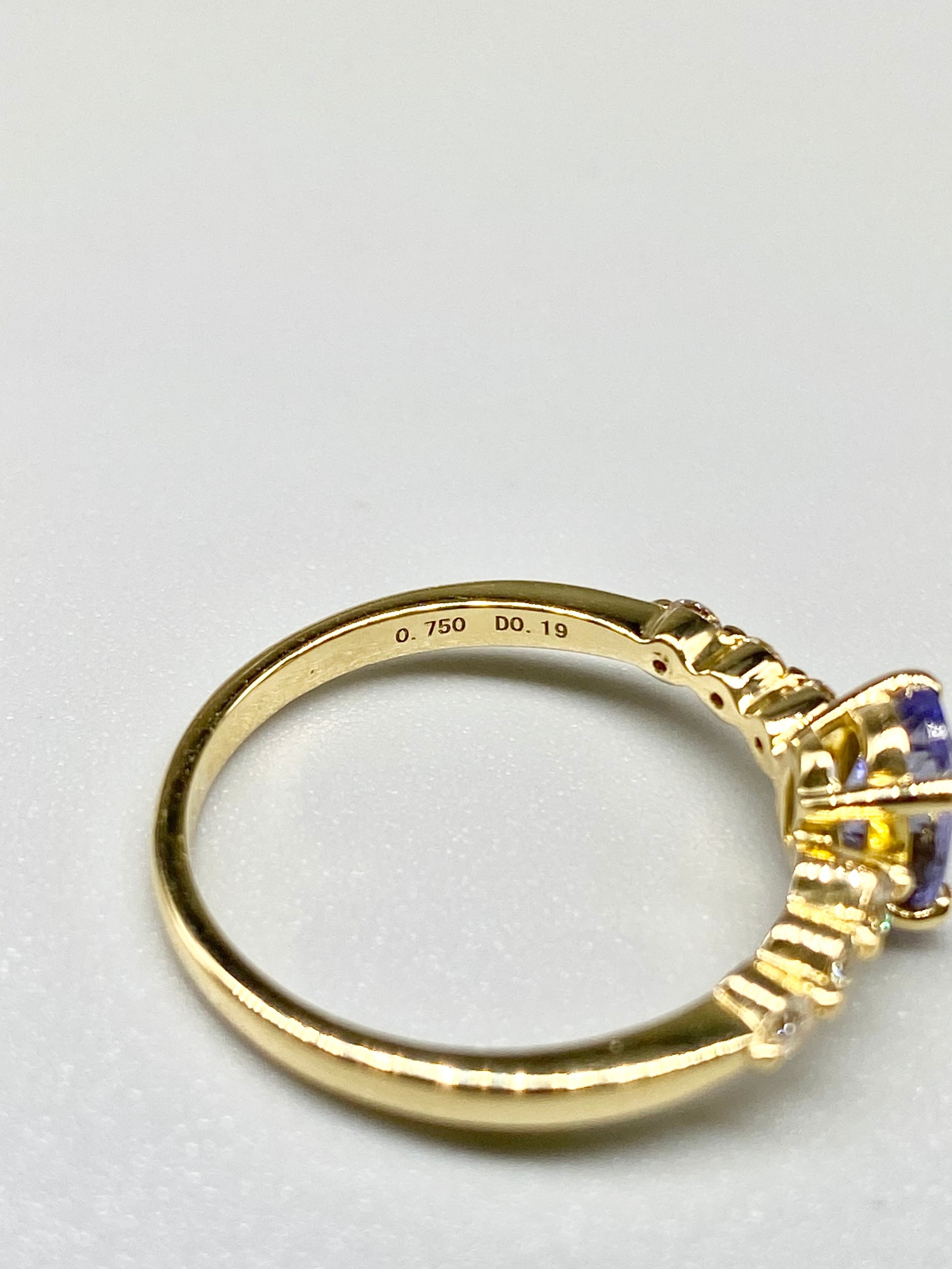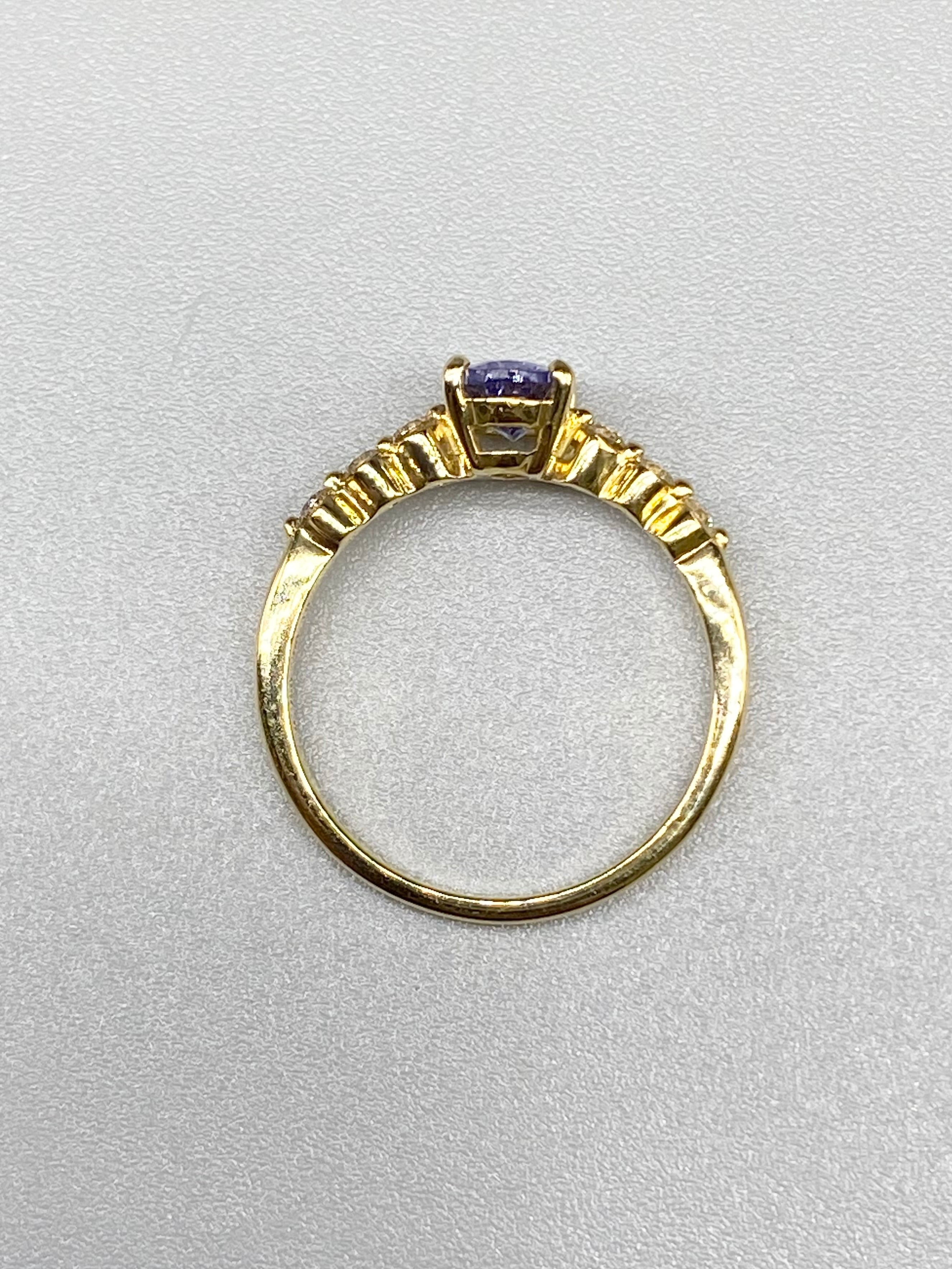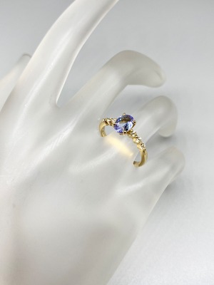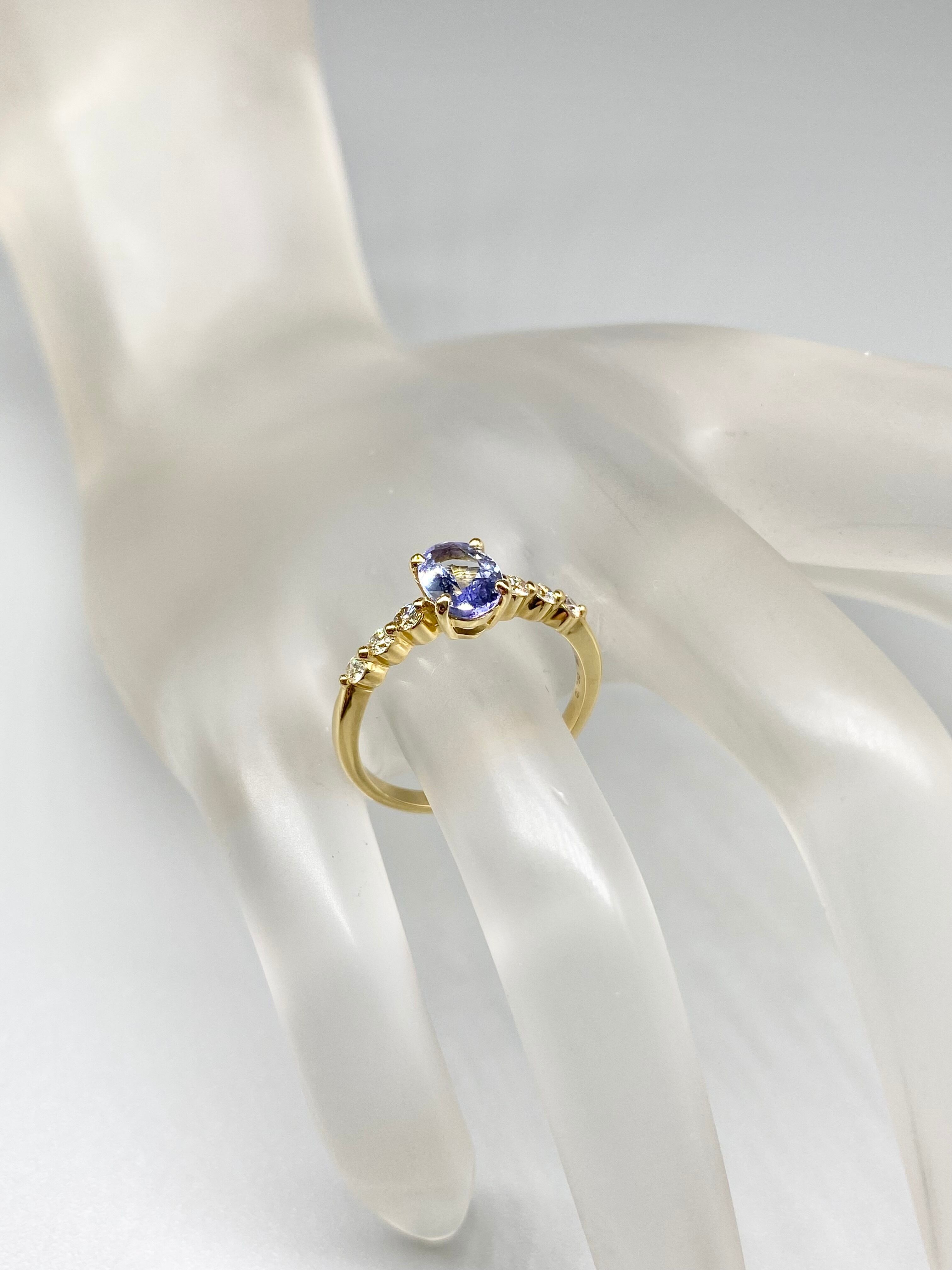2点留めされたラウンドのダイヤモンド3つに挟まれて、中央にゾイサイトがセッティングされている、全体的にシンプルなデザインのリング。アームが細めということもあって、ゾイサイトが目立つようになっています。