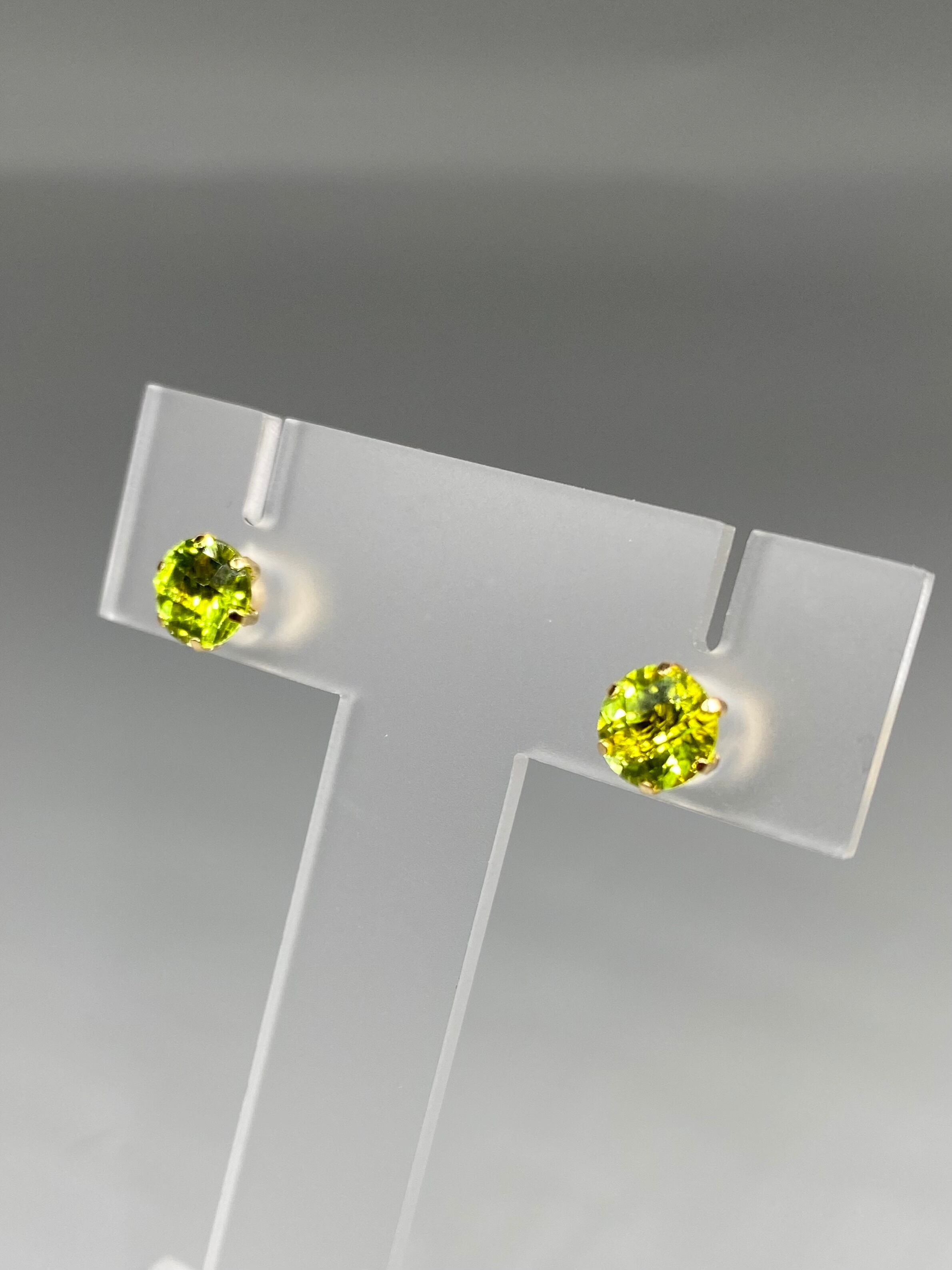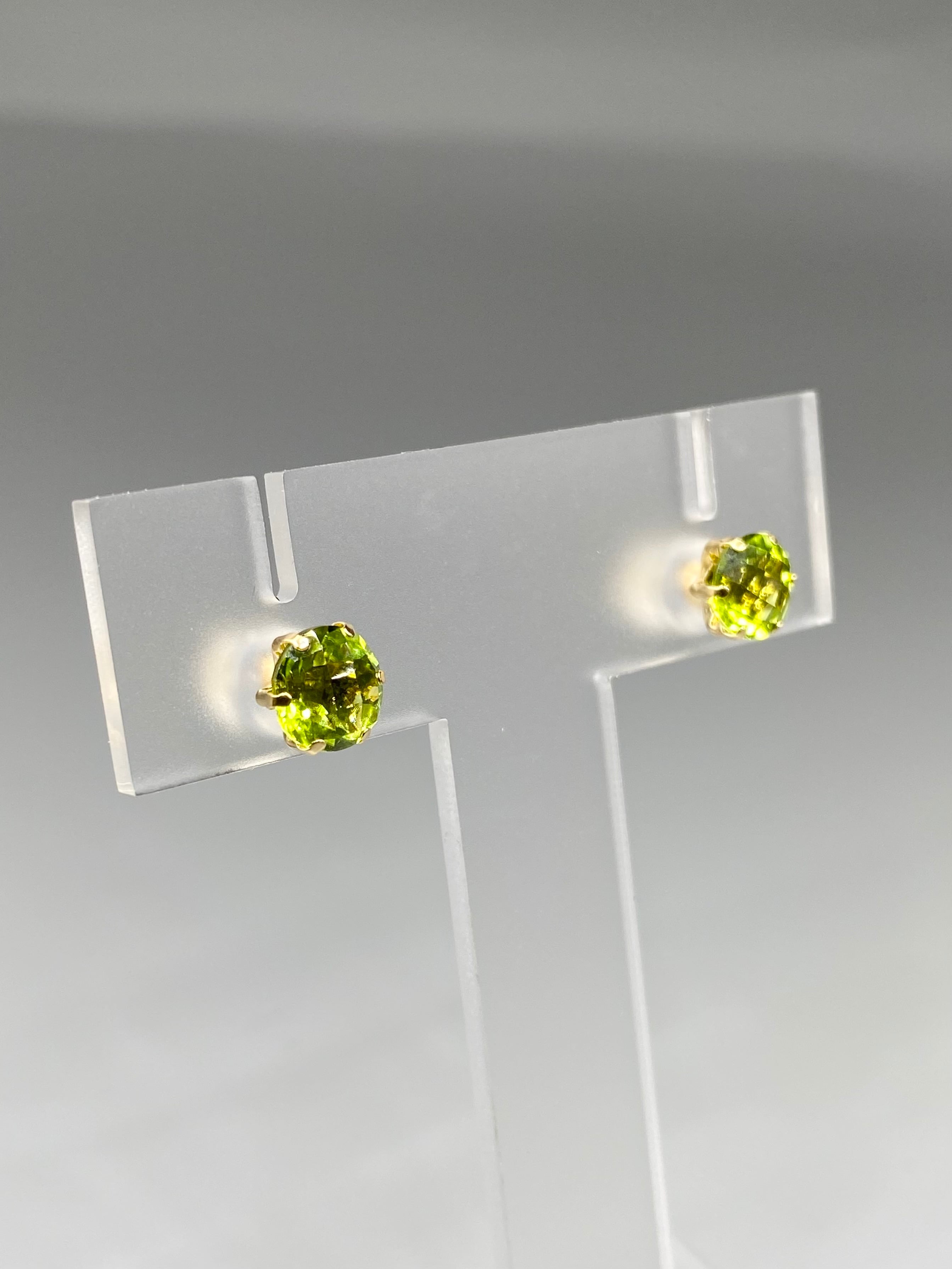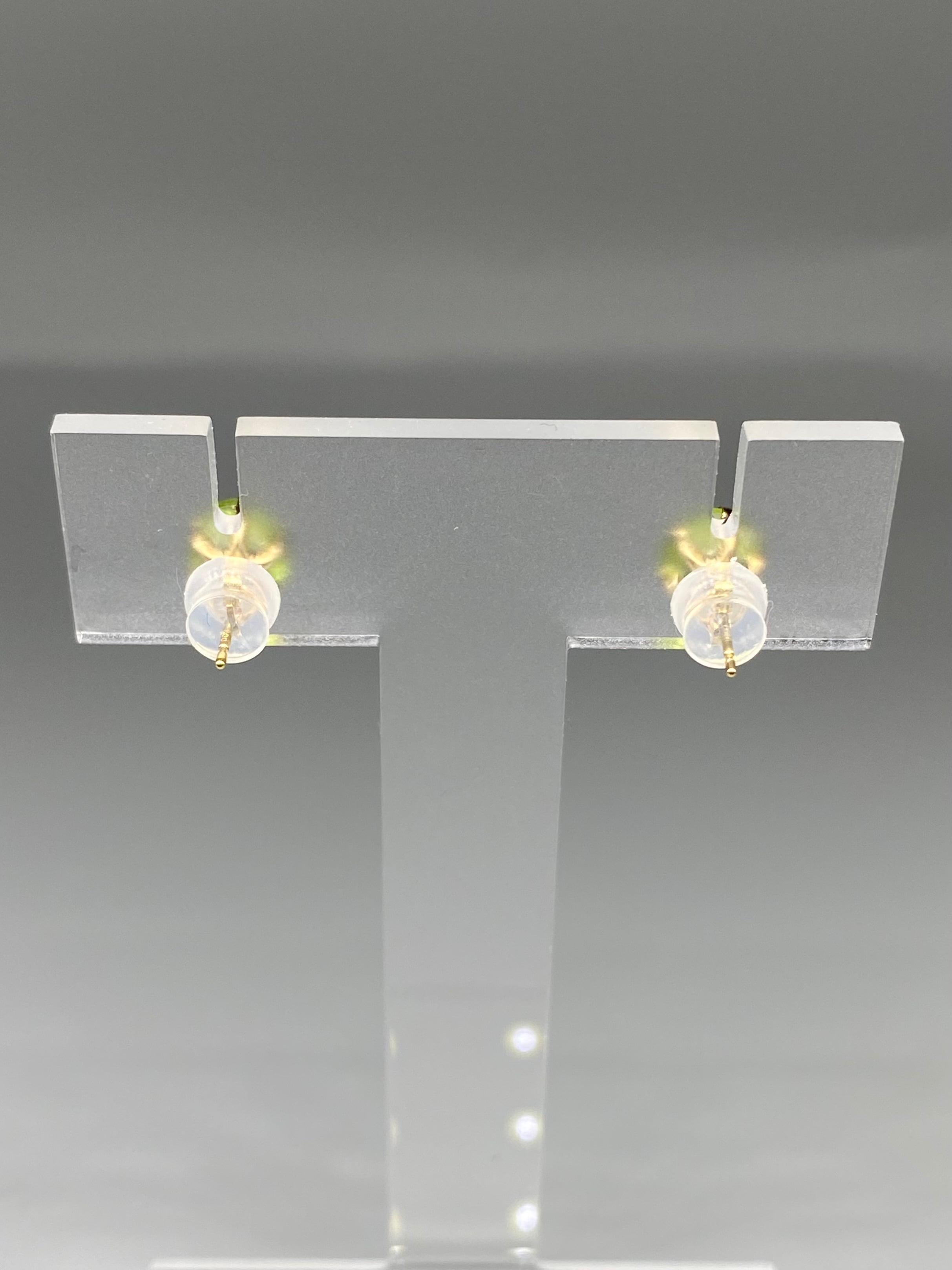 左右共に1ctのペリドットがきらめくスタッドピアス。表面は正方形のファセットが並んだチェッカーボードカットが施されており、パビリオン部分の細やかなカットと相まって独特な輝きを楽しむことができます。