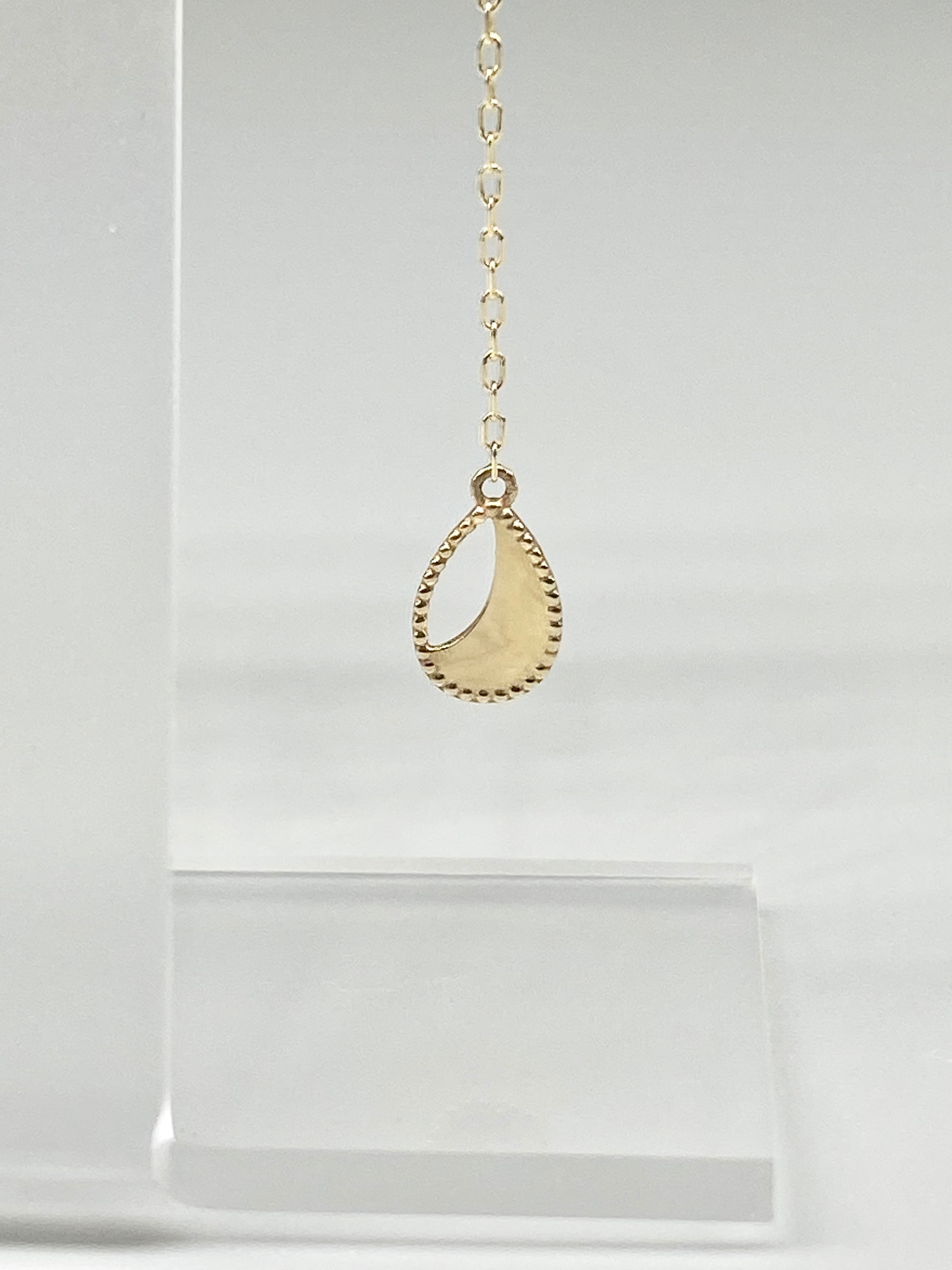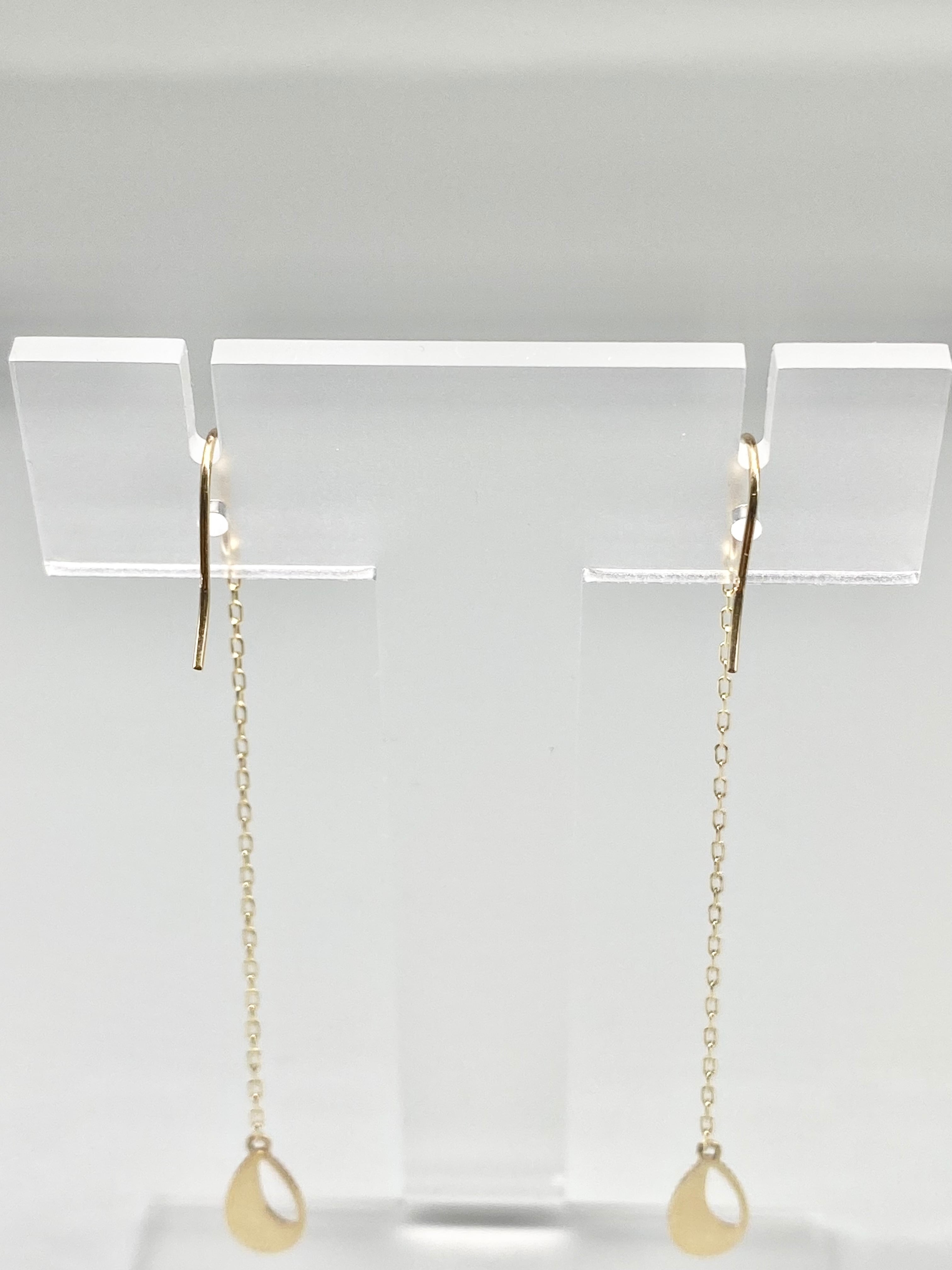 フック型のピアス金具から垂れるチェーンの先に雫型のモチーフがついたピアス。
