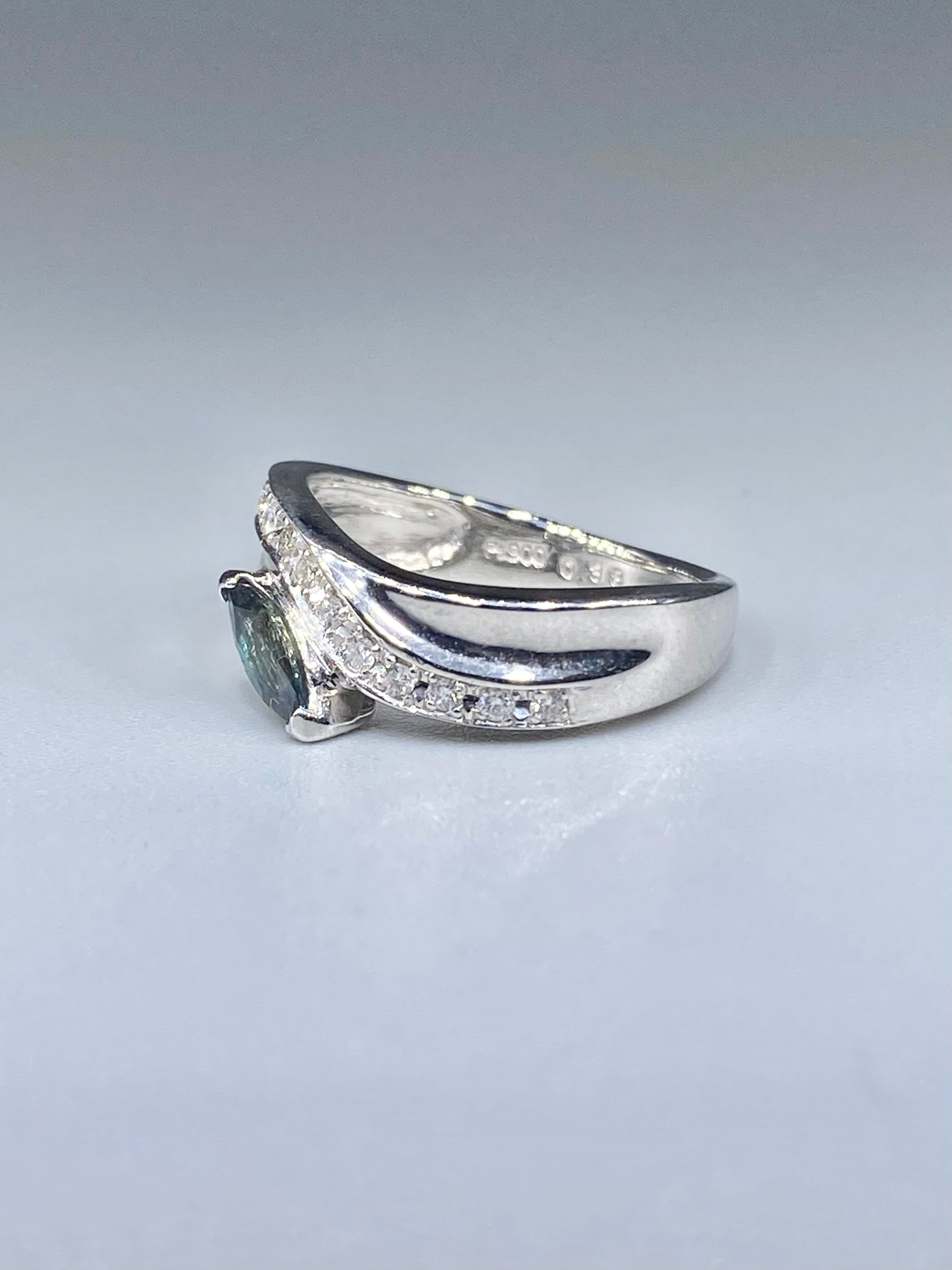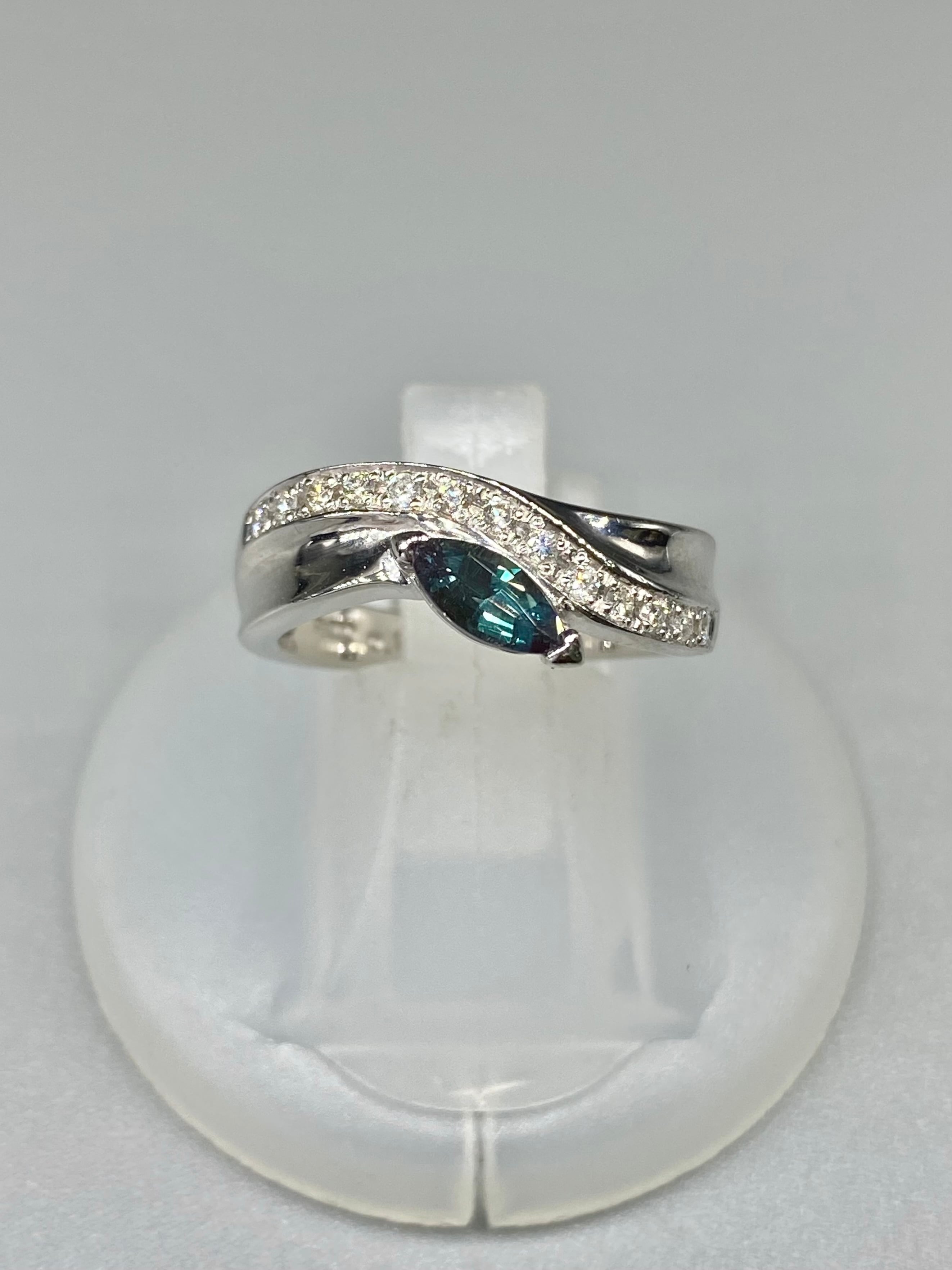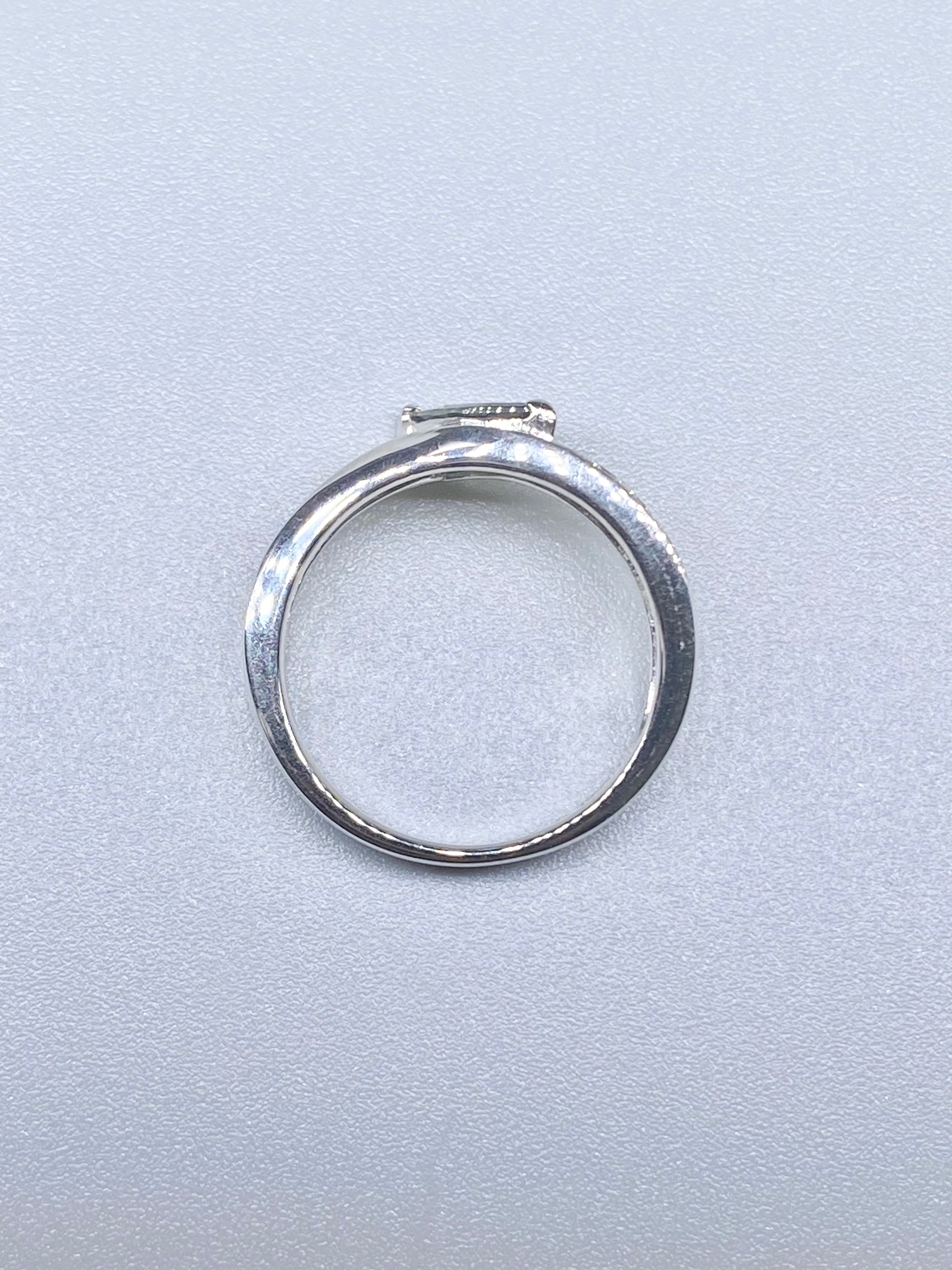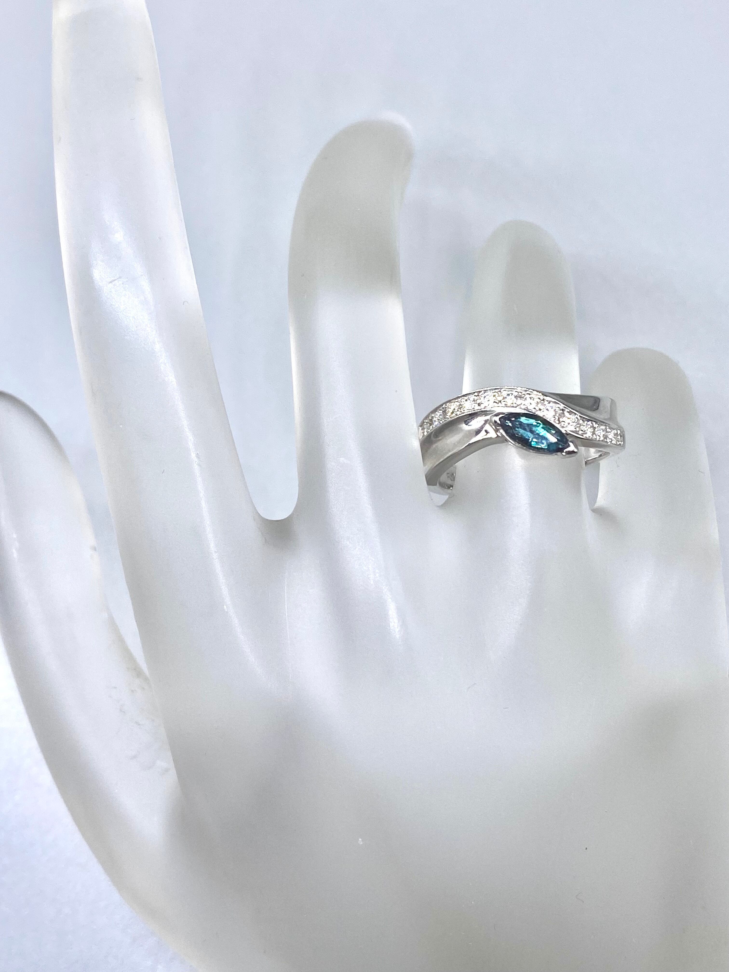 平板上の腕に湾曲した流れを感じさせるようにくぼみとダイヤモンドのレールがあり、それに添うようにアレキサンドライトがセットされたリング。