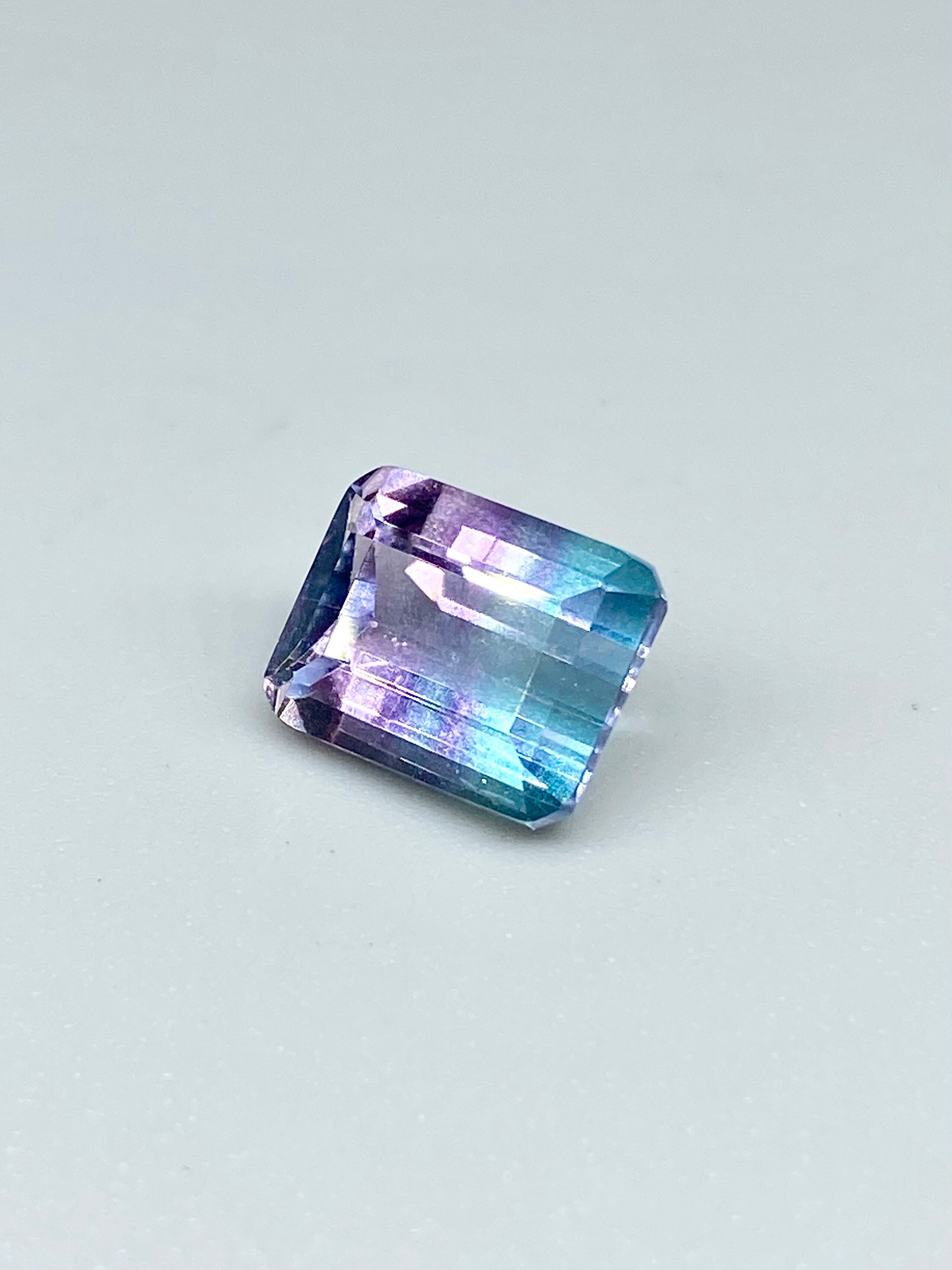 緑がかった淡い水色の中に、アメシストのように濃く魅力的な紫がきらめき、思わず見惚れてしまいます。エメラルドカットの特性が生かされ、光を受けることで表情豊かに輝きます。