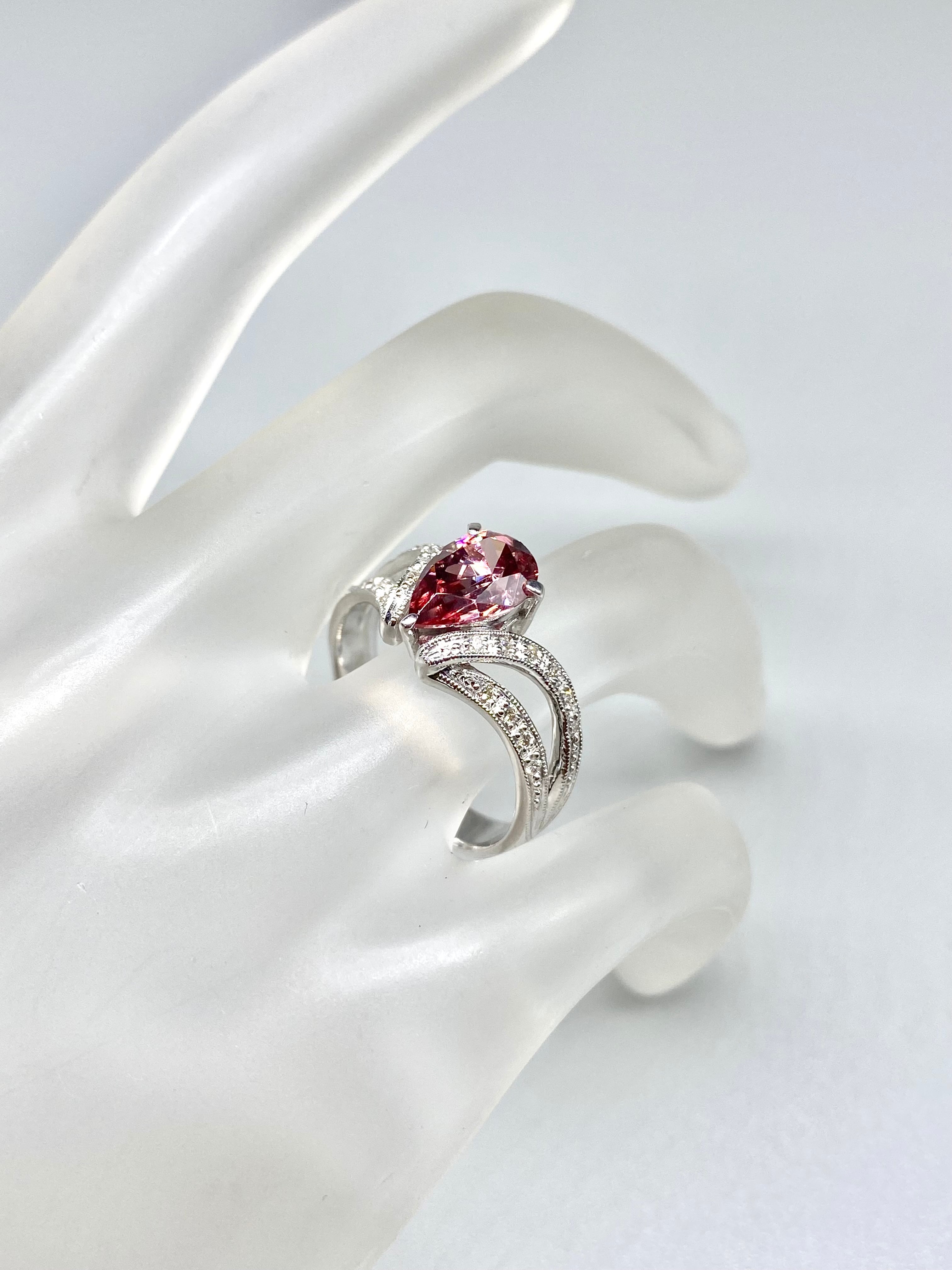 ぱっと見はかなり落ち着いた色合いとなりますが、少しでも光が当たるとジルコンらしい強い煌めきを放ってくれます。輝きの中には一部レッドも入っており、また中央部では(光源によっては)ファイアも見られるため、実際に着けてみると予想以上に主張が強く感じられるでしょう。