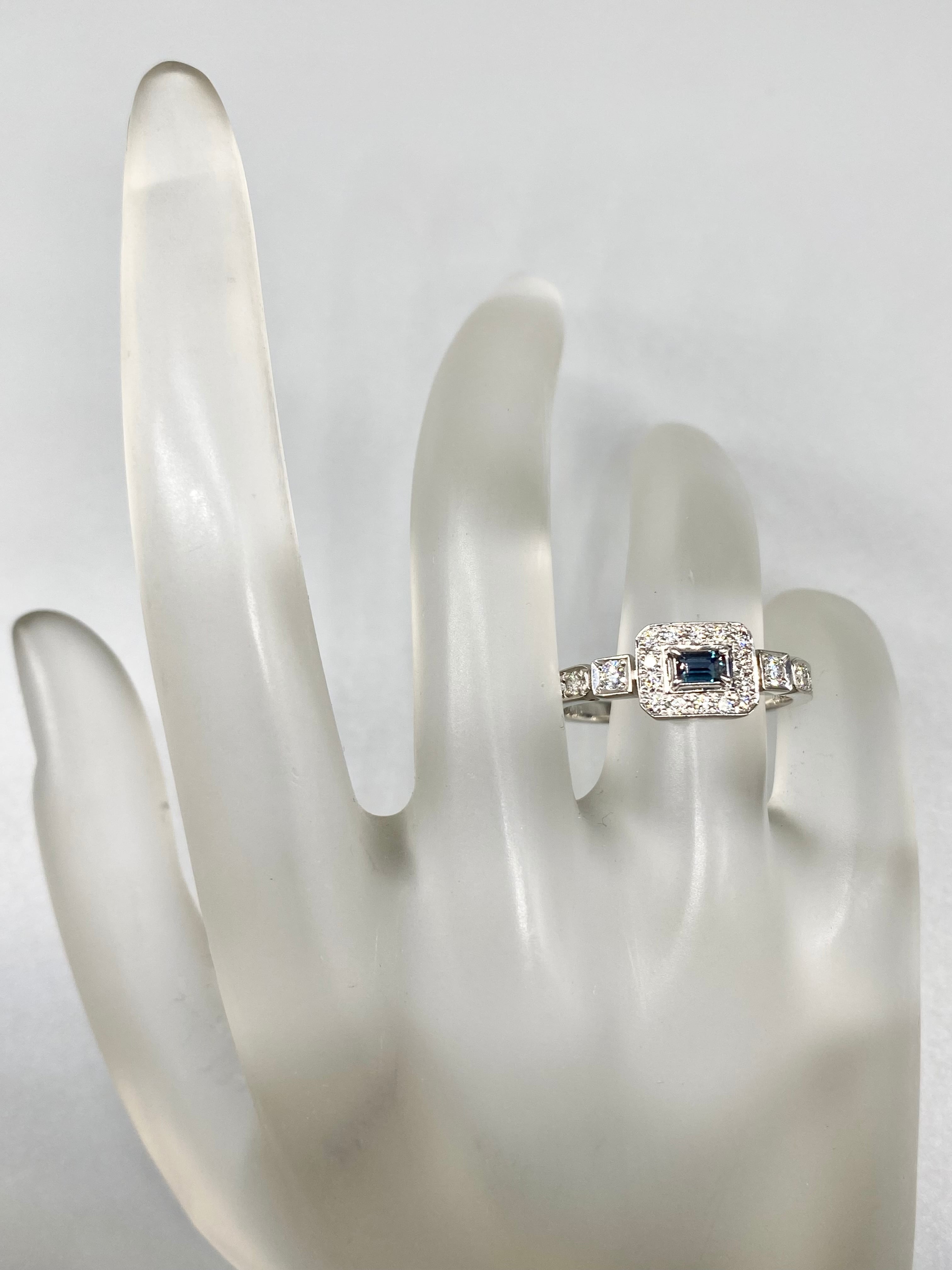 全体的に直線的で、腕の断面やセンターストーン、その周りも四角くスタイリッシュな印象を受けるデザインのリングです。