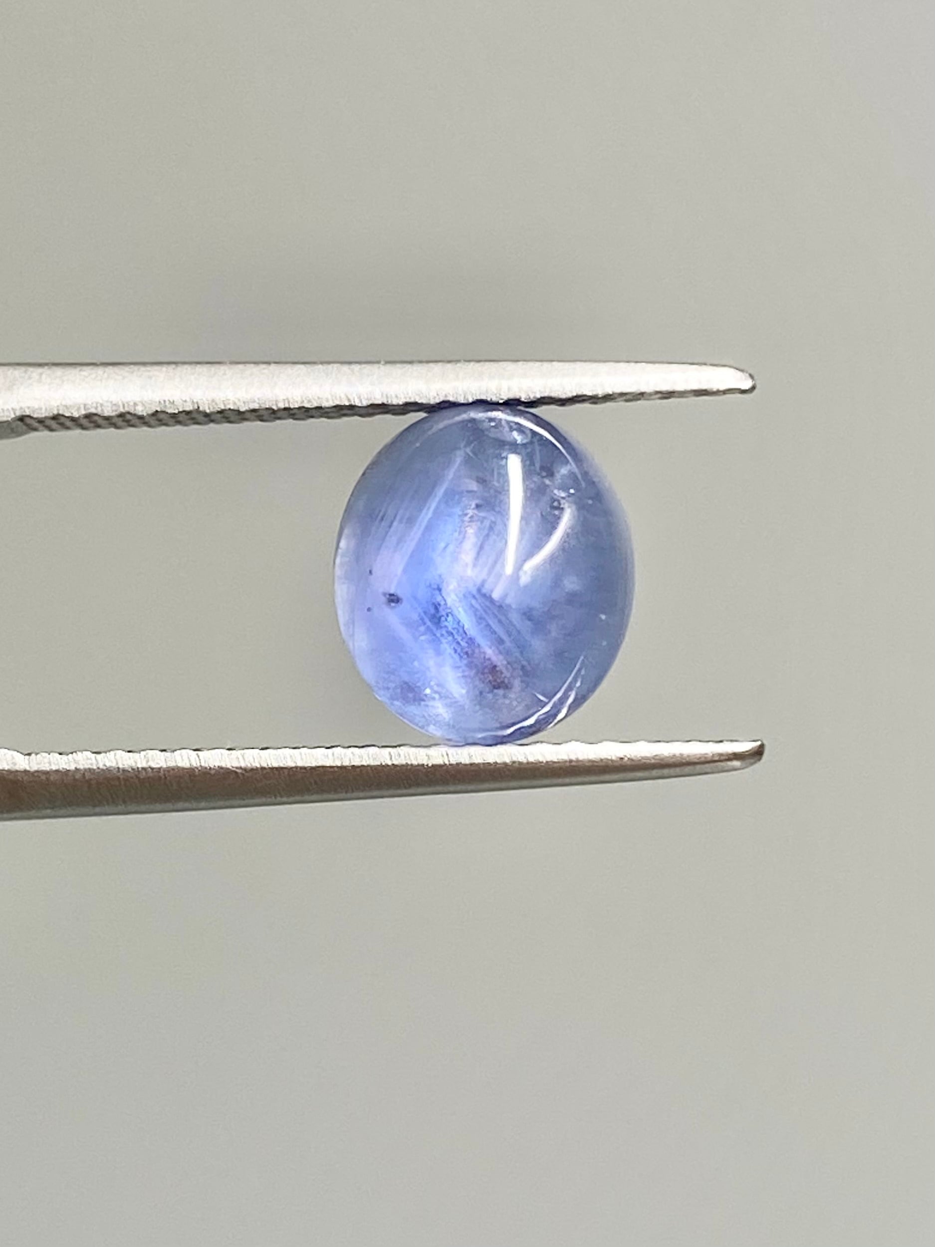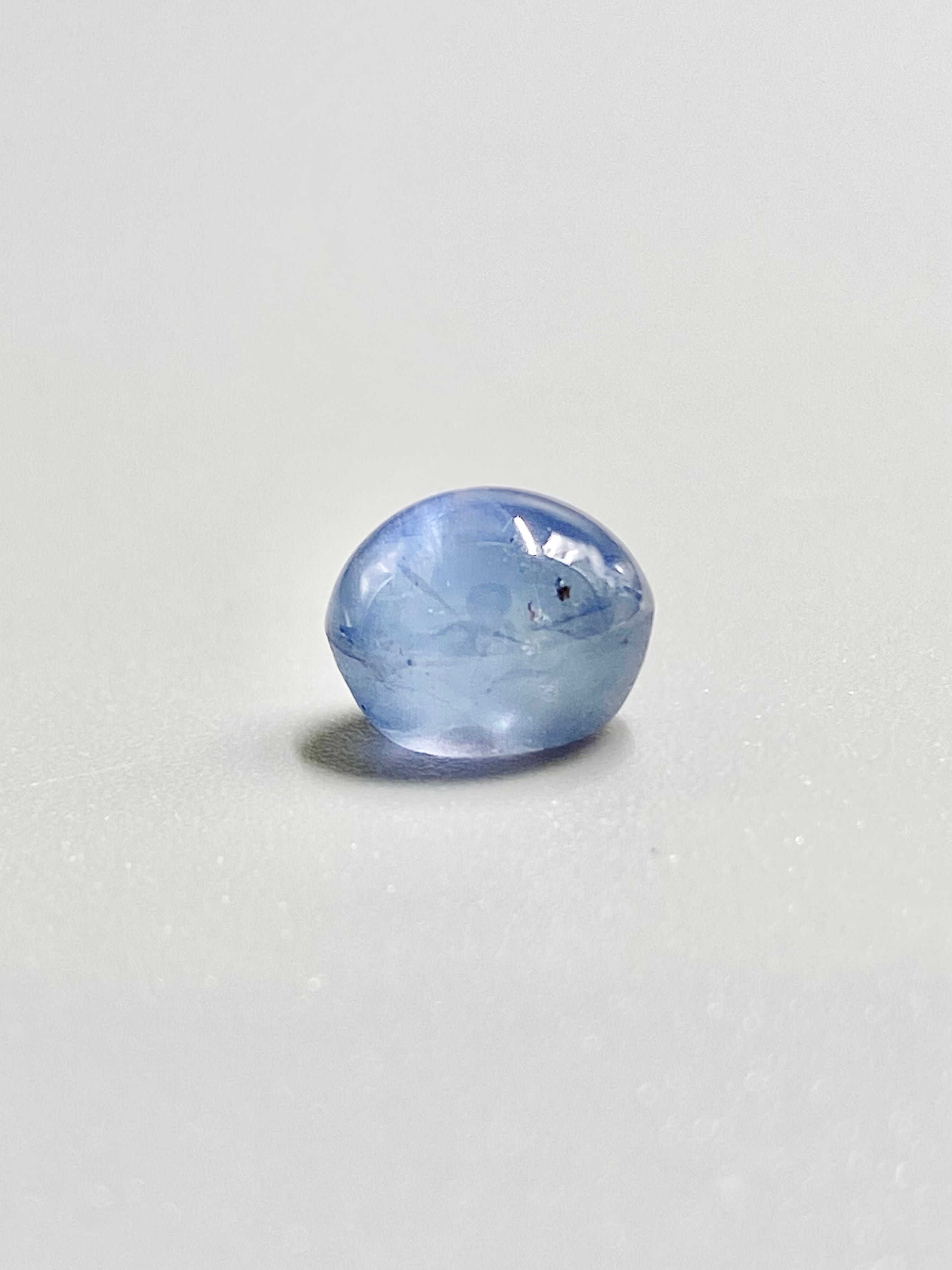 やや淡めのブルーで、湖面のような落ち着きがあります。スターサファイアとしては比較的色が乗っている部類と思われますね。内部中央部に色帯が見られ、こちらはよく見ると目視でも確認できますが、ぱっと見で極端に目立つほどではありません。