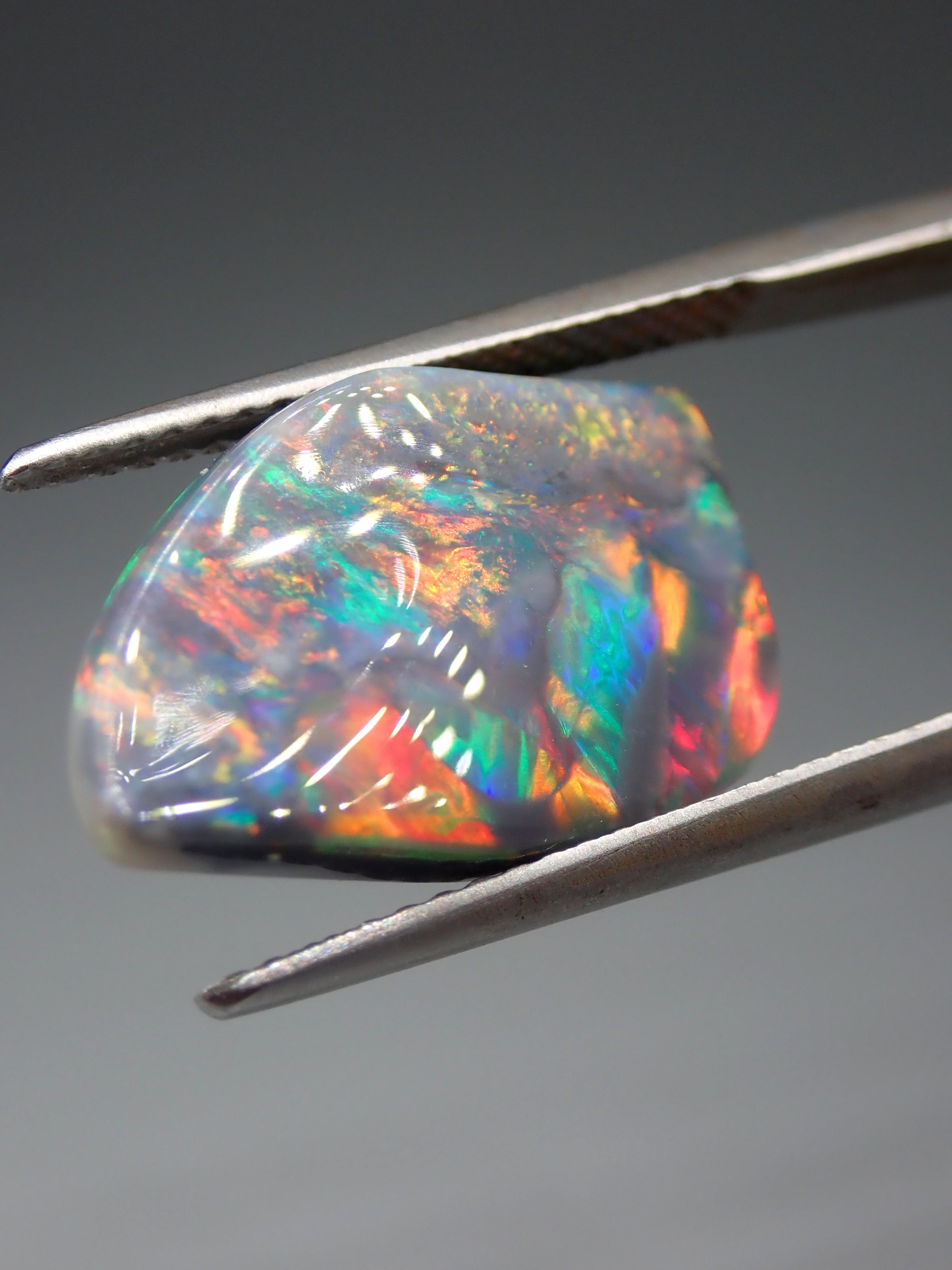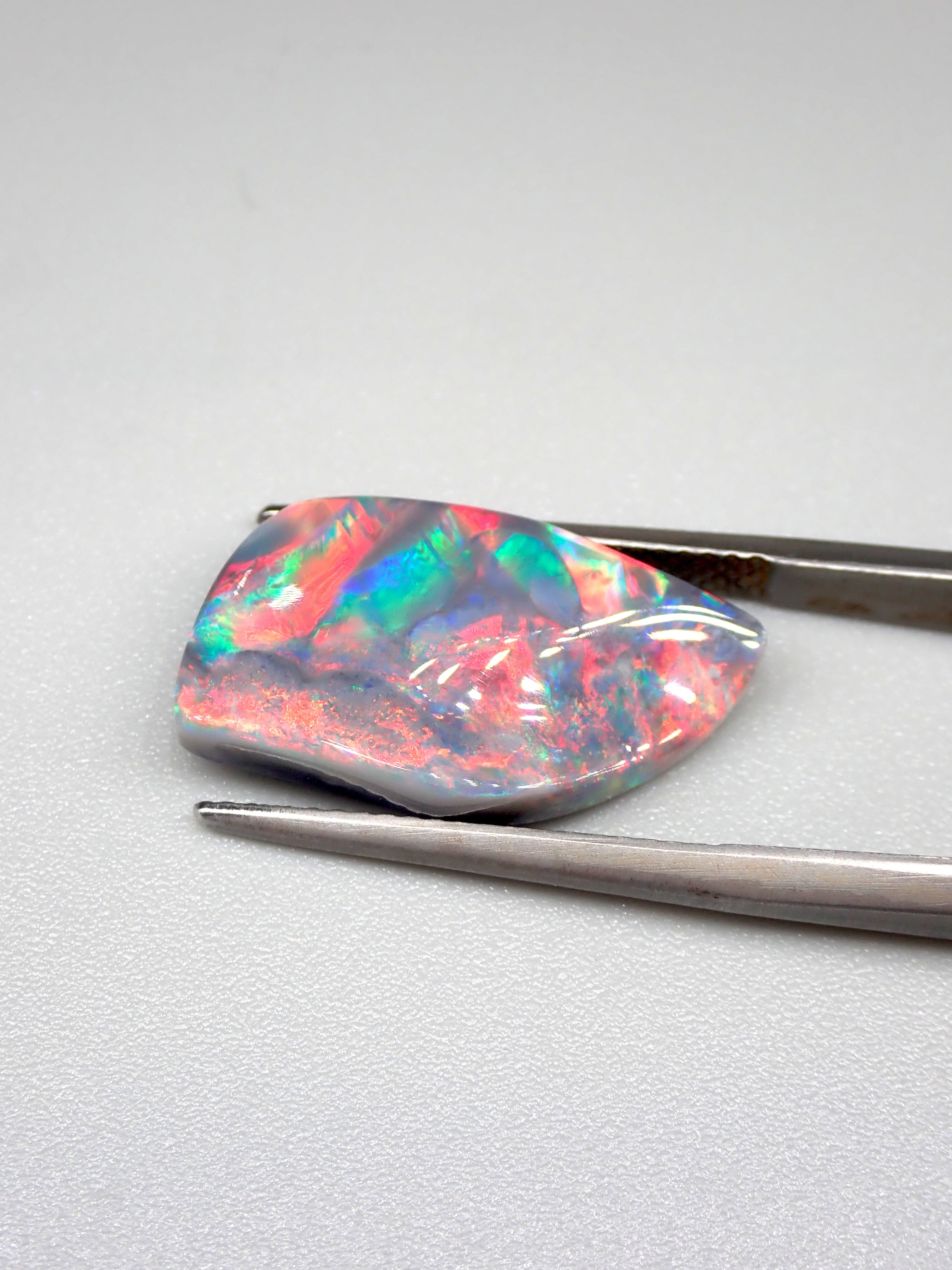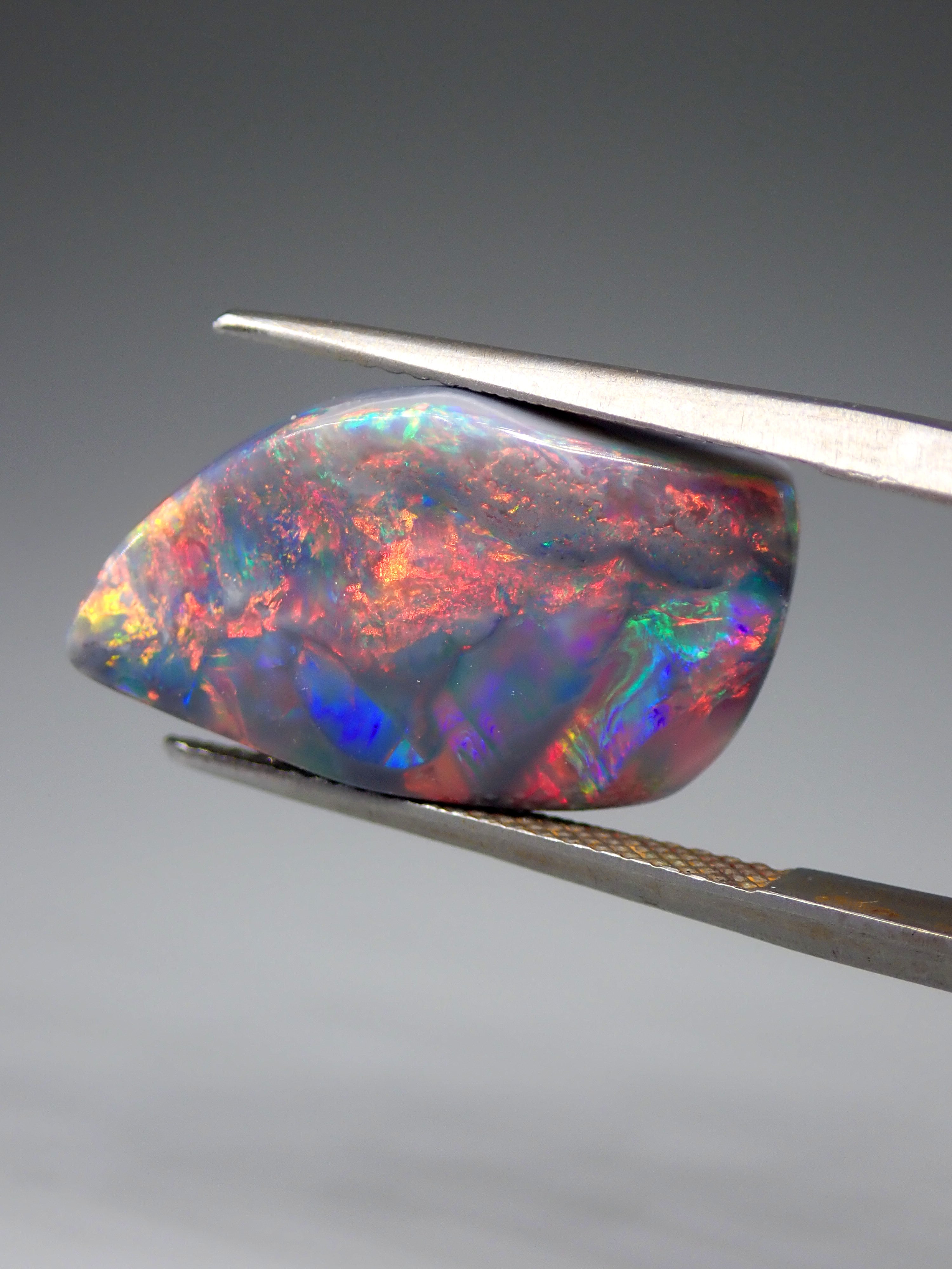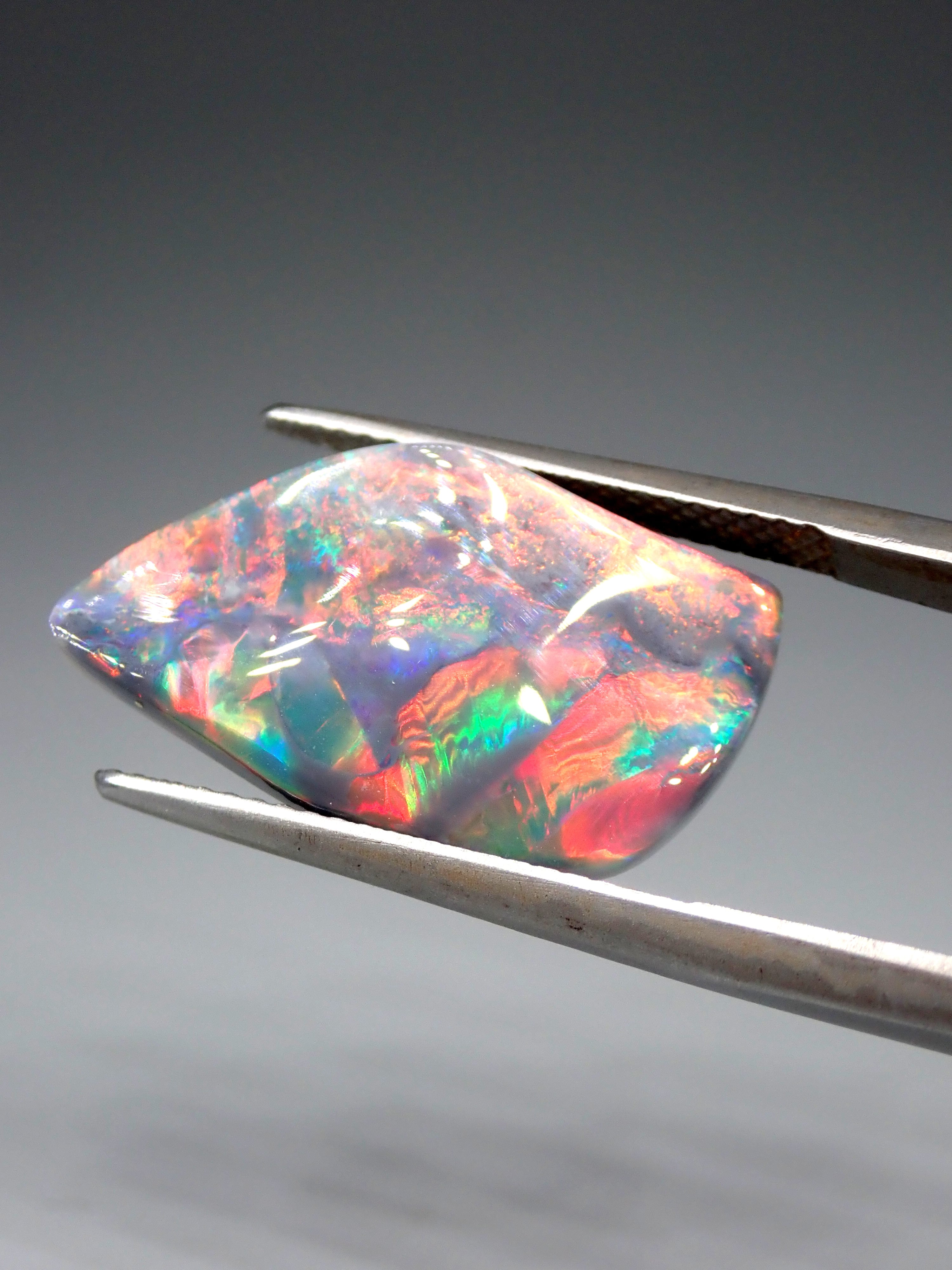 色/輝き:赤い遊色が主役の大粒ブラックオパール。傾けるたびに燃え上がるようなメラメラとした遊色が現れ、オレンジがかった鮮やかな赤からネオングリーン、そして青へと変わる美しい色彩をお楽しみいただけます。