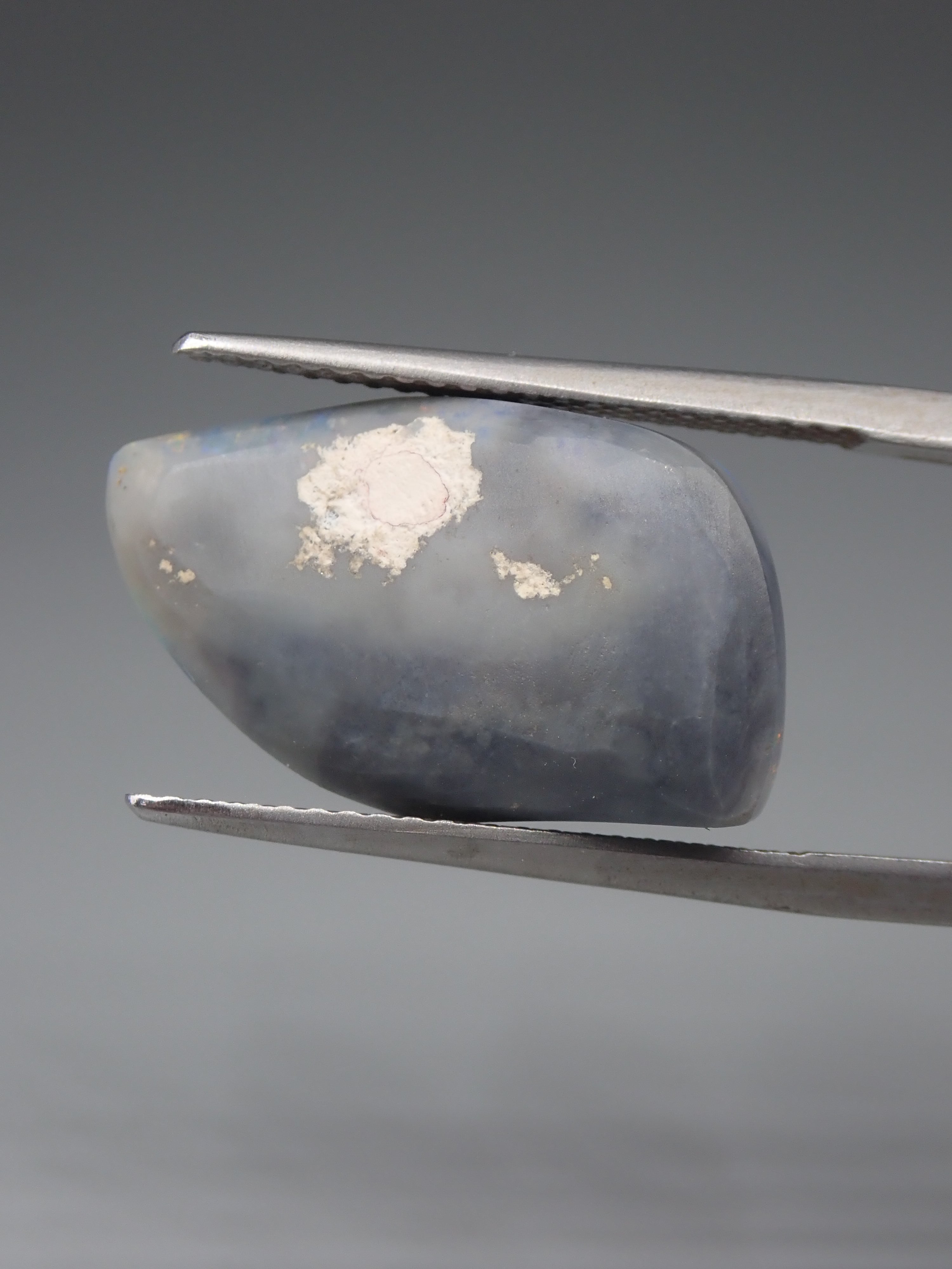 地色は裏表共に濃いグレー。背面の一部に母岩と思われる白い部分が残ります。