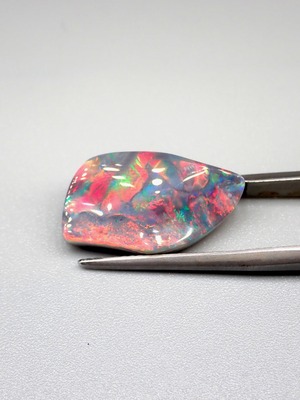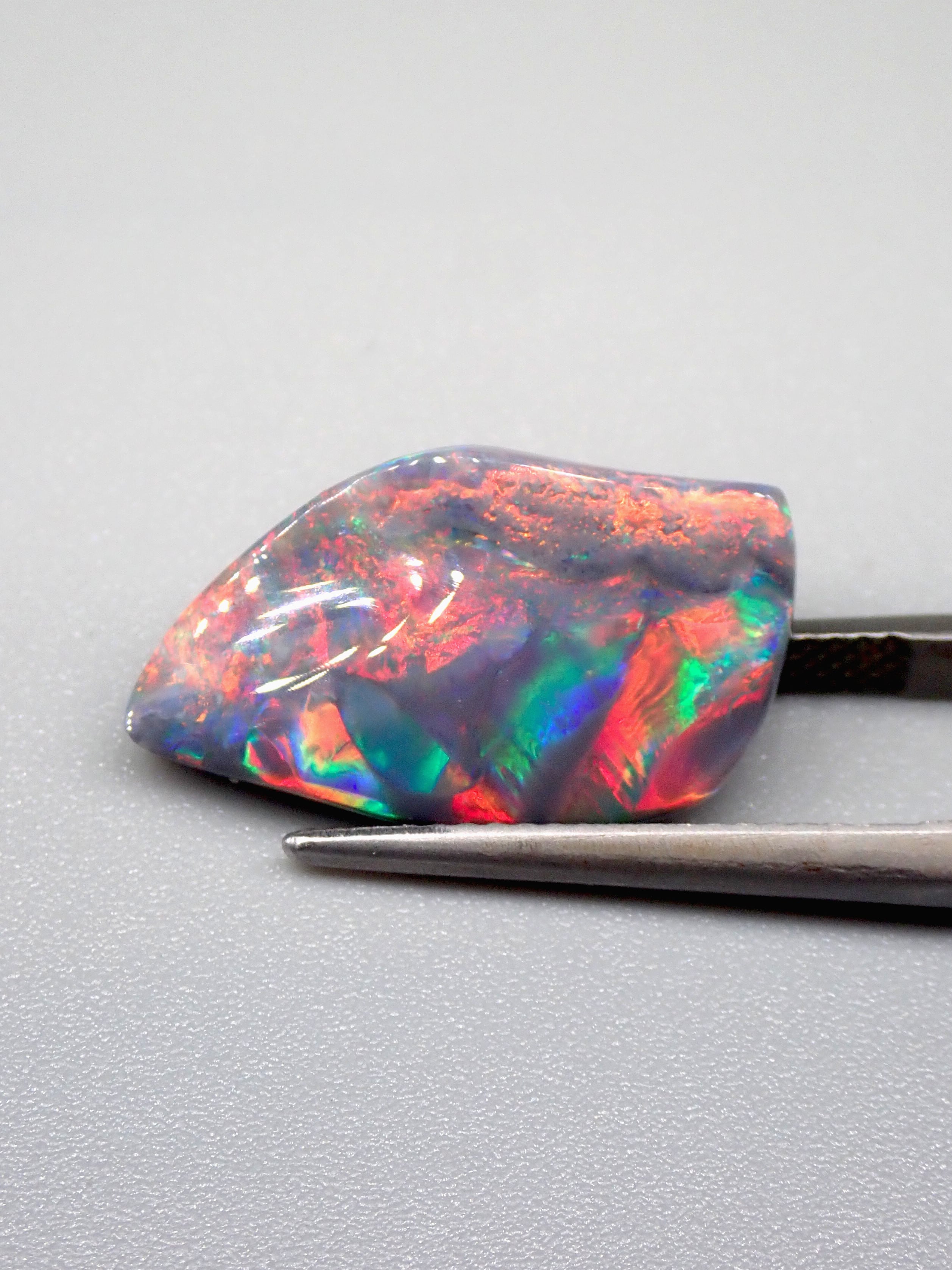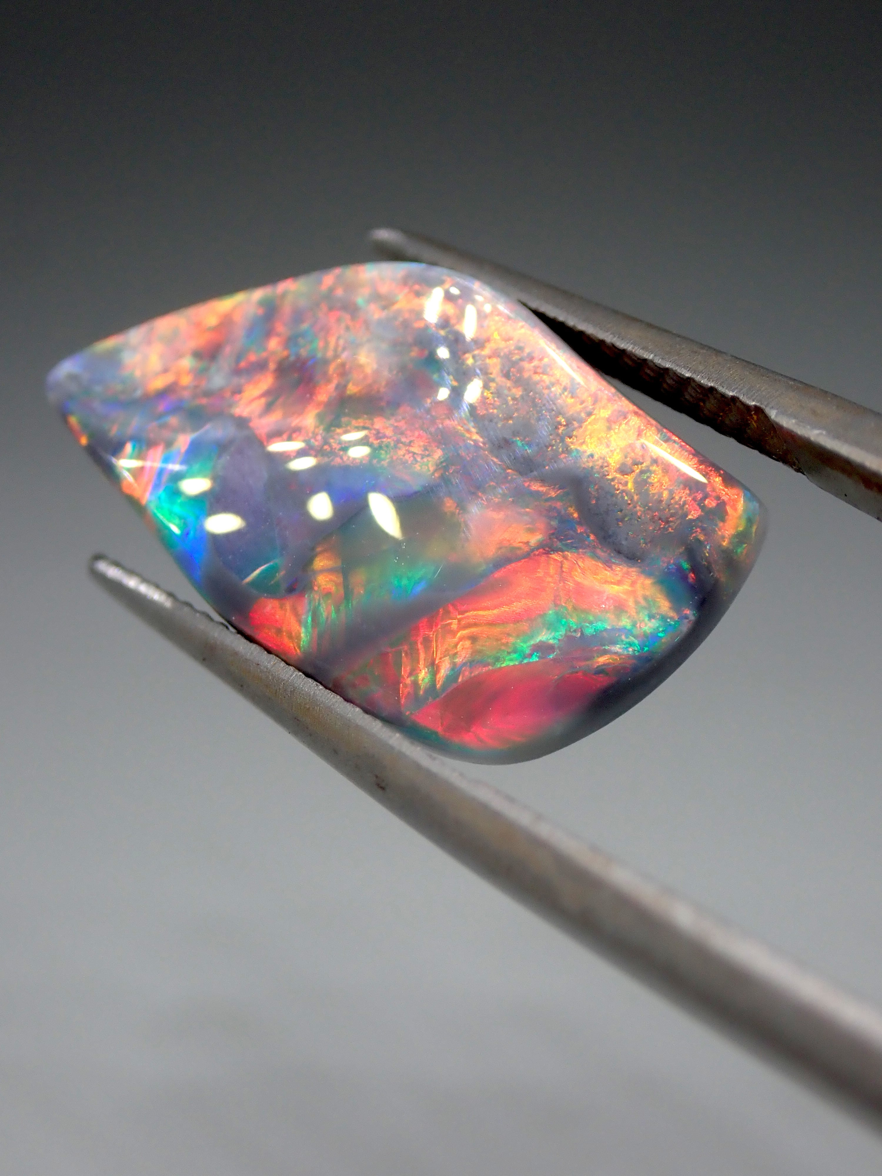 よくあるオパールの遊色は、赤→オレンジ→黄色→グリーン→青というように虹色のグラデーション変化をしますが、こちらのオパールは黄色が抜け、ベニコンゴウインコの翼のごとく鮮やかで印象的な色移りを見せてくれます。