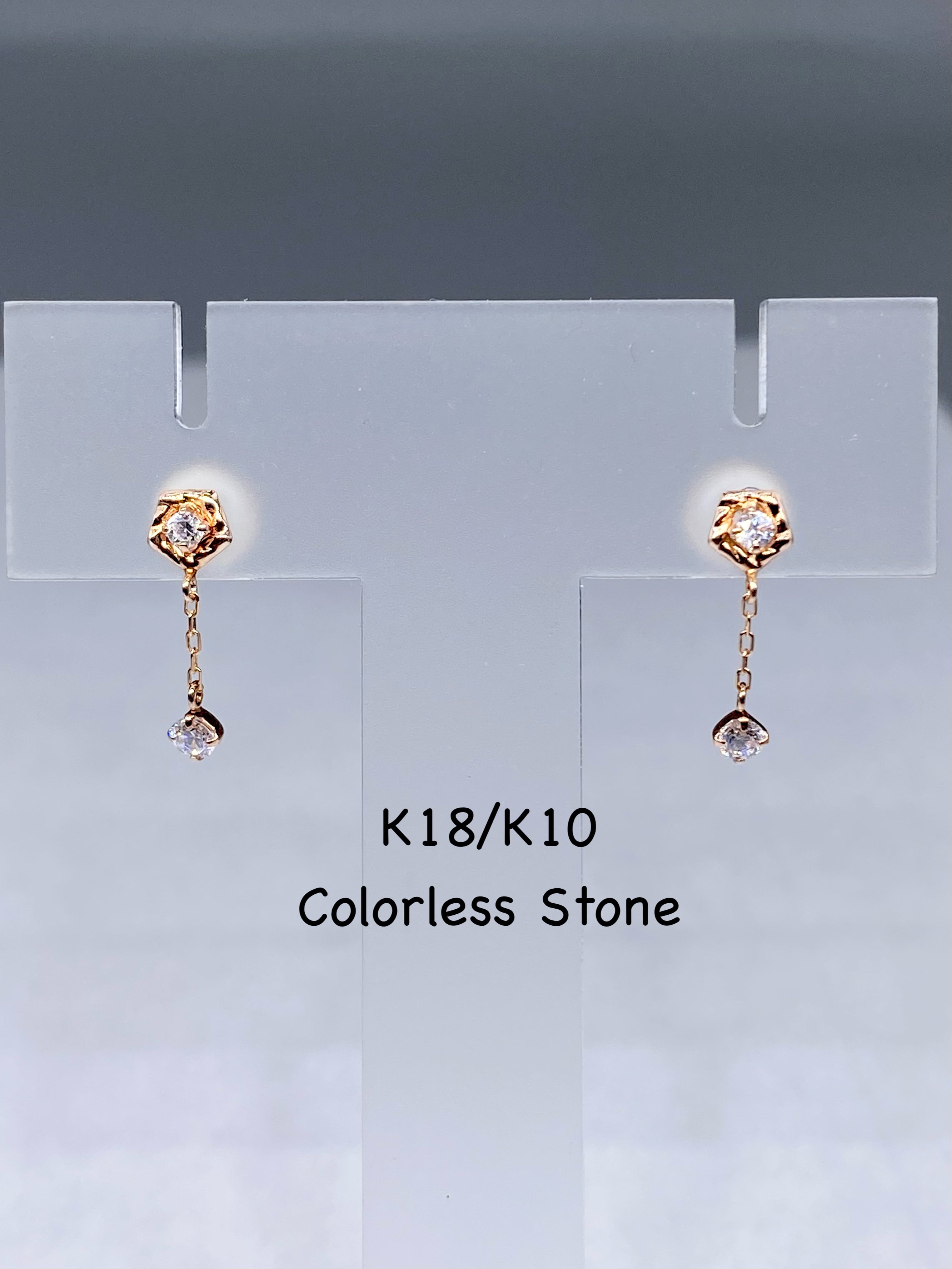 カラーレスの透明石が留められた、18金/10金のピアスのご紹介です。ポスト部分が18金で、トップ部分は10金となります。地金の色はピンクゴールドです。また、キャッチはシリコンキャッチとなります。