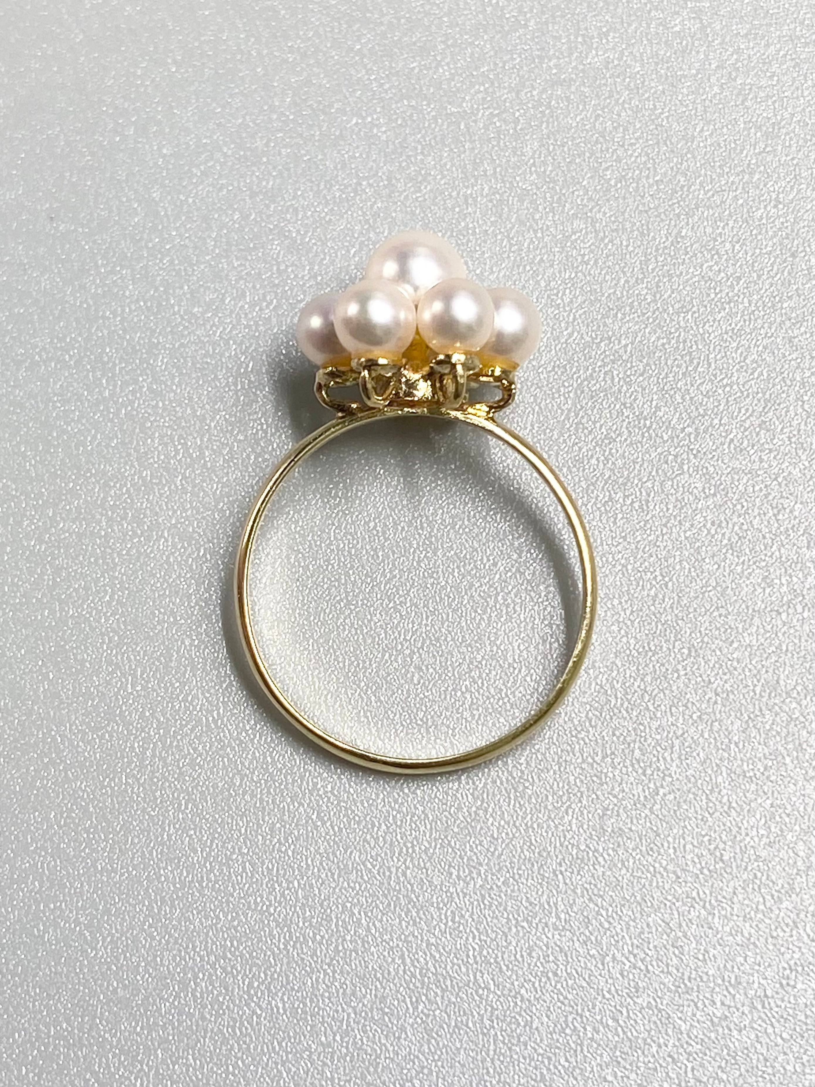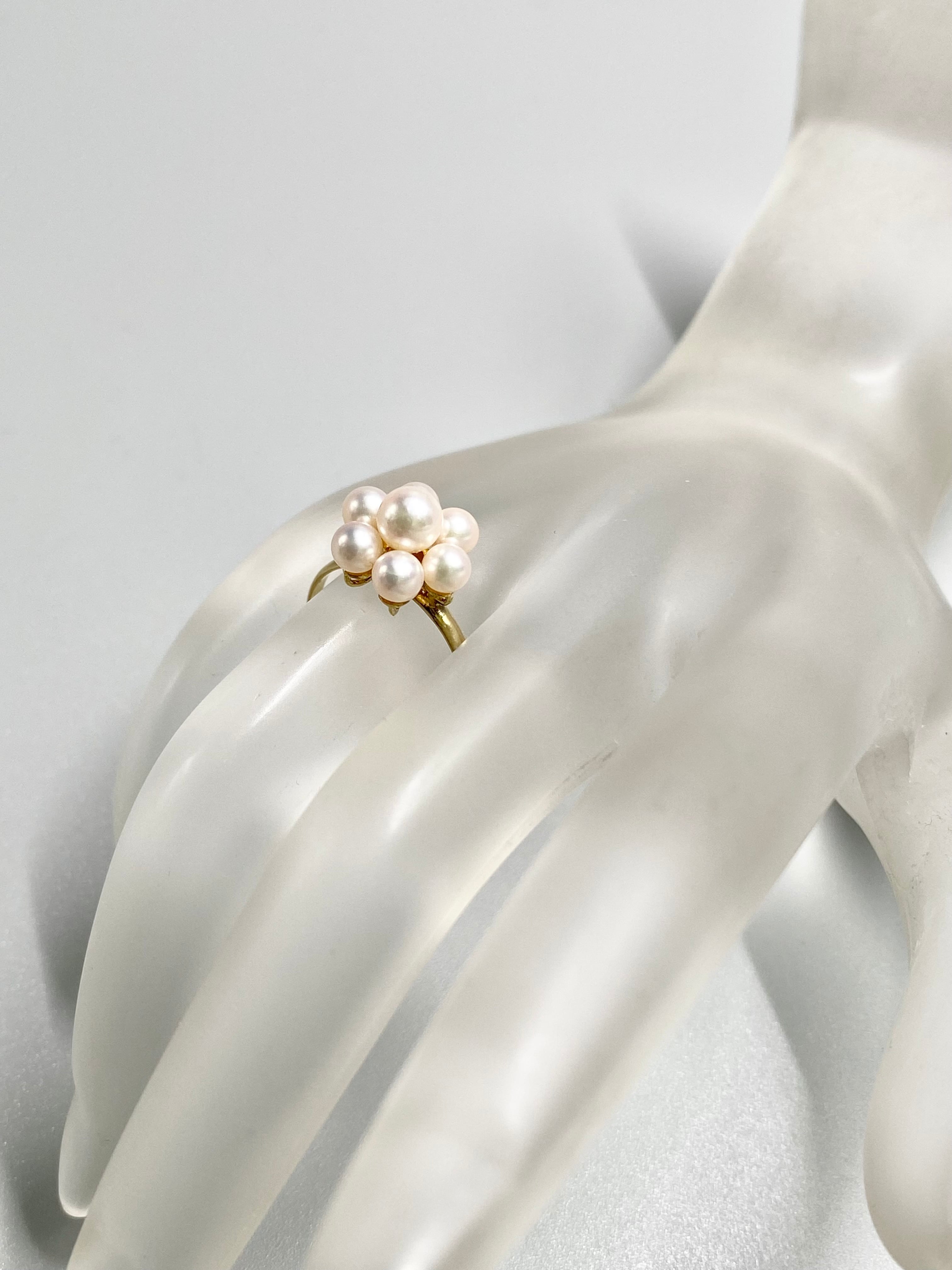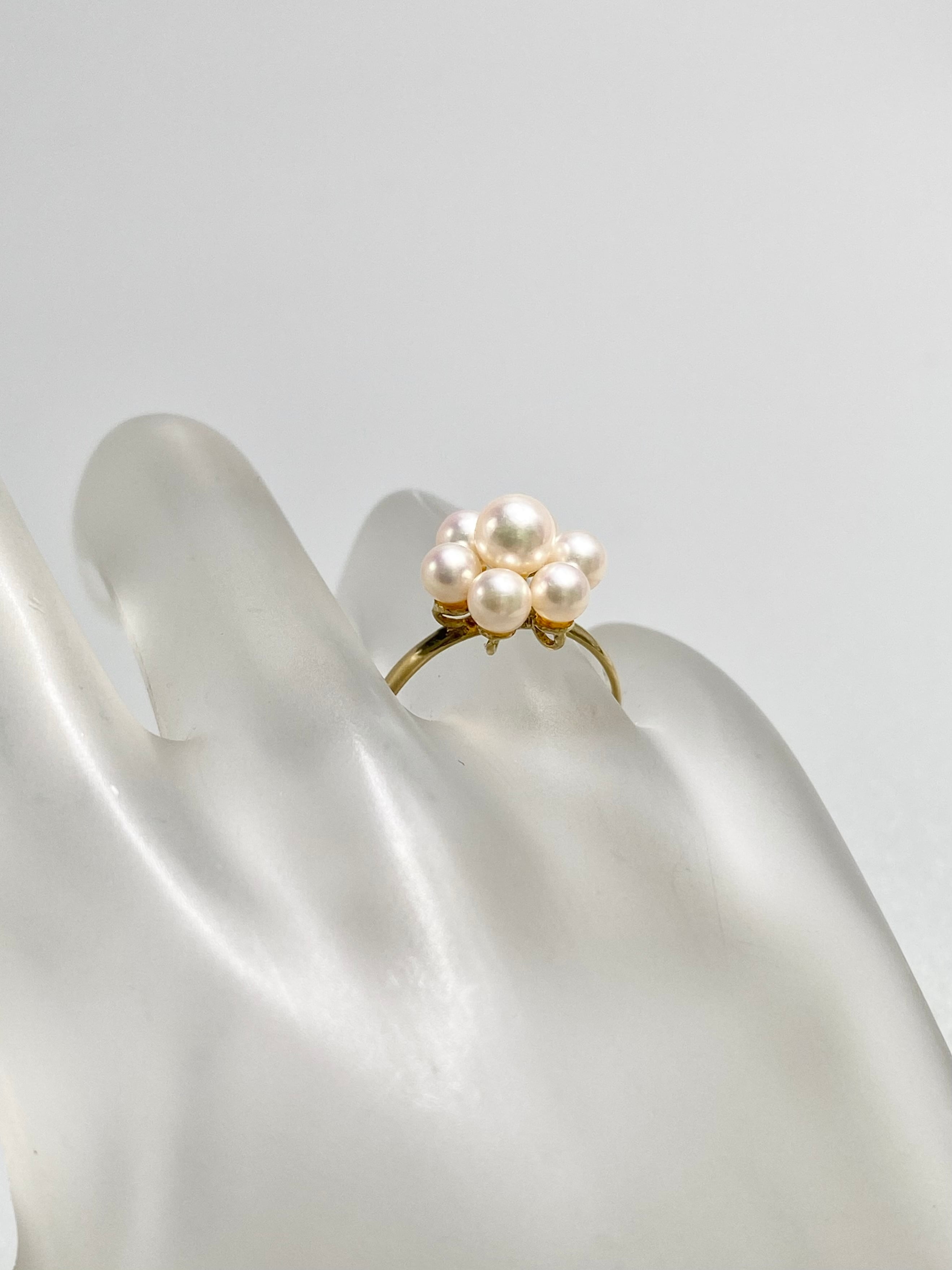 小ぶりな真珠が7珠、中央に留められたリングです。中央の珠が約4.9mm、周りが約3.9mmと、全体的に小ぶりな珠が使われています。