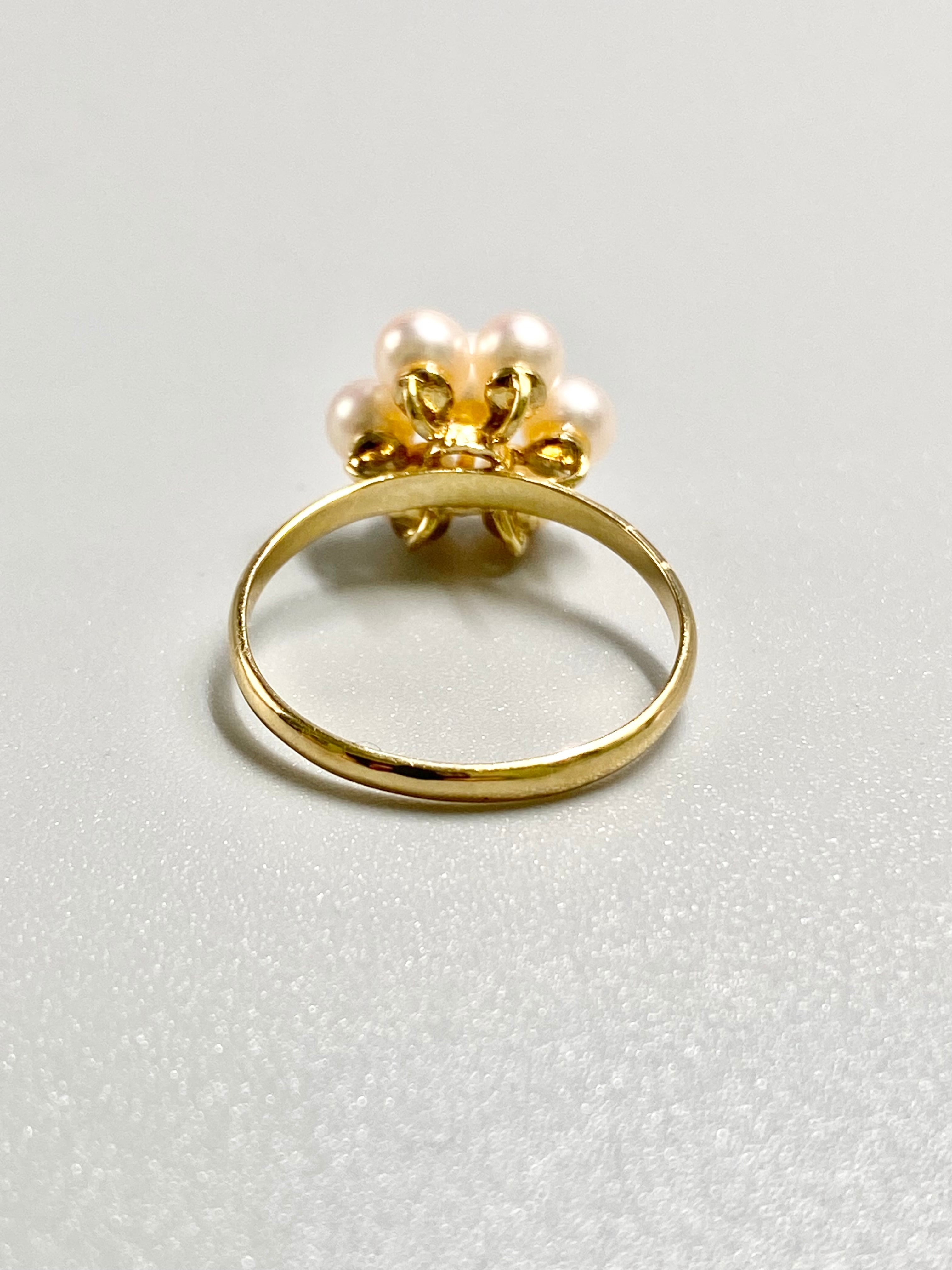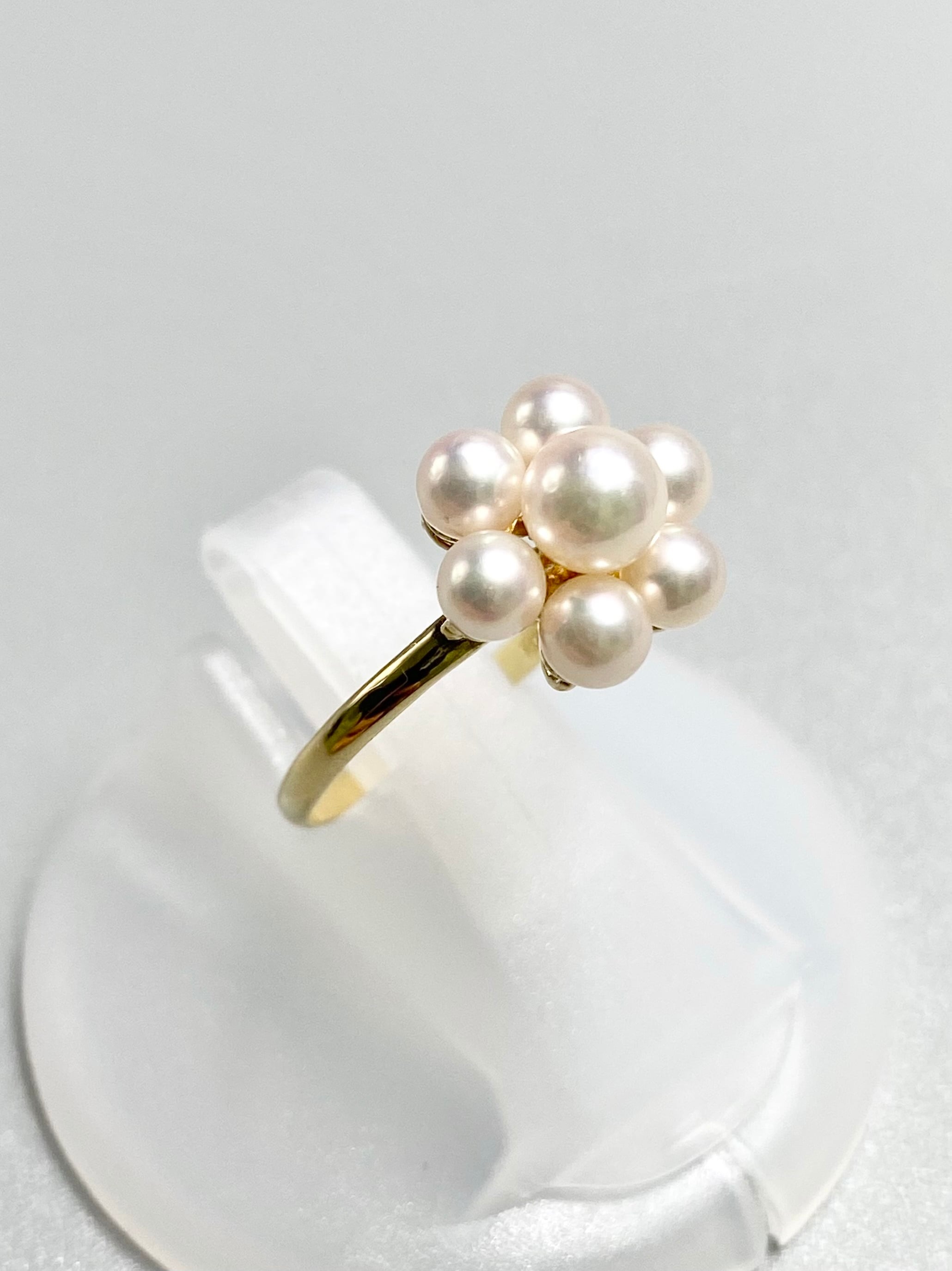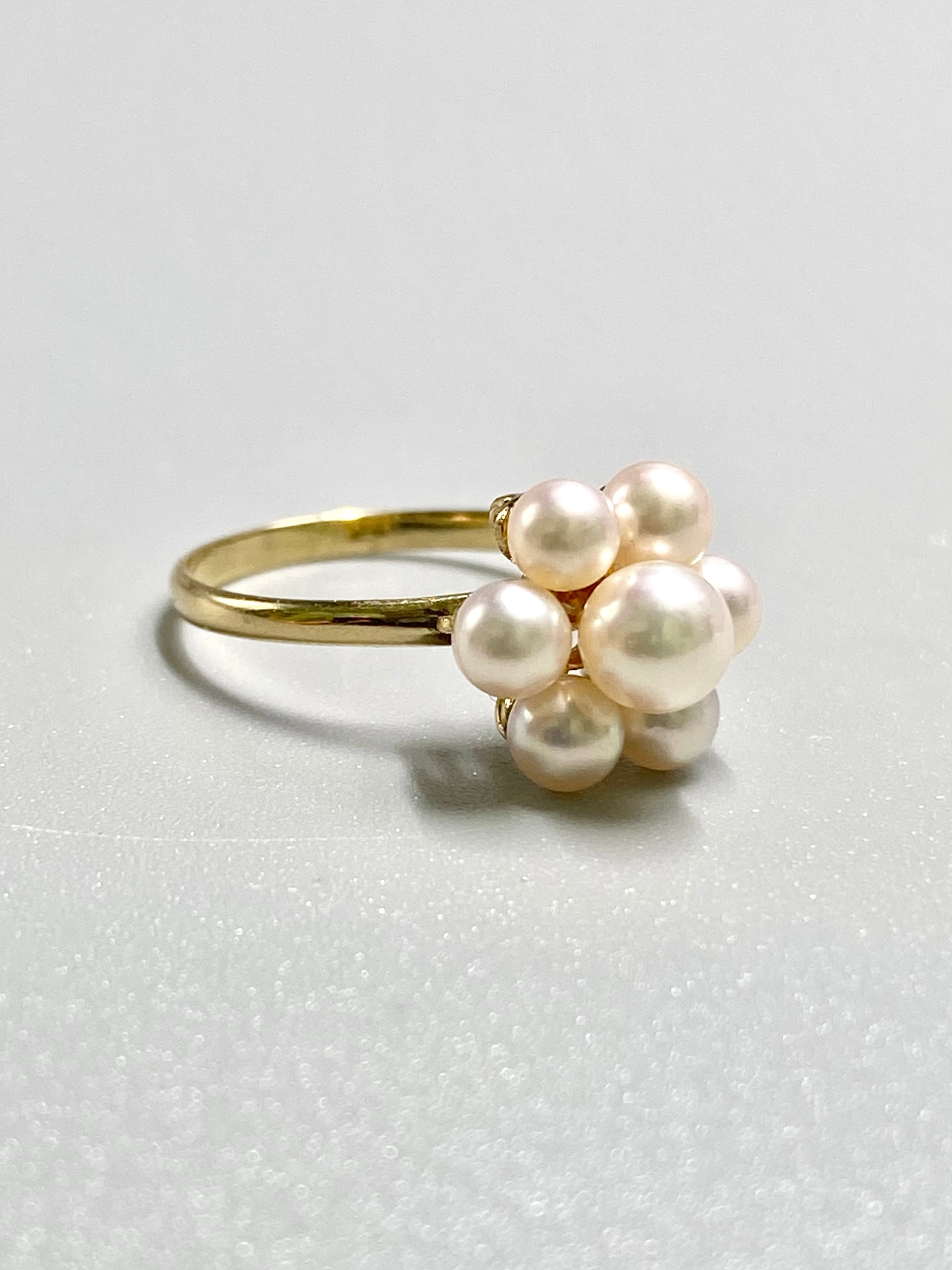 小ぶりな真珠が7珠、中央に留められたリングです。中央の珠が約4.9mm、周りが約3.9mmと、全体的に小ぶりな珠が使われています。