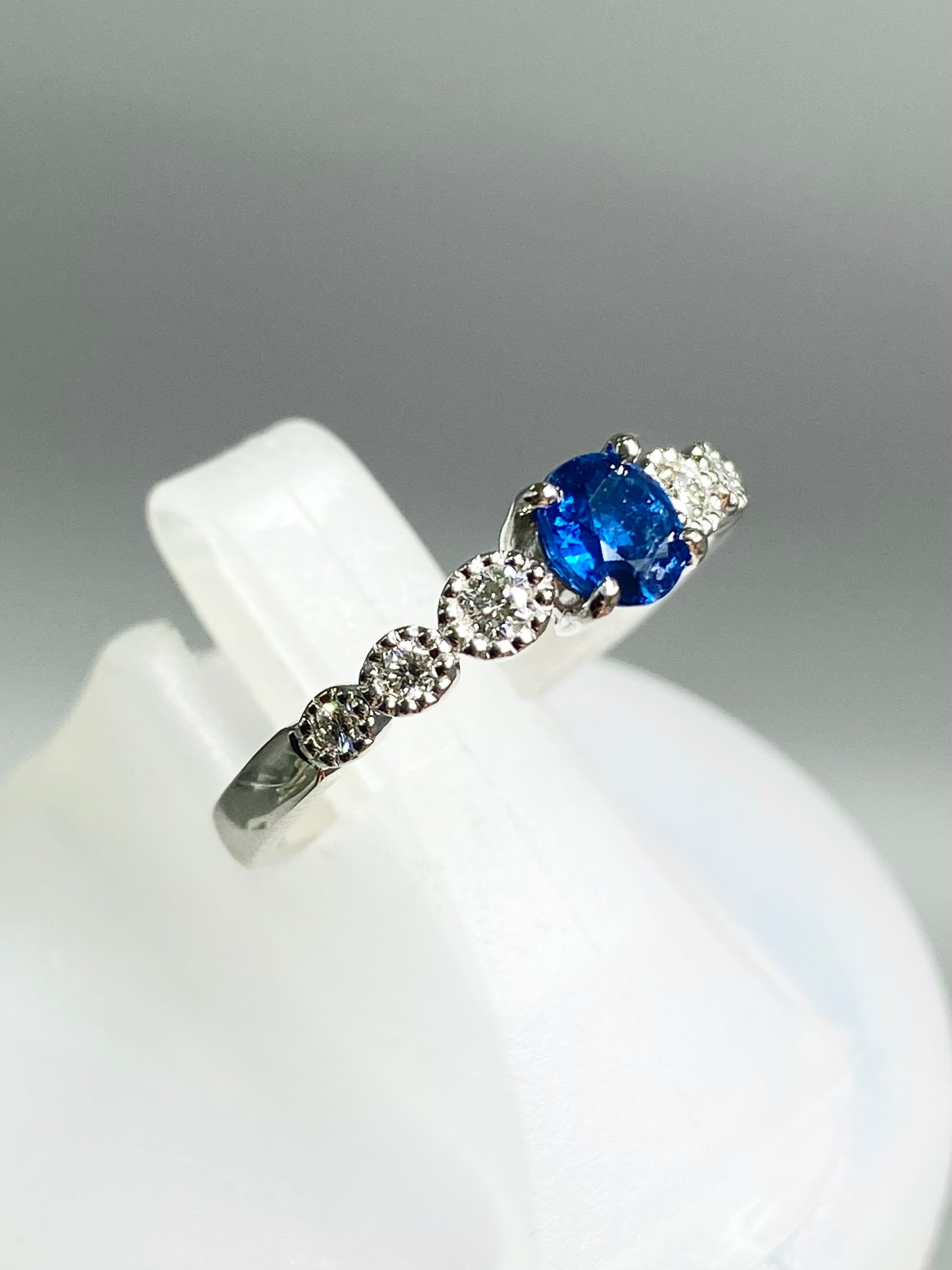 また、コバルトスピネルの両脇に3石ずつ留められたダイヤモンドも、小粒ながらも色も輝きも非常に良好。ルーペで見ると整ったカットが確認できます。また、ダイヤモンドの枠にはミル打ちが施されており、ダイヤモンドの輝きと共にリングに華やかさを添えてくれております。