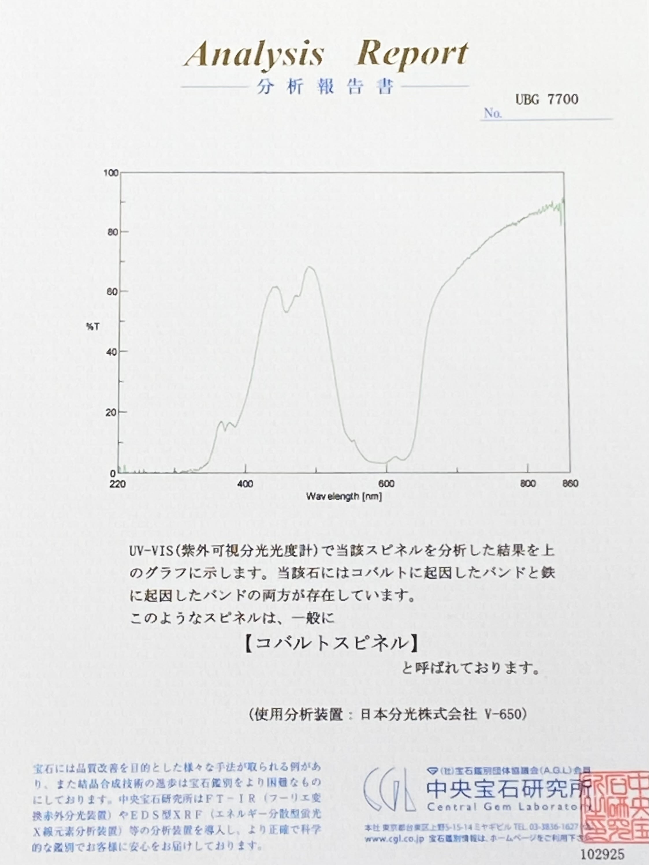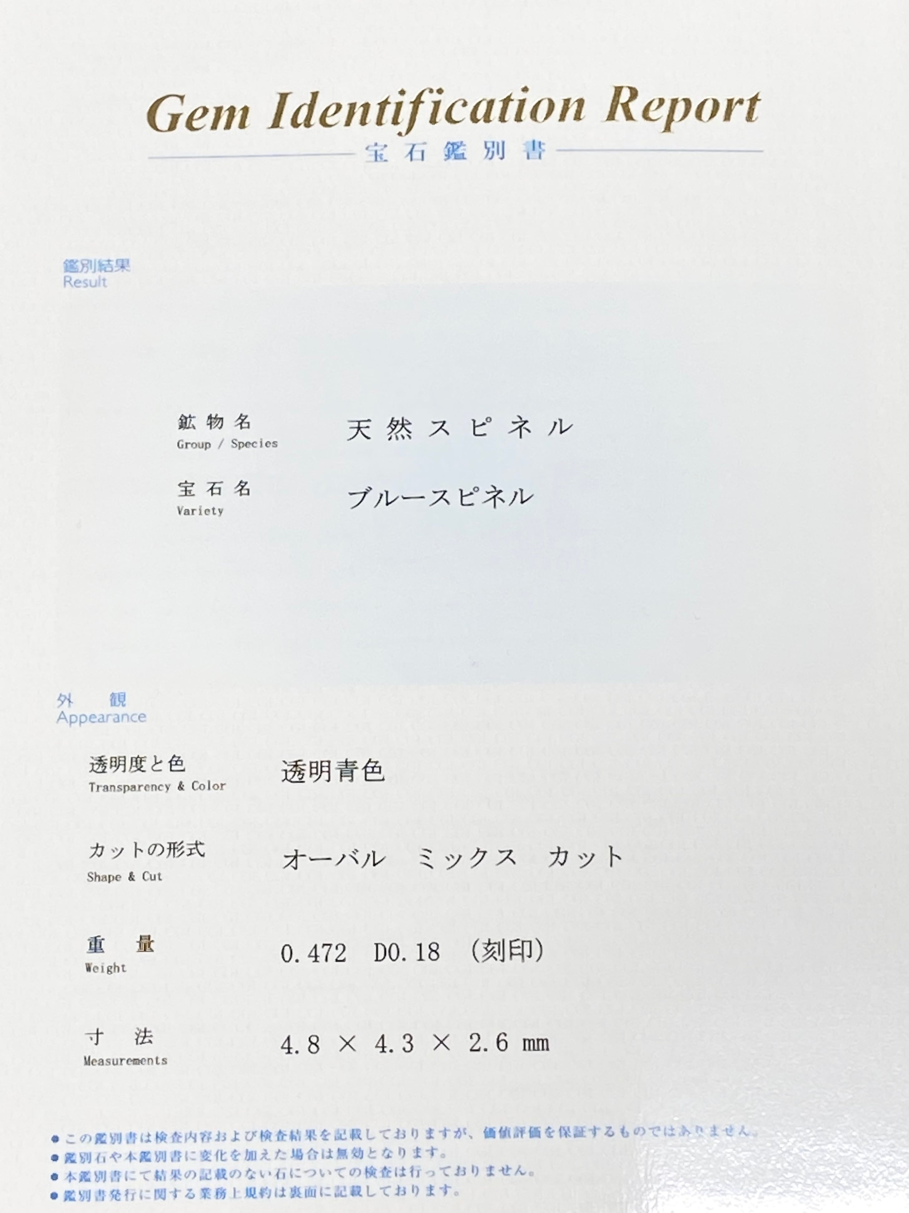 このようにある程度のキズ、内包物などは確認できますが、コバルトスピネルらしいはっきりしたブルーの輝きと、ある程度のサイズを備えた一石です。