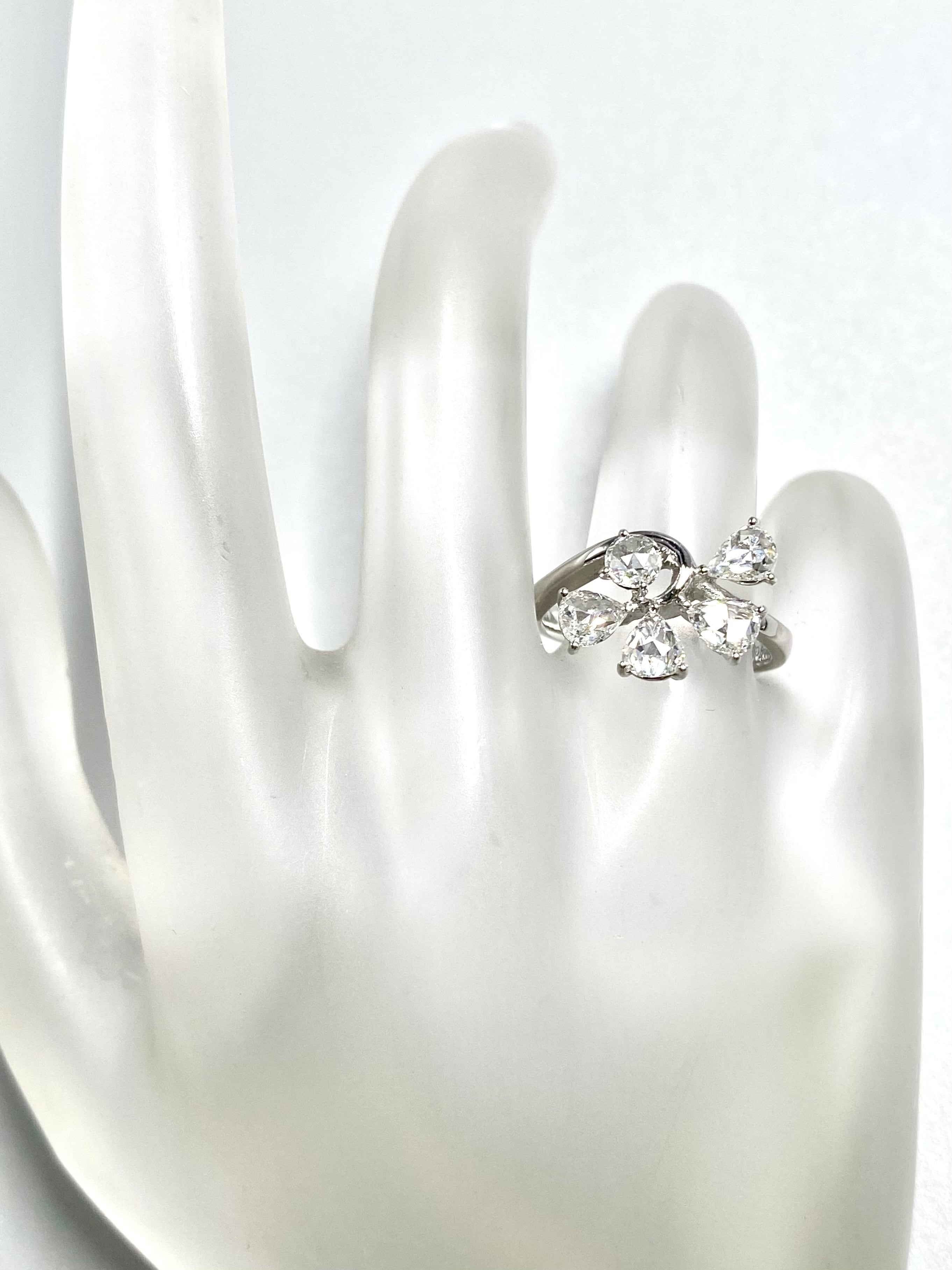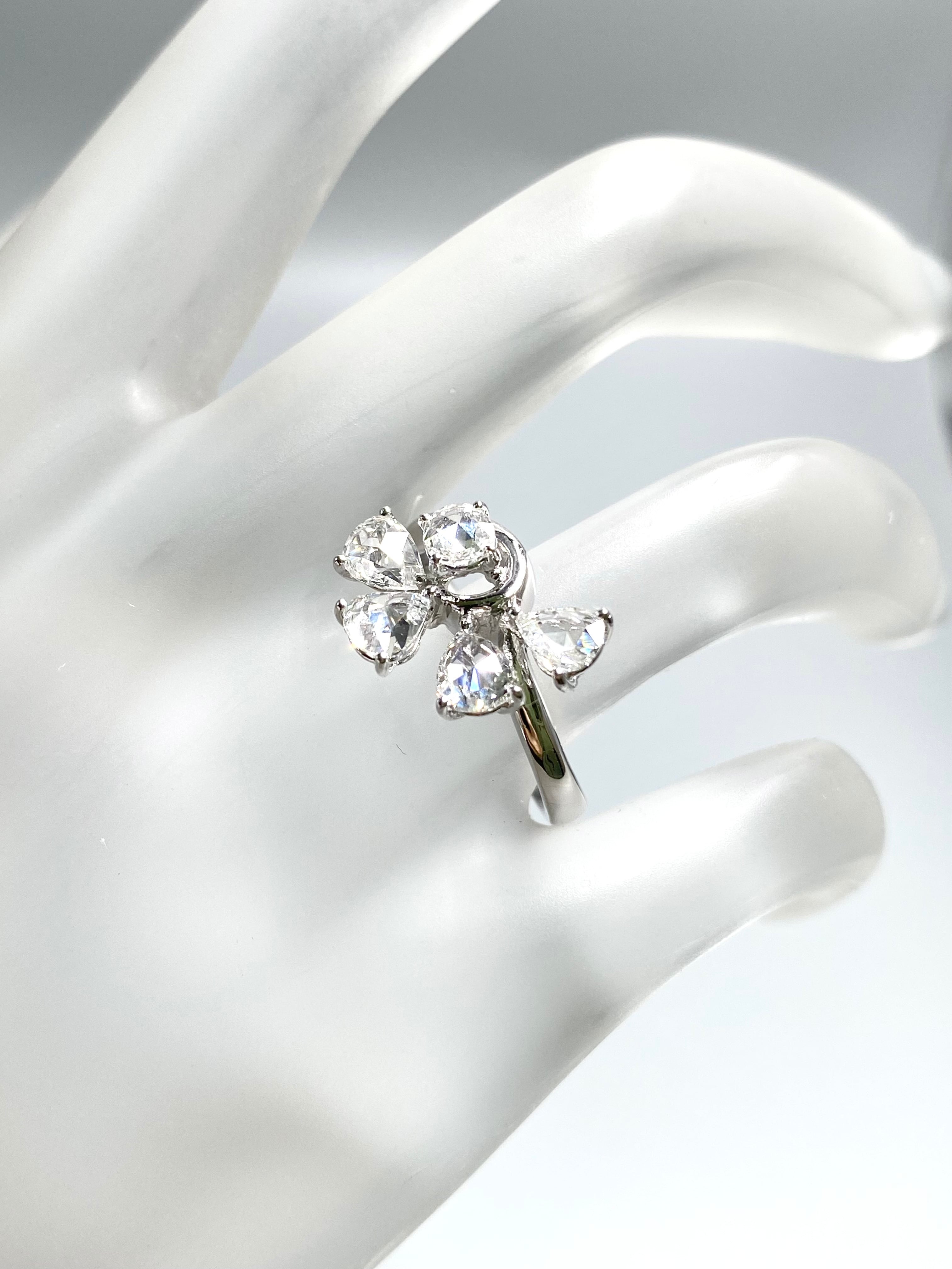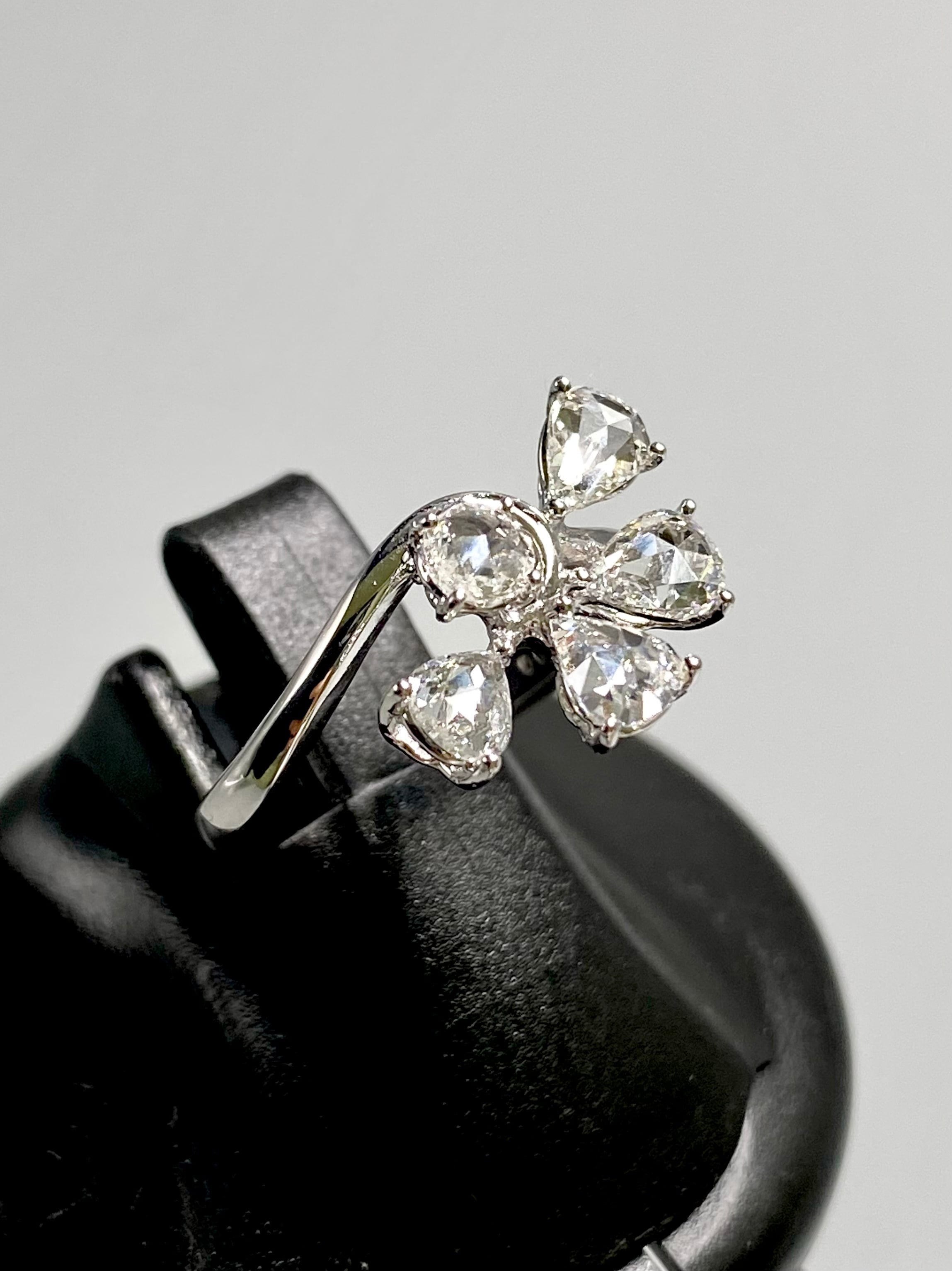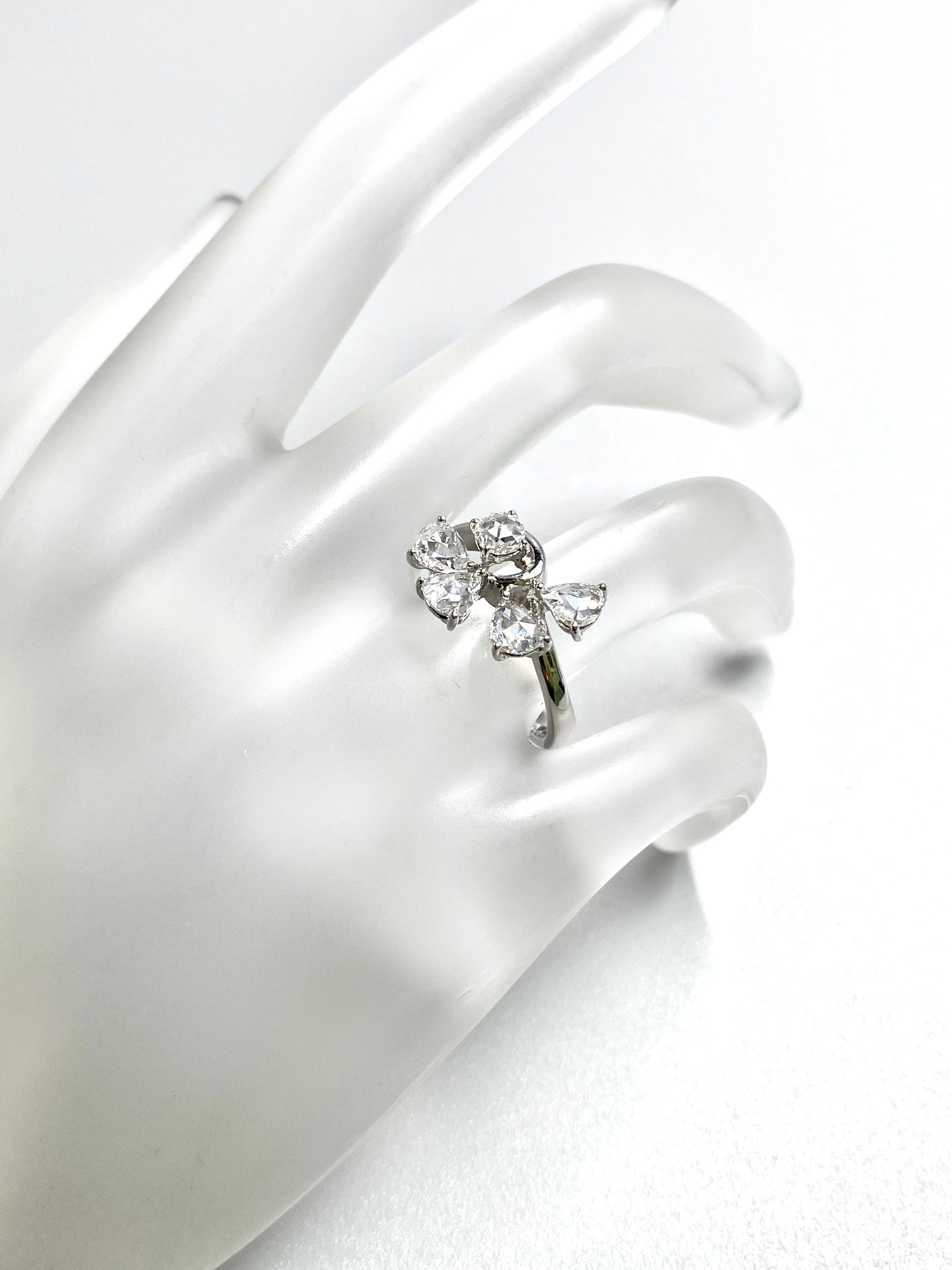 ペアシェイプのローズカットの小さな葉が4枚、中央の実のようなダイヤモンドにもラウンドのローズカットを使用した一風変わった目を引くリングです。指を少し動かすだけでダイヤモンドがきらきらと煌めきます。