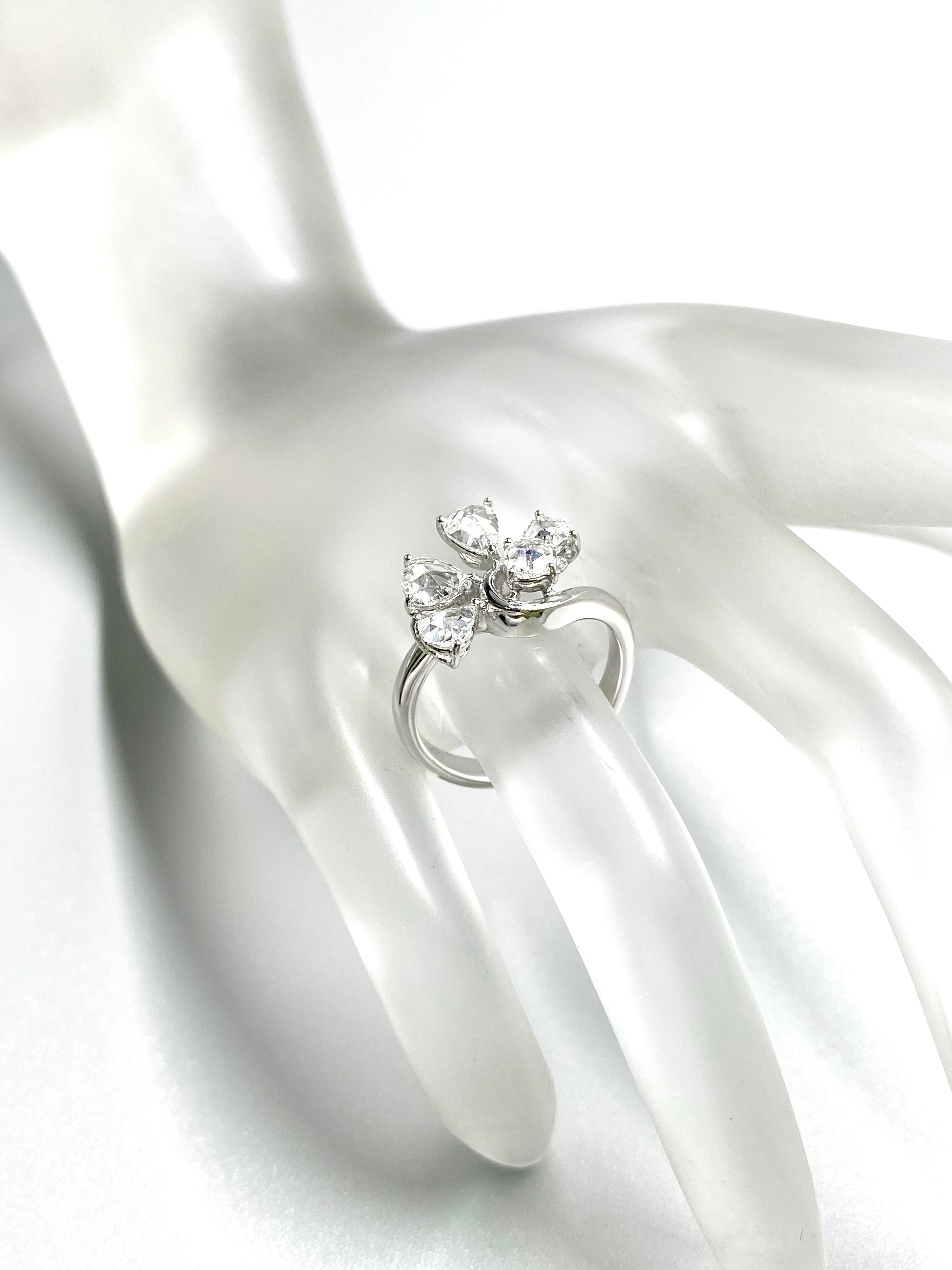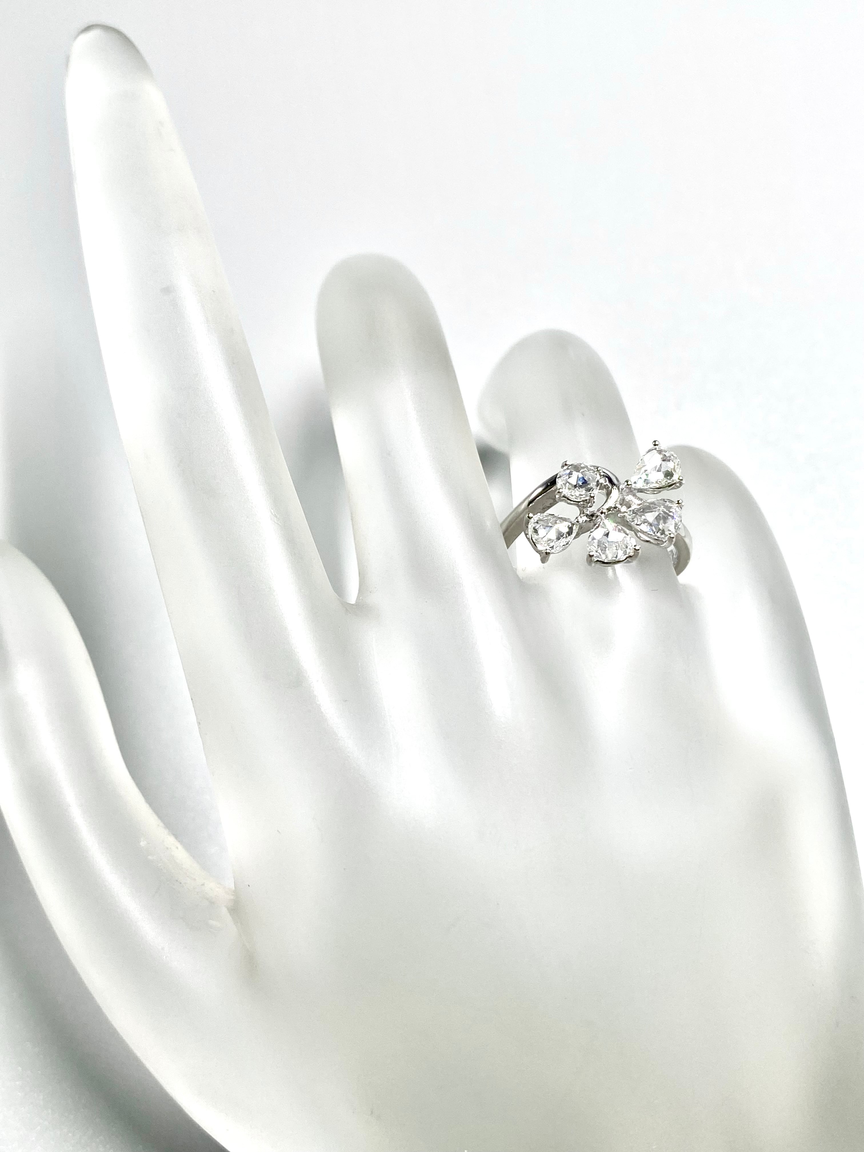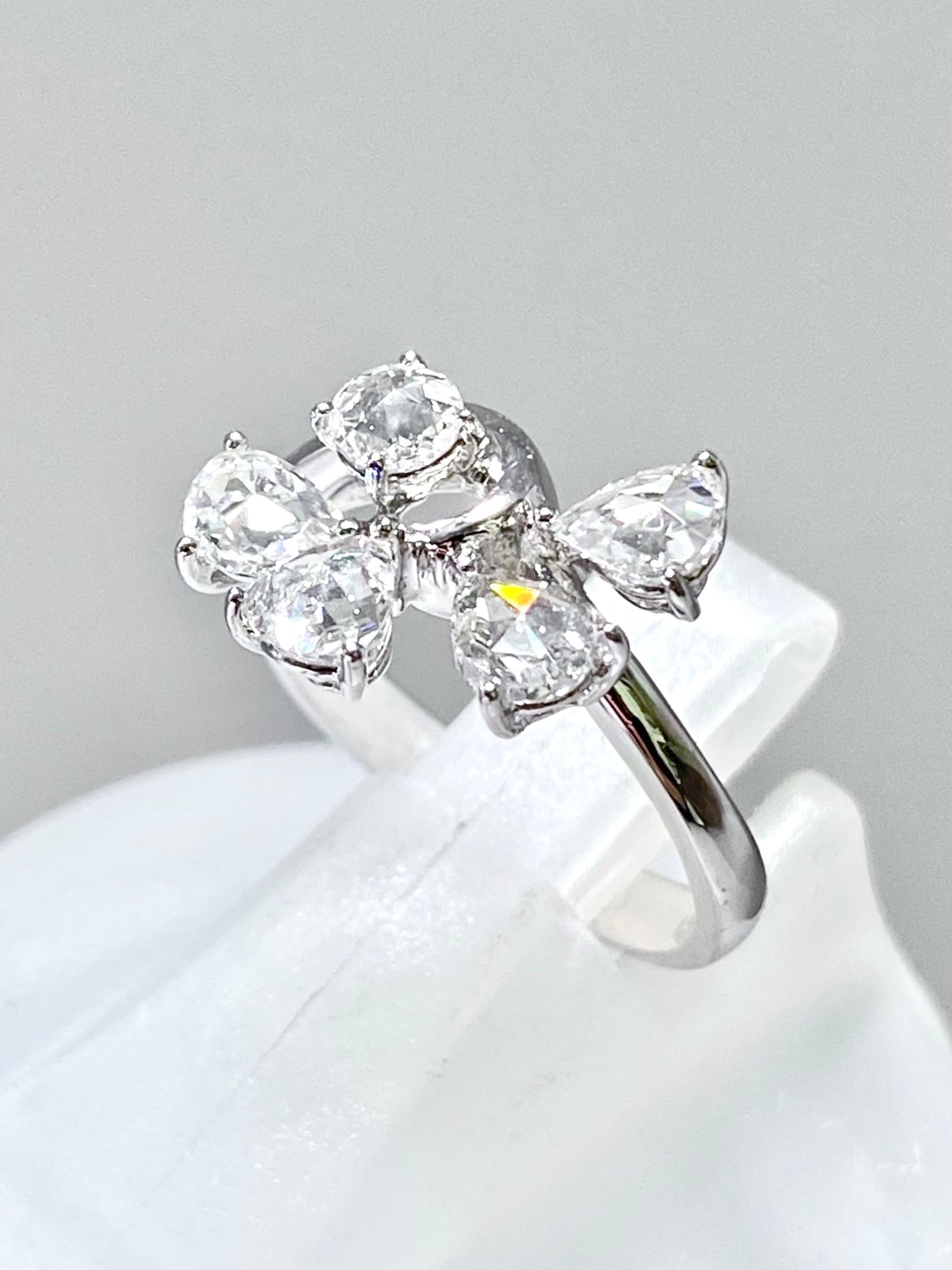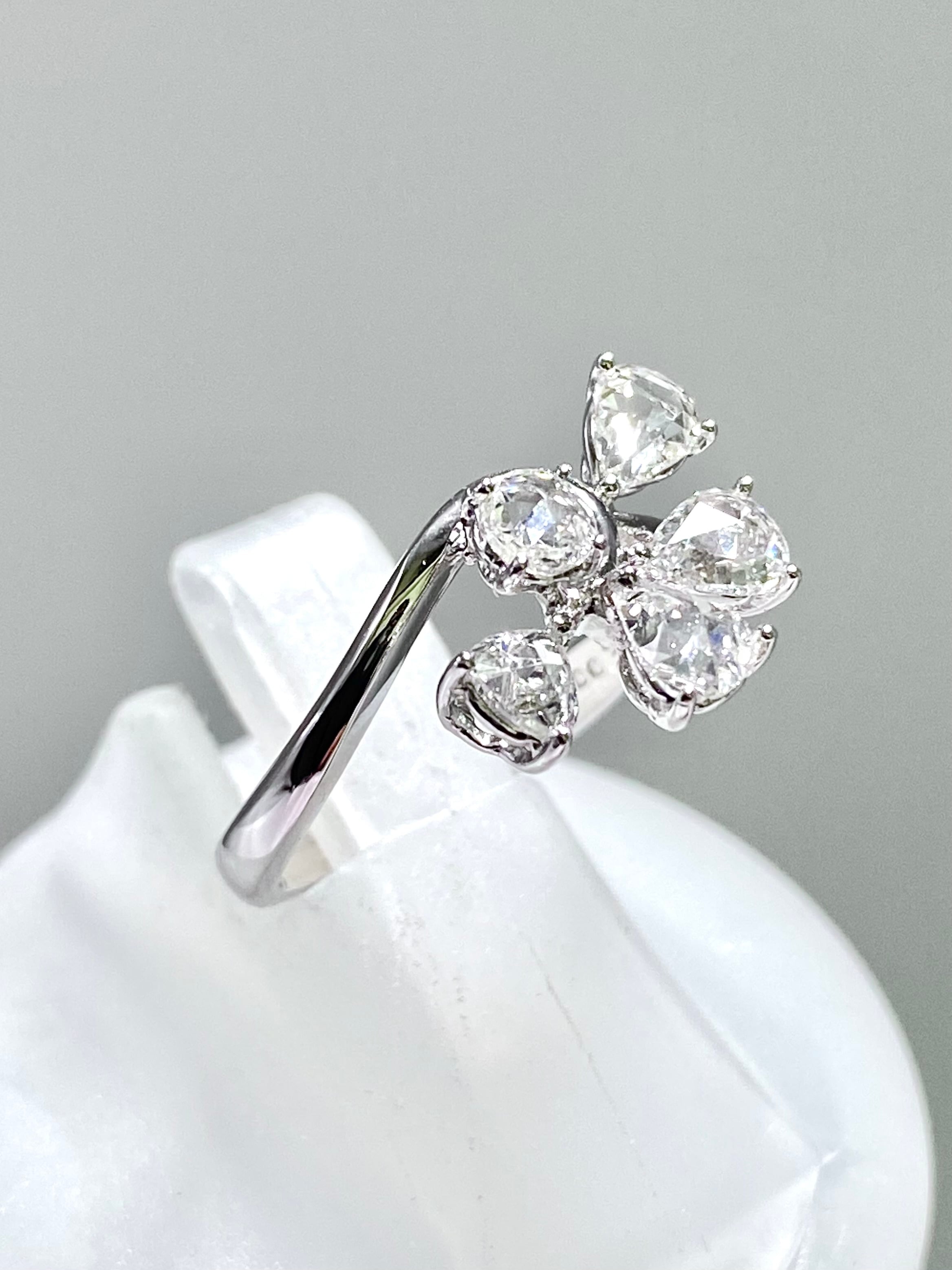 ペアシェイプのローズカットの小さな葉が4枚、中央の実のようなダイヤモンドにもラウンドのローズカットを使用した一風変わった目を引くリングです。指を少し動かすだけでダイヤモンドがきらきらと煌めきます。