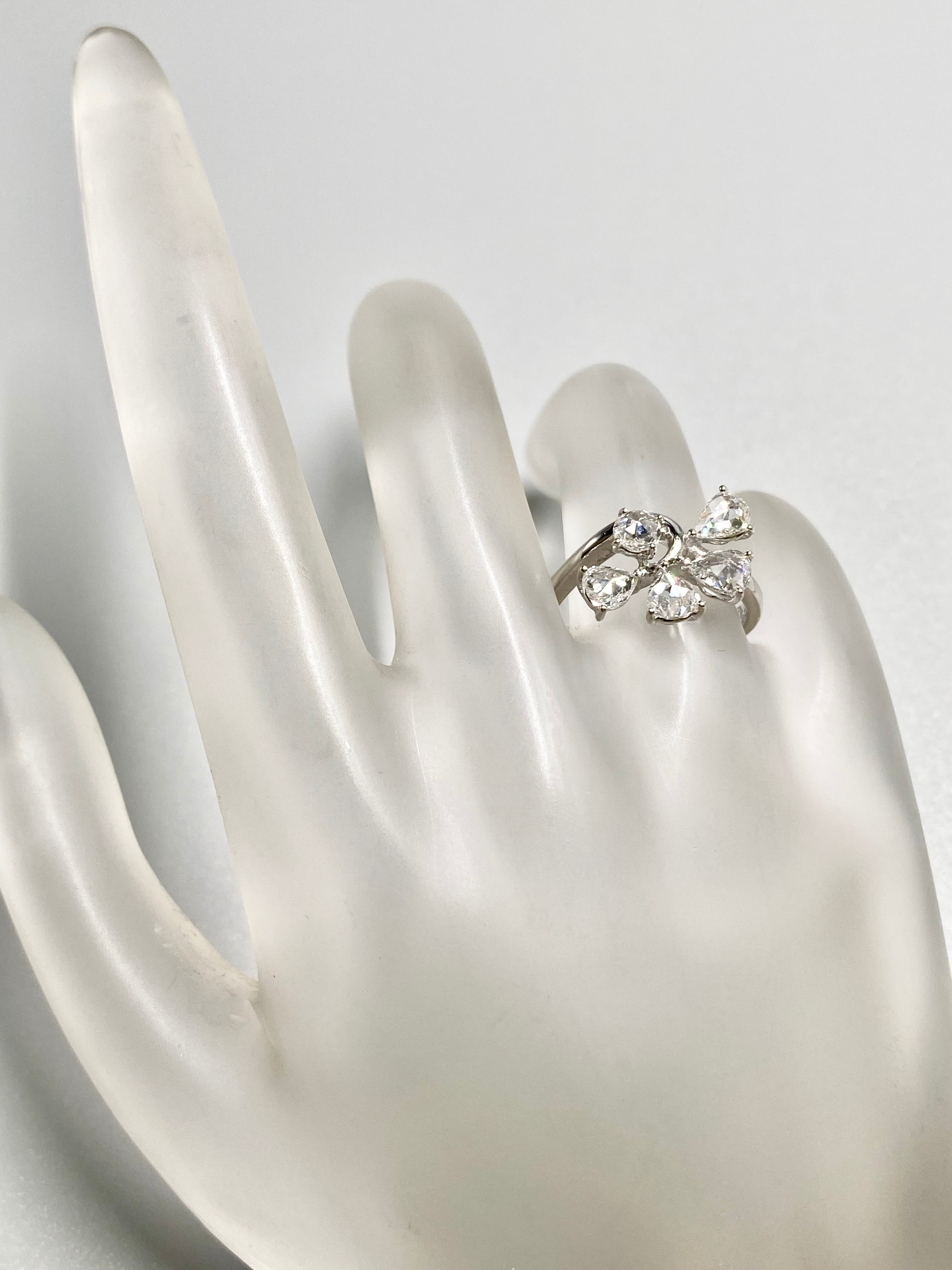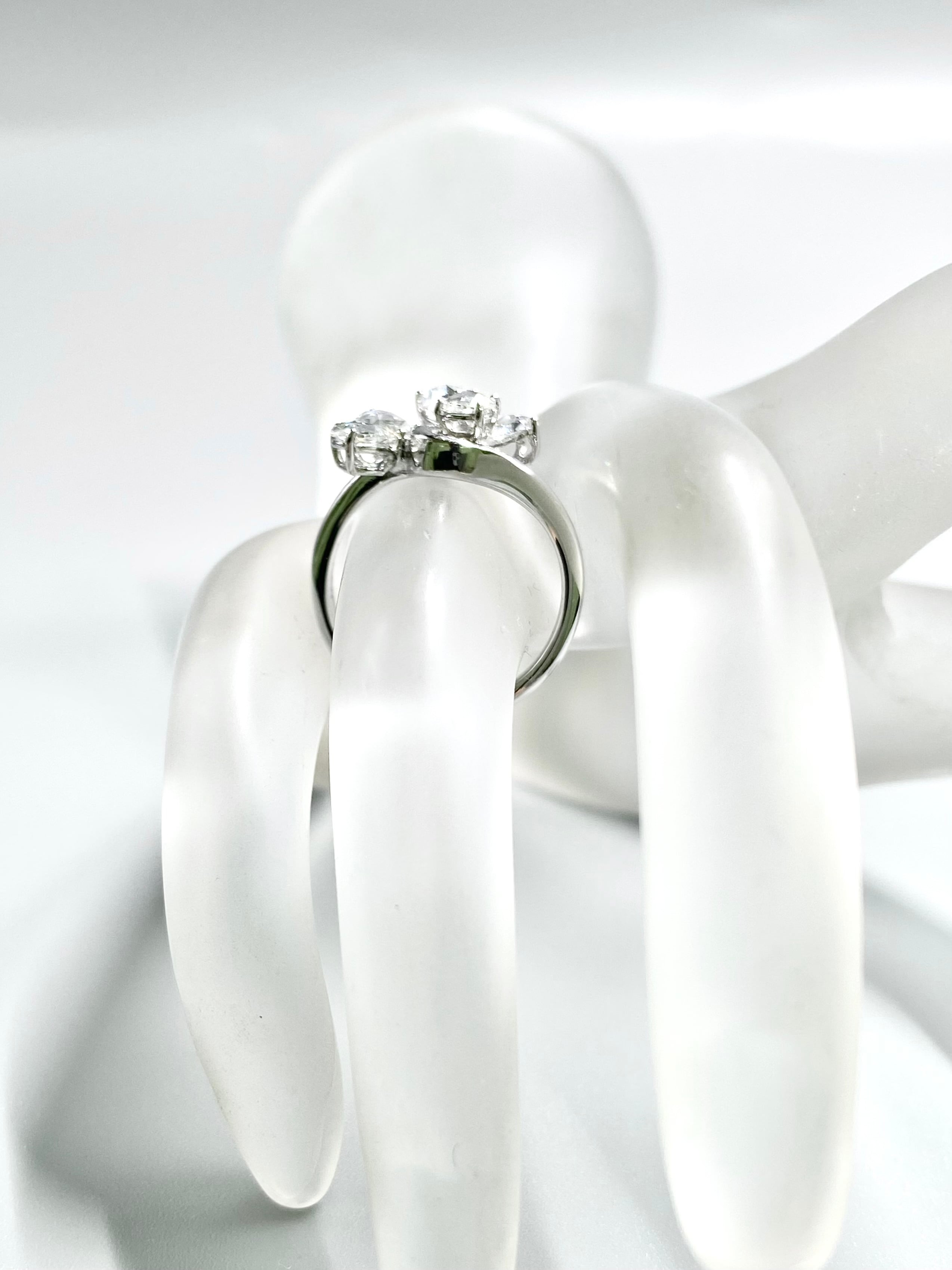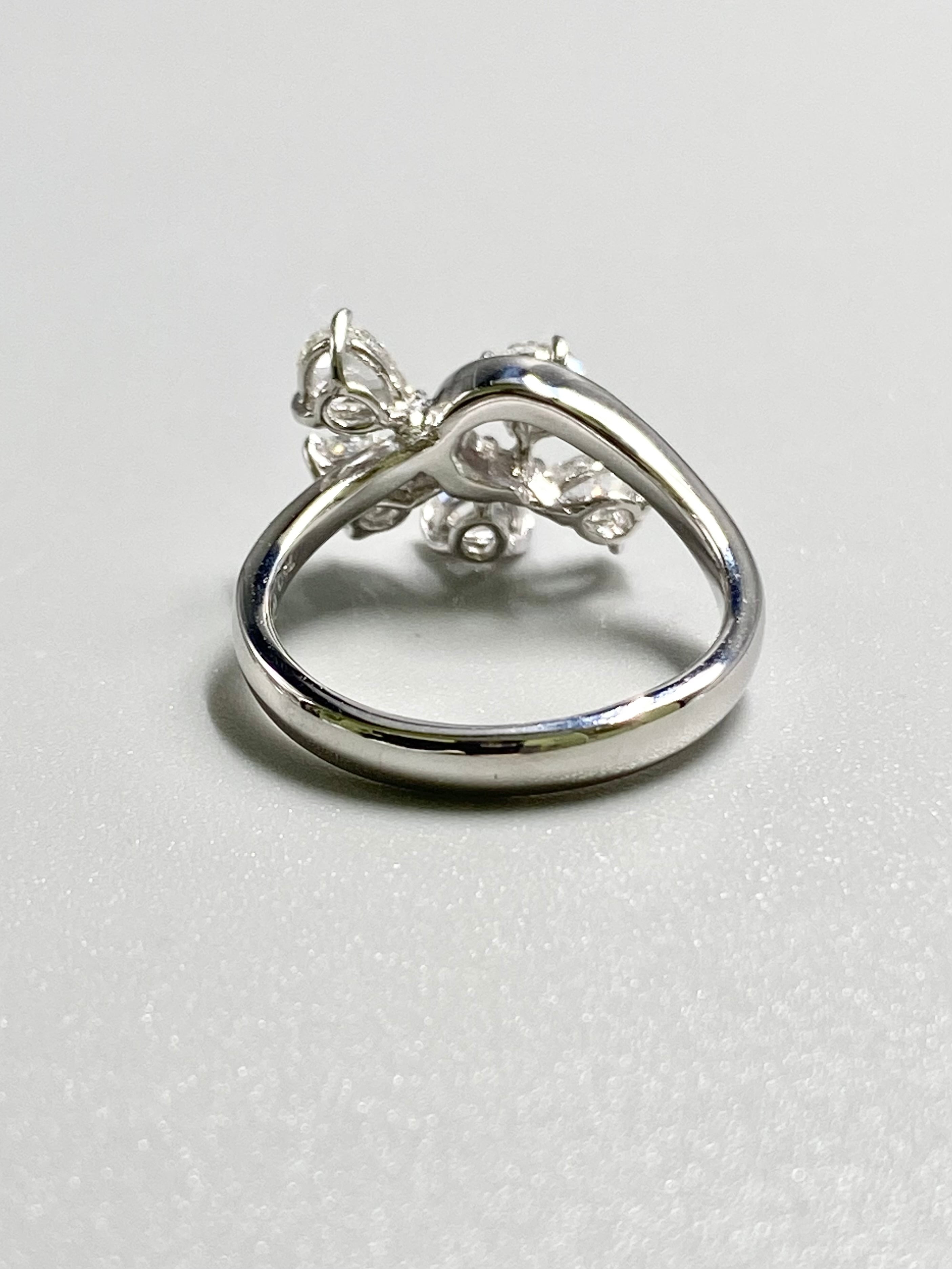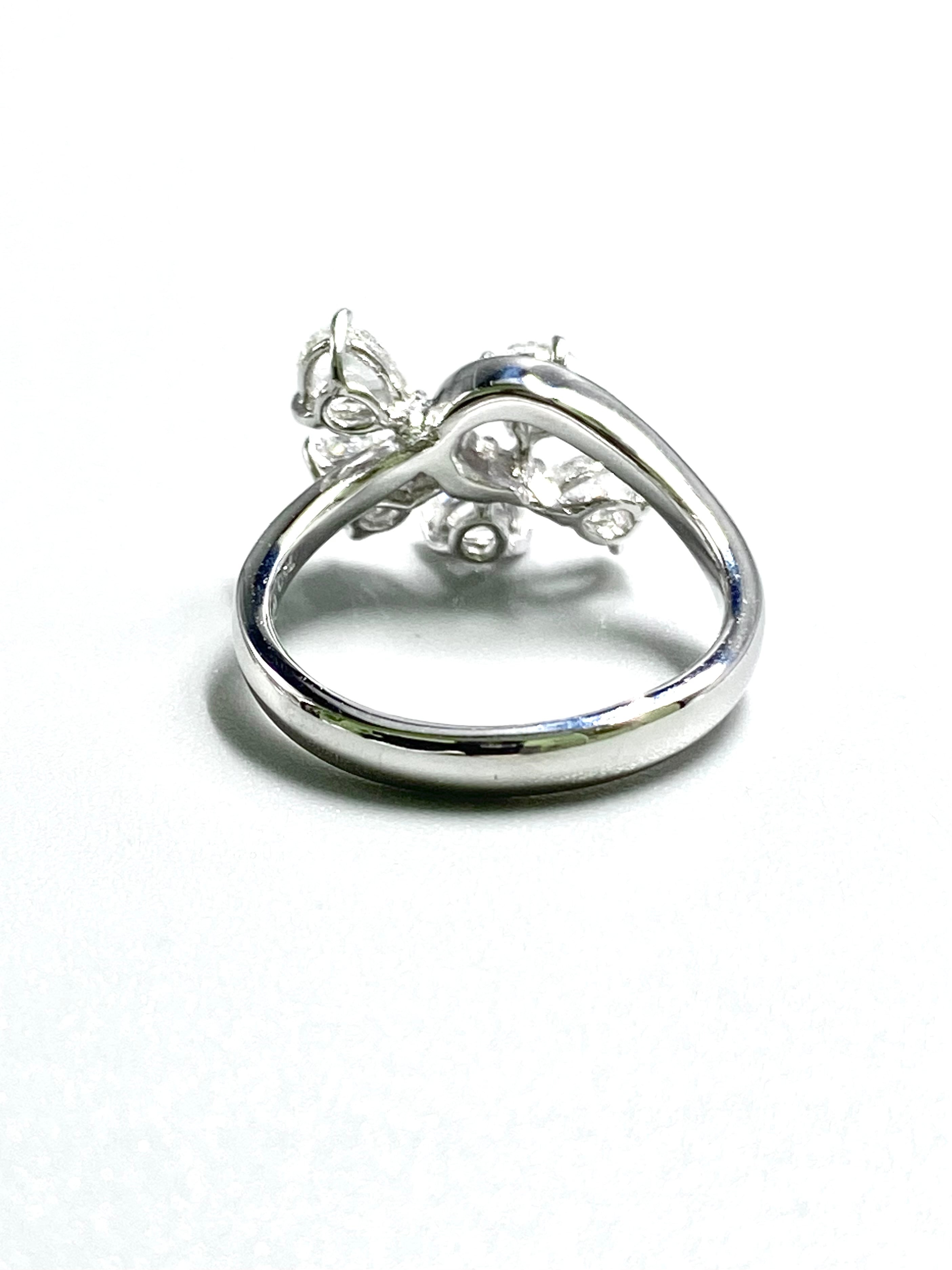 ペアシェイプのローズカットの小さな葉が4枚、中央の実のようなダイヤモンドにもラウンドのローズカットを使用した一風変わった目を引くリングです。指を少し動かすだけでダイヤモンドがきらきらと煌めきます。