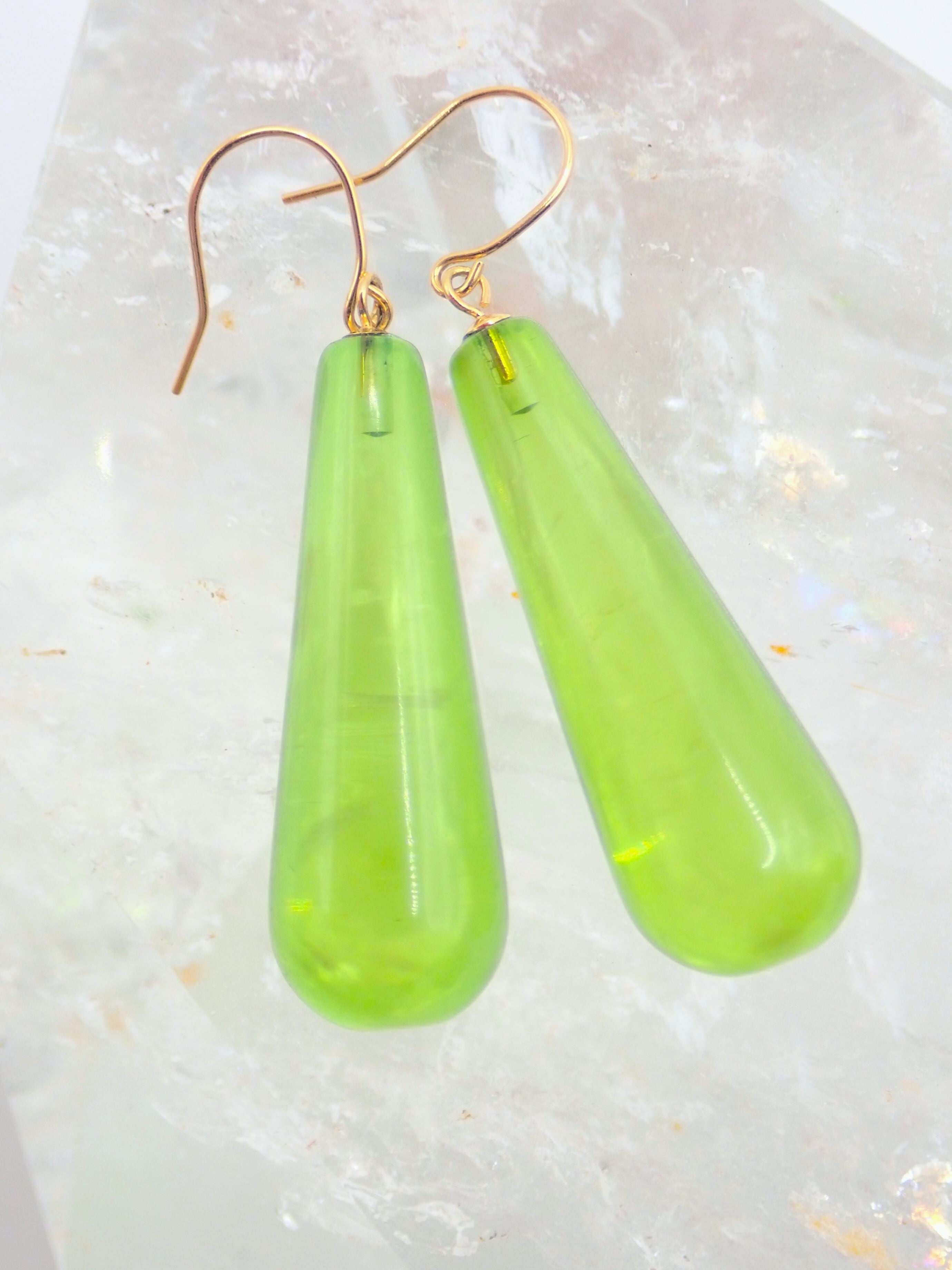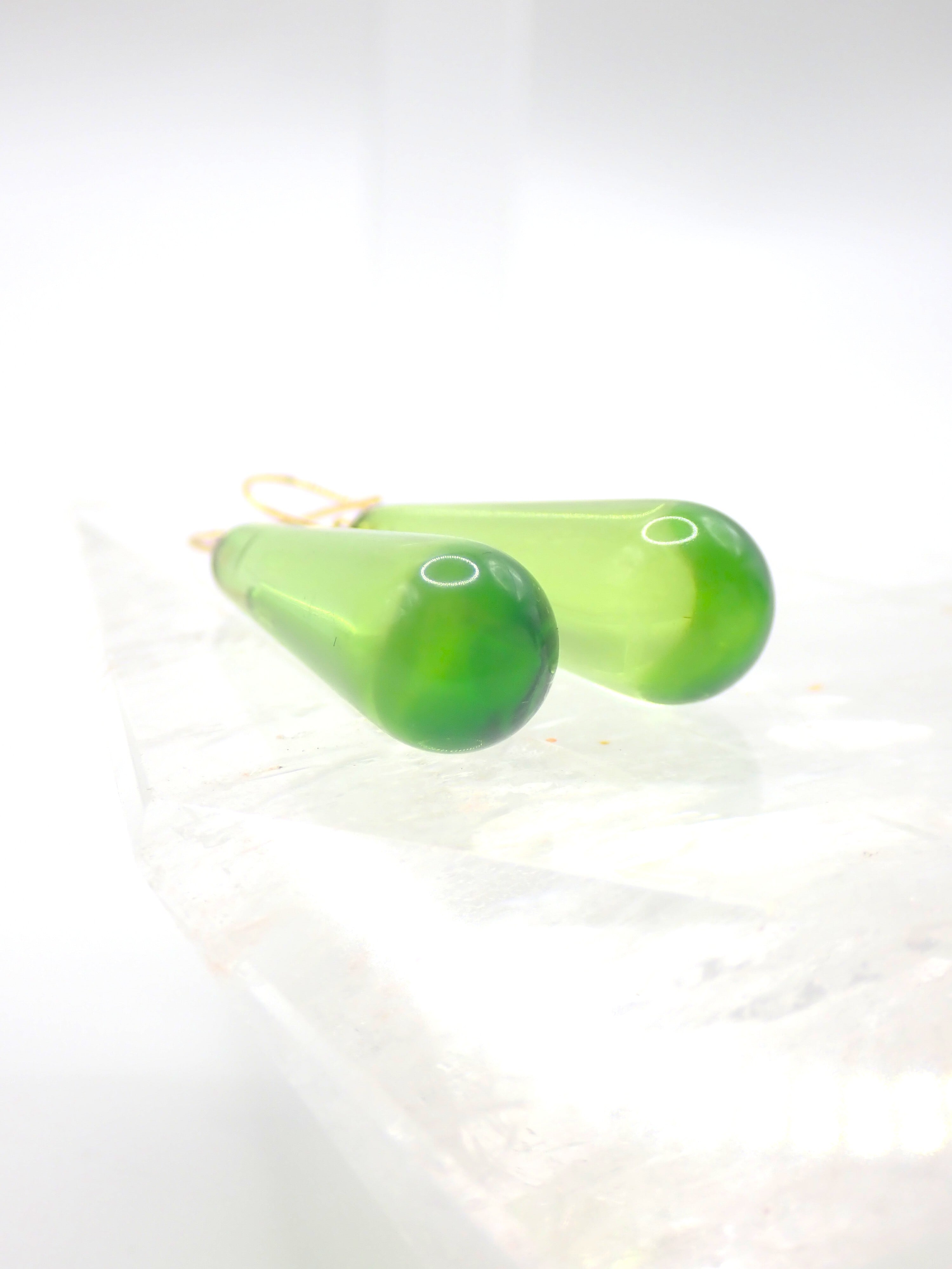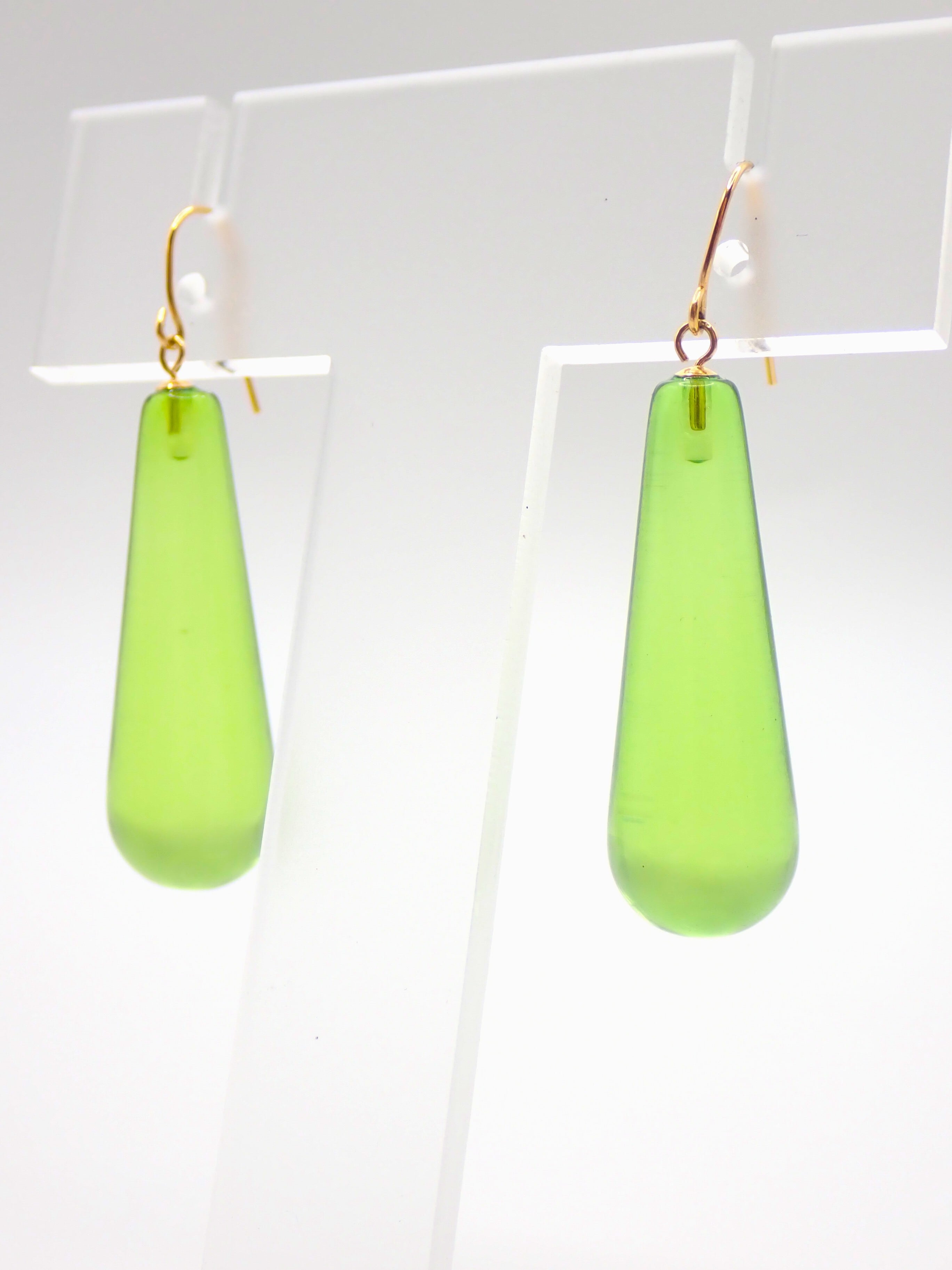 縦長のつやぷるんとした明るい黄緑のアンバーピアスのご紹介です。地金の色はゴールドです。また、キャッチはなく、フックタイプでのご用意です。