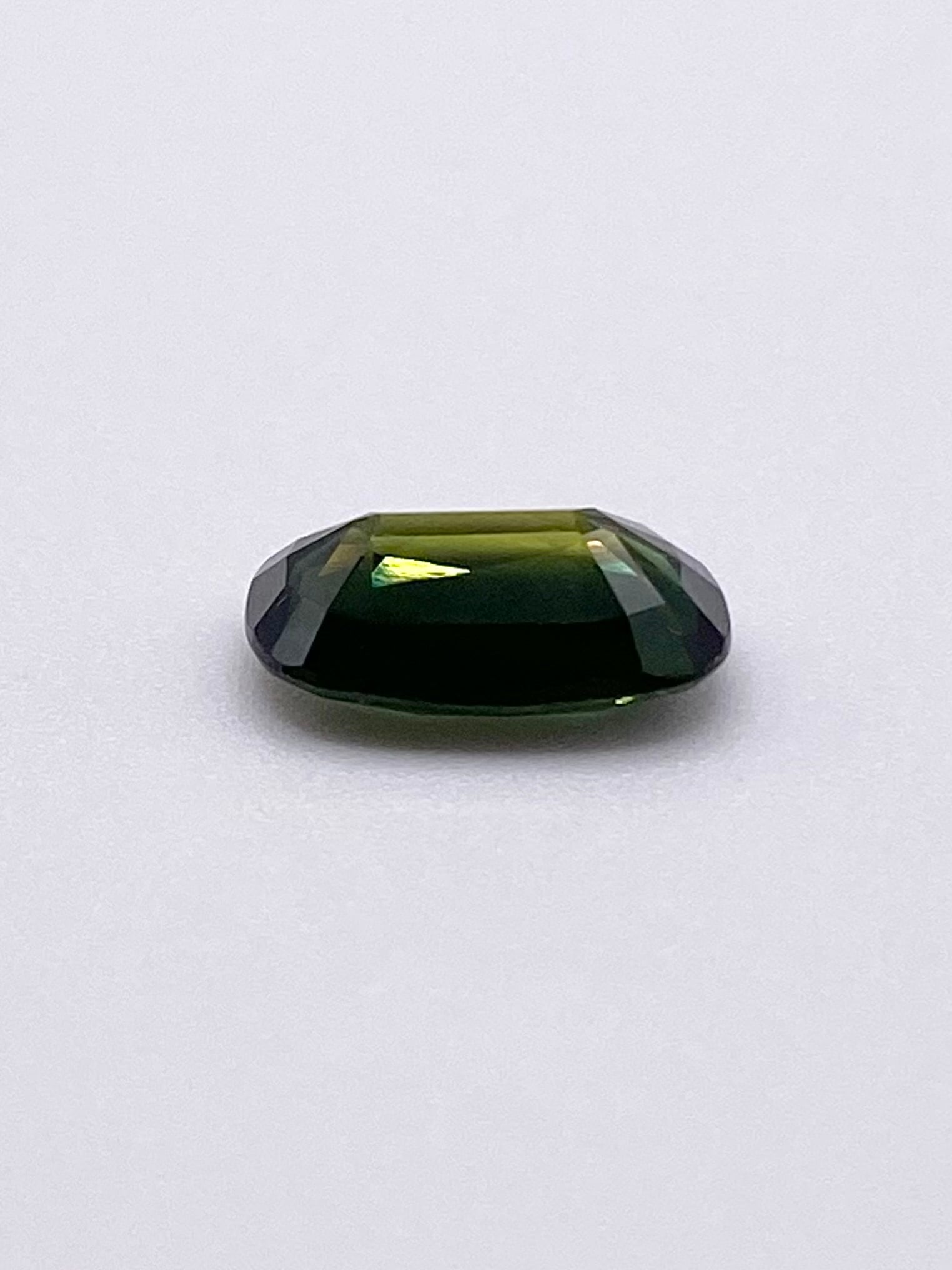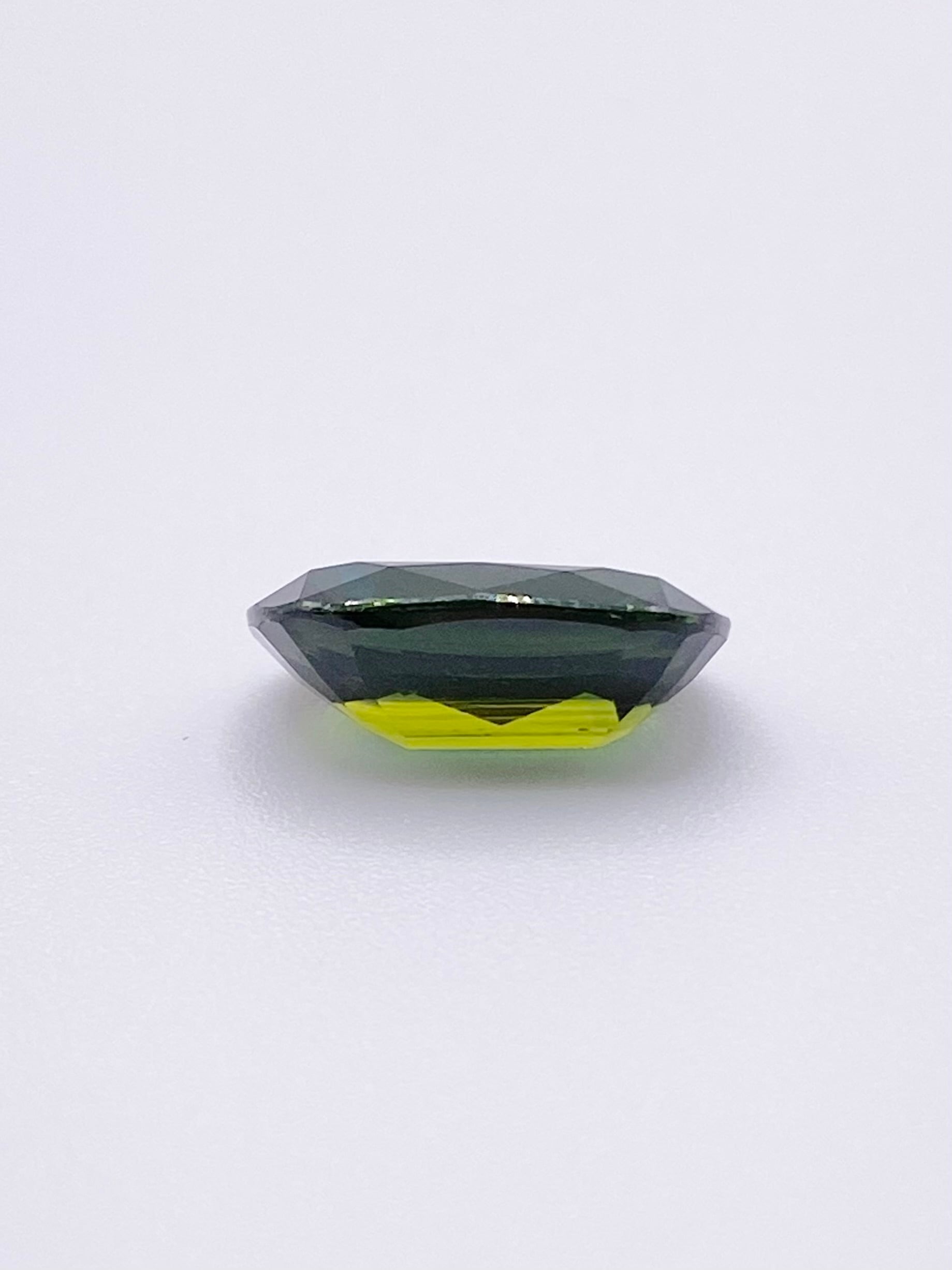 ただ、斜めにすると内部に青い色帯が見られ、ちょうどテーブルファセットを斜めに横切っております。裏から見ると分かりやすく、ブルーとイエローグリーンが分かれているようにも見えます。