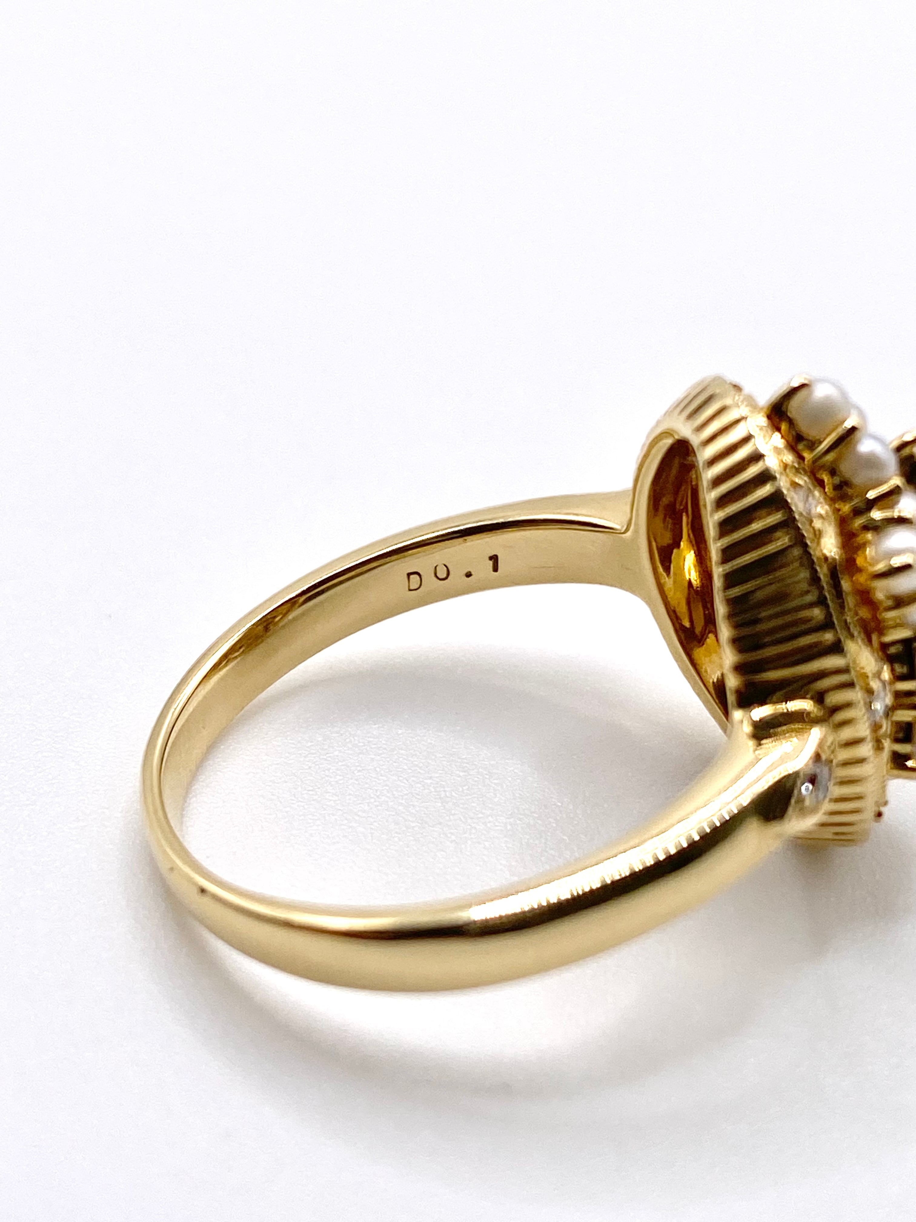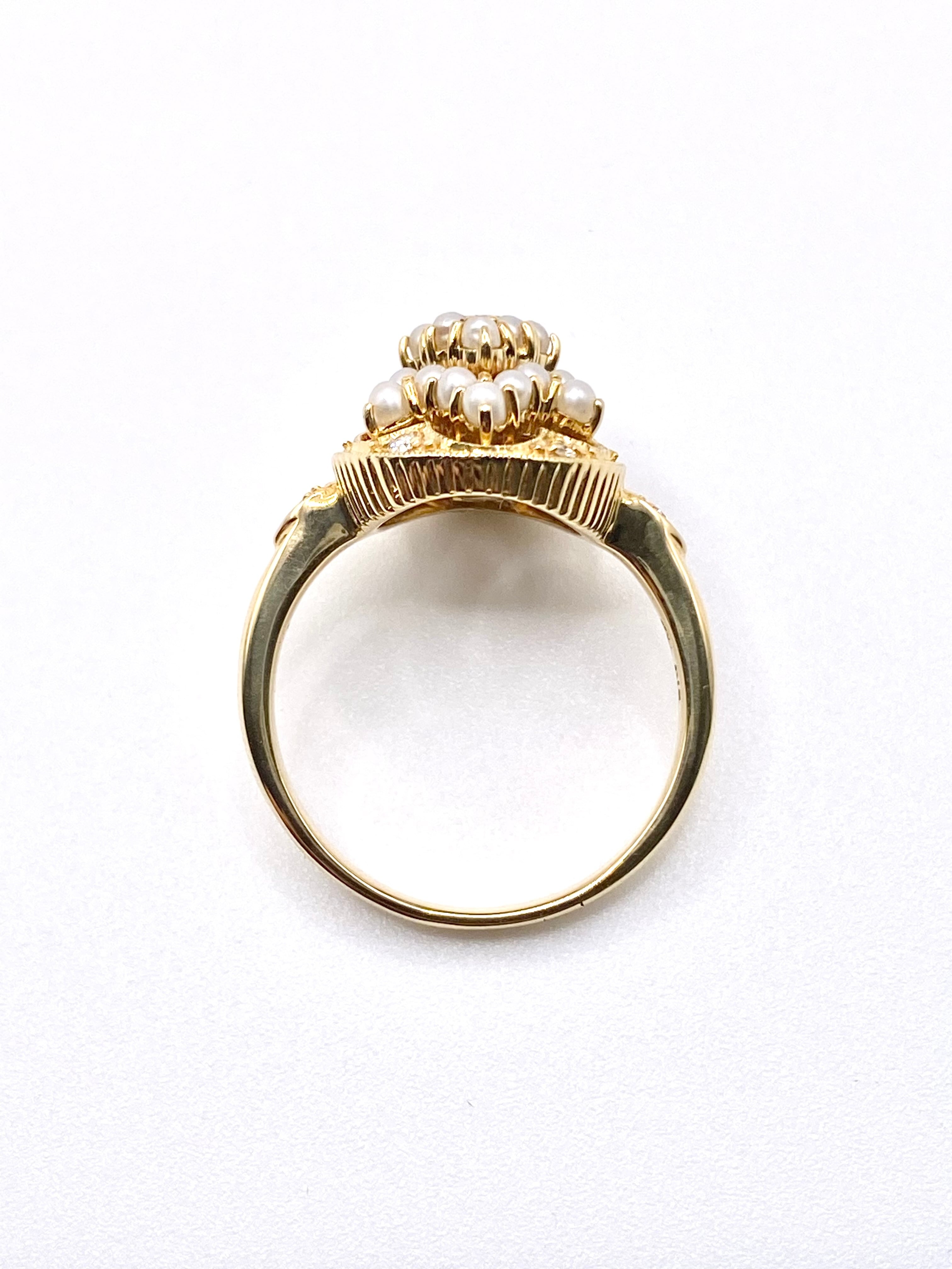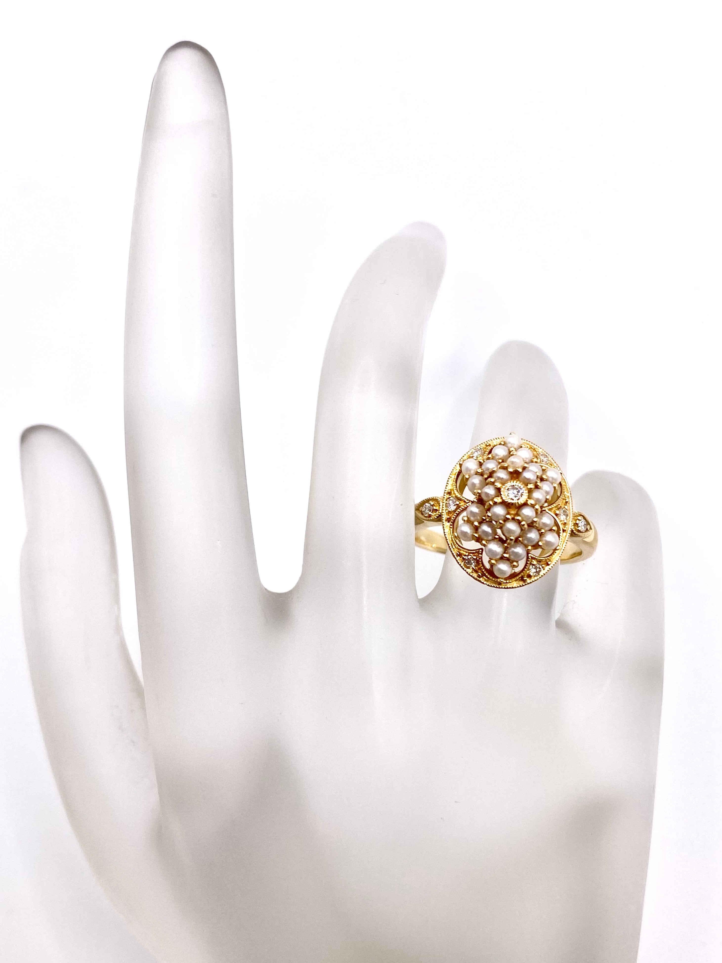粒の小さな真珠、シードパールが26珠留められ、中央とその周囲にはダイヤモンドが散りばめられているリング。