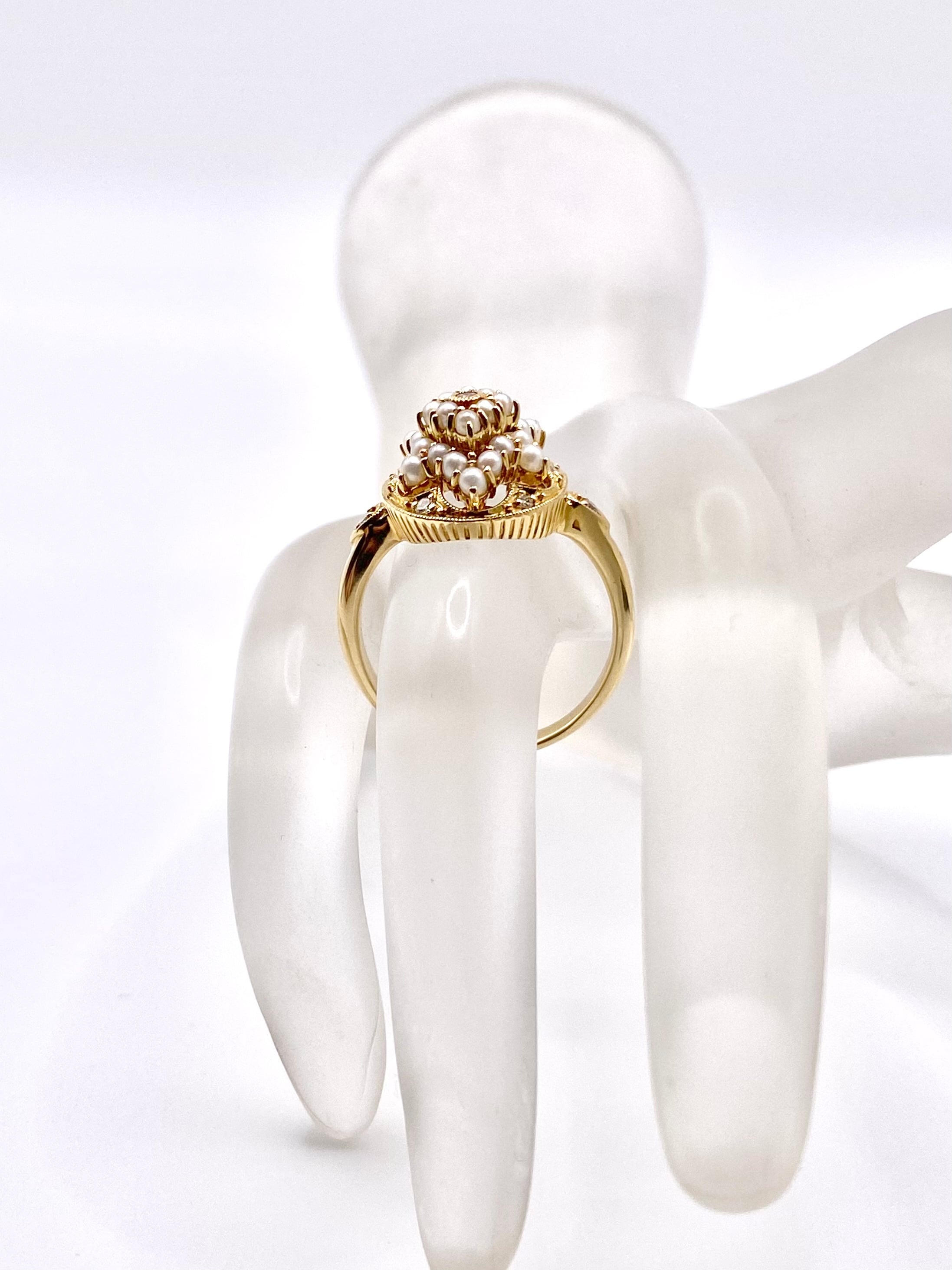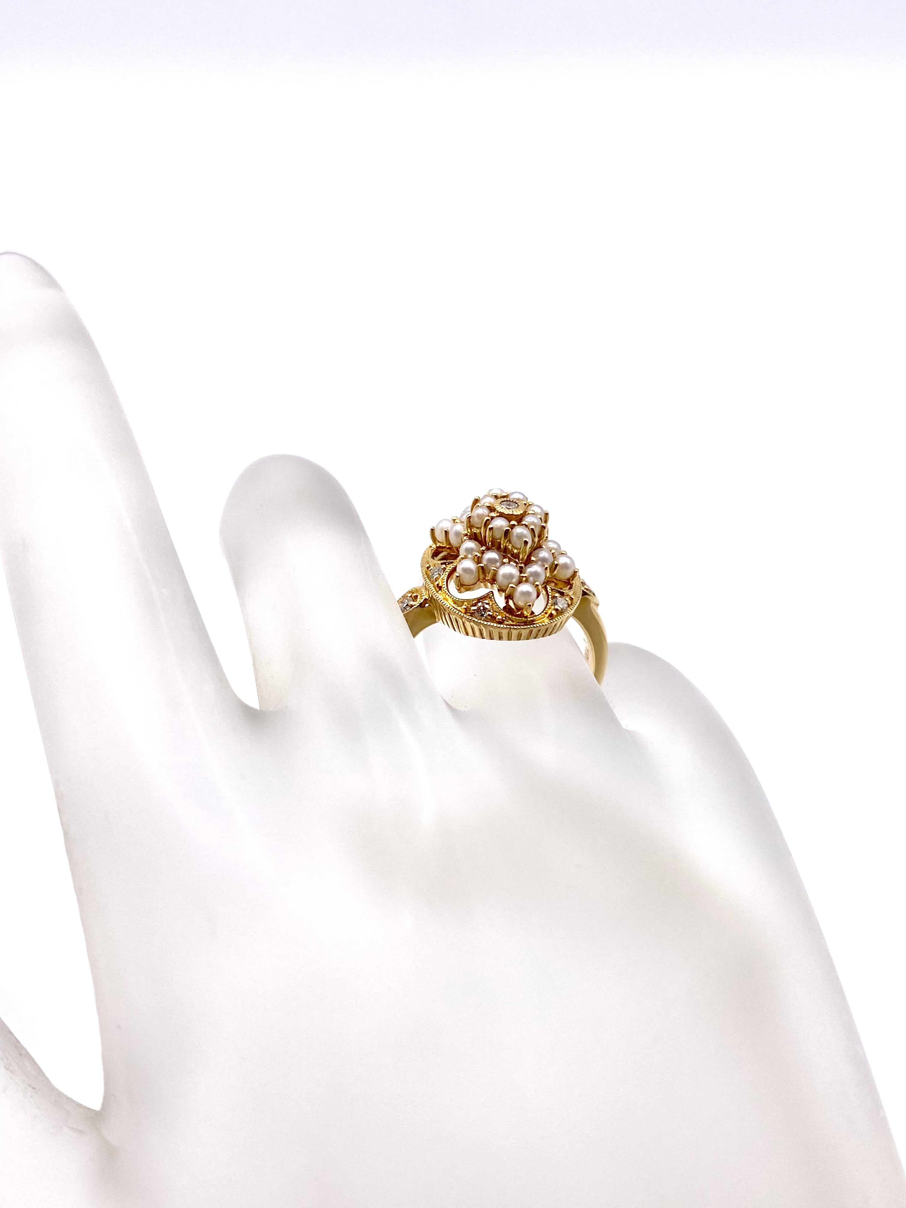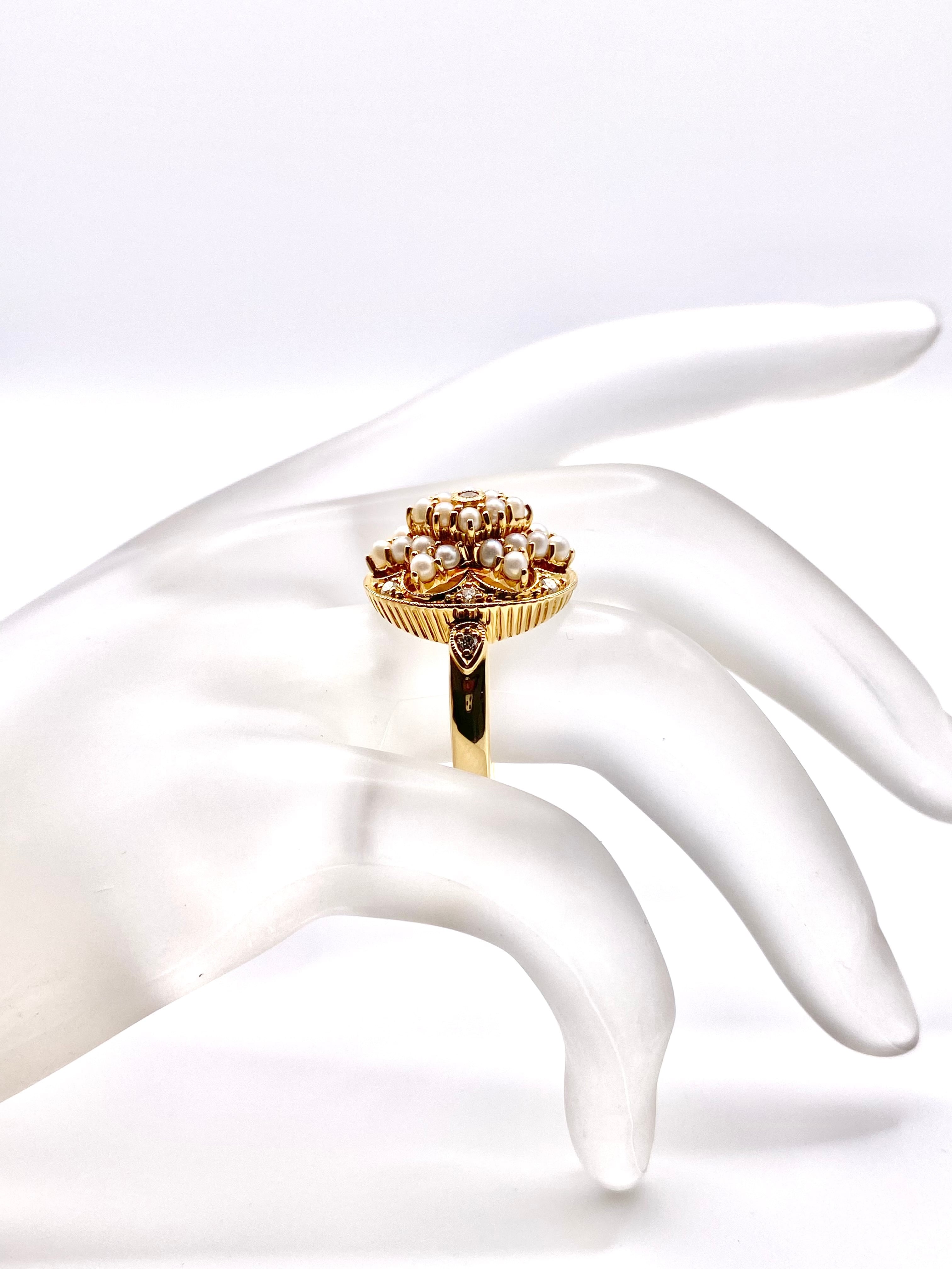 粒の小さな真珠、シードパールが26珠留められ、中央とその周囲にはダイヤモンドが散りばめられているリング。
