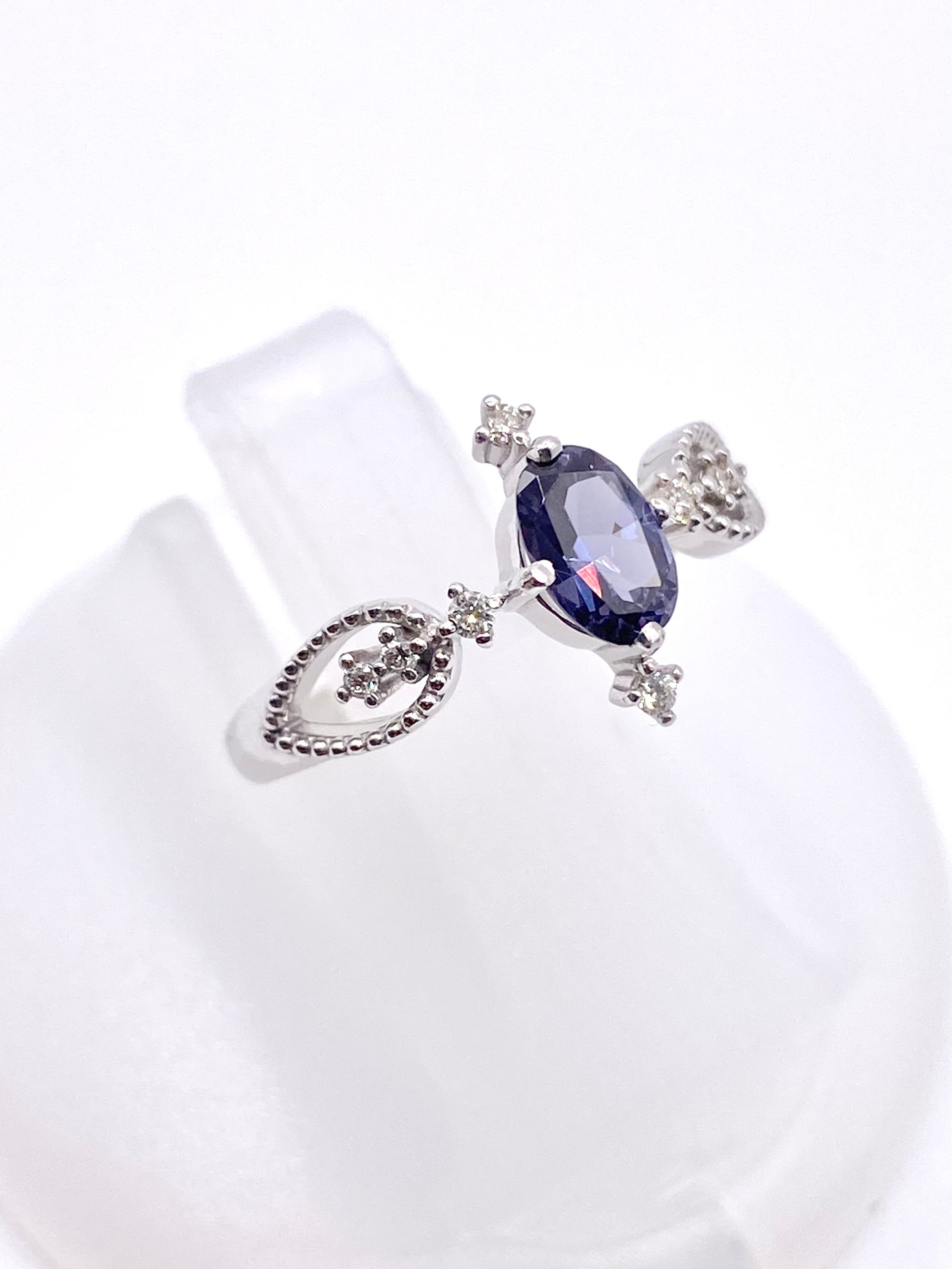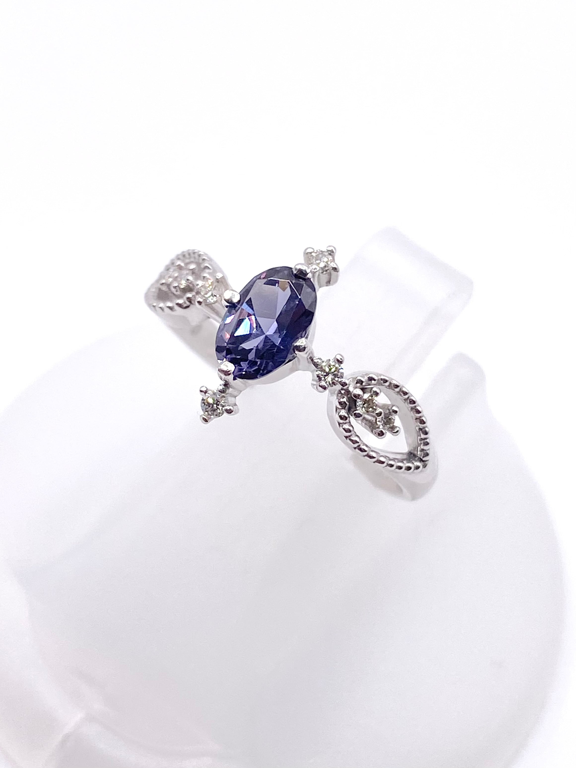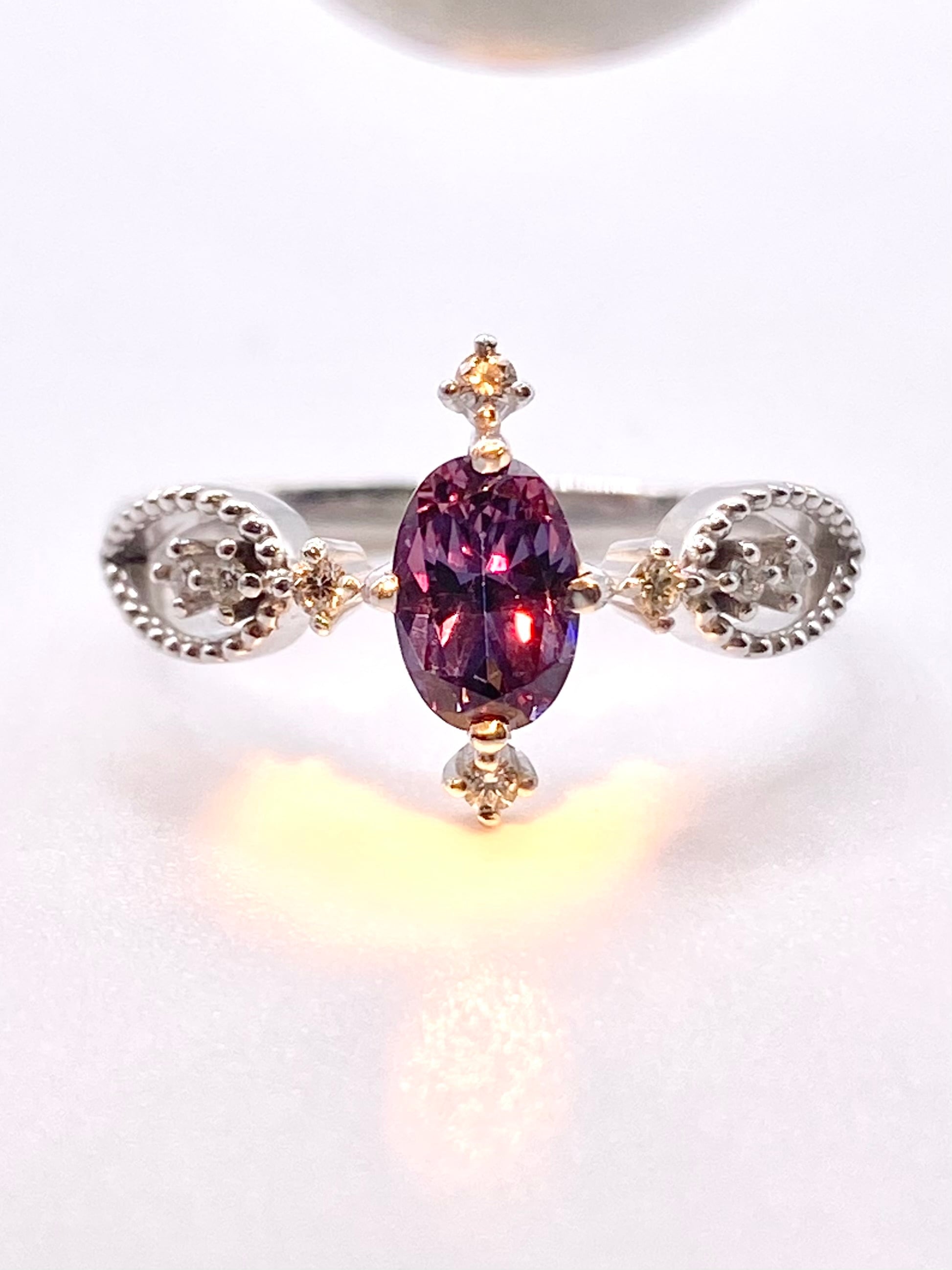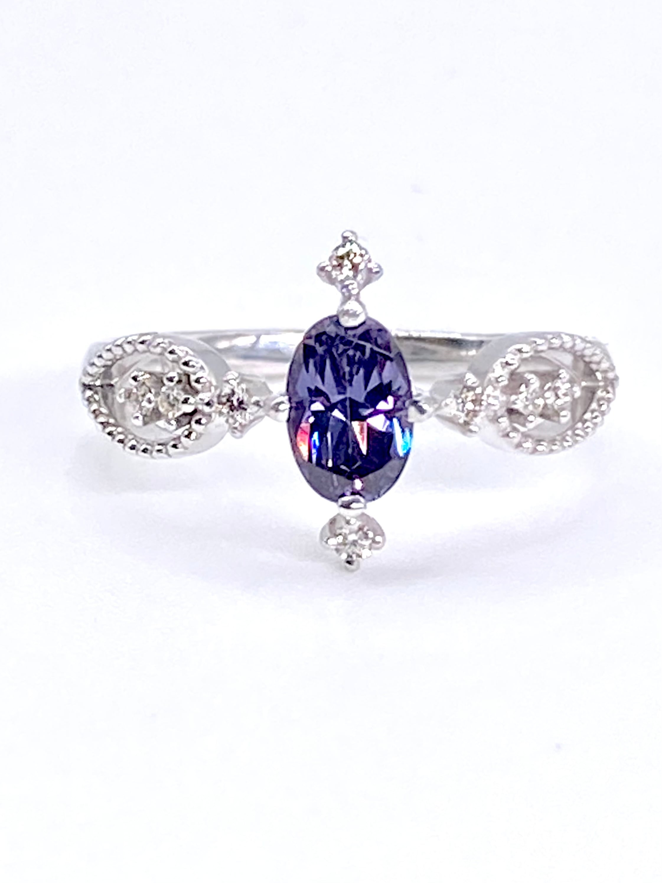 華やかで美しいデザインの中央に輝くカラーチェンジガーネットは、濃い紫がかった藍色のような、複雑で何とも言えない美しい色をしています。傾けると紫と灰青色、そして角度により赤い輝きが差し込まれるため、ぱっと見の印象以上に強い主張を感じられるでしょう。