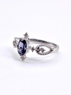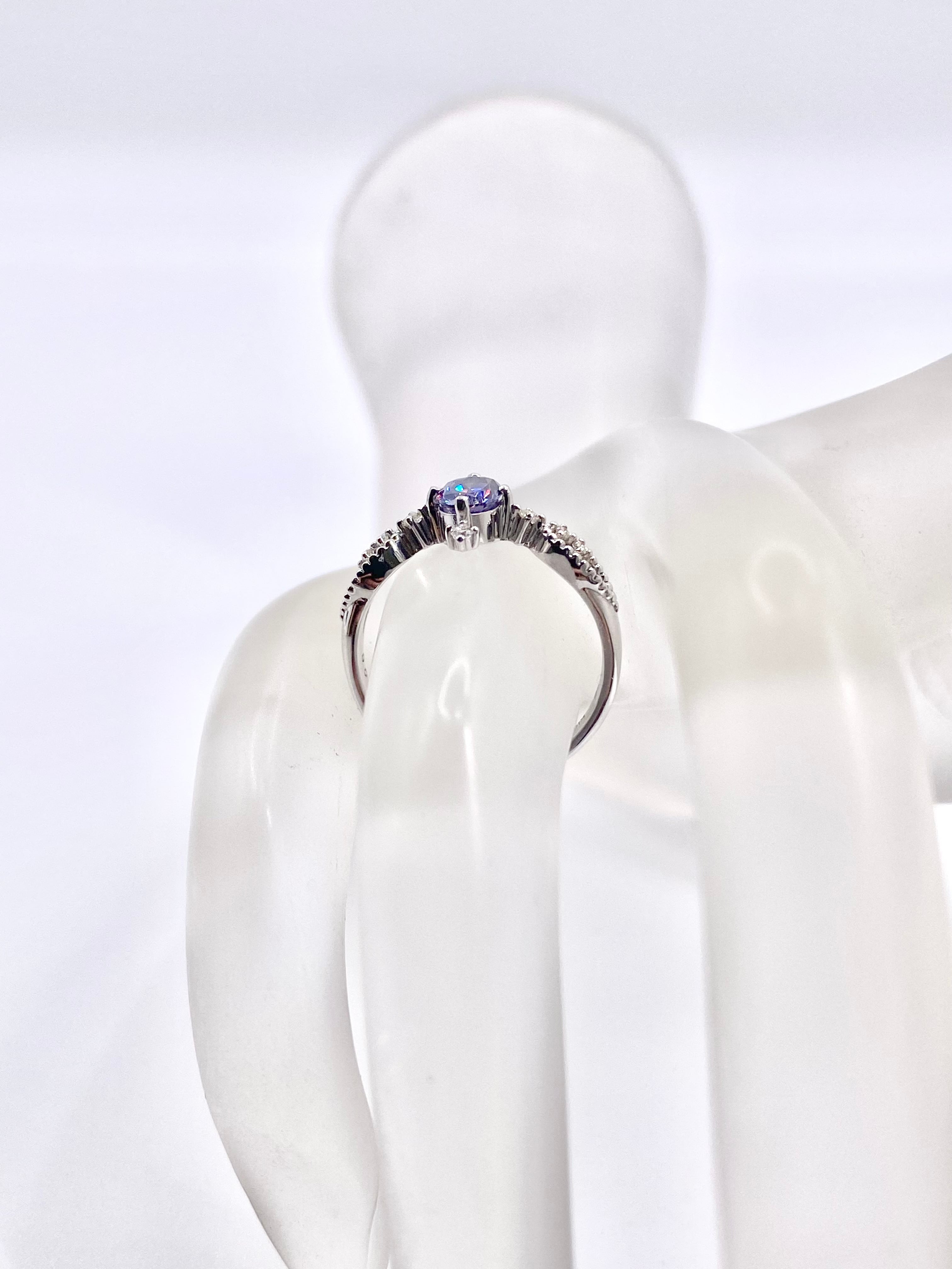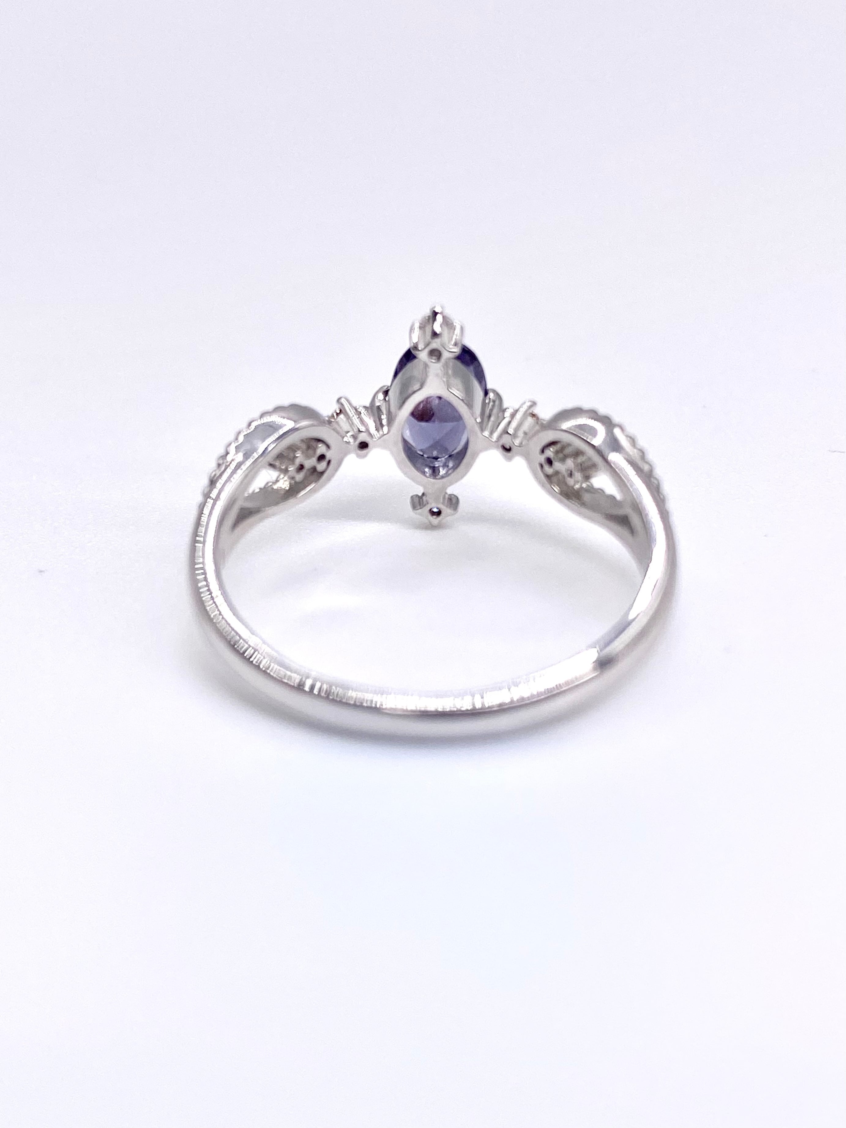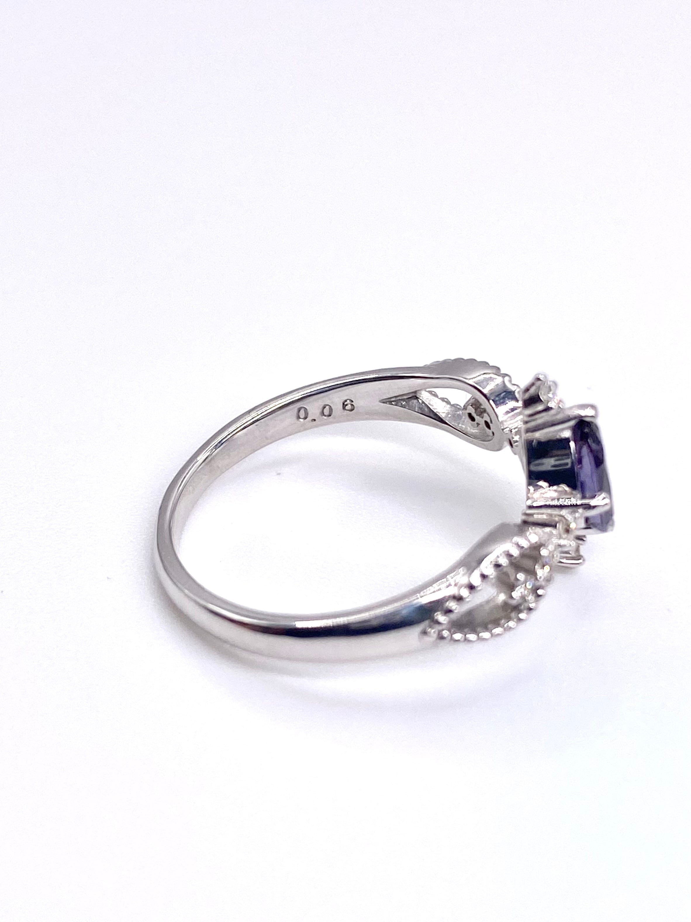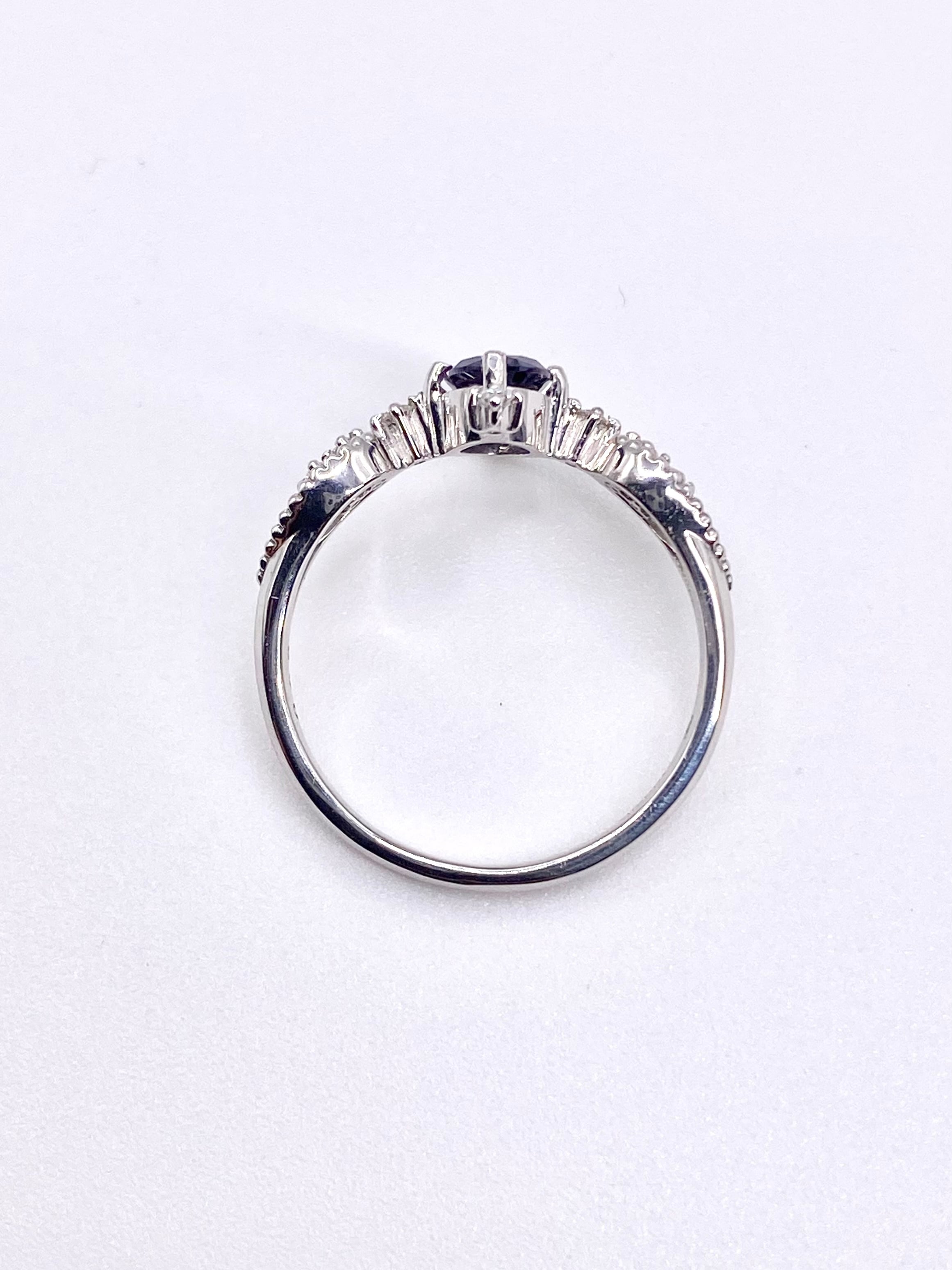 華やかで美しいデザインの中央に輝くカラーチェンジガーネットは、濃い紫がかった藍色のような、複雑で何とも言えない美しい色をしています。傾けると紫と灰青色、そして角度により赤い輝きが差し込まれるため、ぱっと見の印象以上に強い主張を感じられるでしょう。