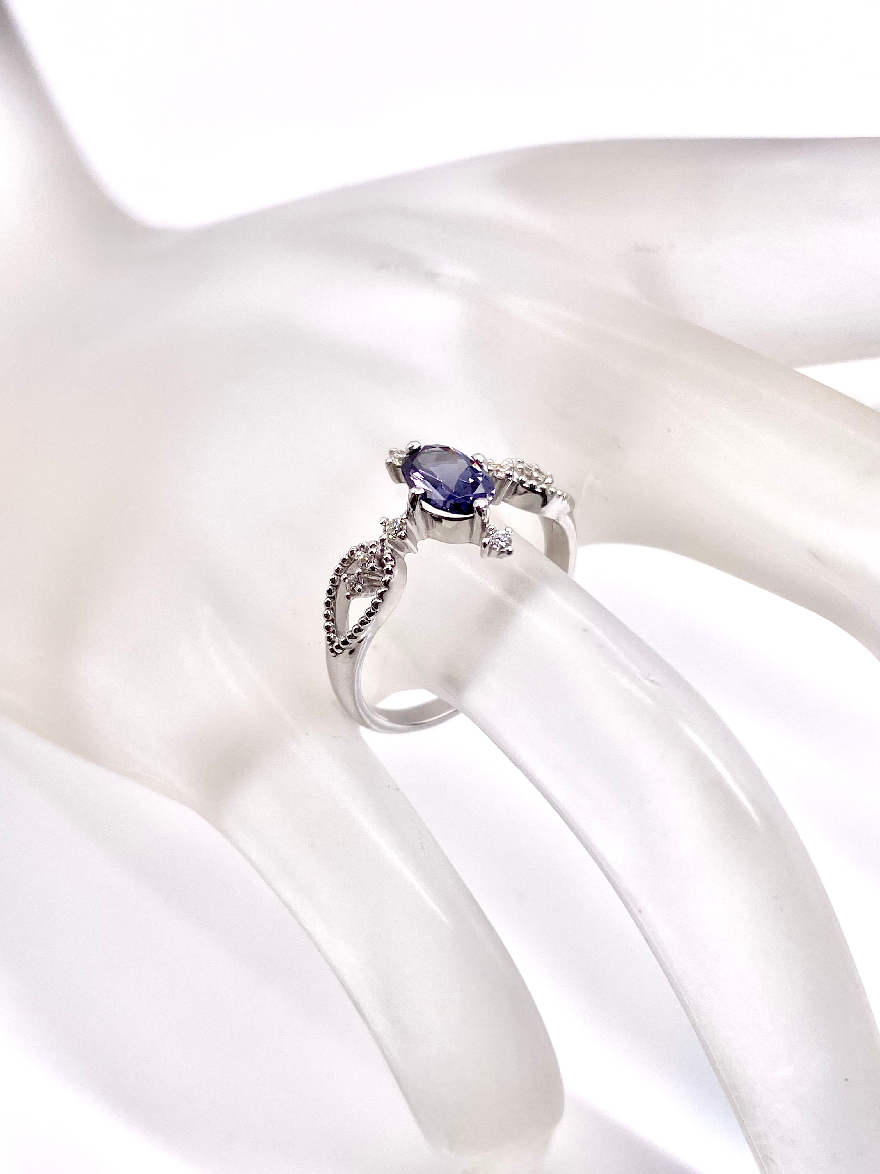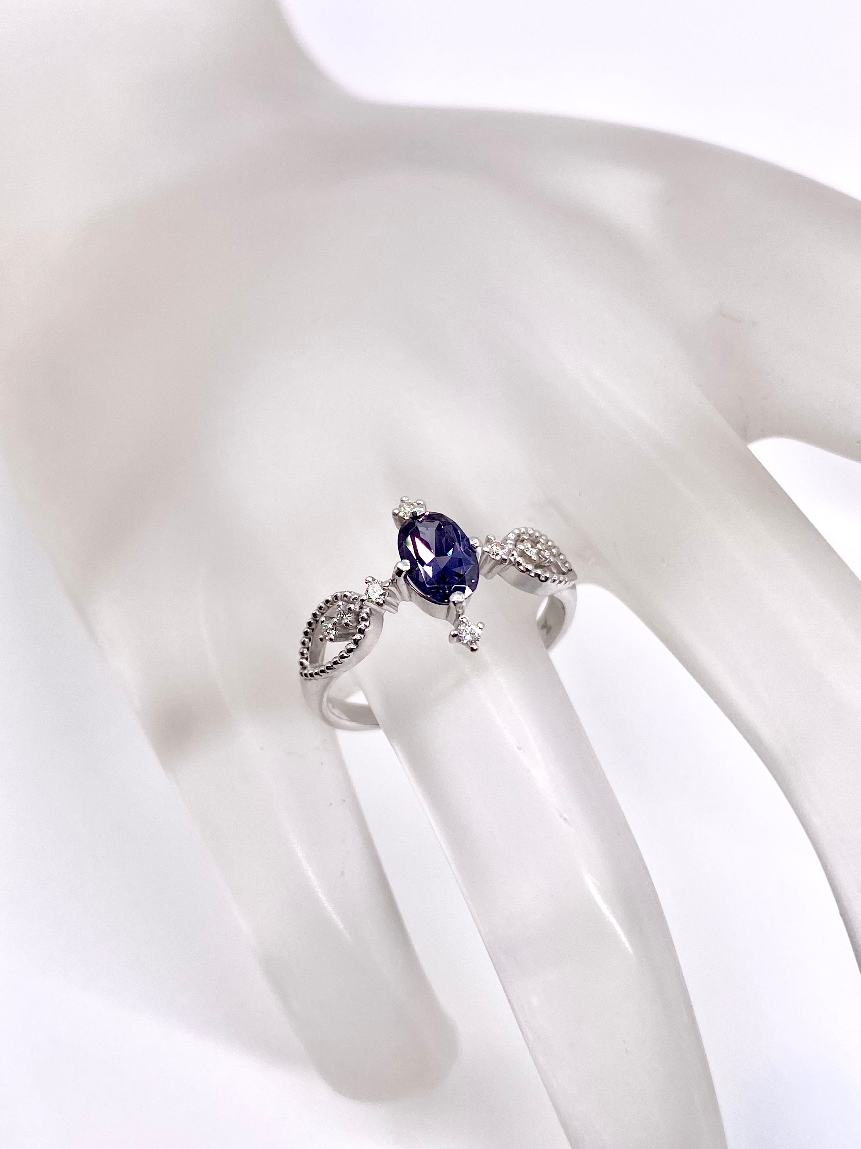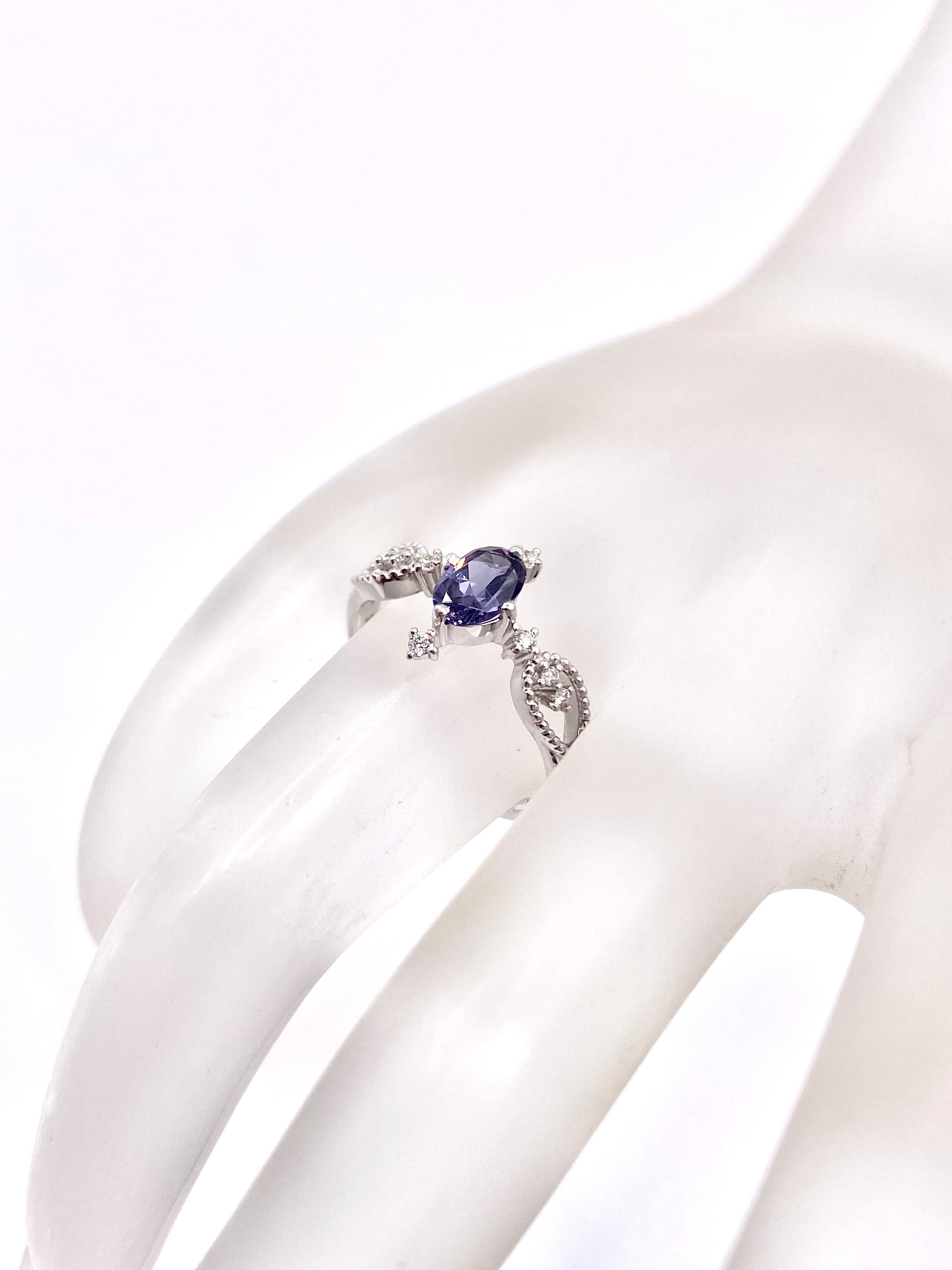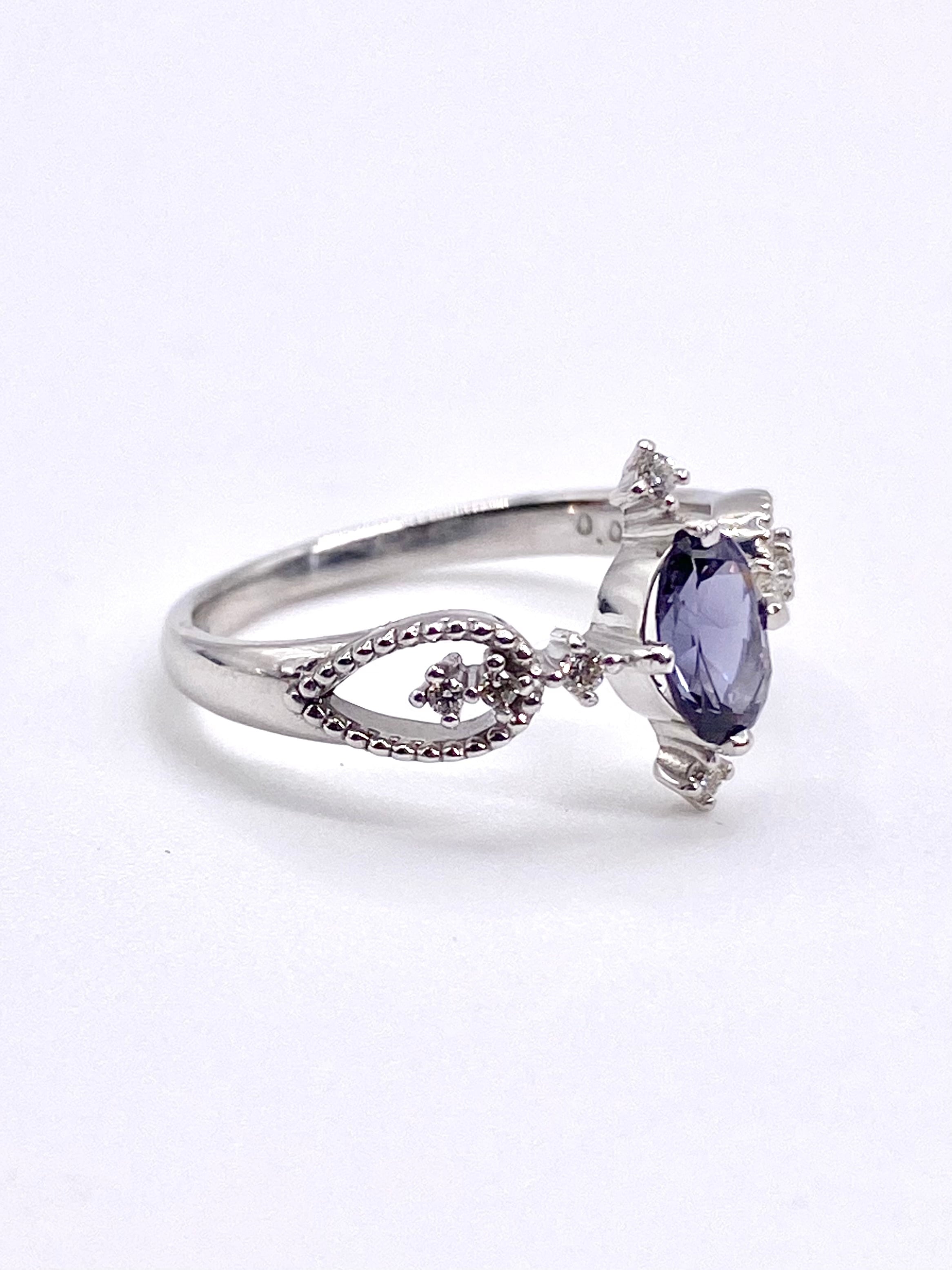 華やかで美しいデザインの中央に輝くカラーチェンジガーネットは、濃い紫がかった藍色のような、複雑で何とも言えない美しい色をしています。傾けると紫と灰青色、そして角度により赤い輝きが差し込まれるため、ぱっと見の印象以上に強い主張を感じられるでしょう。