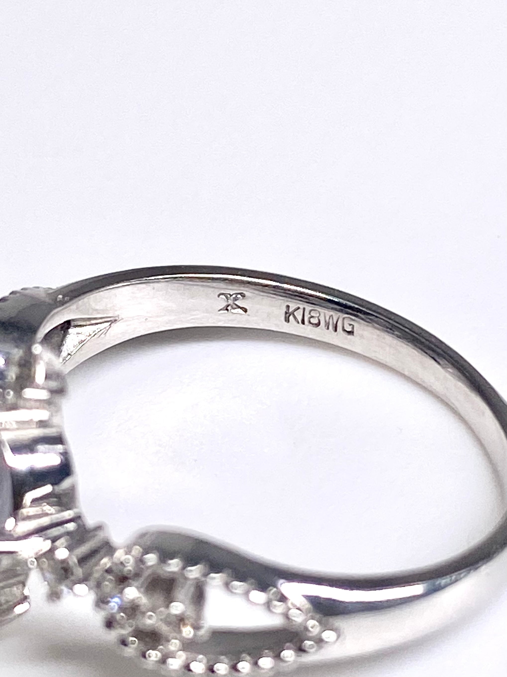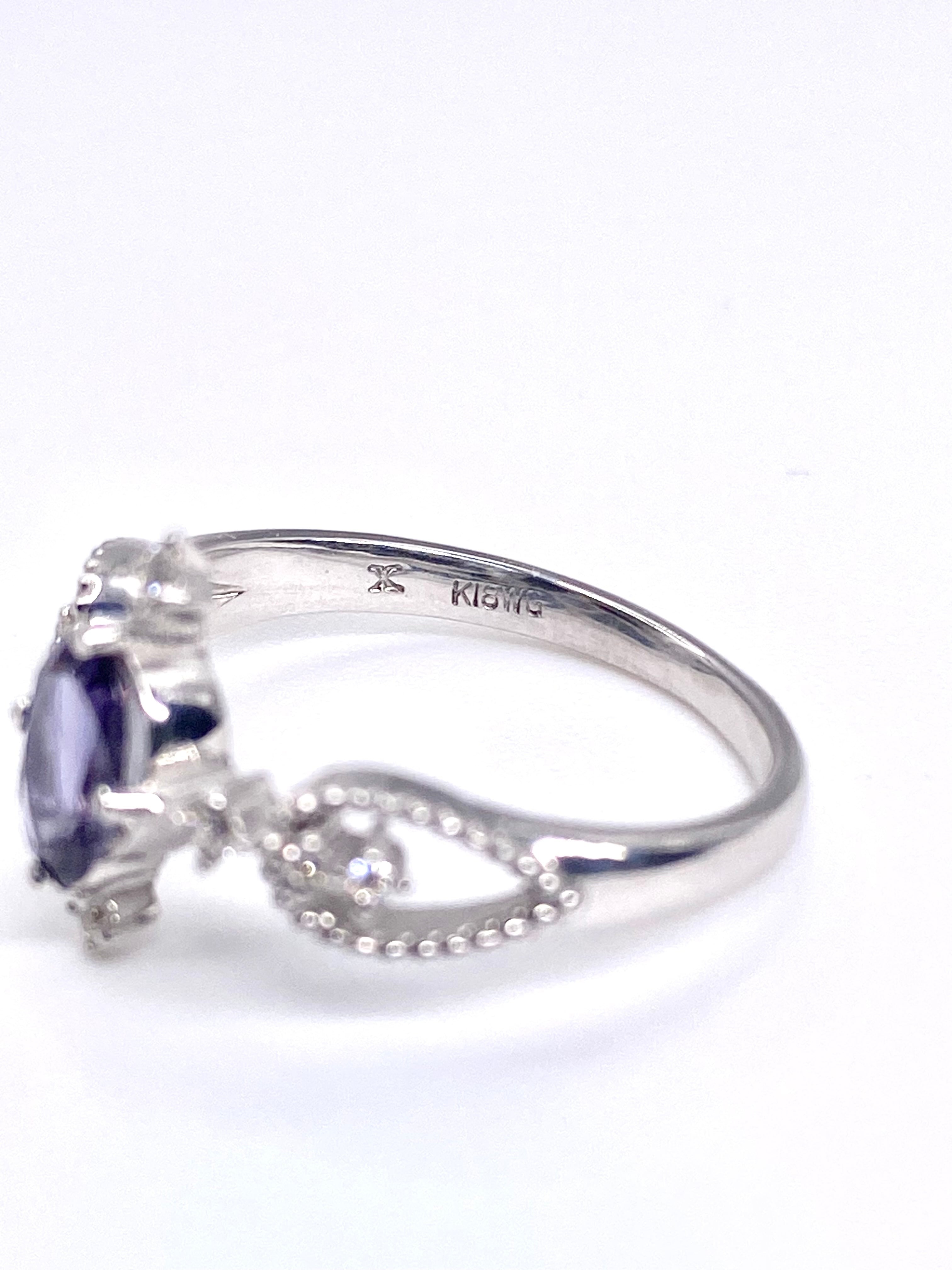 カラーチェンジガーネットとダイヤモンドがセットされた、18金ホワイトゴールドのリングのご紹介です。こちらは内側に【BIZOUX】の刻印が確認できます。