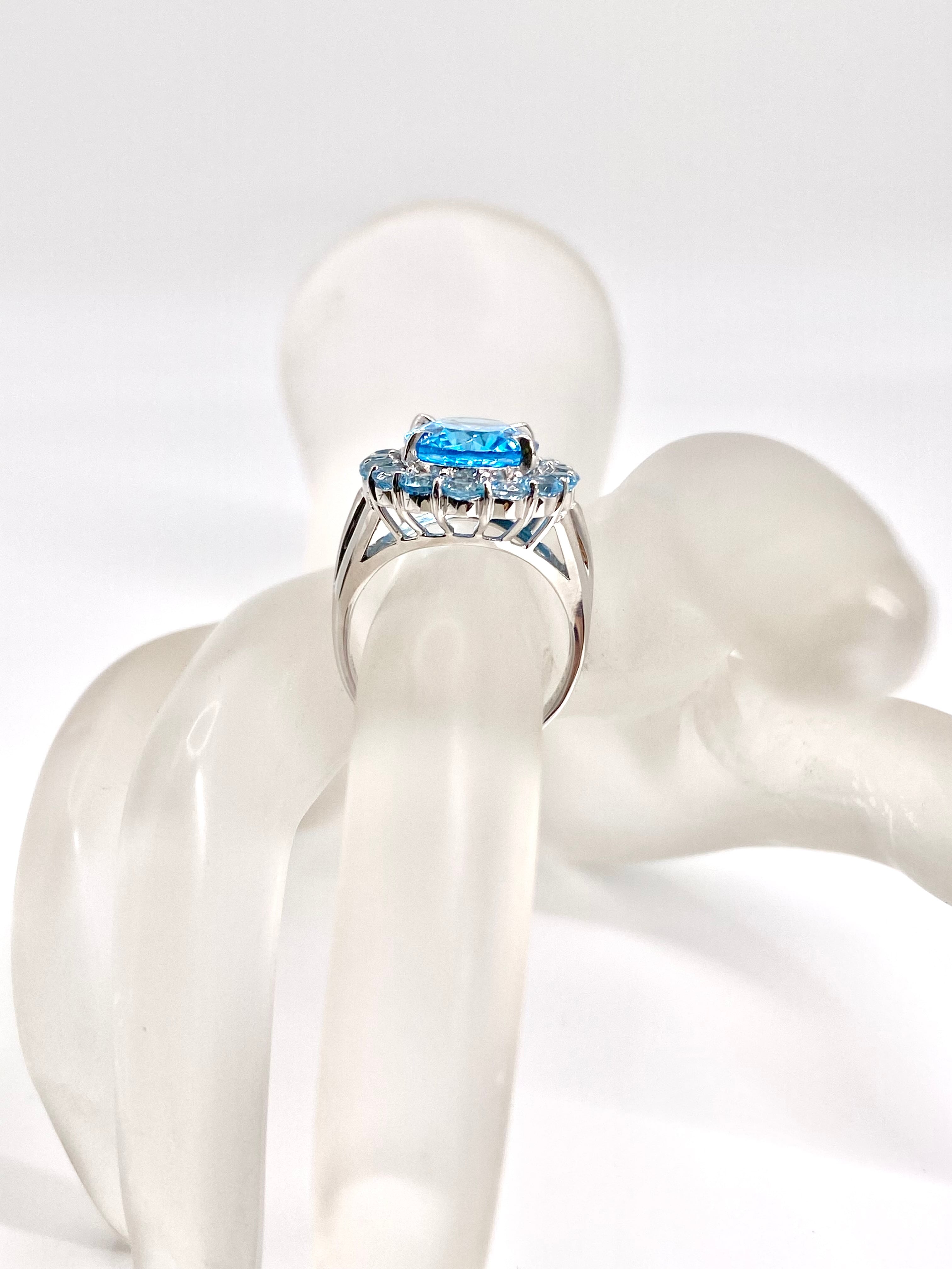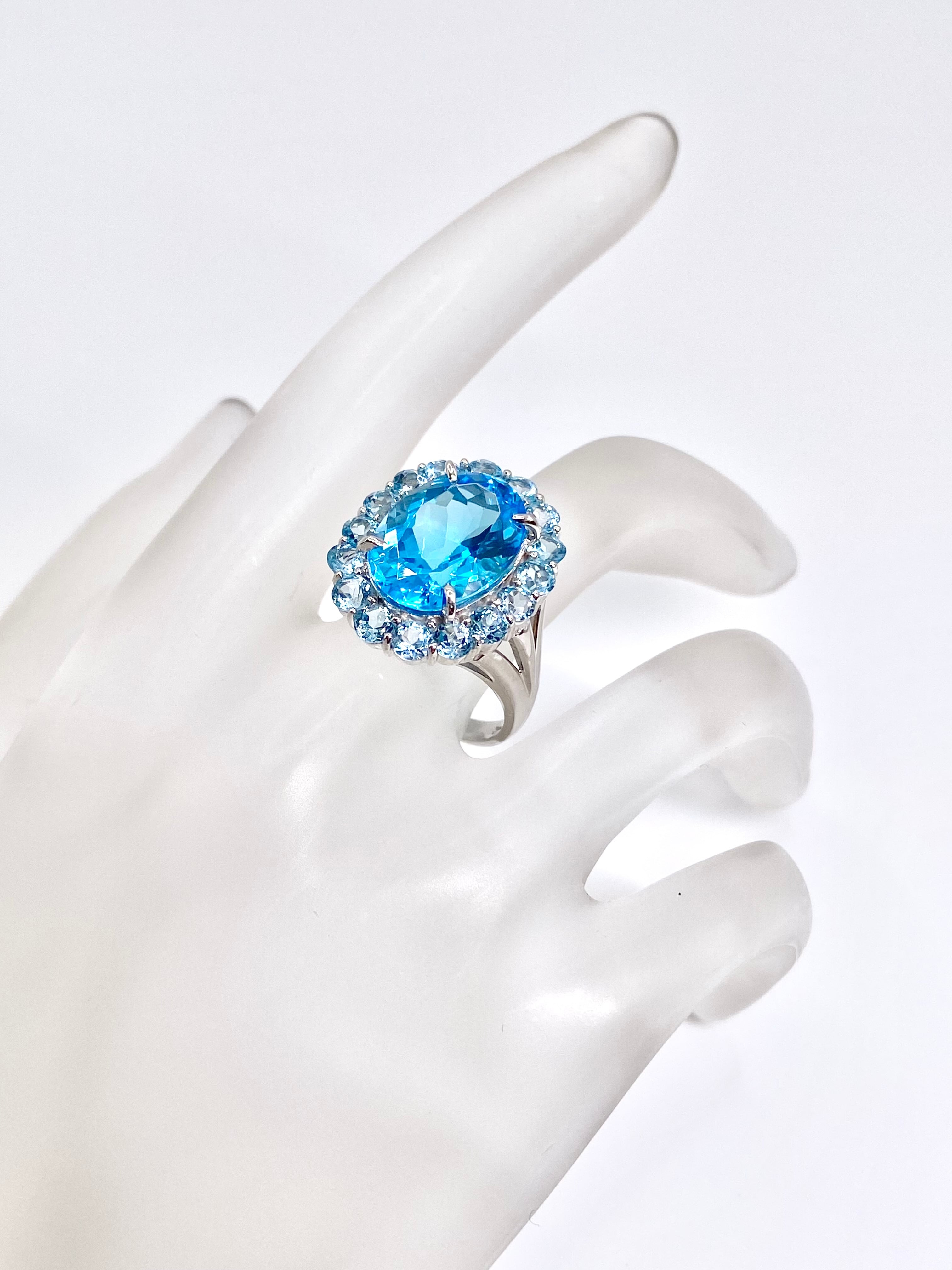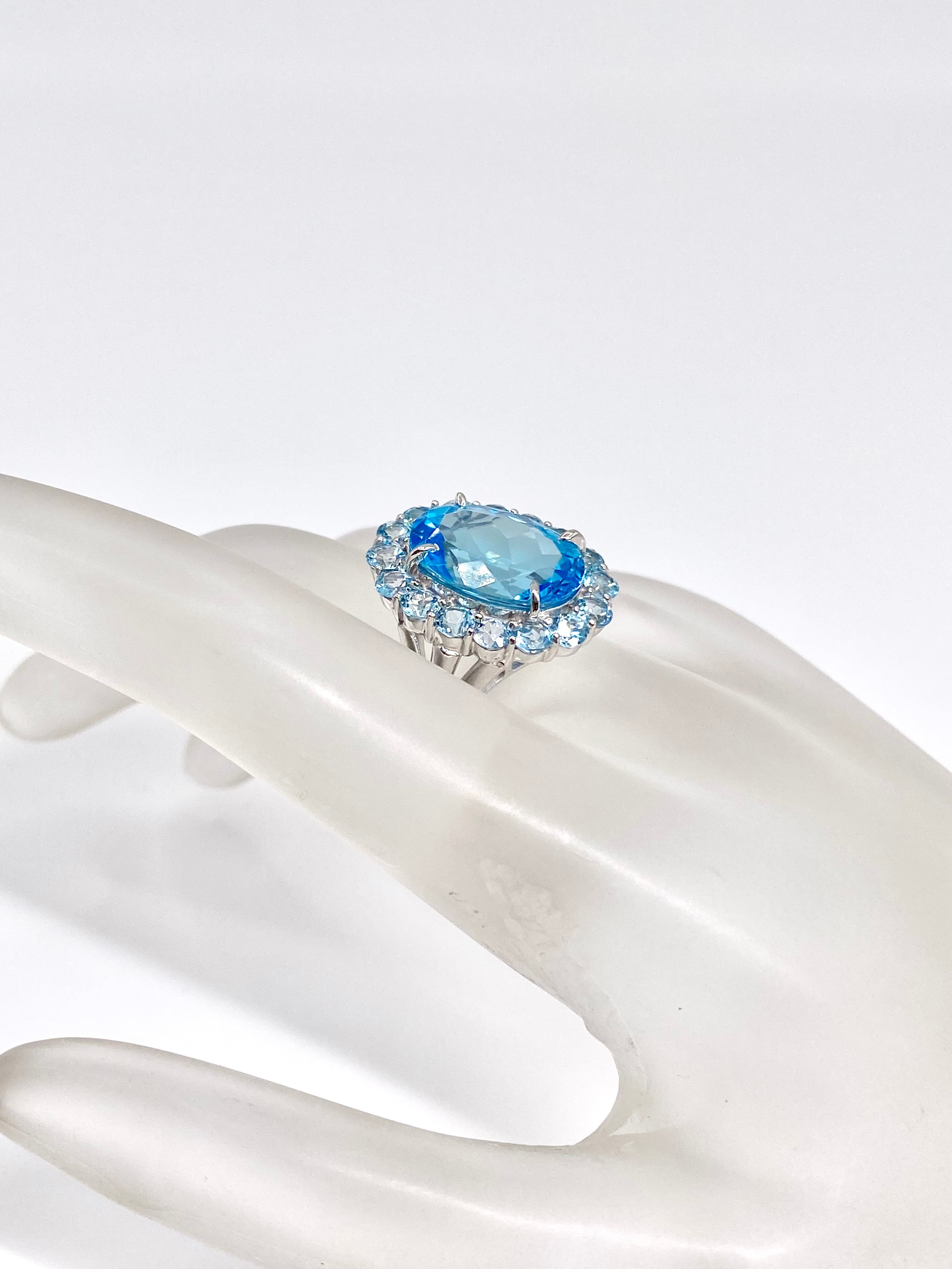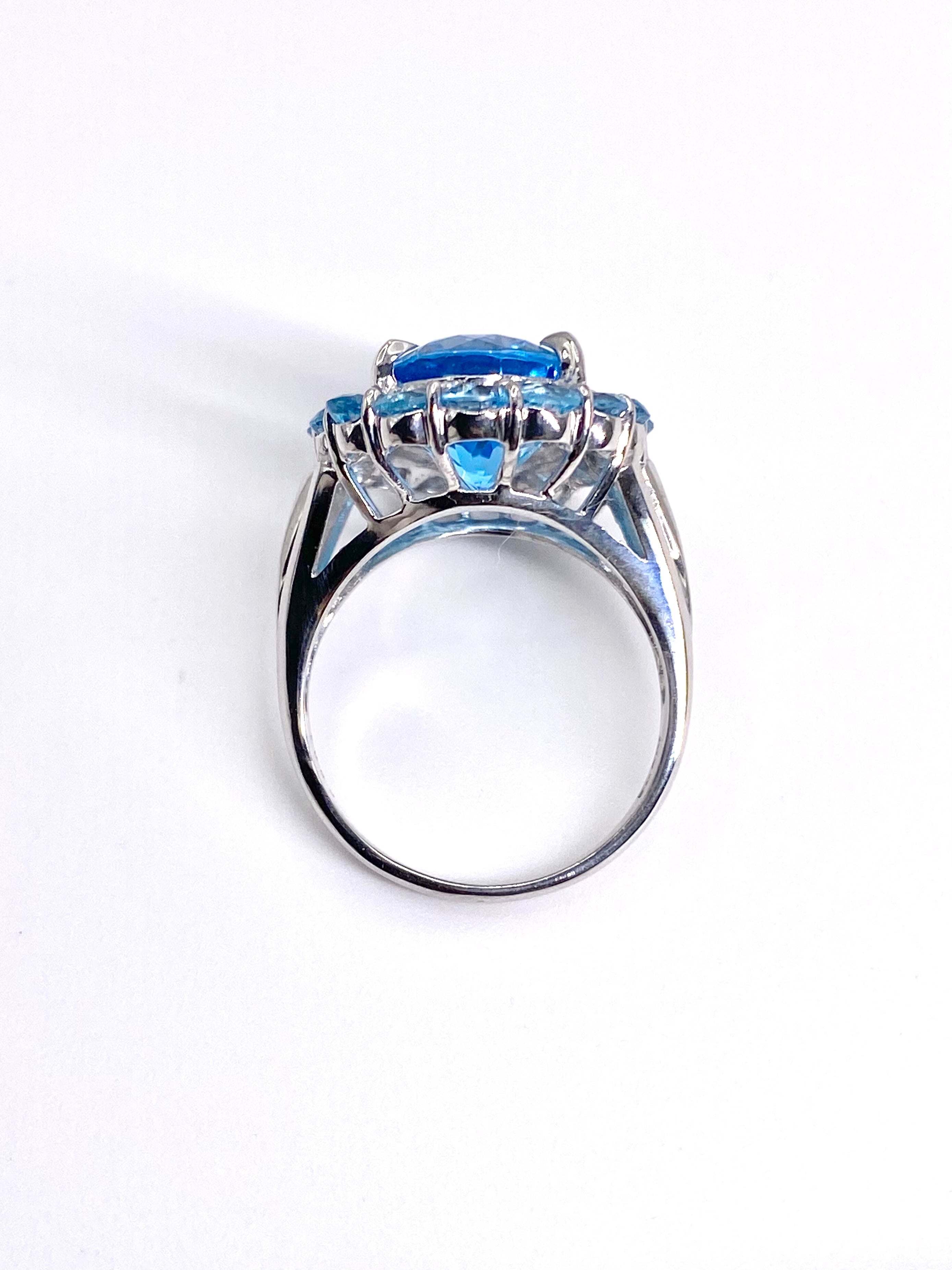 大粒のスカイブルーのような色のトパーズの周りを、淡いブルートパーズでぐるっと取り巻いているトパーズづくしのリングで、目に飛び込んでくる水色の勢いが強烈。