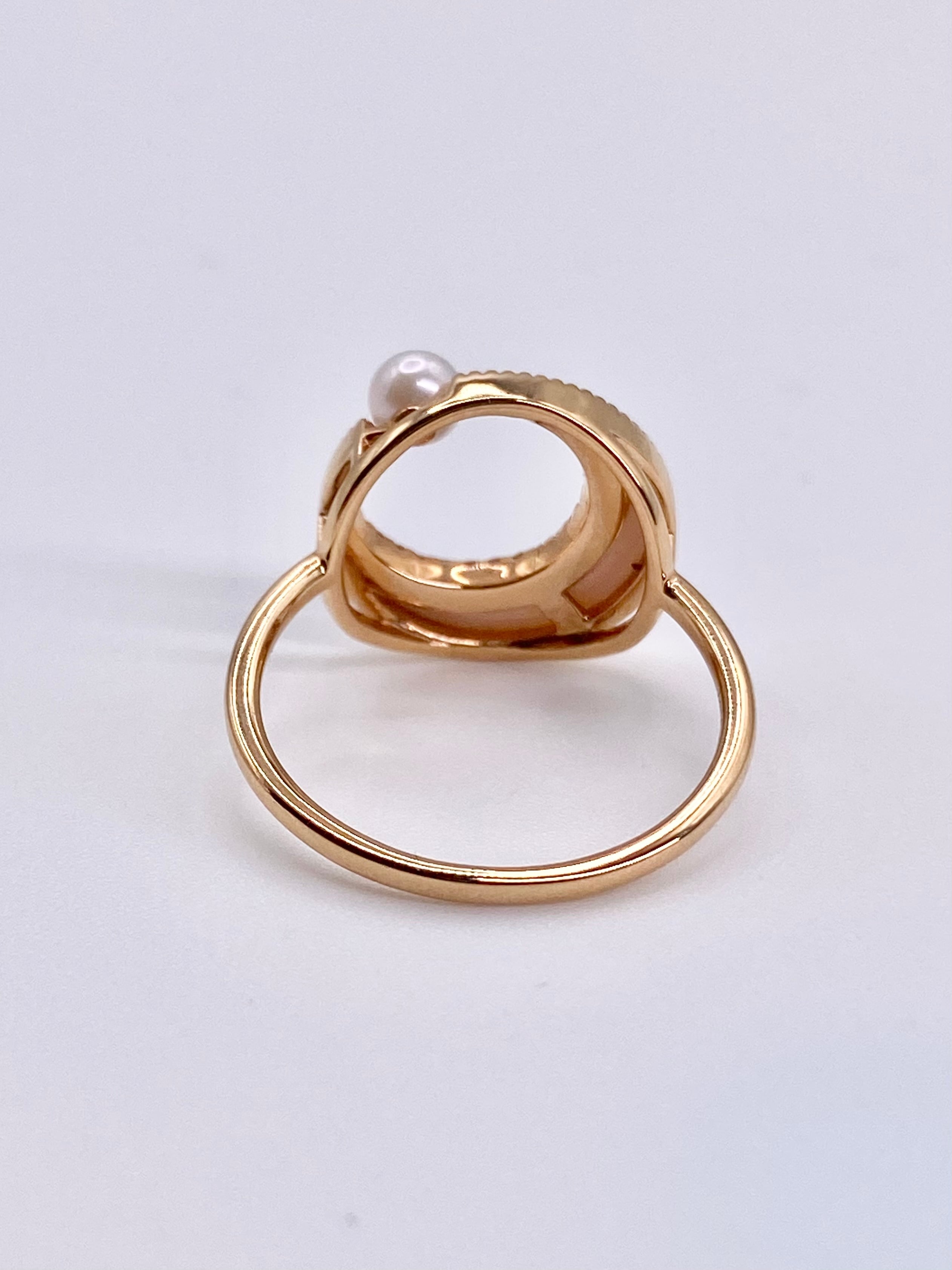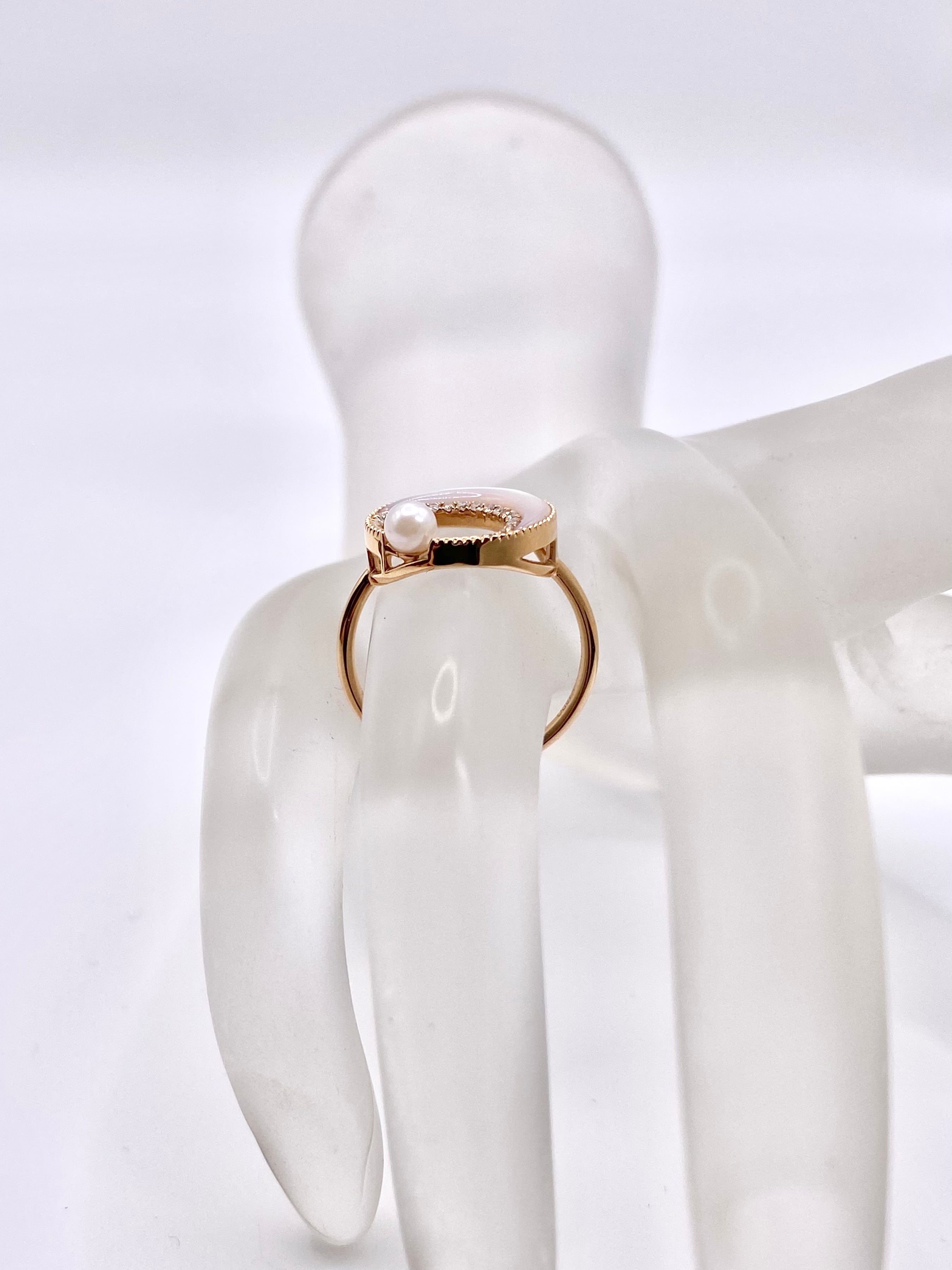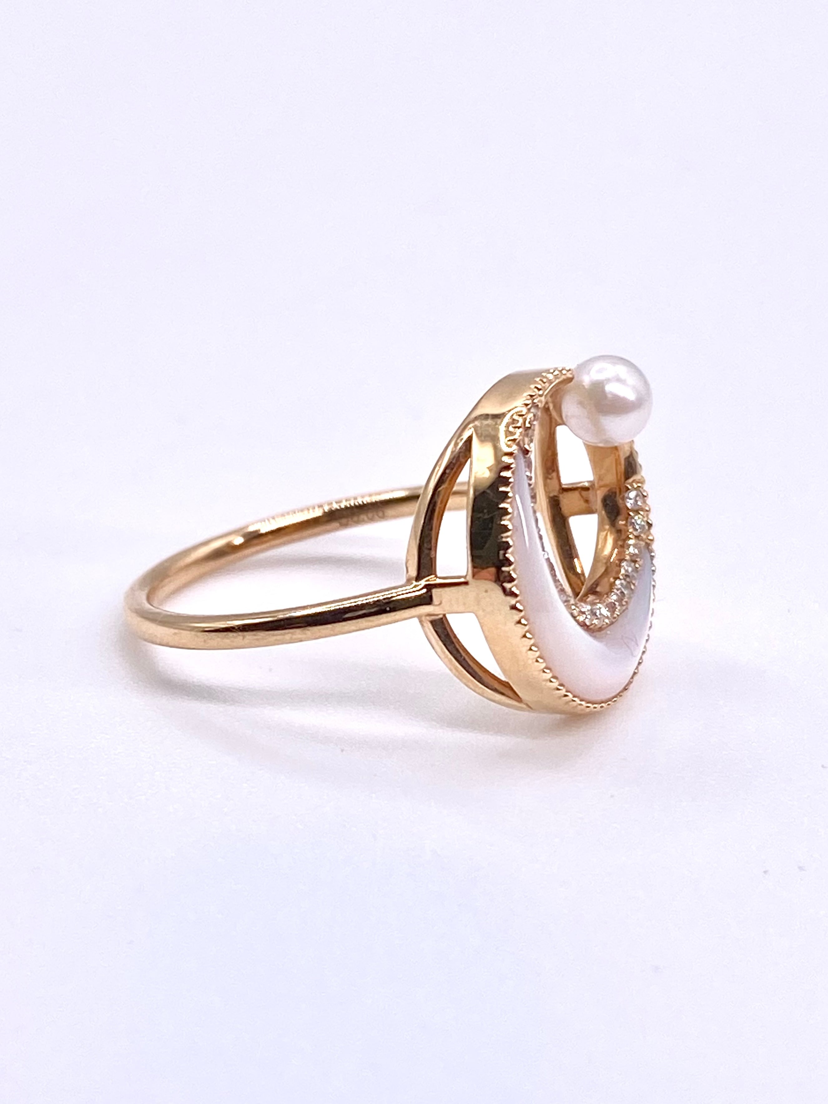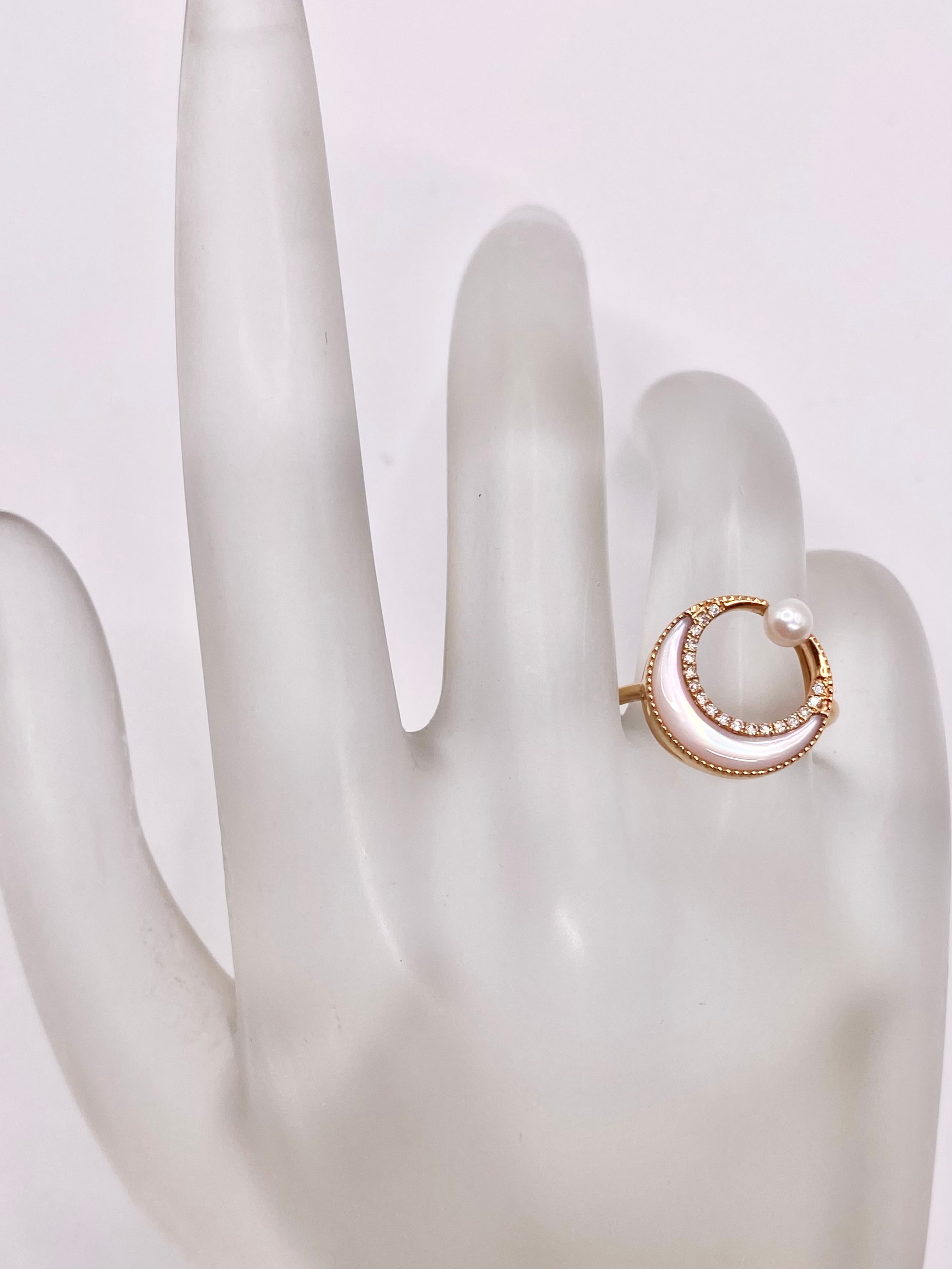 小粒のパールと三日月型の淡いピンク色のシェルが使用され、ダイヤモンドが繊細な輝きを添えた18金のリングのご紹介です。こちらの地金はピンクゴールドとなります。また、こちらは新品の商品となります。