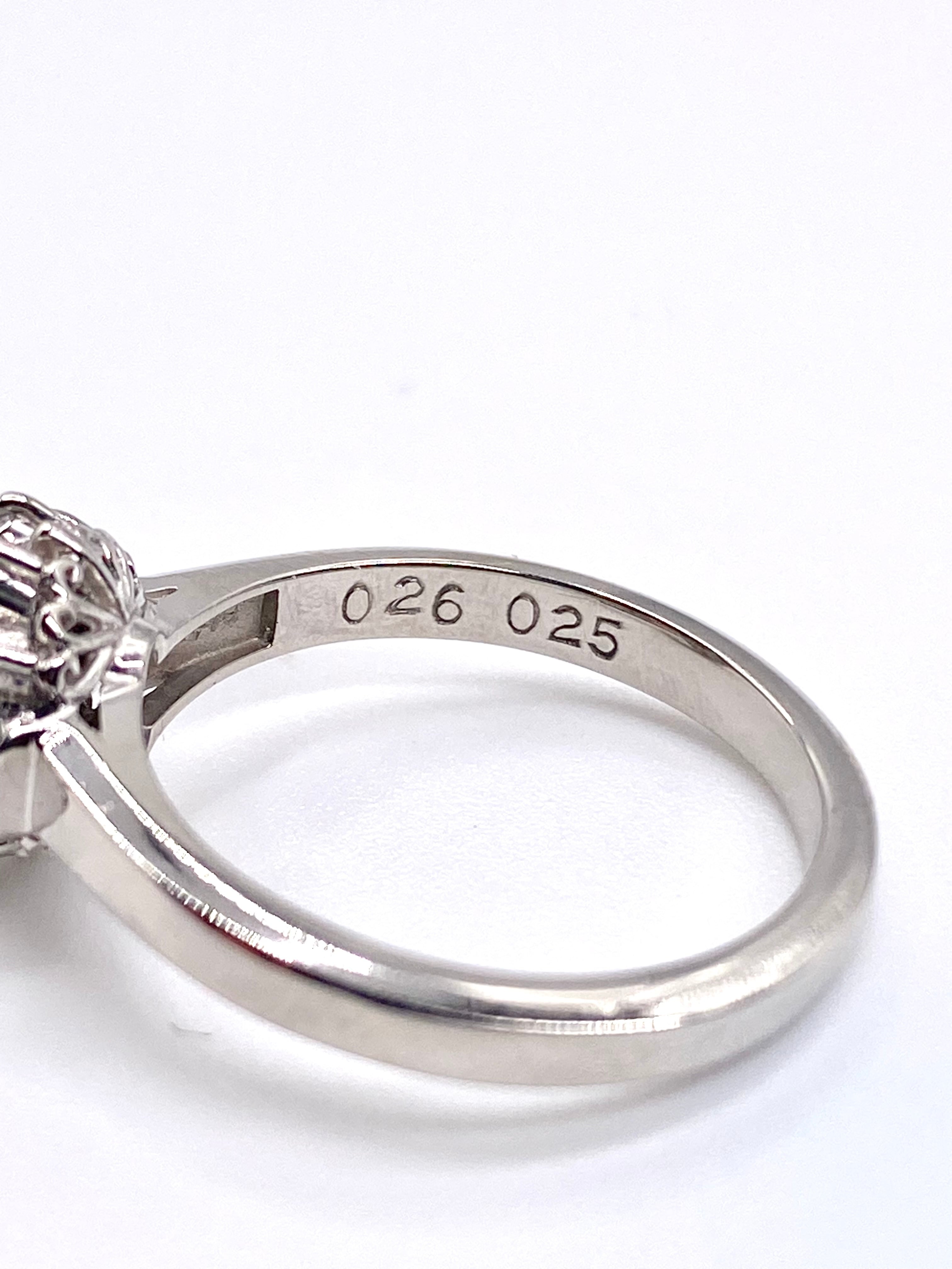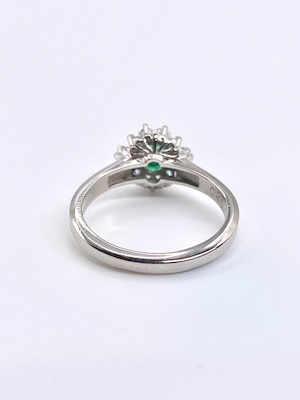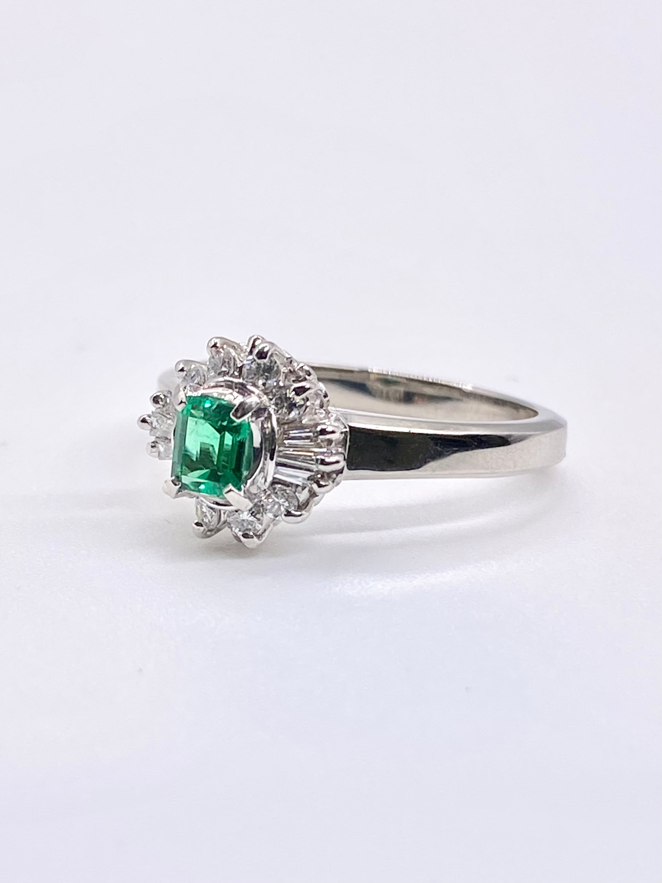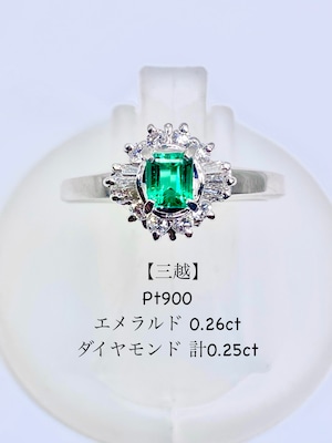 エメラルドとダイヤモンドがセットされたプラチナ900リングのご紹介です。内側に三越のマークが確認できます。