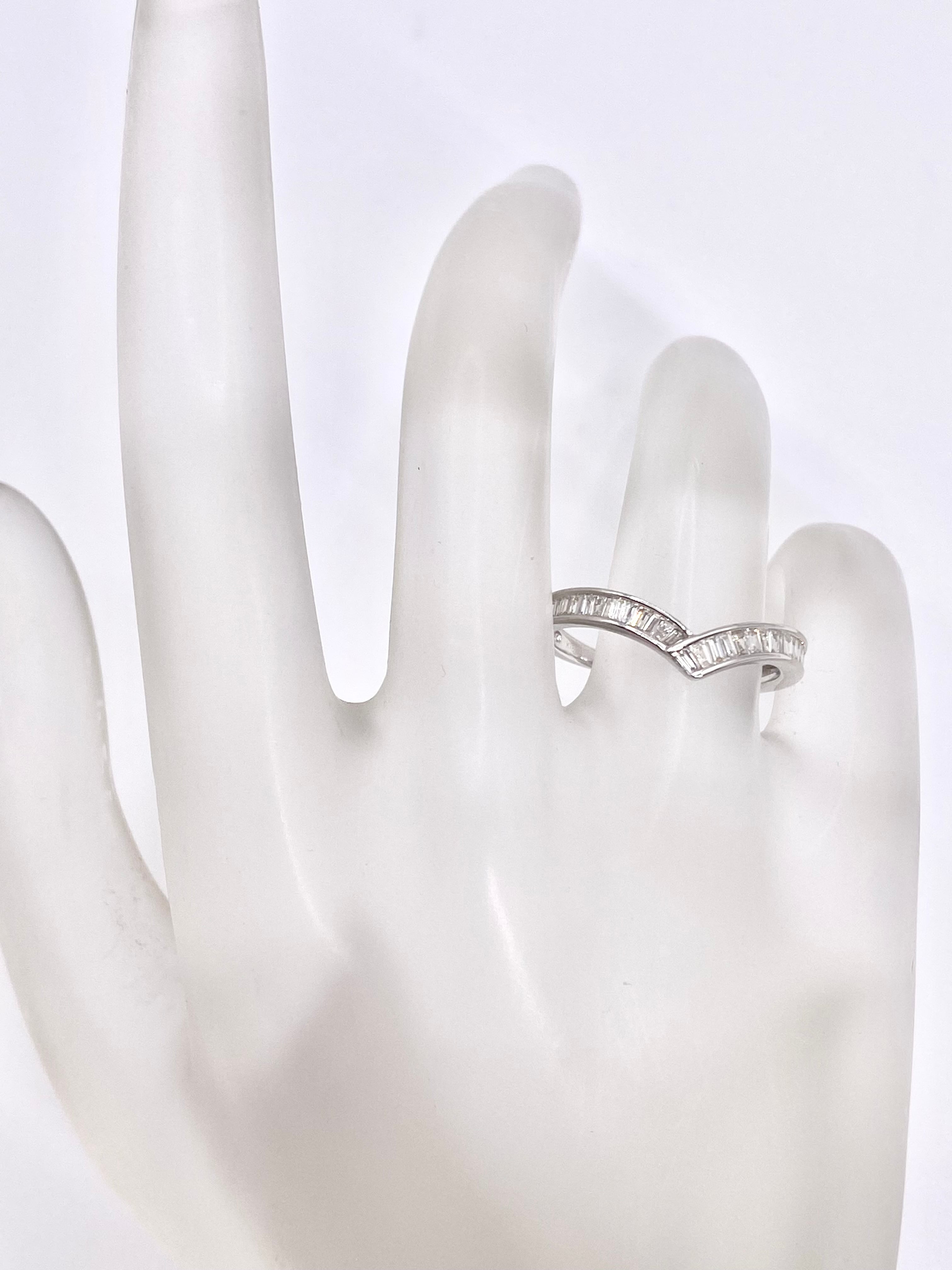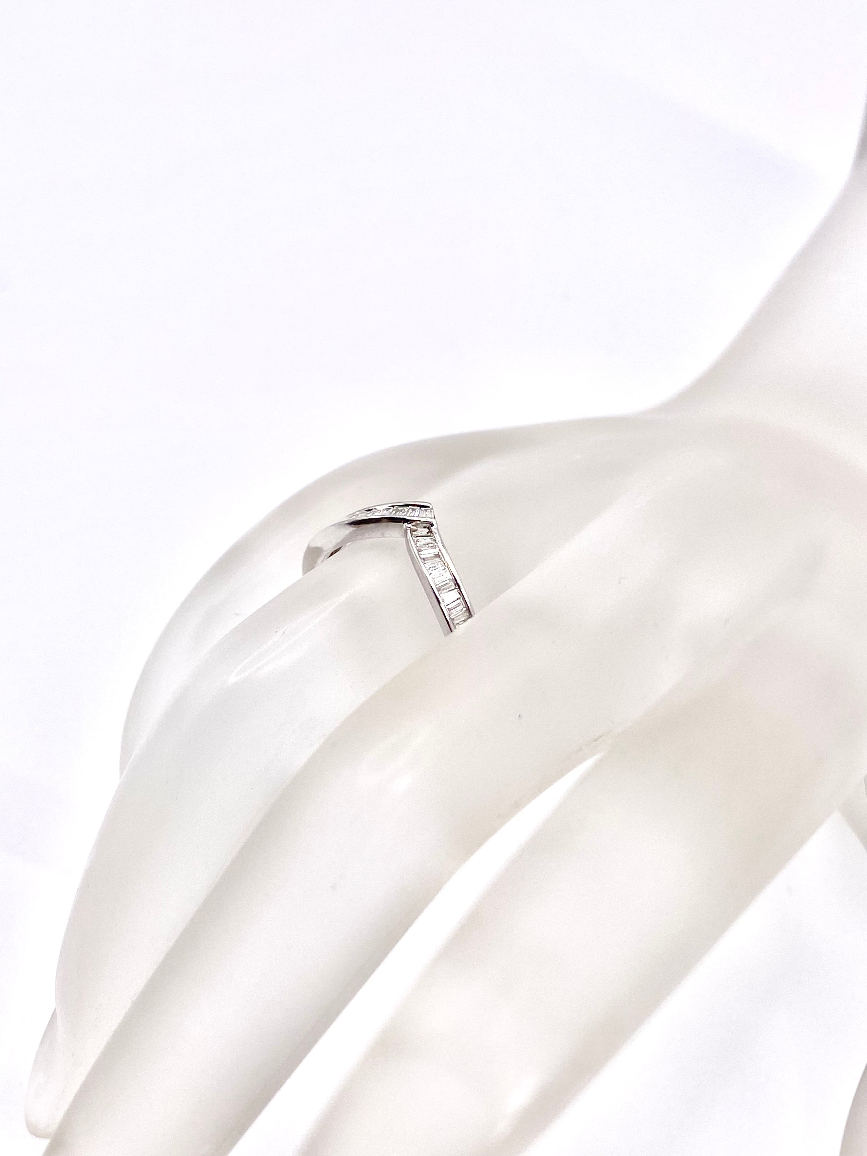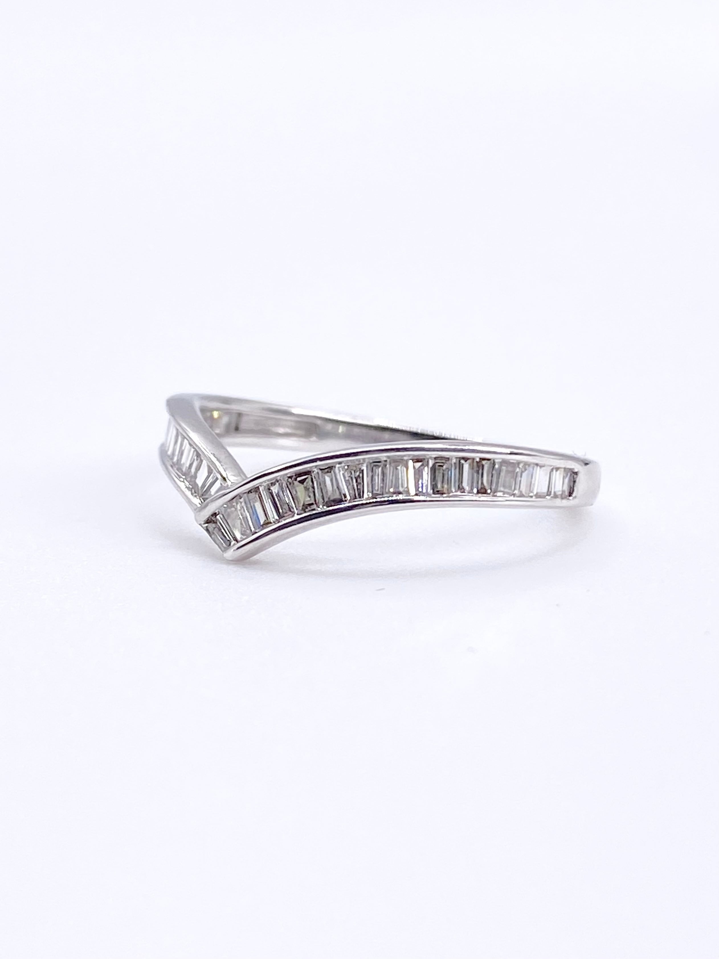 V字リングの中でも少し珍しいスクエア系統のダイヤモンドが使われた一品。V字の可愛らしさ、使いやすさはそのままに、ブリリアントカットとは異なる、まっすぐでシャープな輝きを楽しむことができます。