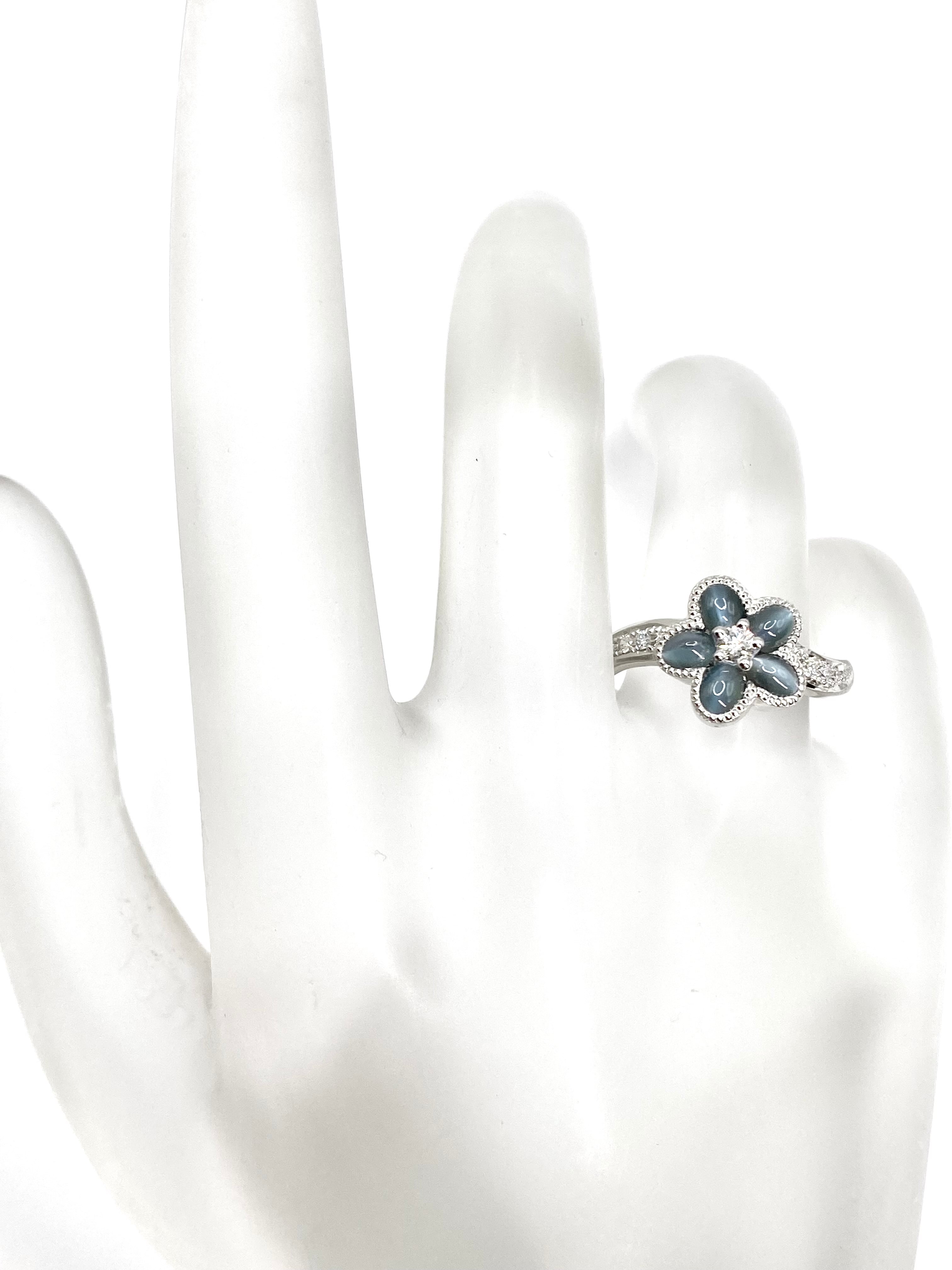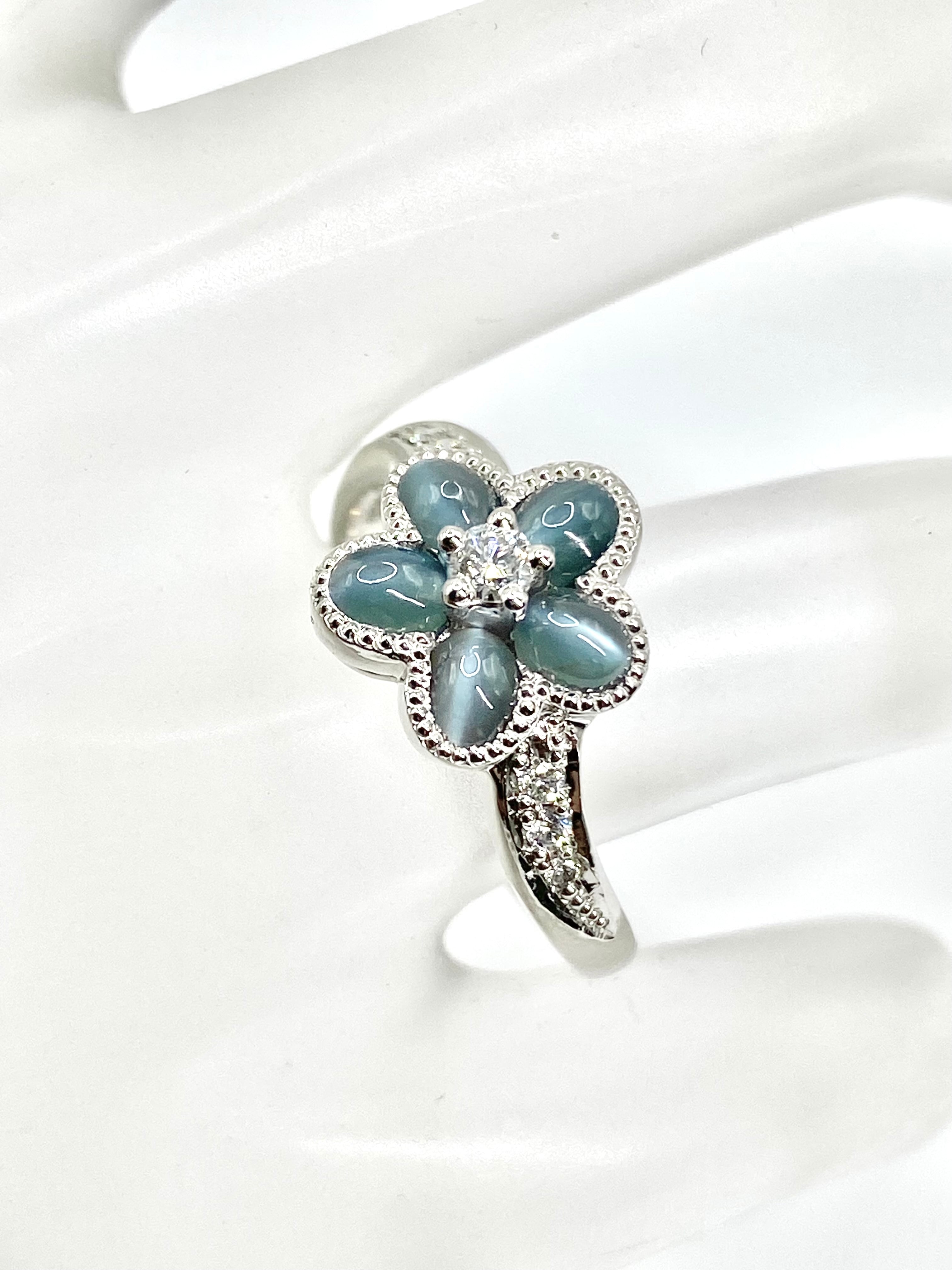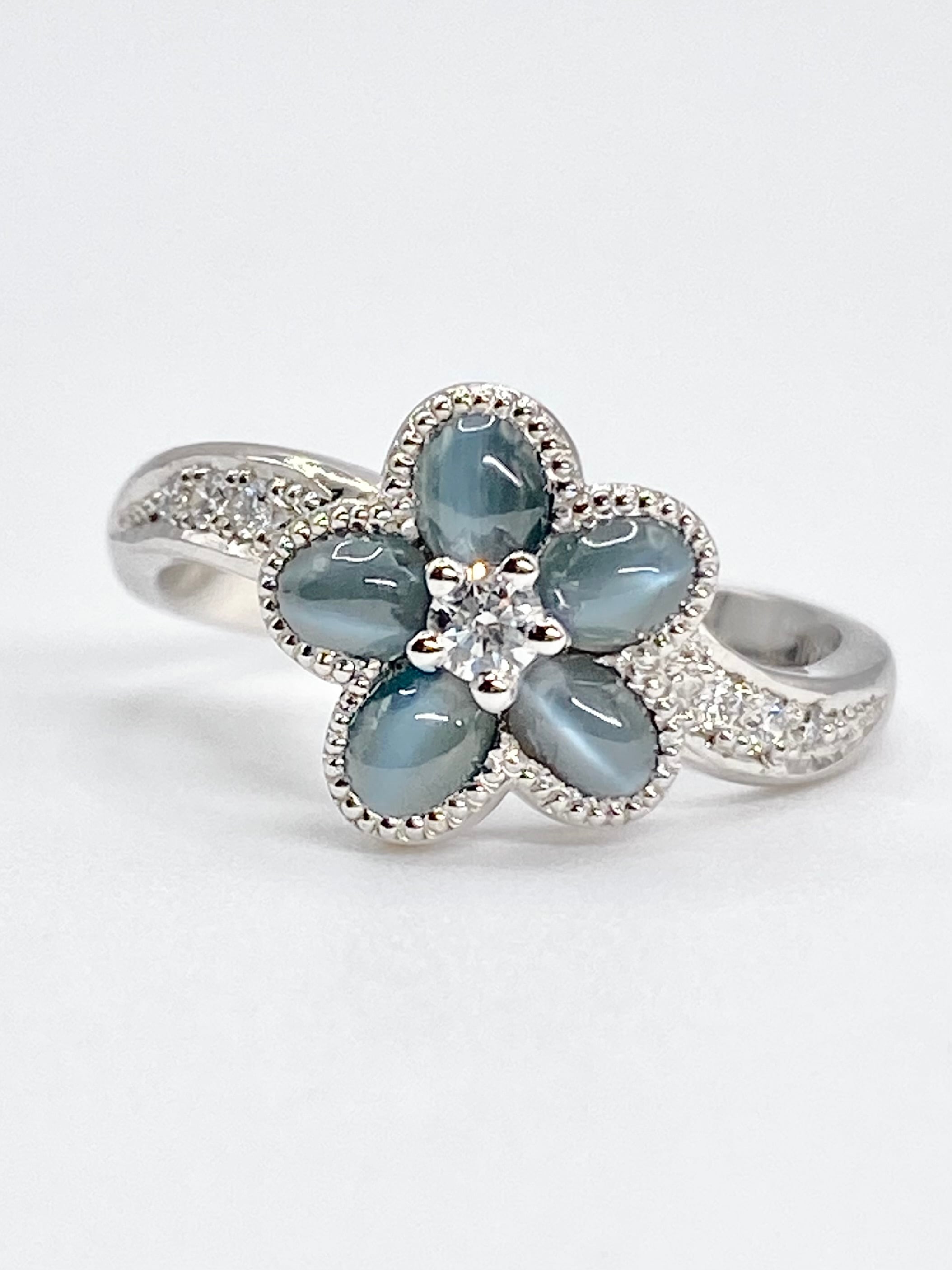 留められたアレキサンドライトキャッツアイについては、色はいずれもややグレーがかったブルーグリーン。しっとりと落ち着いた雰囲気があり、可愛らしく明るいリングデザインと好対照。これにより印象がどちらの方向にも引っ張られ過ぎないため、リングにちょうどよいバランスが与えられているように感じられます。