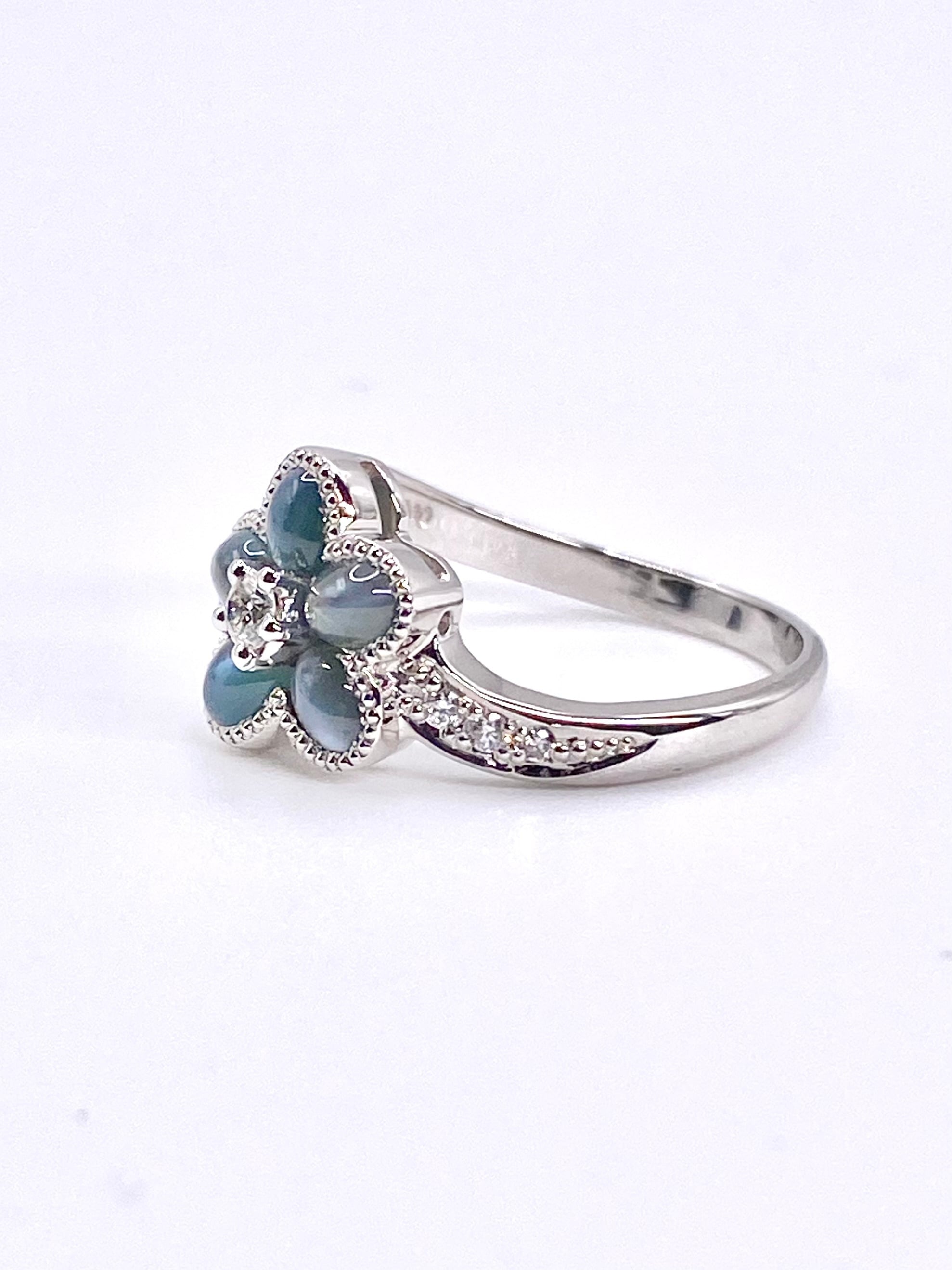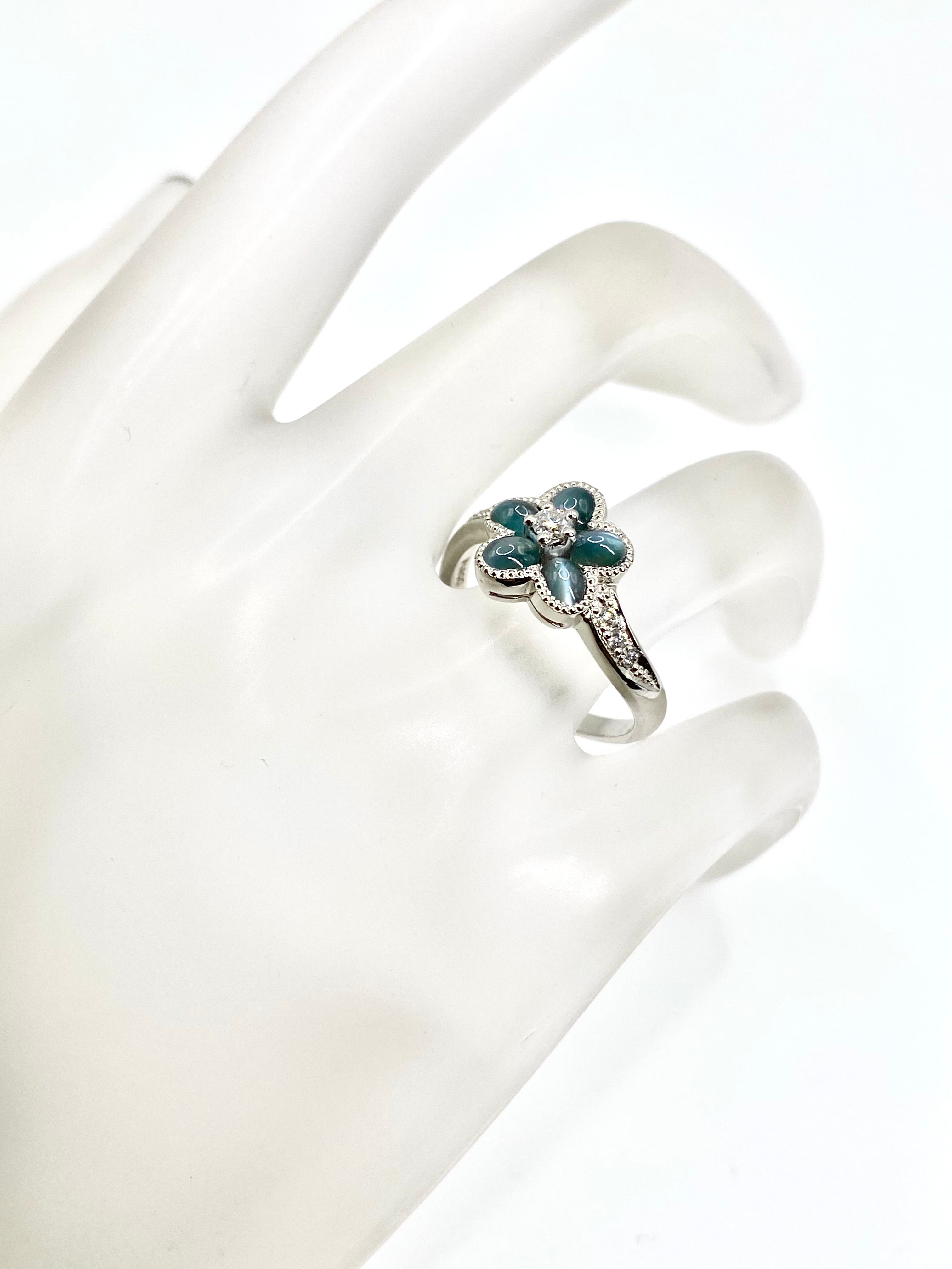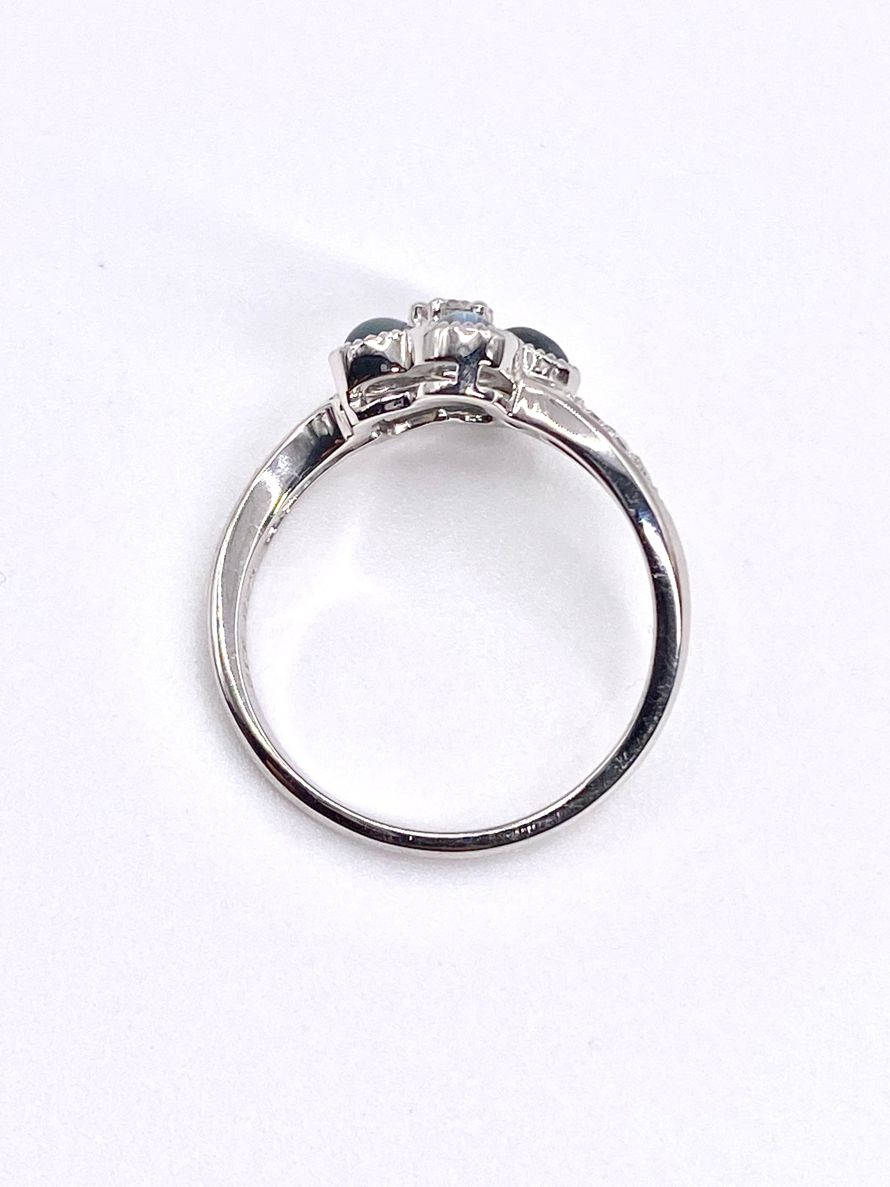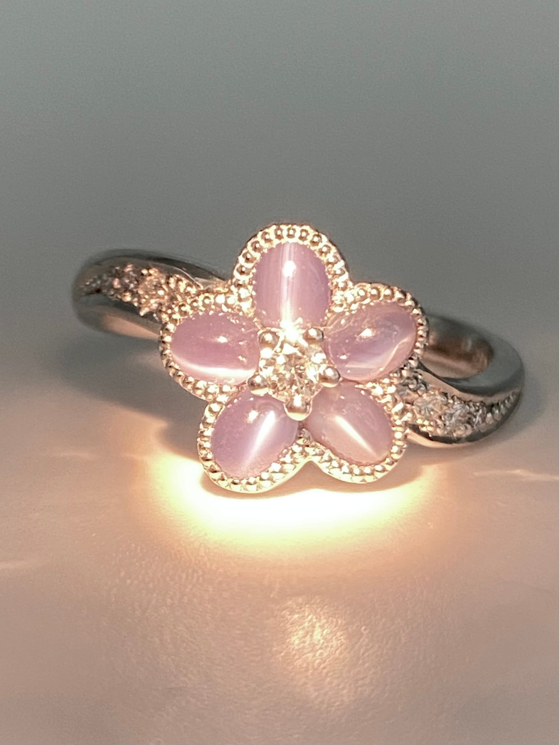 留められたアレキサンドライトキャッツアイについては、色はいずれもややグレーがかったブルーグリーン。しっとりと落ち着いた雰囲気があり、可愛らしく明るいリングデザインと好対照。これにより印象がどちらの方向にも引っ張られ過ぎないため、リングにちょうどよいバランスが与えられているように感じられます。