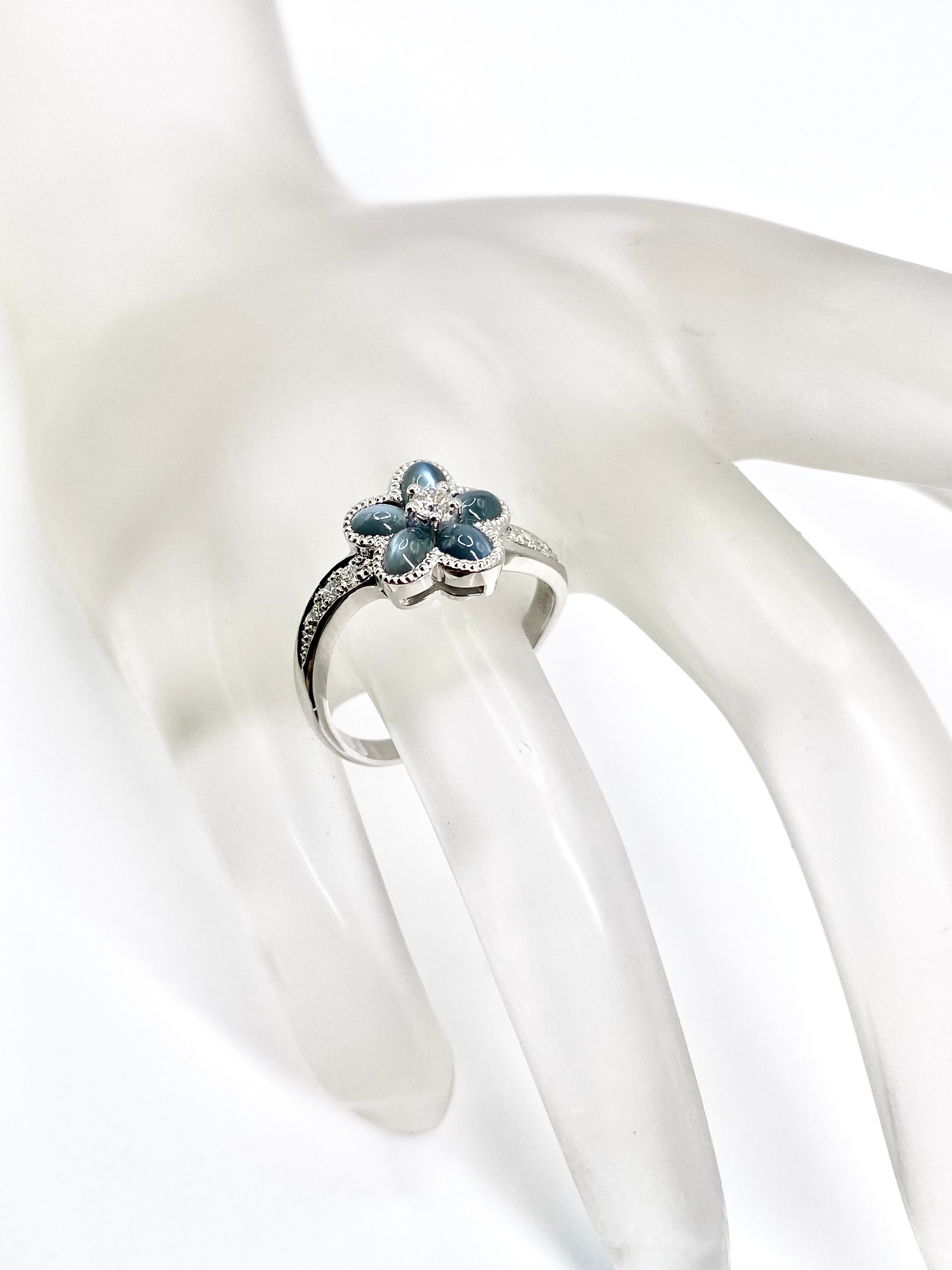 5ピースのアレキサンドライトキャッツアイが、ミル打ちが施された花形の石座に留められているリング。アームがウェーブがかっており、それに合わせて花形の石座も斜めに据えられた、動きのある形が特徴的です。