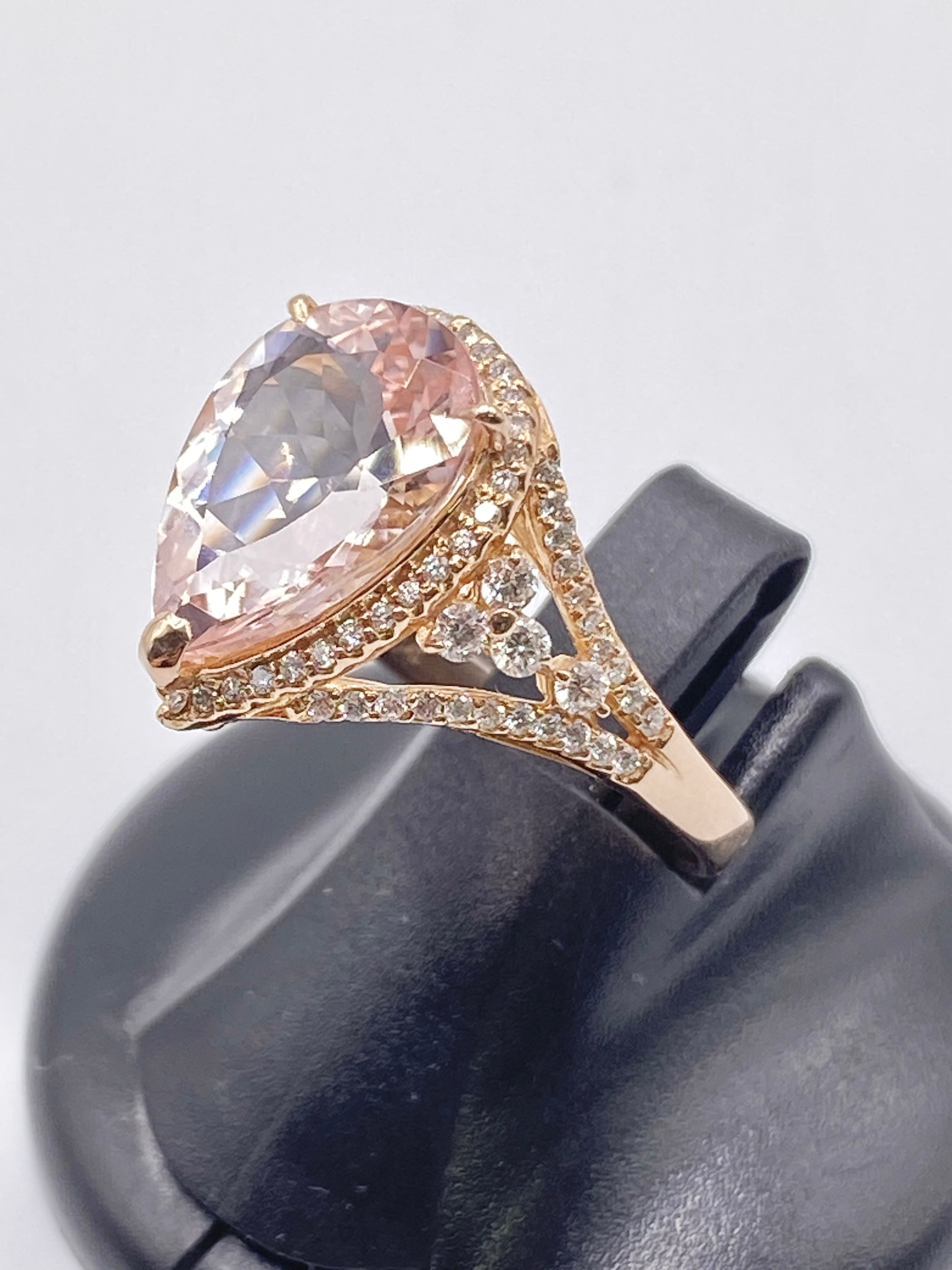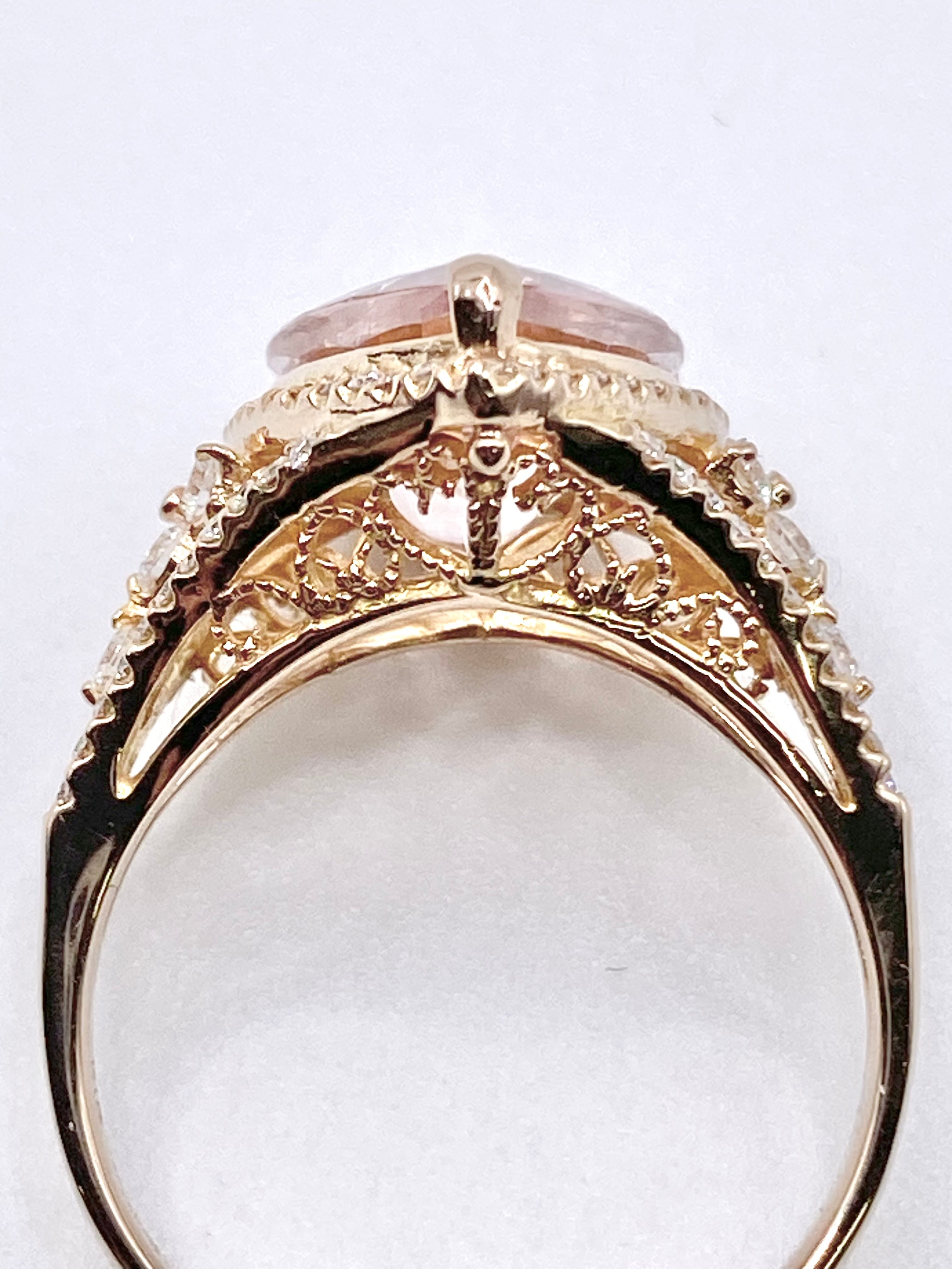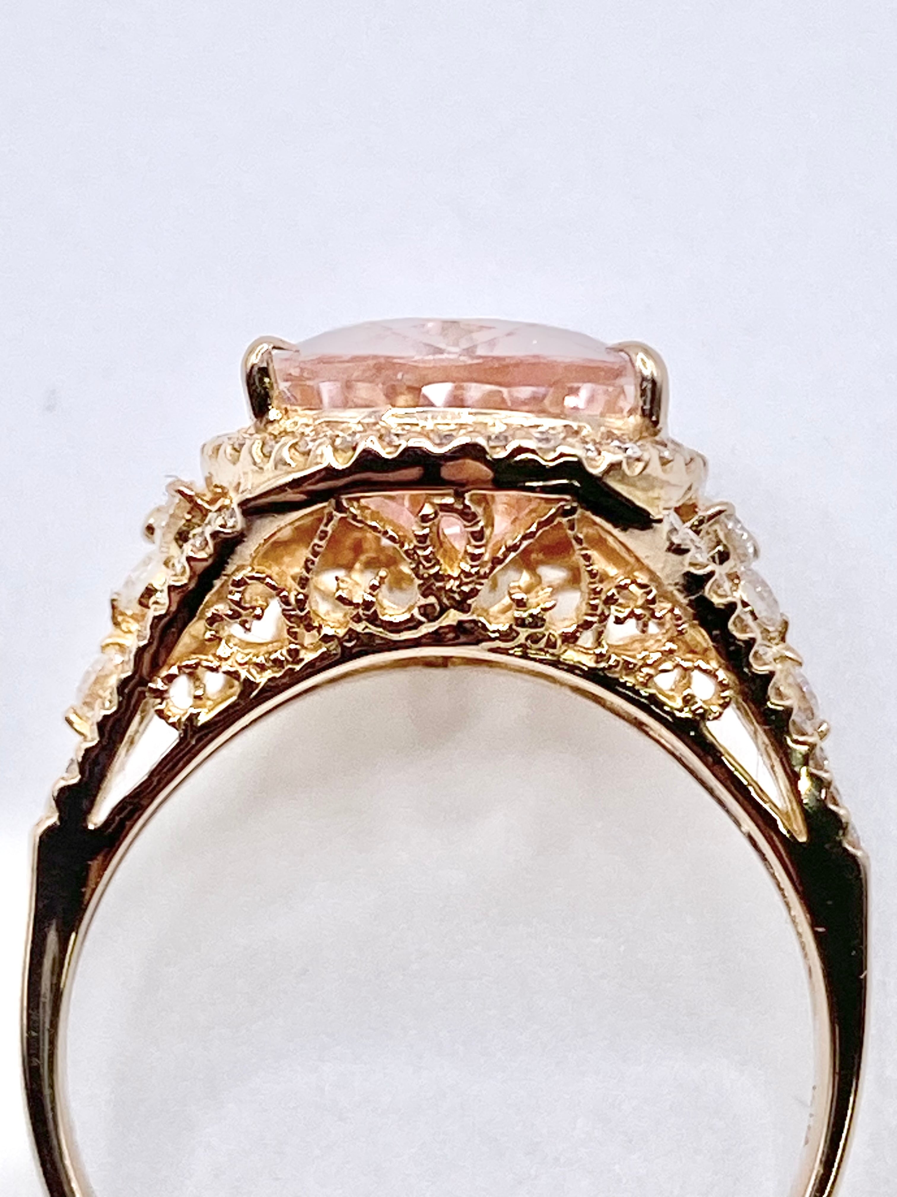が、リングの作り自体は繊細かつ豪奢ですね。ダイヤモンドが透かしとなった上部全体に散りばめられており、見た目にも大変華やか。ダイヤモンドの質自体も手抜かりは感じられず、色や内包物が10倍拡大下でも目立つものはありません。モルガナイトと共に手元をかなり明るくしてくれそうな力を感じます。