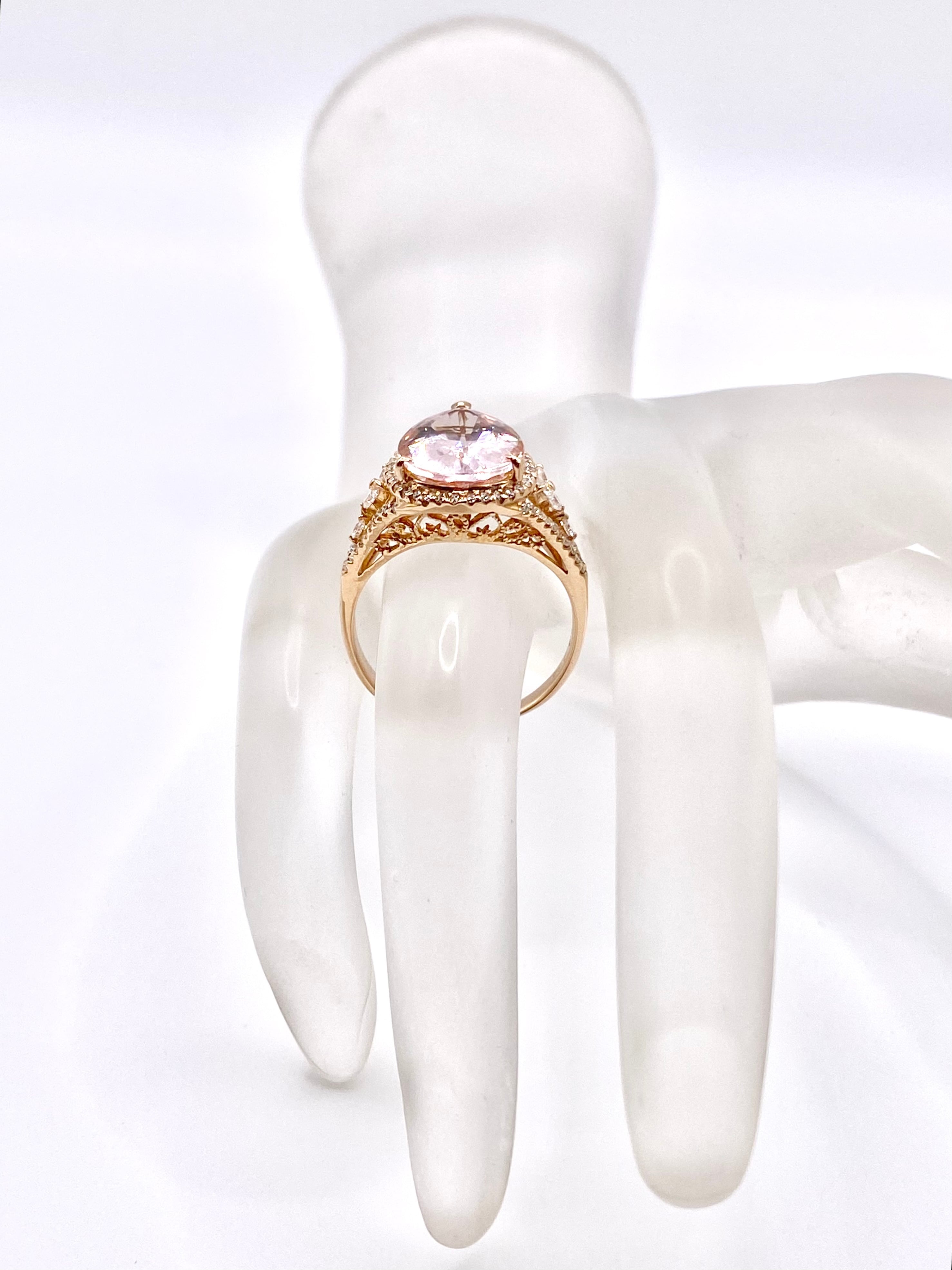 中央に大きめのモルガナイトを置いた、18金のリングのご紹介です。リング自体の色は、イエローではなくこちらも淡めのピンクゴールドとなります。