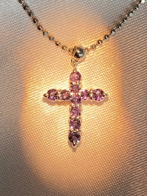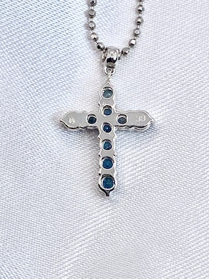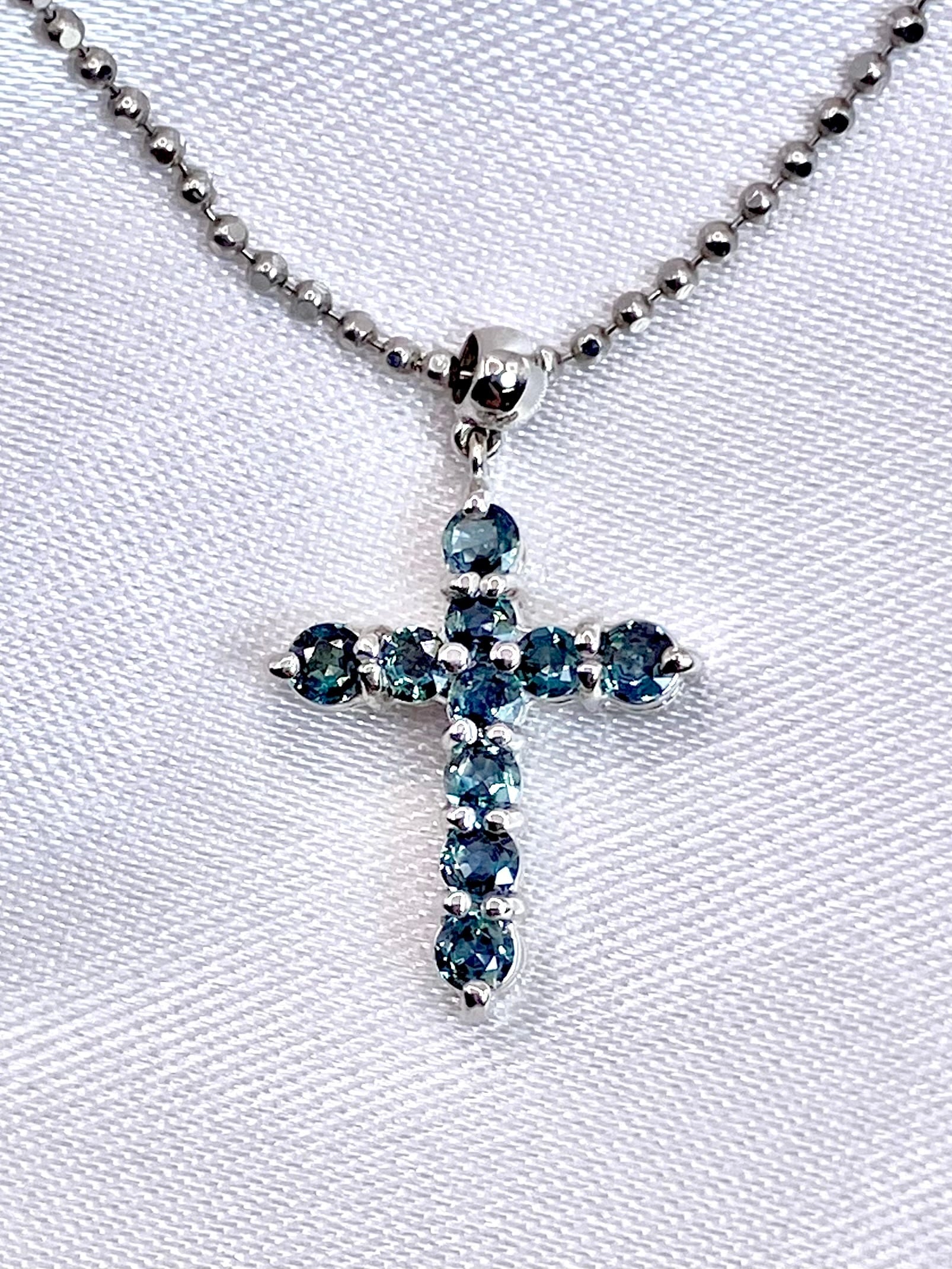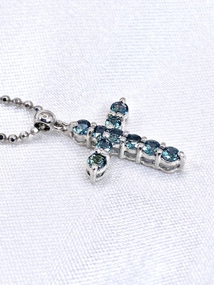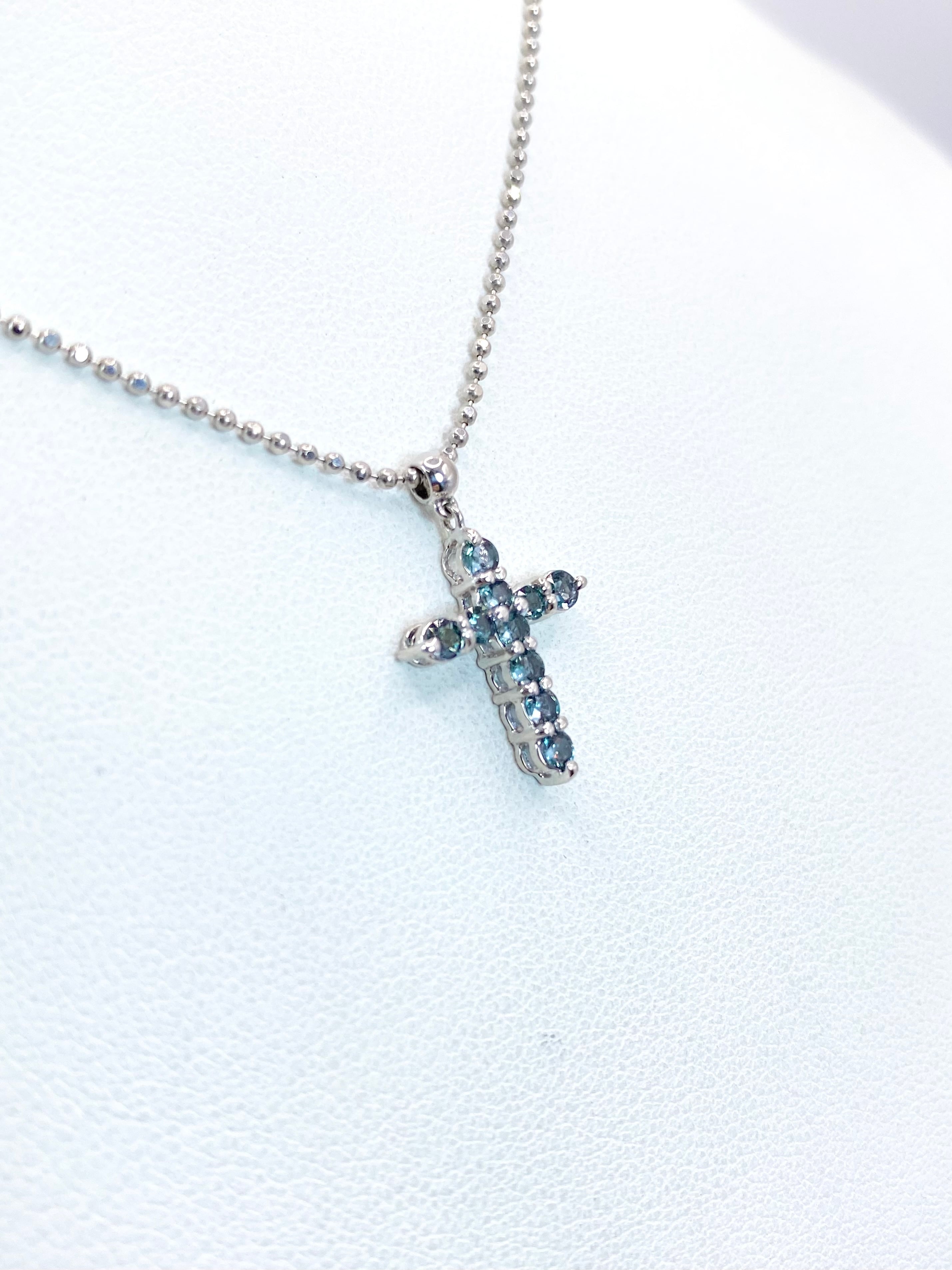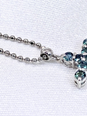 10ピースのアレキサンドライトが、着けやすく人気の高いクロスを形作るネックレス。それぞれのピースは小ぶりながらも輝きが明瞭で、黒みの強すぎないやや明るめの色調に感じられます。十分な透明感を持ち、かつブルーグリーンの輝きのコントラストが美しいものを選んで留めた、という印象ですね。