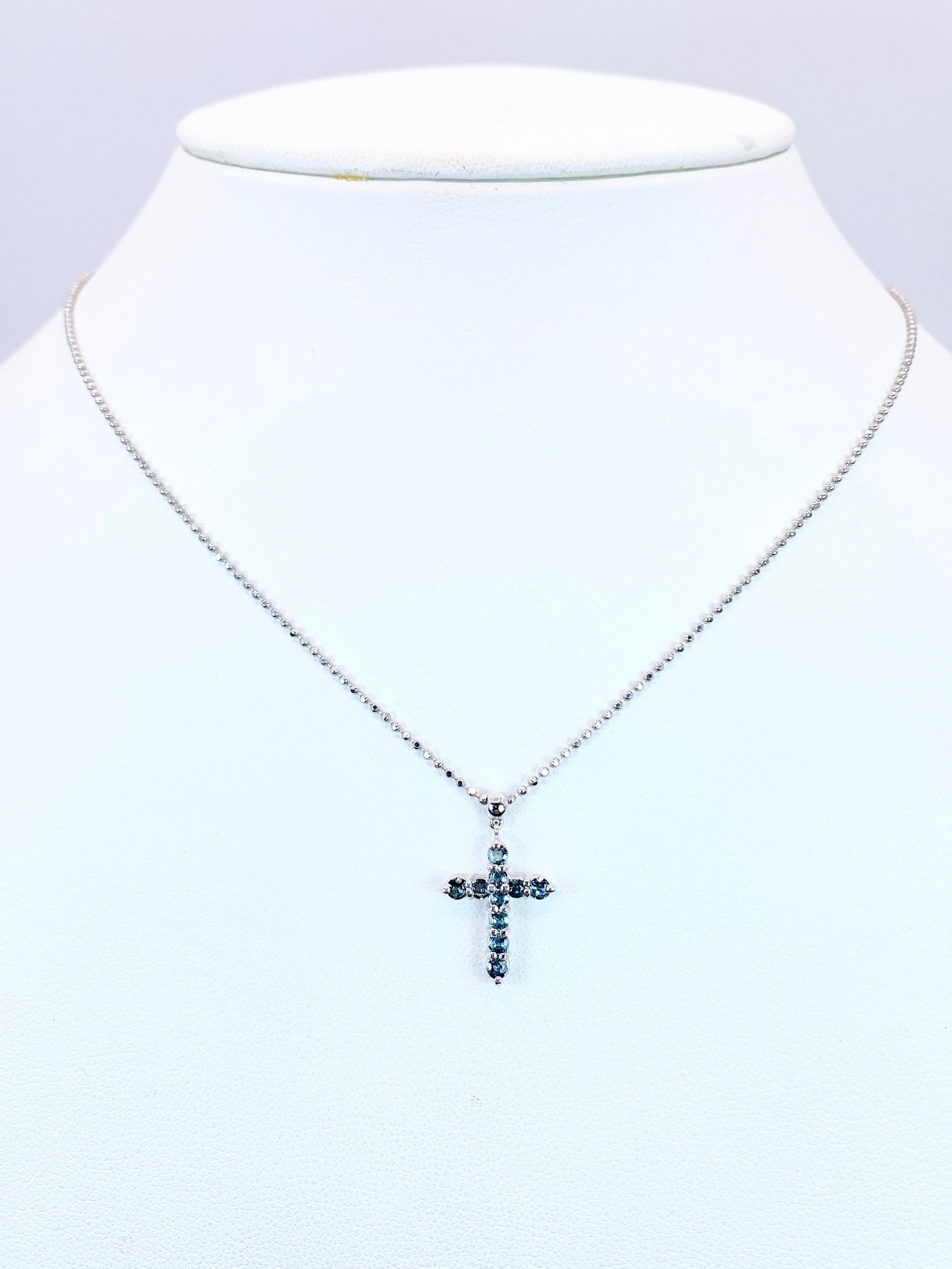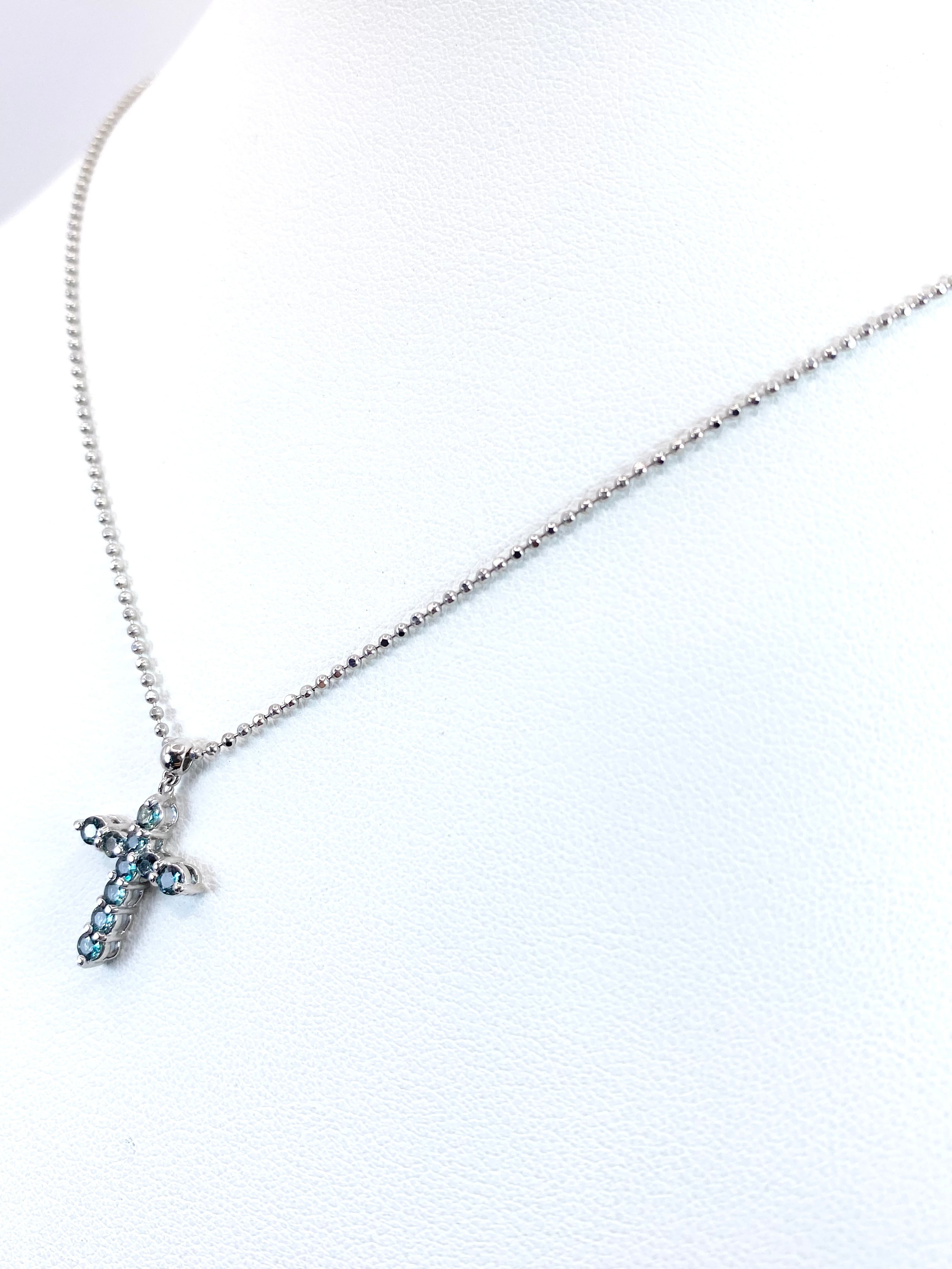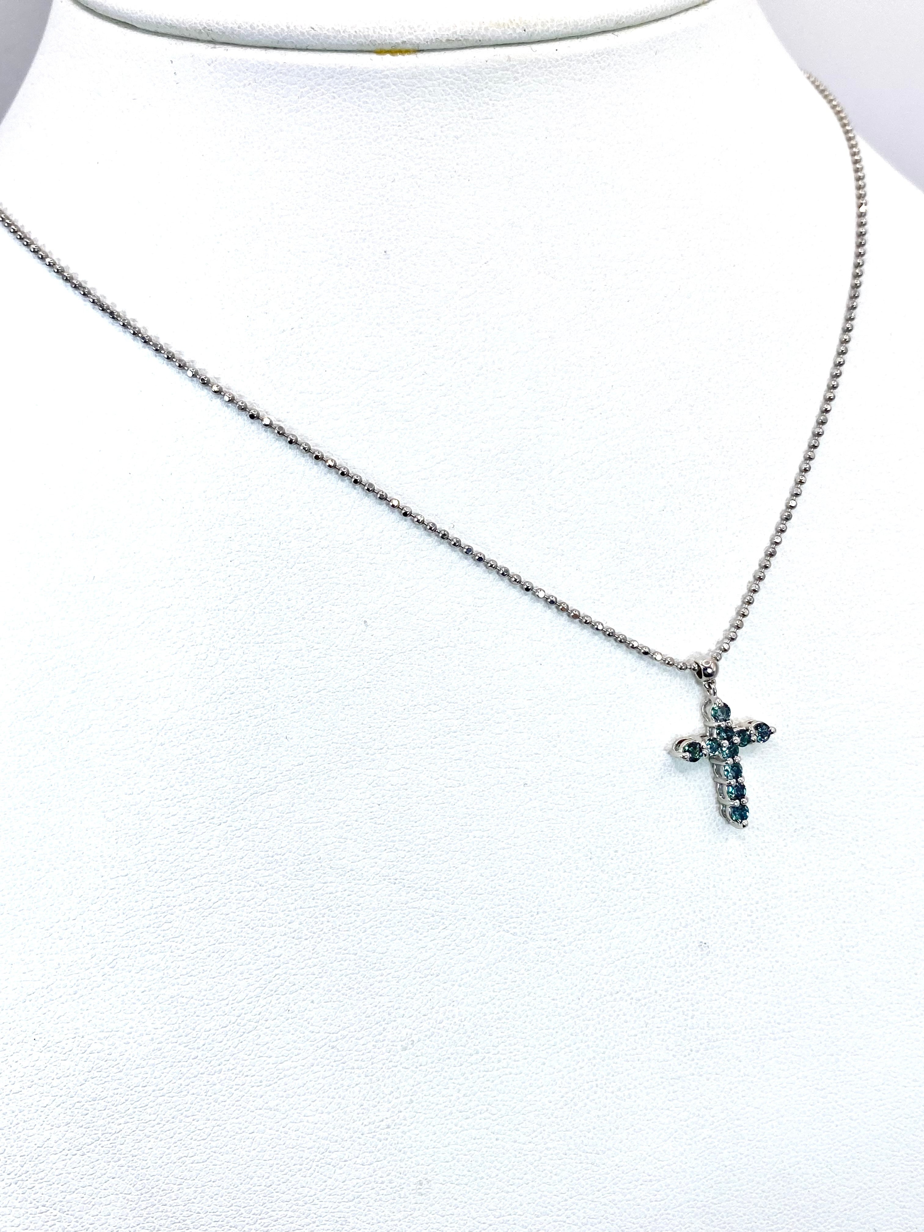 10ピースのアレキサンドライトが、着けやすく人気の高いクロスを形作るネックレス。それぞれのピースは小ぶりながらも輝きが明瞭で、黒みの強すぎないやや明るめの色調に感じられます。十分な透明感を持ち、かつブルーグリーンの輝きのコントラストが美しいものを選んで留めた、という印象ですね。